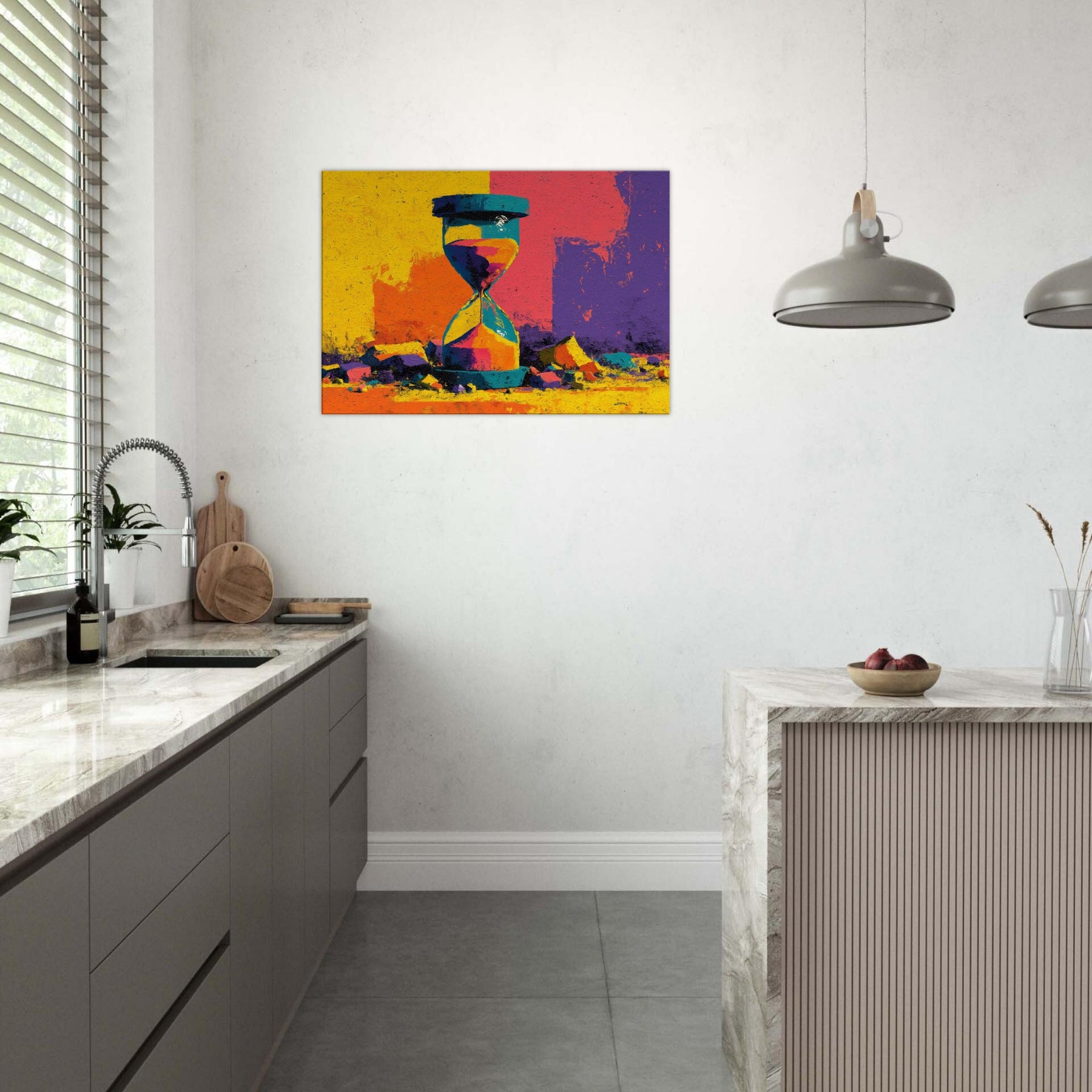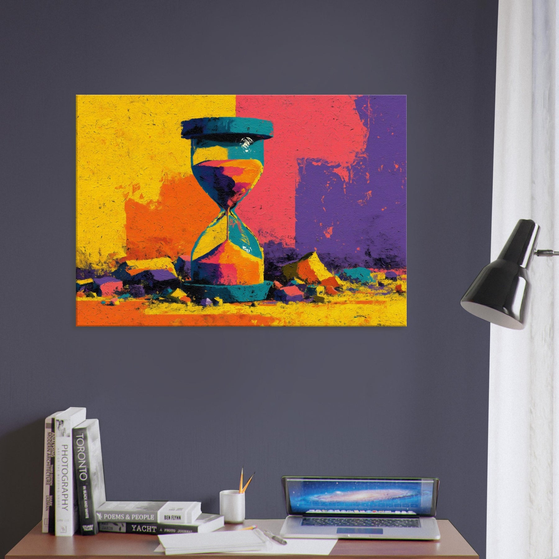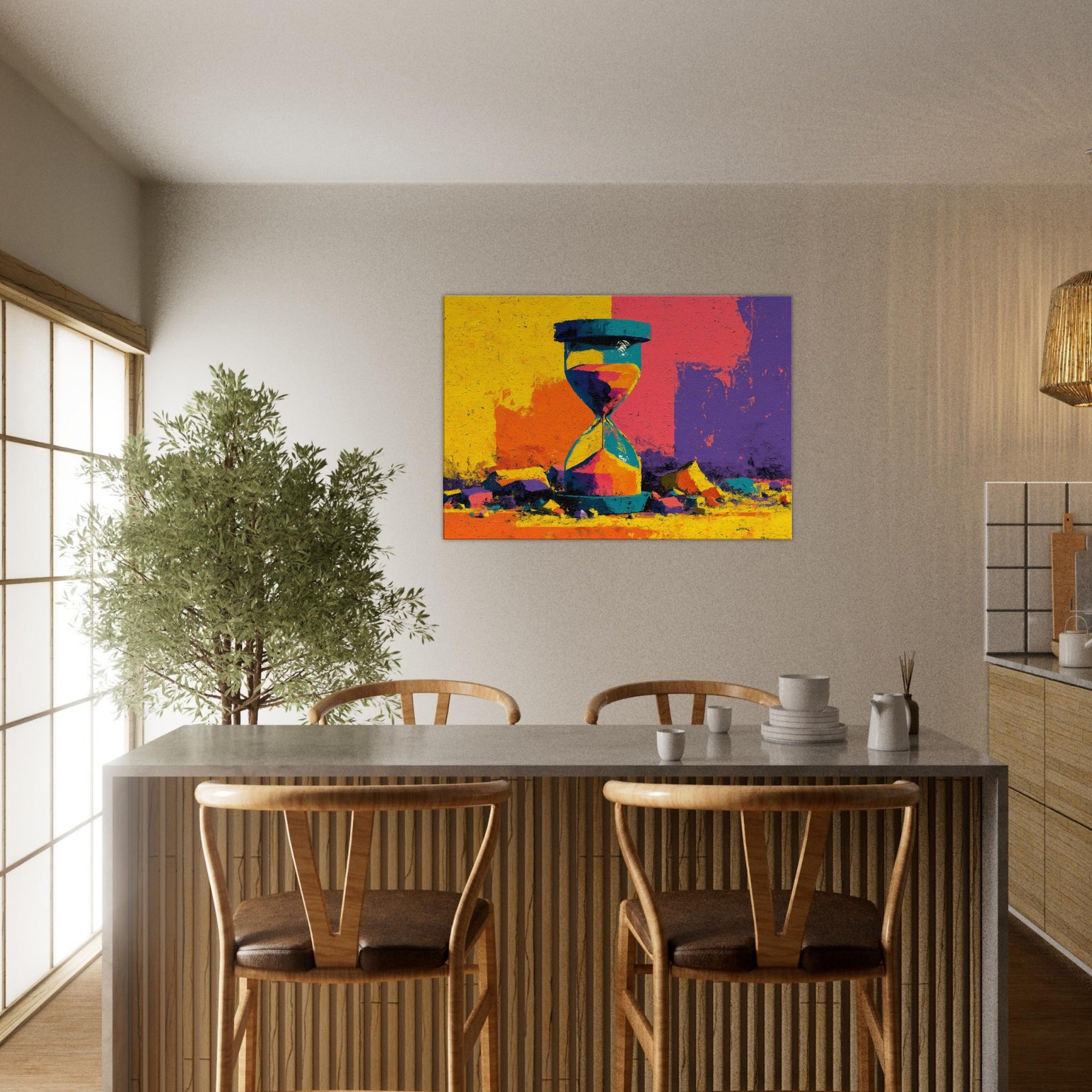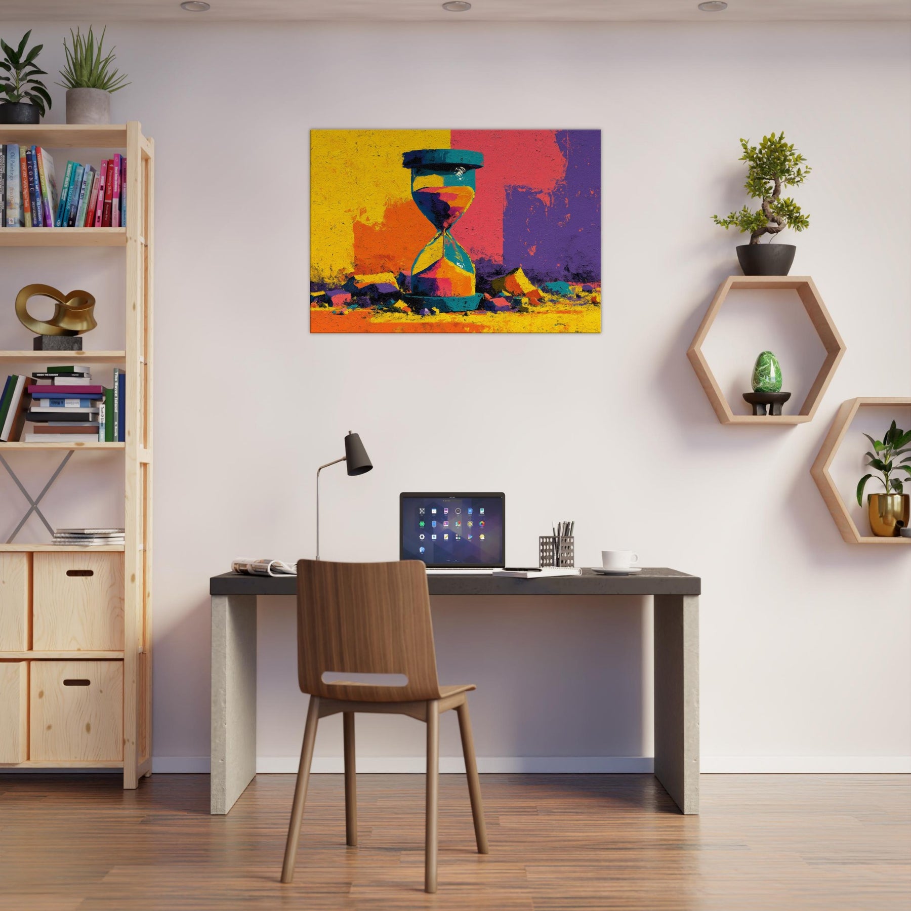 A bold Hourglass of color spills time into a room you haven't yet lived in. This abstract study dissolves form into luminous shards of yellow, turquoise, magenta, and violet, turning a shelf into a horizon. The surface texture suggests weathered stone, giving weight to every second as light glides across its facets. Hang this piece where you want conversation to drift like sand its radiant energy anchors a contemporary living space, inviting slow reflection and a playful dialogue between memory and moment.