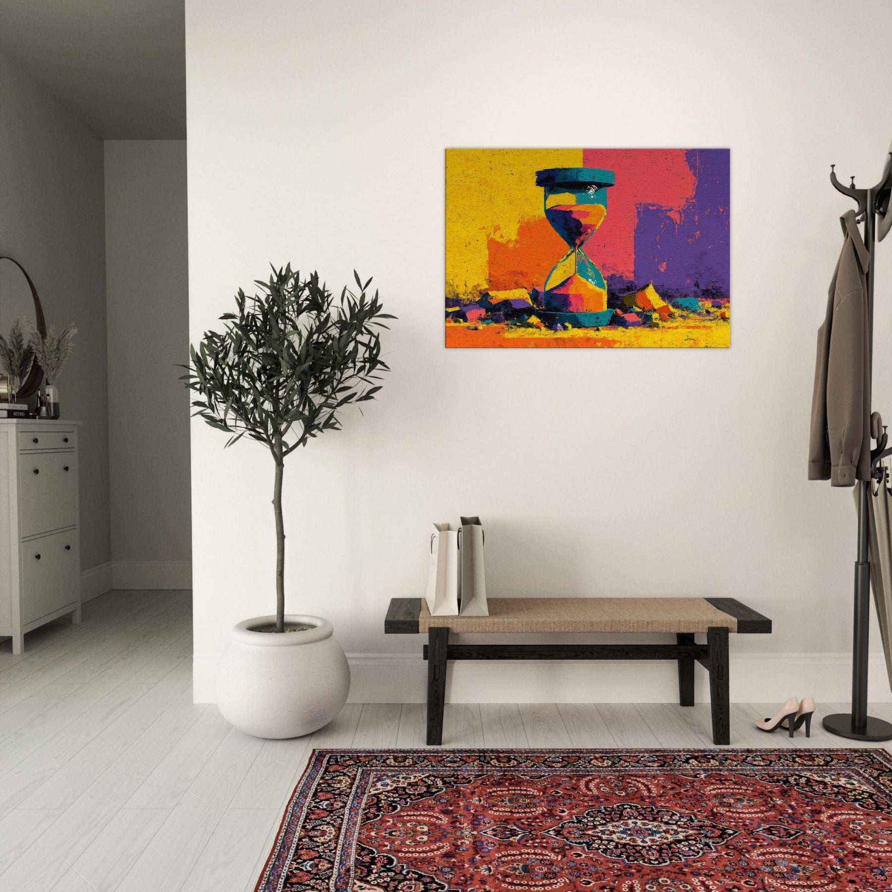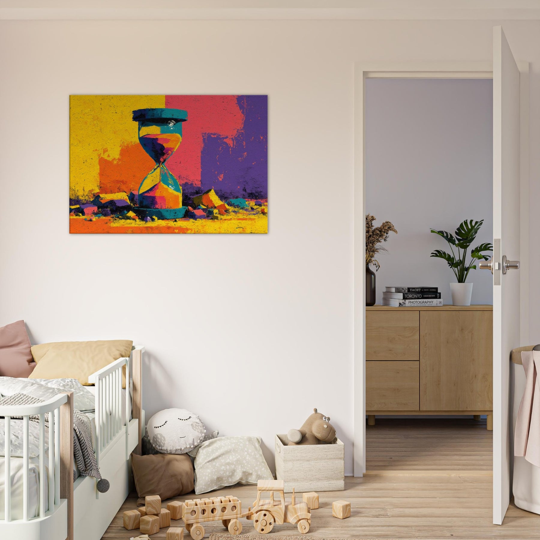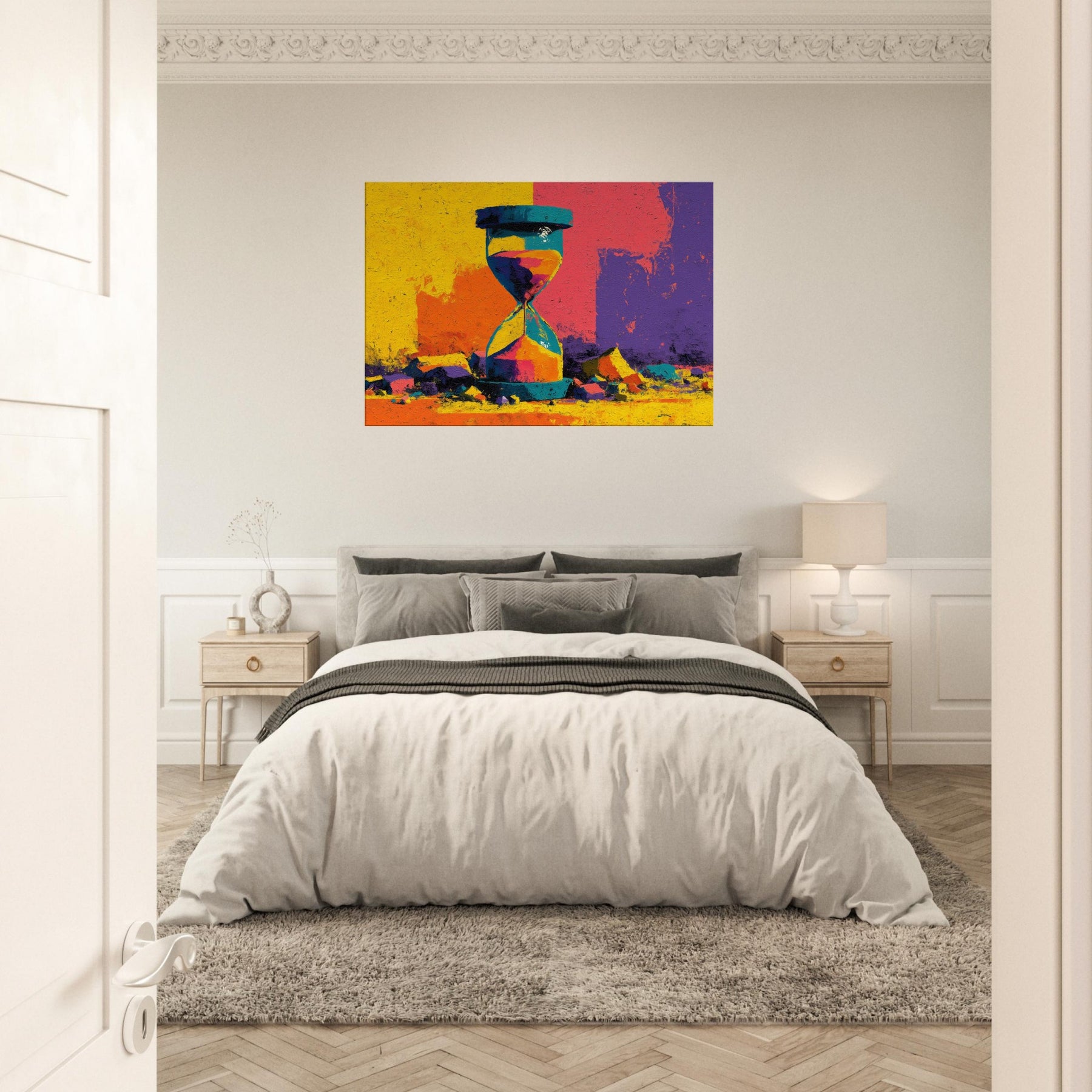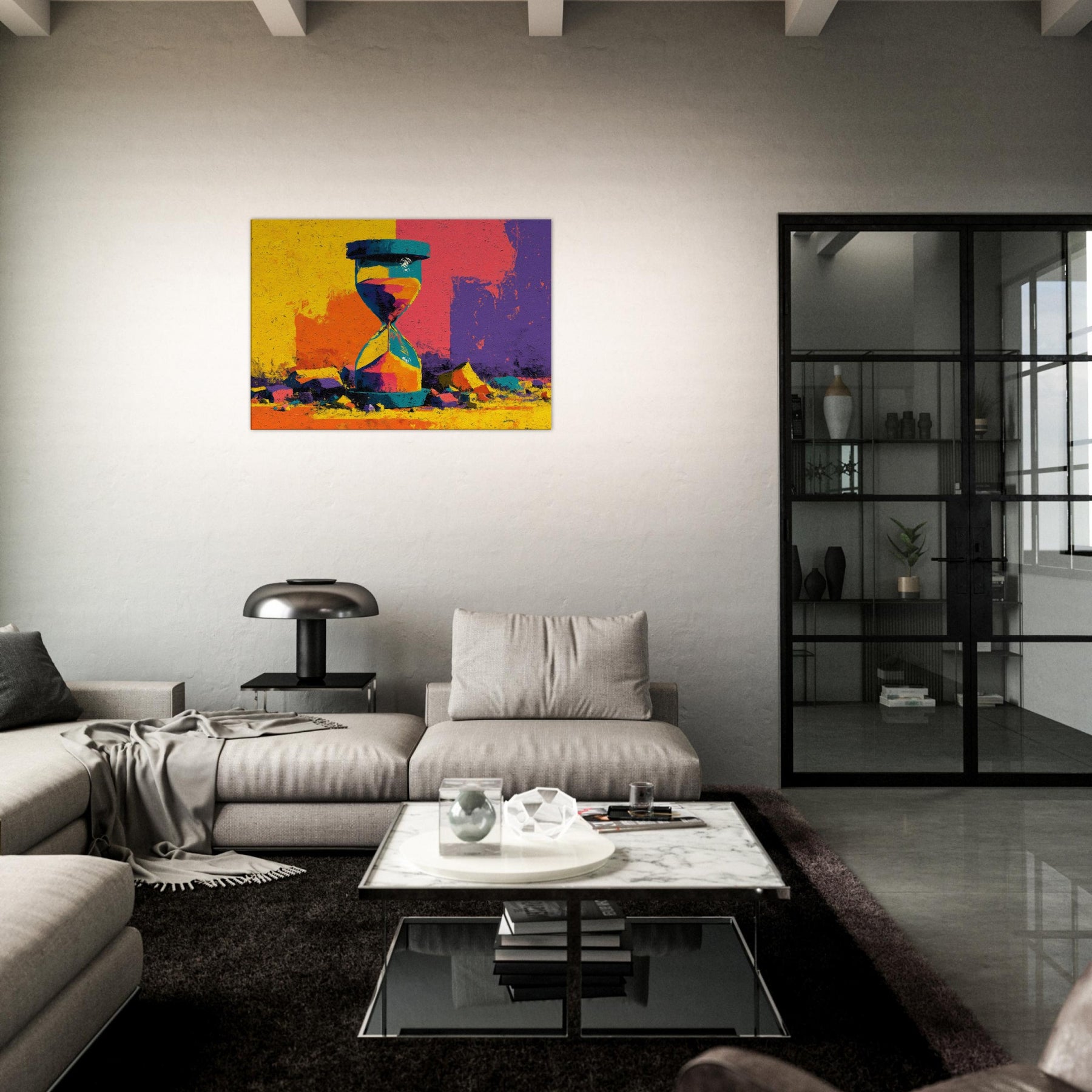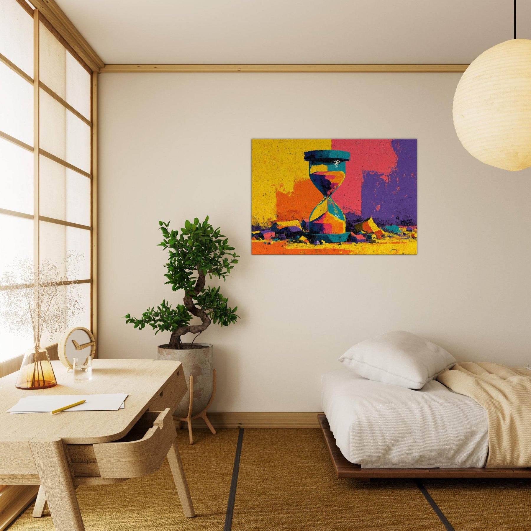 A bold Hourglass of color spills time into a room you haven't yet lived in. This abstract study dissolves form into luminous shards of yellow, turquoise, magenta, and violet, turning a shelf into a horizon. The surface texture suggests weathered stone, giving weight to every second as light glides across its facets. Hang this piece where you want conversation to drift like sand its radiant energy anchors a contemporary living space, inviting slow reflection and a playful dialogue between memory and moment.