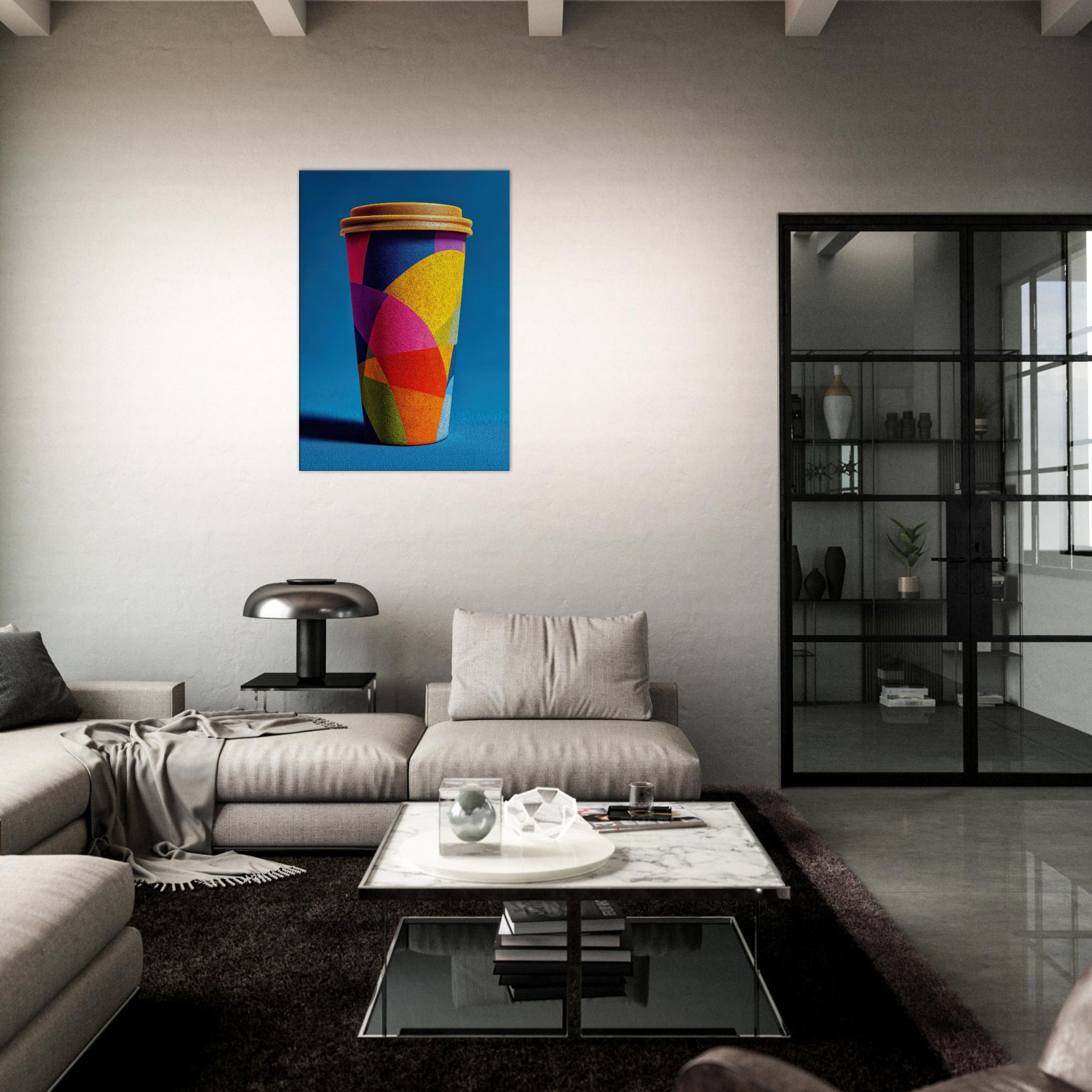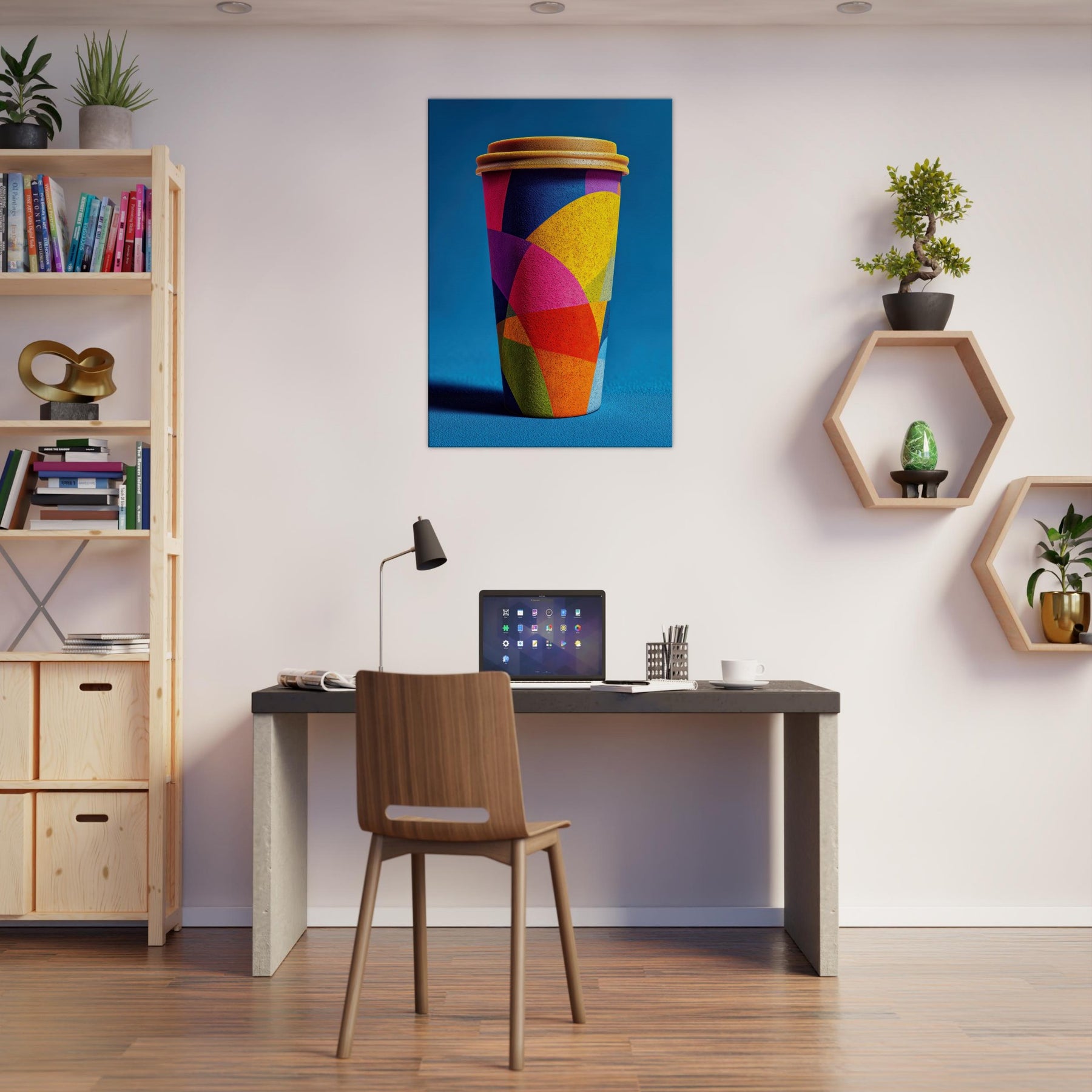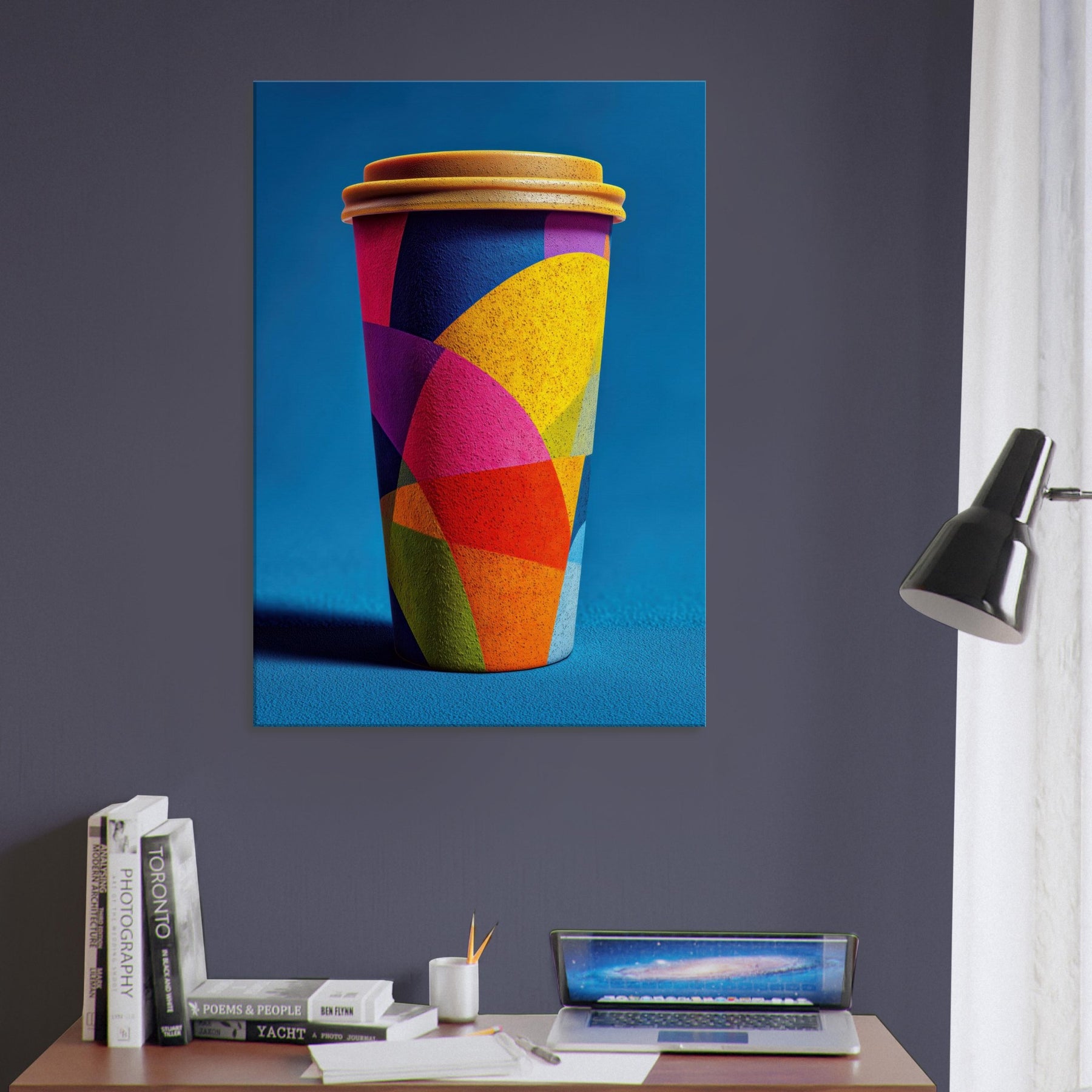 Like a sunrise poured into form, the Coffee Cup To Go dissolves into a carnival of color. Its abstract geometry braids magenta, cobalt, yellow, and lime into overlapping arcs that shimmer with energy. The effect is both playful and poised, lending a warm, cinematic glow to a kitchen, living room, or console vignette. This piece invites slow, sensory looking each hue a suggestion of steam, light, and motion. Hang it to transform a space into a contemporary toast to daily rituals, where everyday objects become artful companions.