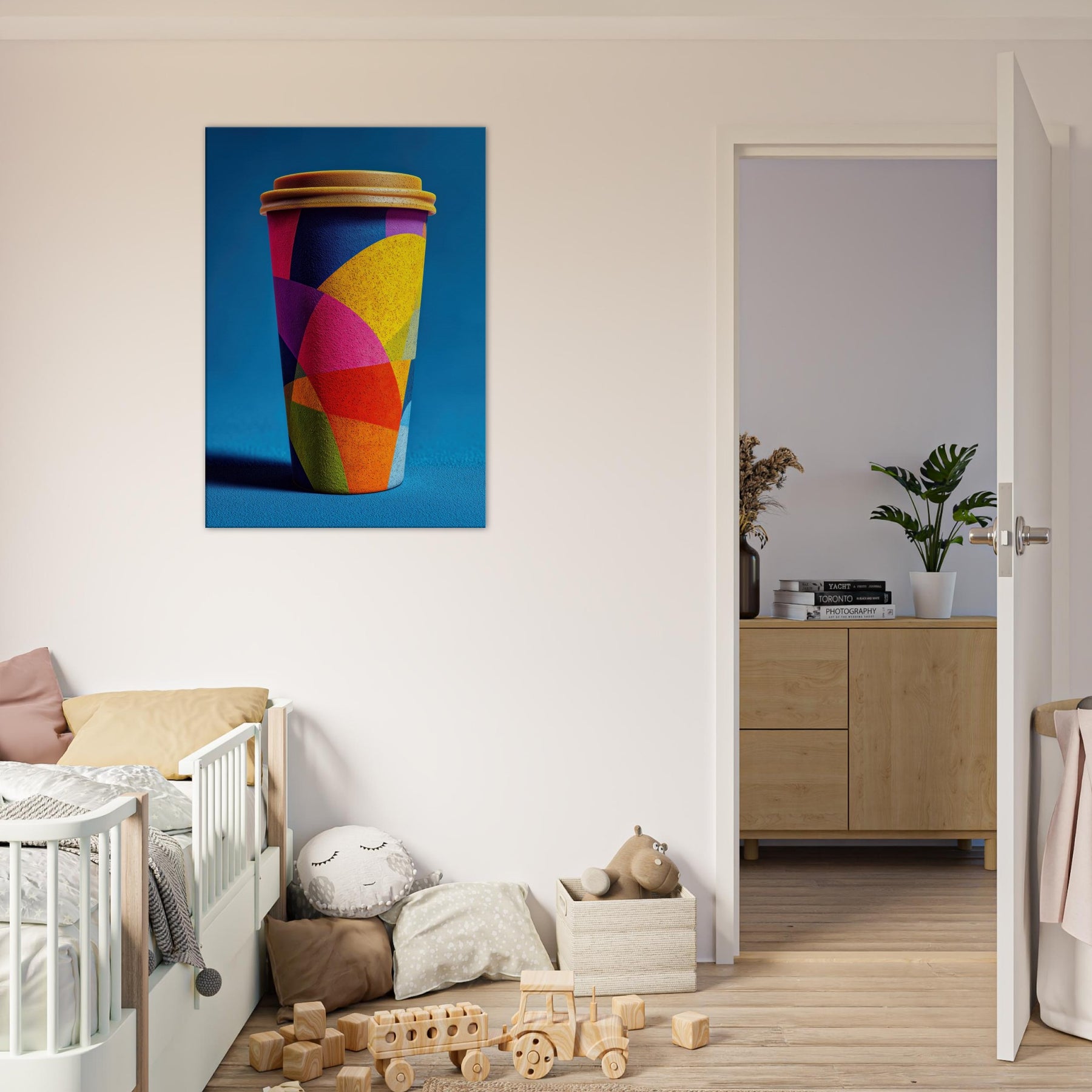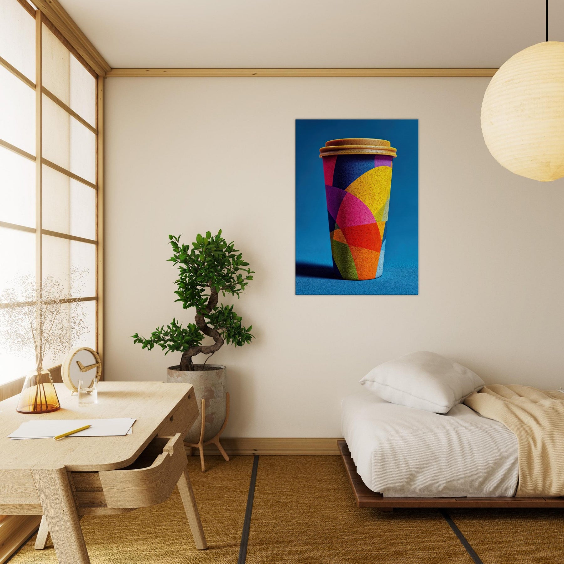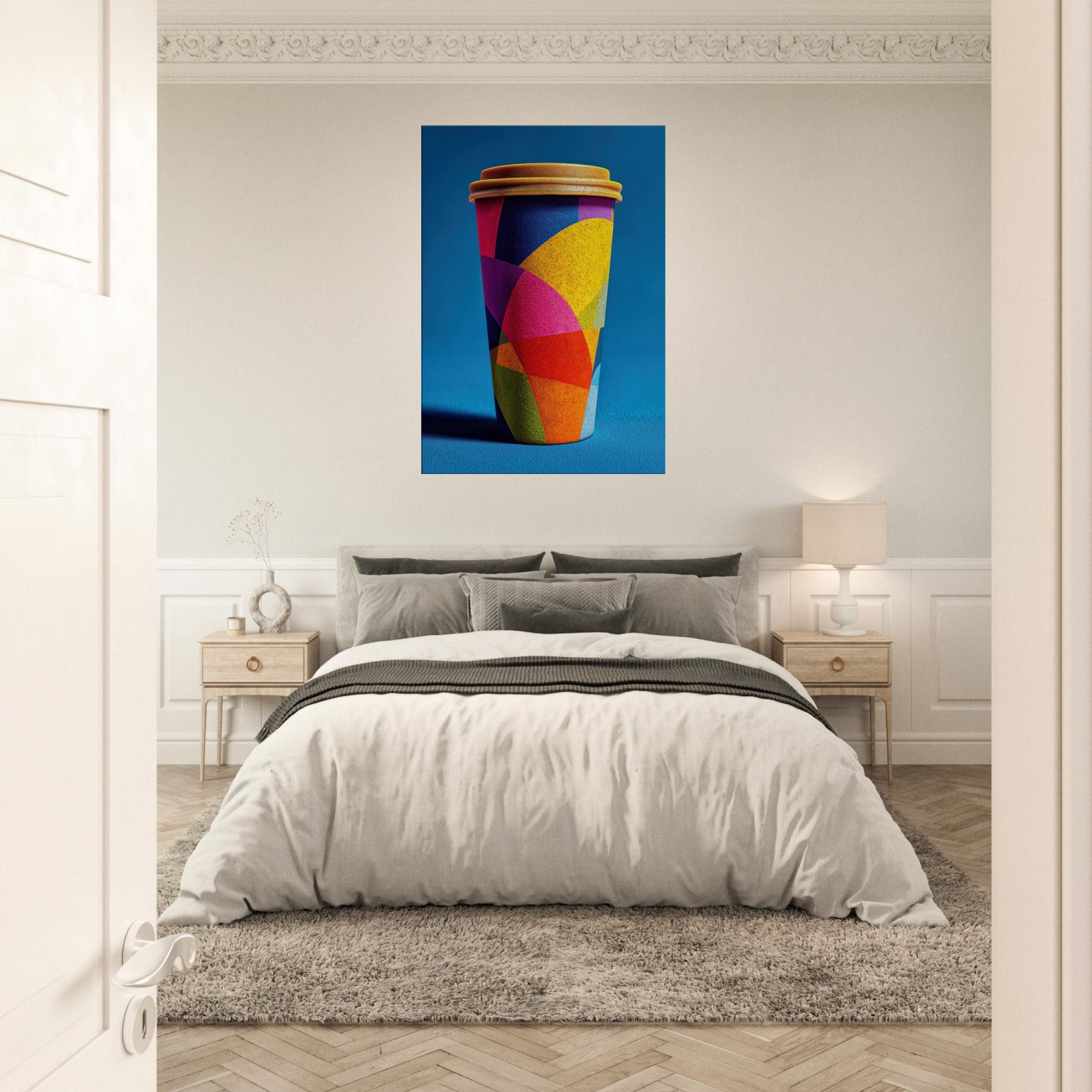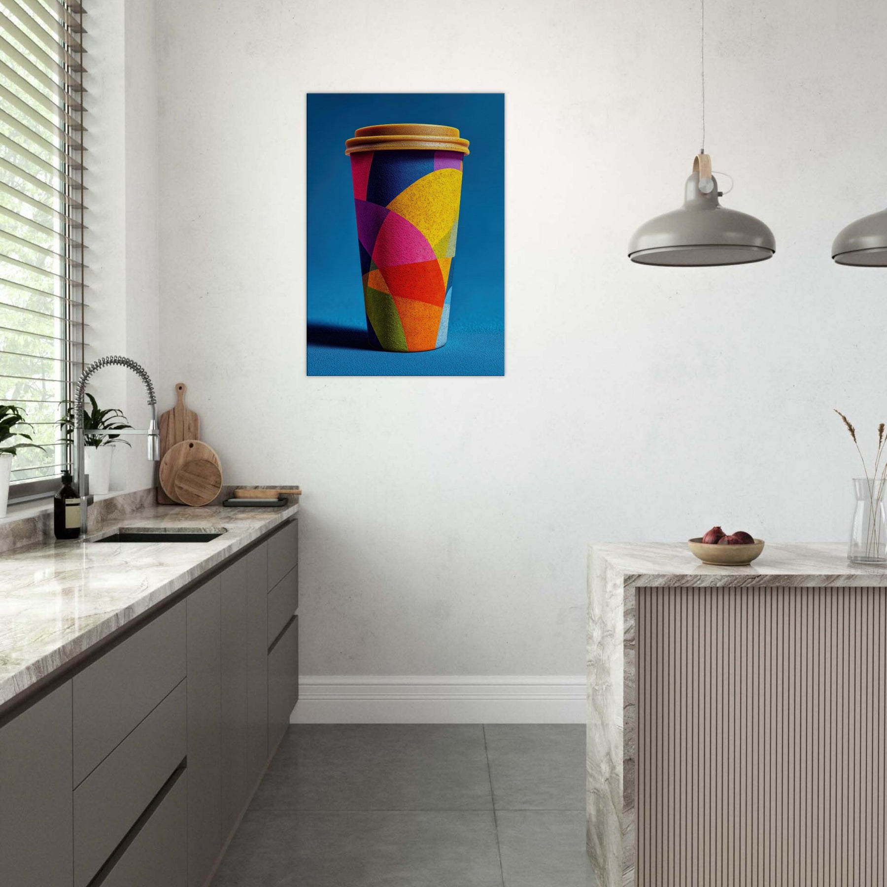 Like a sunrise poured into form, the Coffee Cup To Go dissolves into a carnival of color. Its abstract geometry braids magenta, cobalt, yellow, and lime into overlapping arcs that shimmer with energy. The effect is both playful and poised, lending a warm, cinematic glow to a kitchen, living room, or console vignette. This piece invites slow, sensory looking each hue a suggestion of steam, light, and motion. Hang it to transform a space into a contemporary toast to daily rituals, where everyday objects become artful companions.