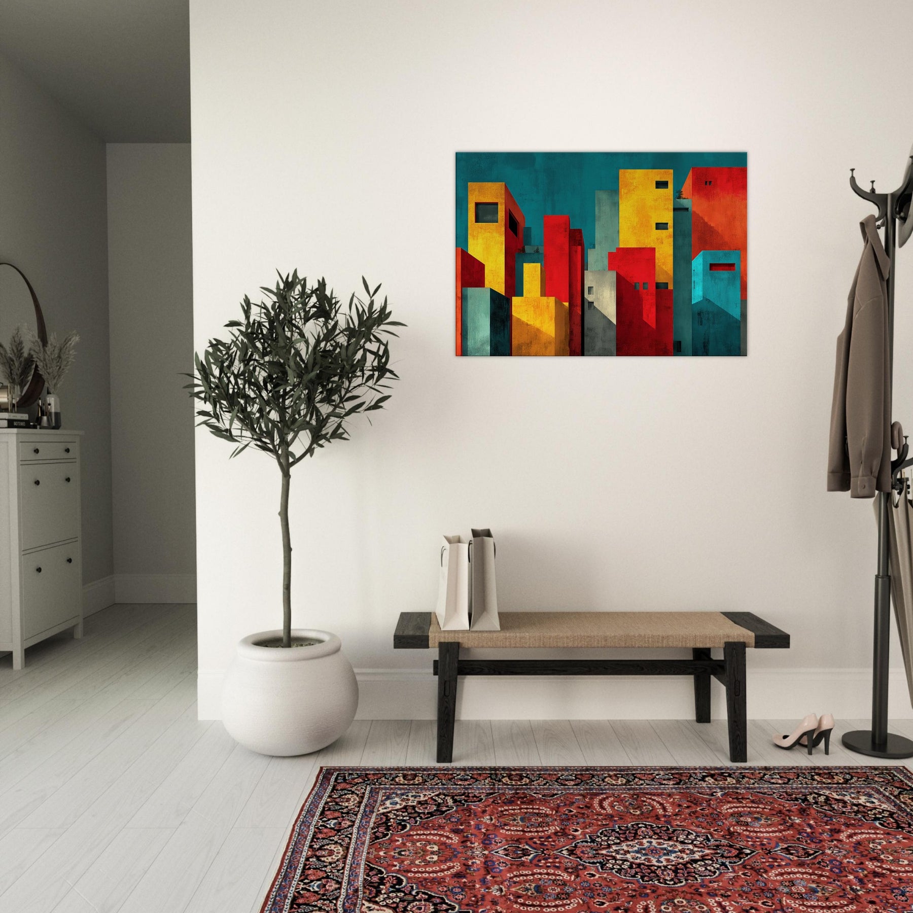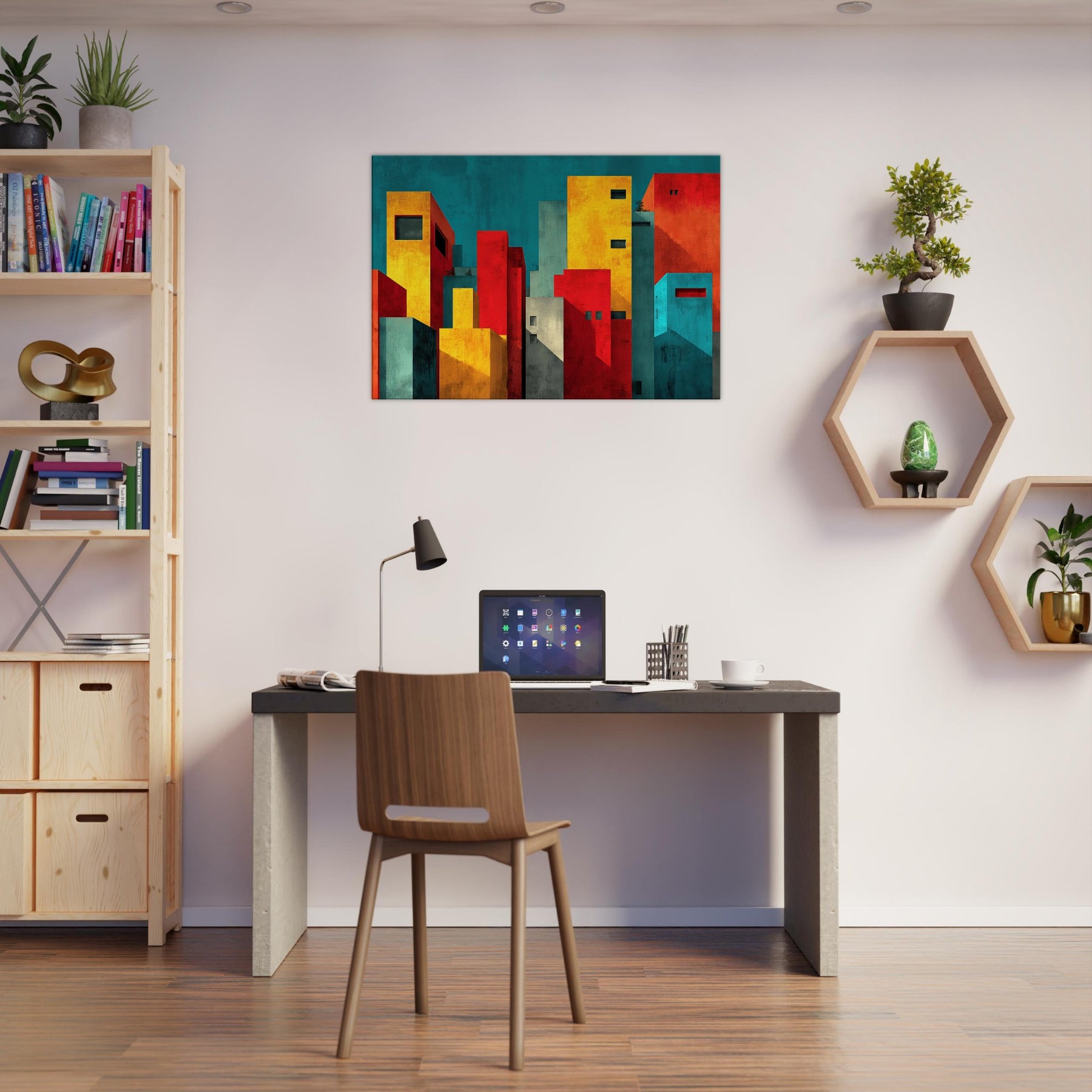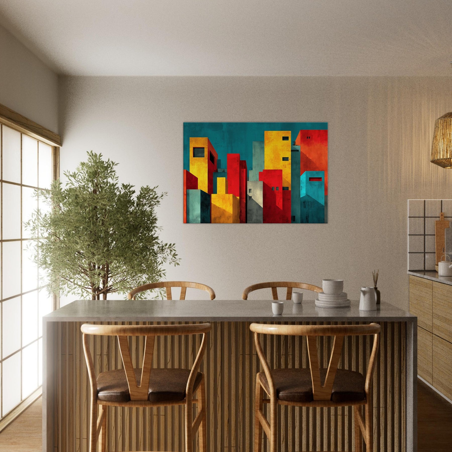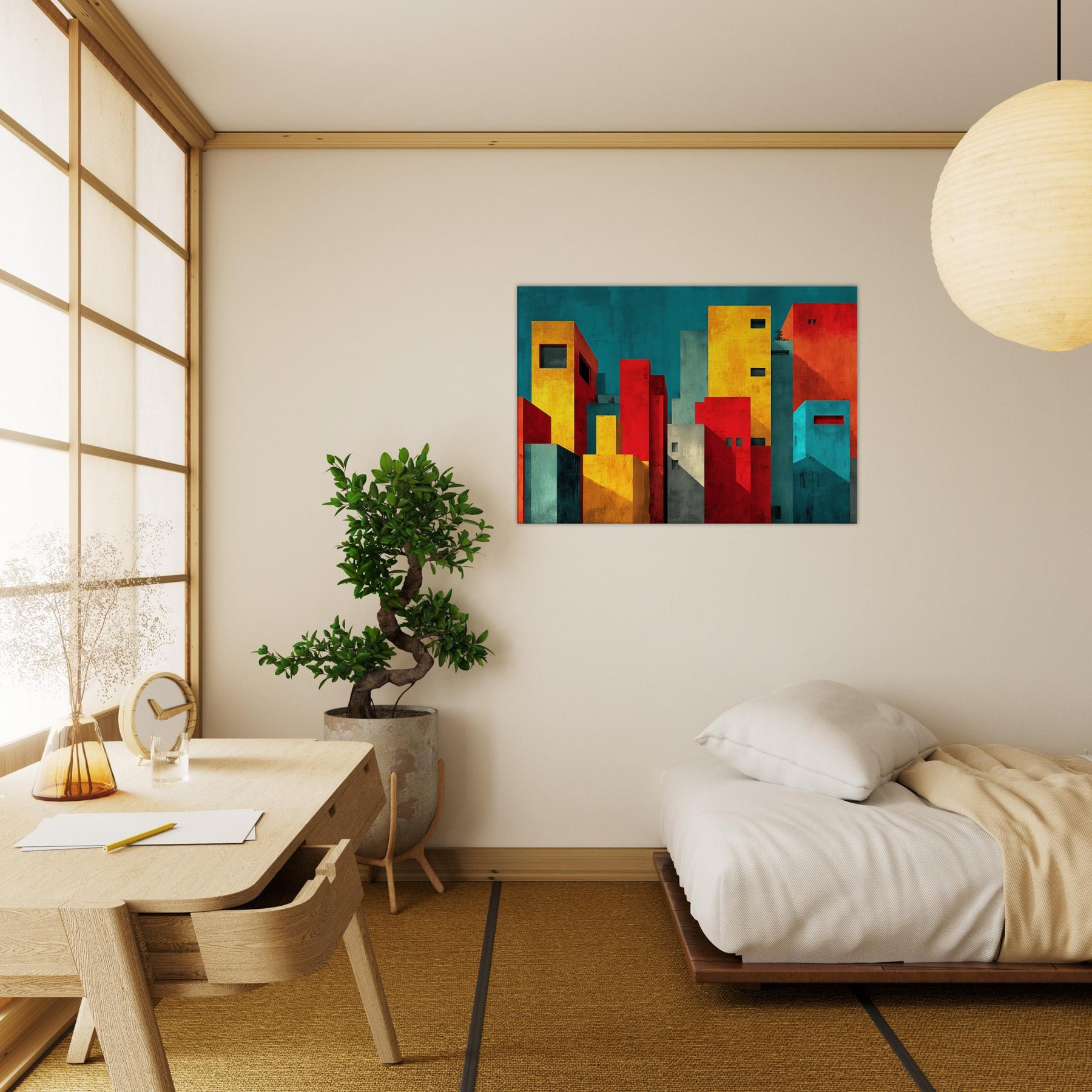 Steps into a city that breathes in color. This abstract interpretation of Tokyo layers bold blocks of hue sunny yellows, electric teals, and fiery reds into a skyline that feels both distant and near. The texture suggests weathered concrete and sunlit facades, while the rhythm of shapes invites the eye to wander and linger. Hung in a living room or study, it radiates warmth, urban energy, and a sense of modern balance, turning walls into a contemplative, gallery like horizon.