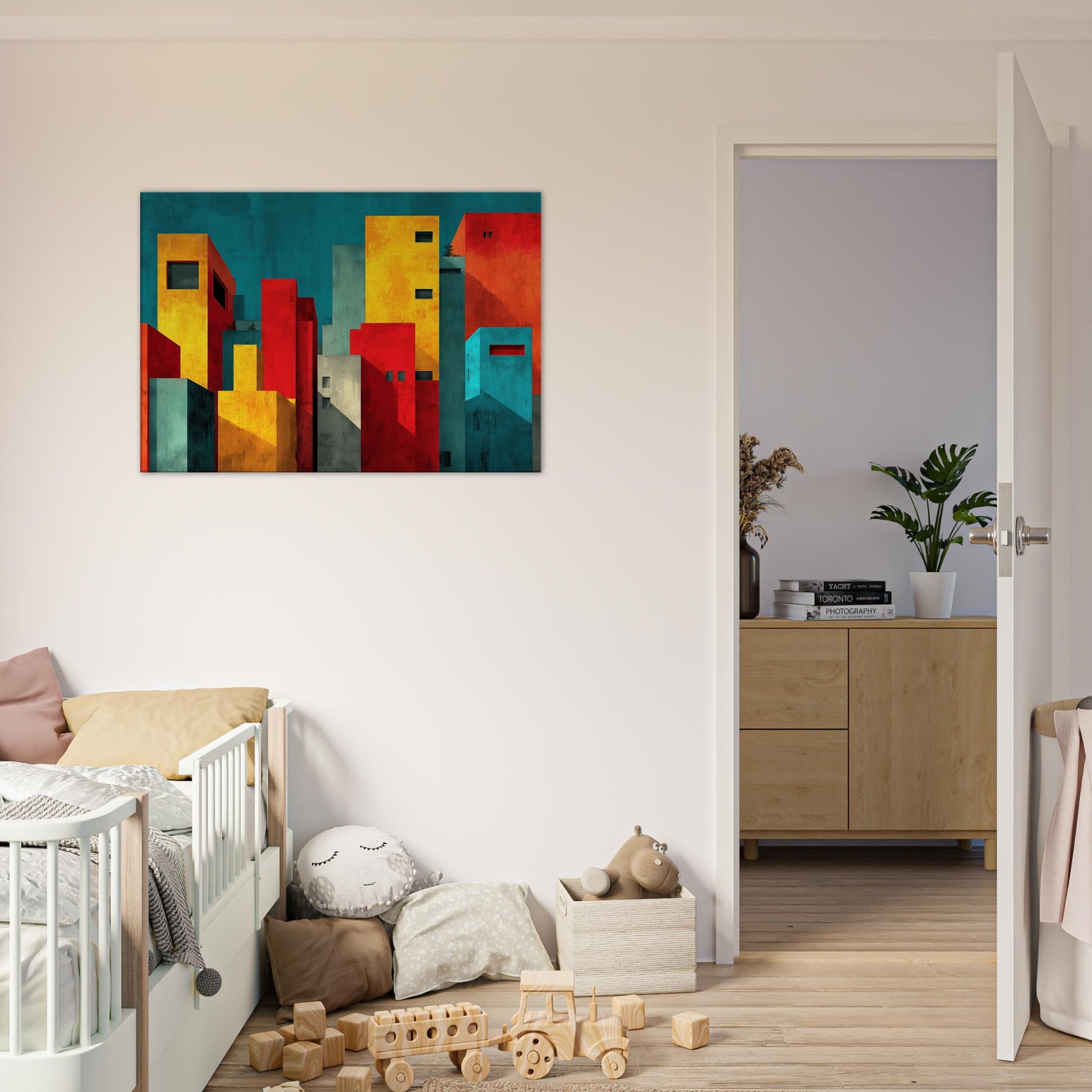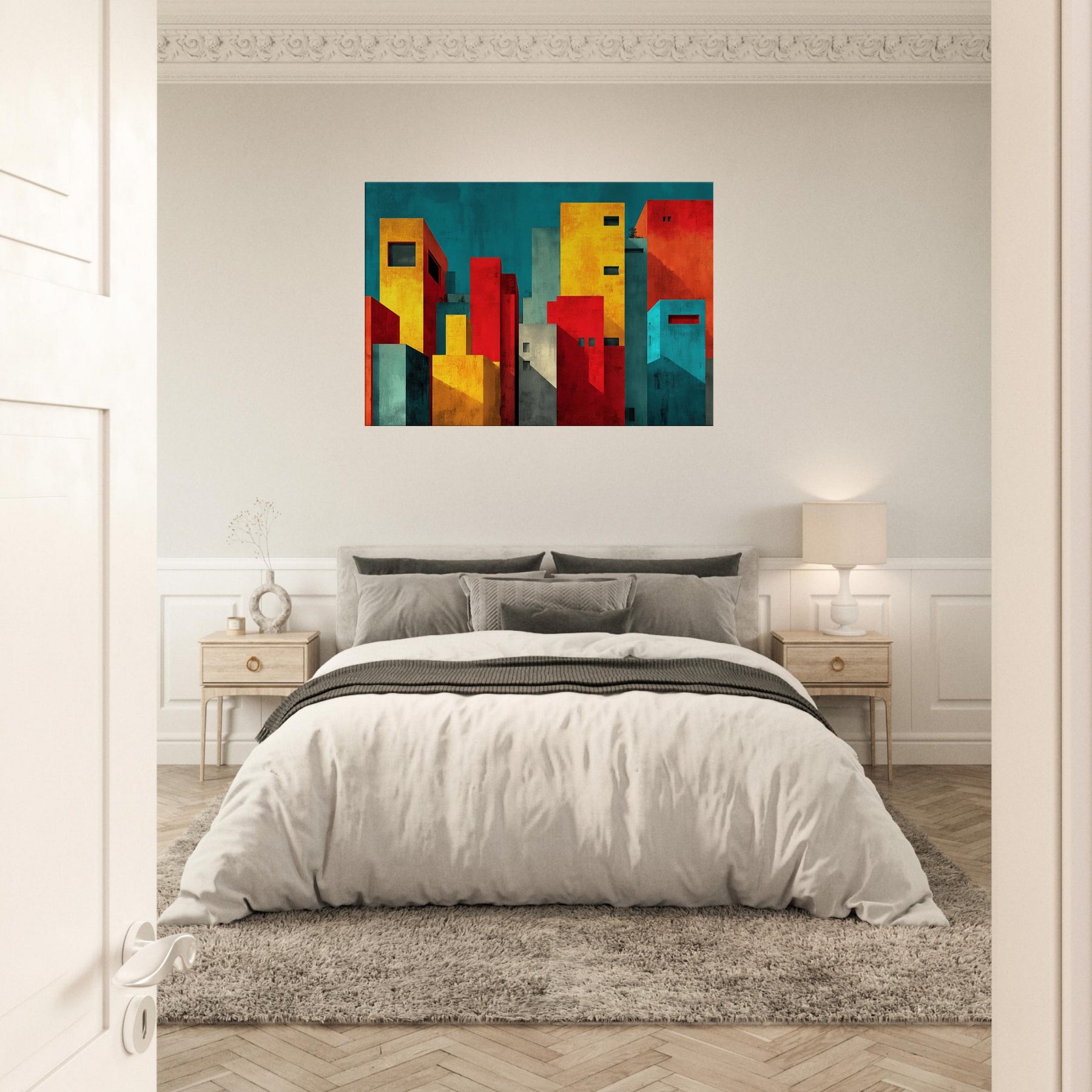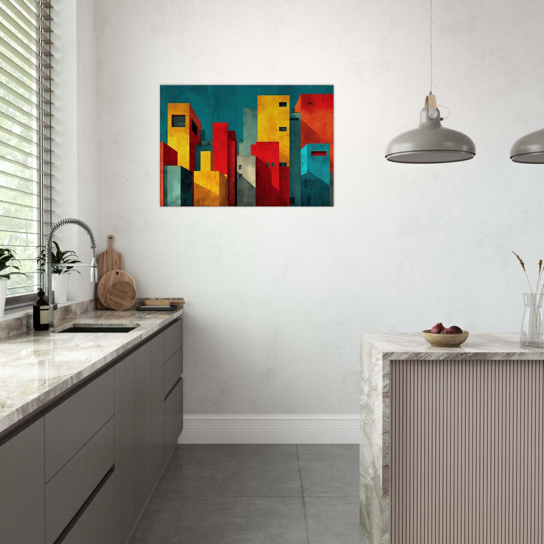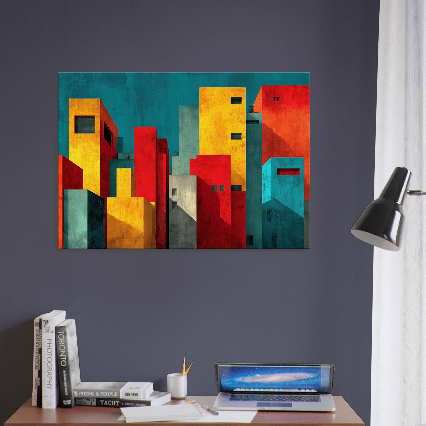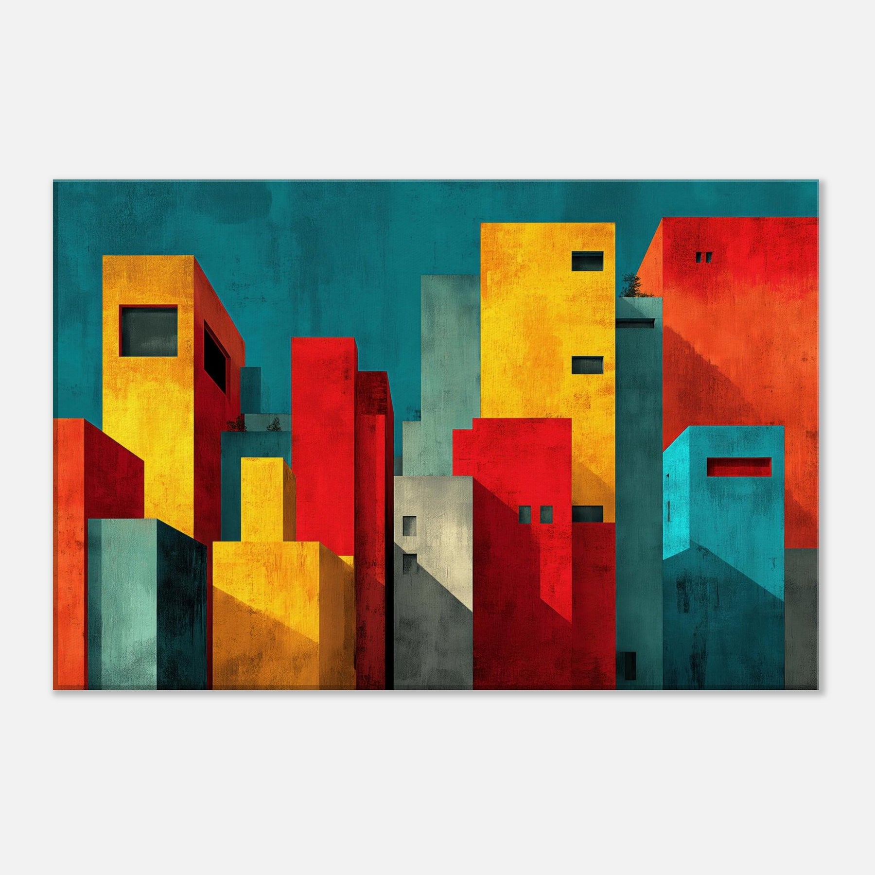 Steps into a city that breathes in color. This abstract interpretation of Tokyo layers bold blocks of hue sunny yellows, electric teals, and fiery reds into a skyline that feels both distant and near. The texture suggests weathered concrete and sunlit facades, while the rhythm of shapes invites the eye to wander and linger. Hung in a living room or study, it radiates warmth, urban energy, and a sense of modern balance, turning walls into a contemplative, gallery like horizon.