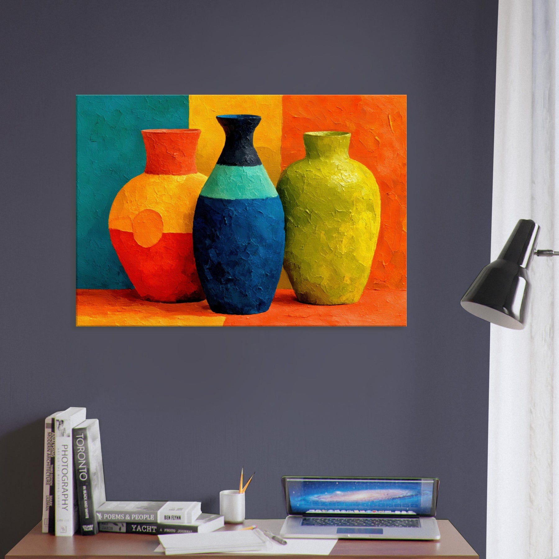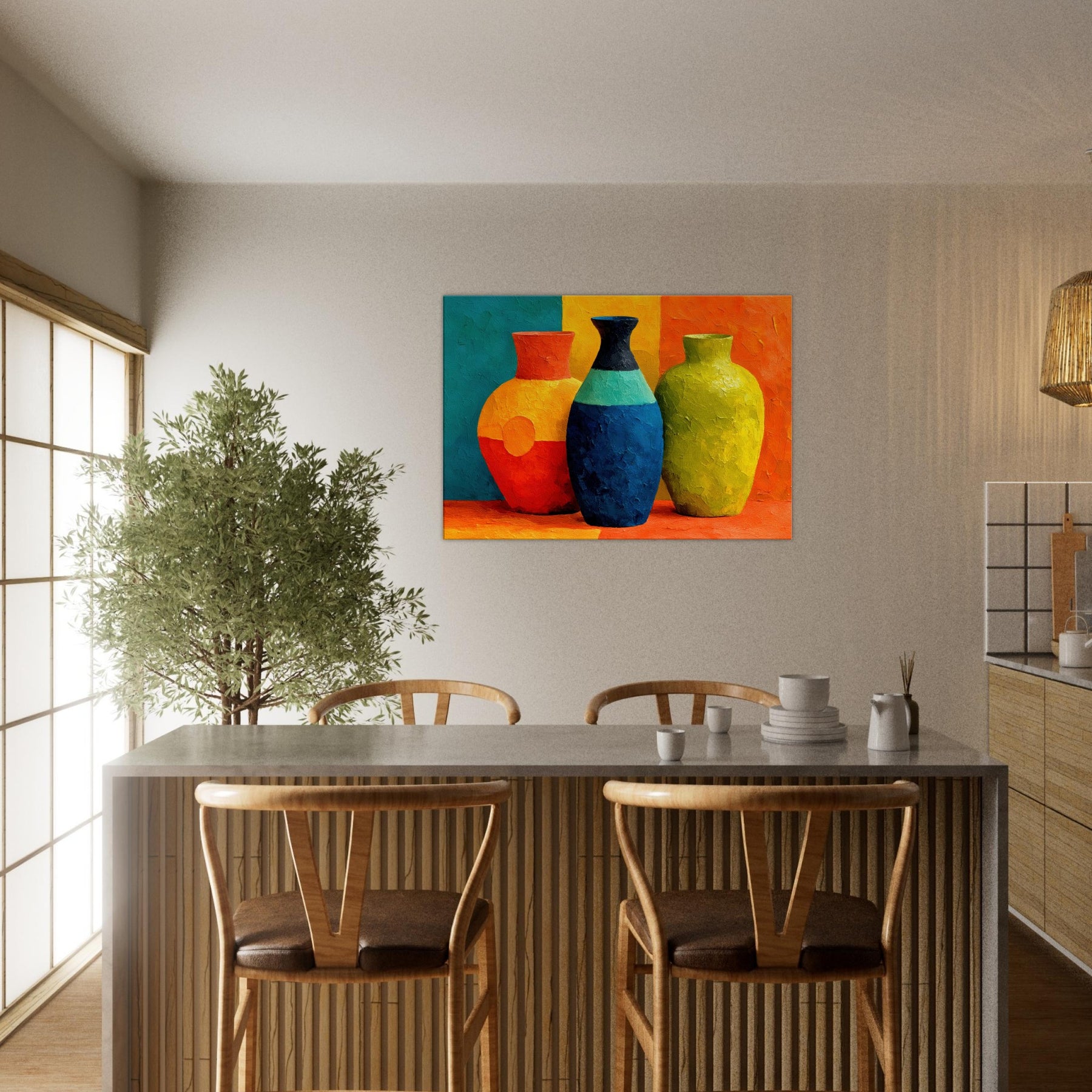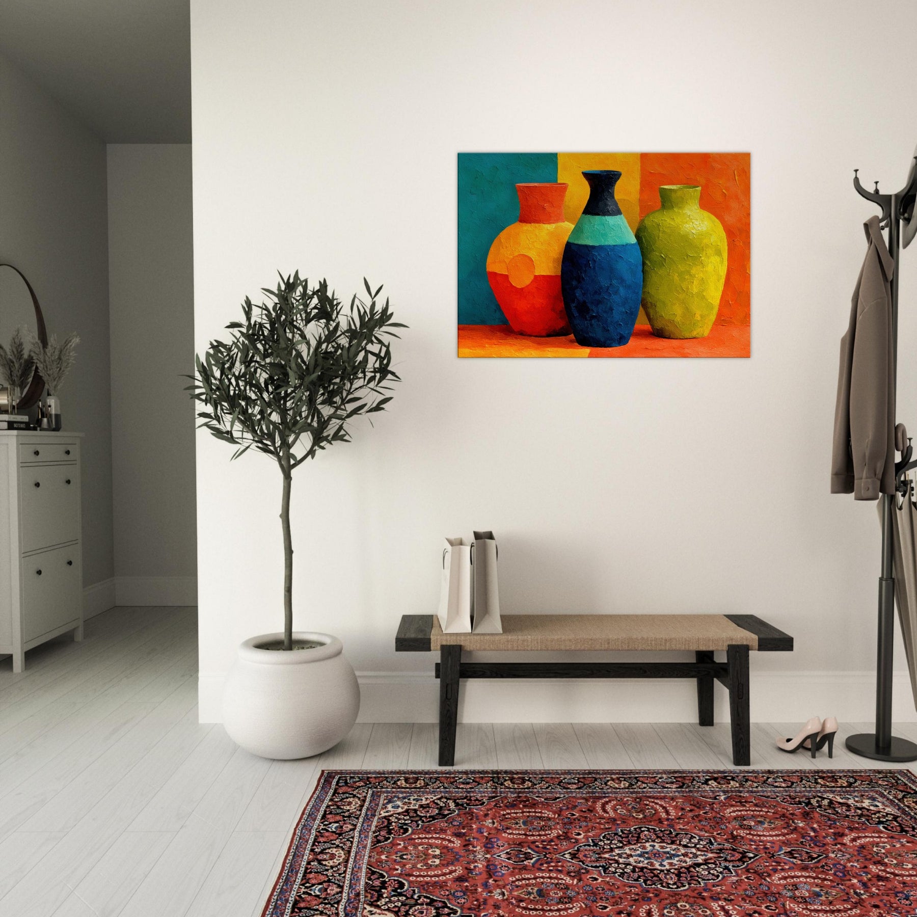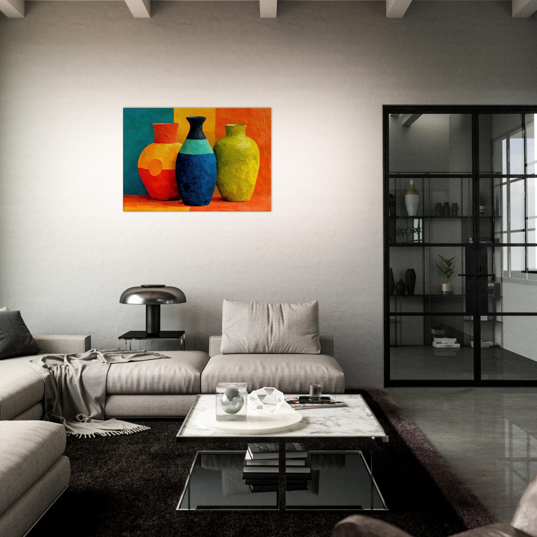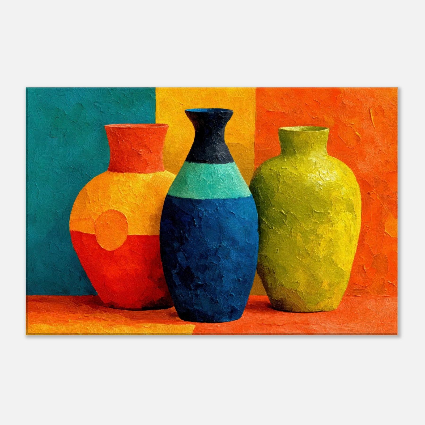 Immerse your space in a chorus of color with Vase Trio, where three sculpted silhouettes rise from a field of luminous warmth. The layered textures catch light and invite the eye to wander from coral to cobalt, from lime to midnight blue. This abstract composition feels like a still life reimagined for a contemporary living room, turning ordinary walls into a quiet celebration of form, mood, and motion.
