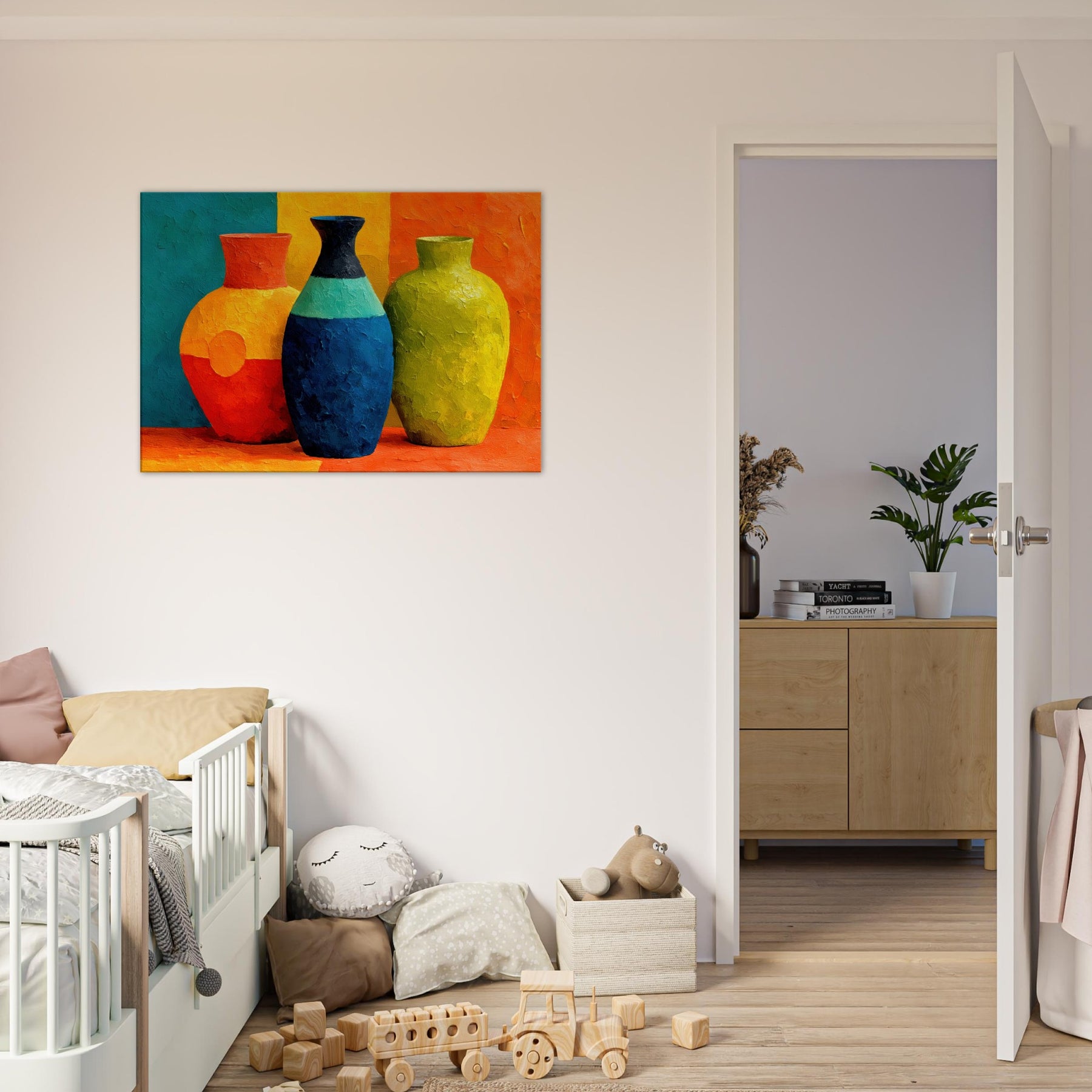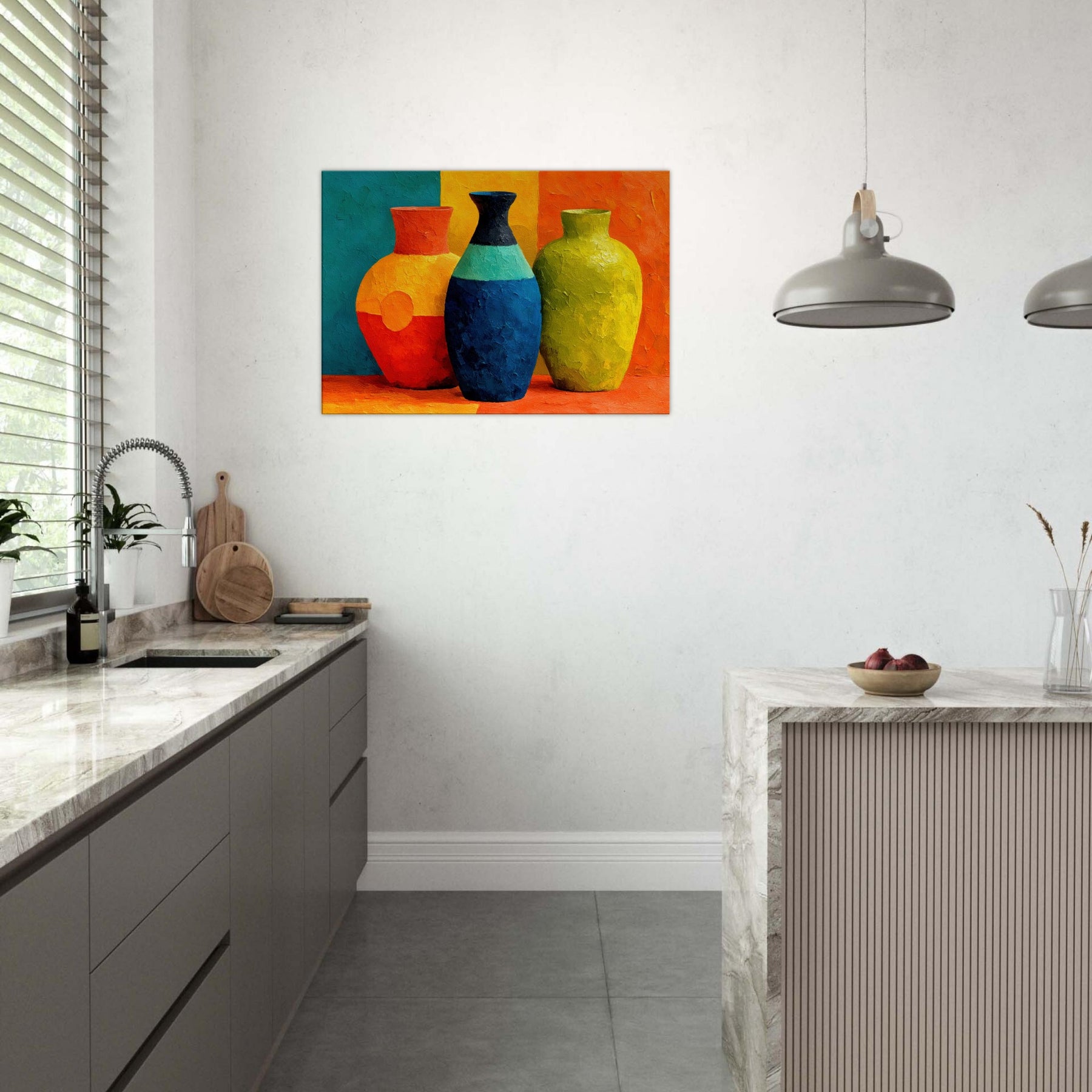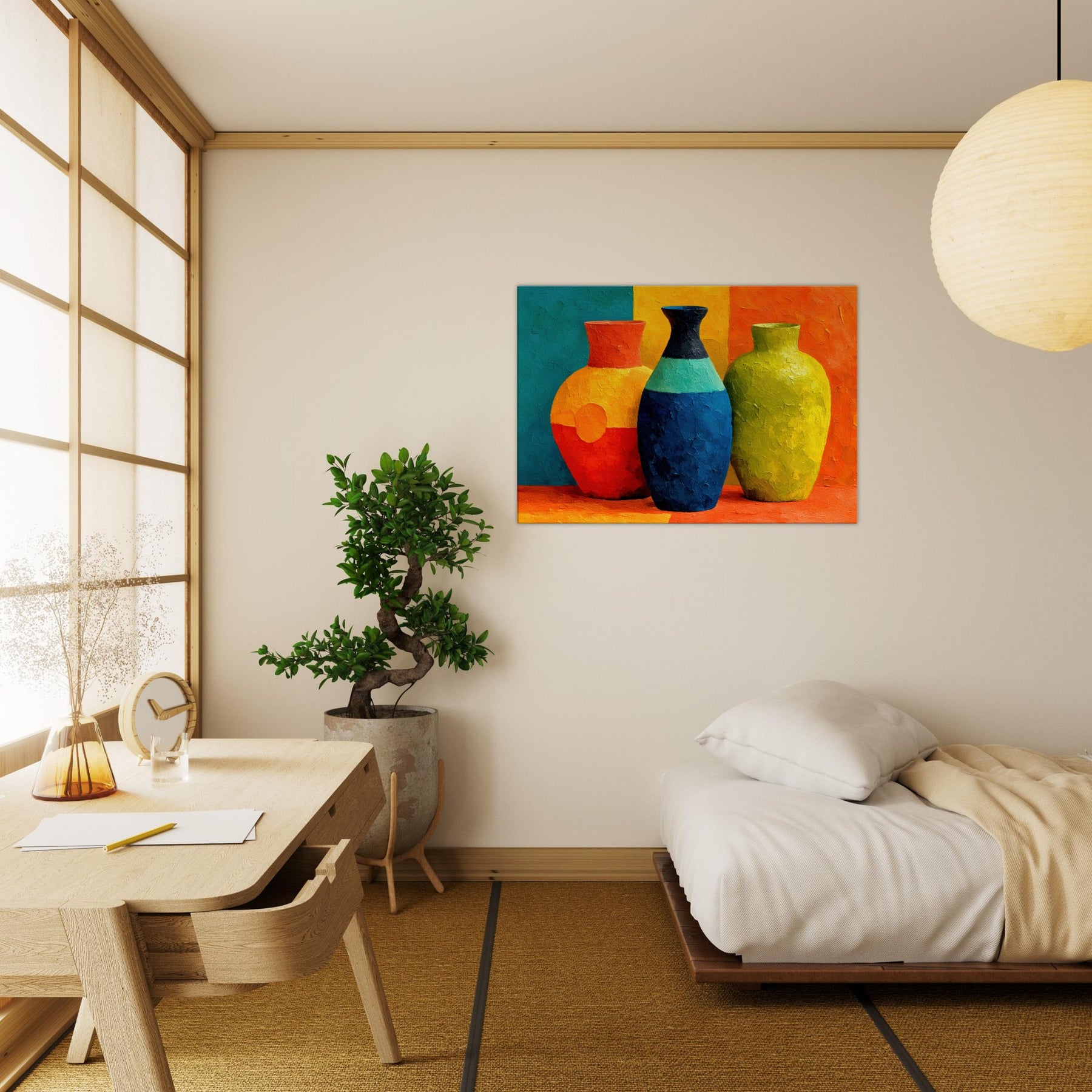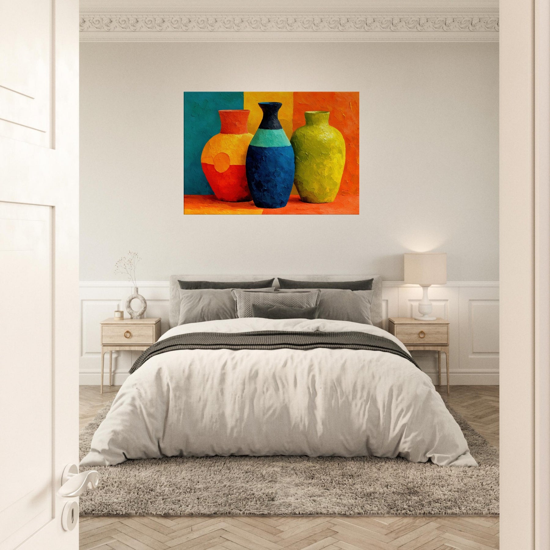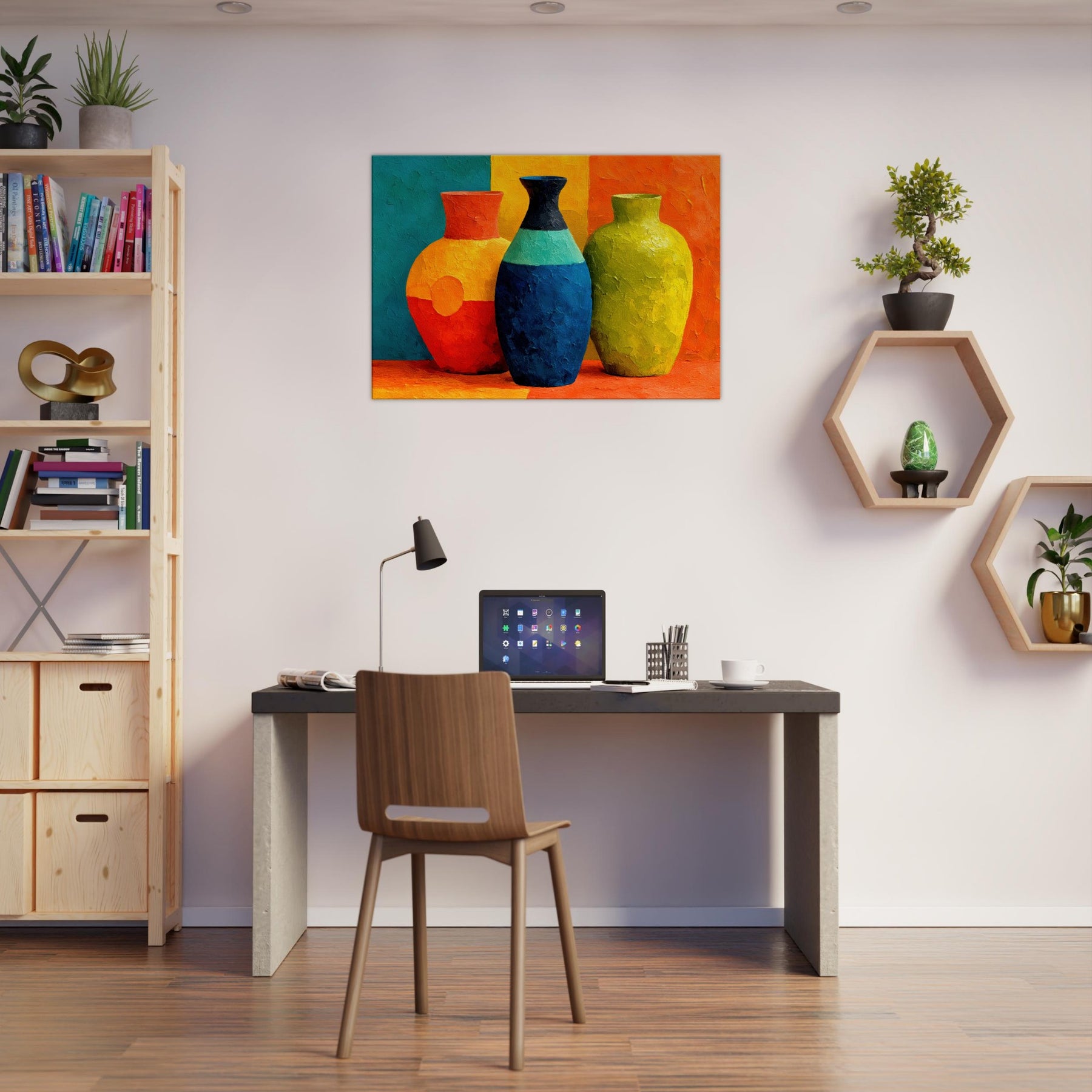 Immerse your space in a chorus of color with Vase Trio, where three sculpted silhouettes rise from a field of luminous warmth. The layered textures catch light and invite the eye to wander from coral to cobalt, from lime to midnight blue. This abstract composition feels like a still life reimagined for a contemporary living room, turning ordinary walls into a quiet celebration of form, mood, and motion.