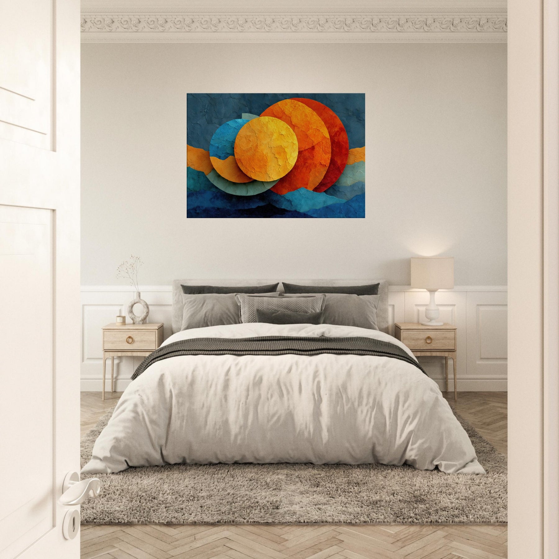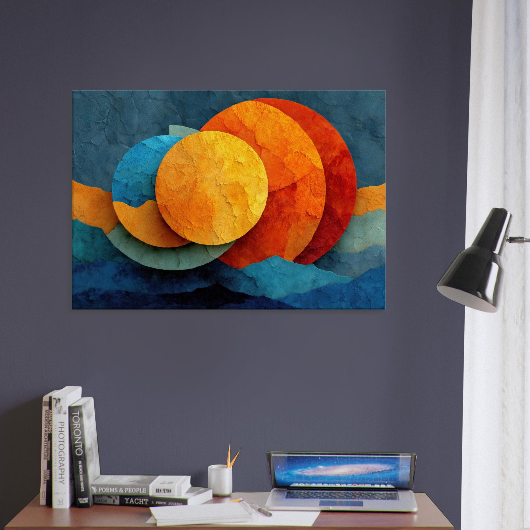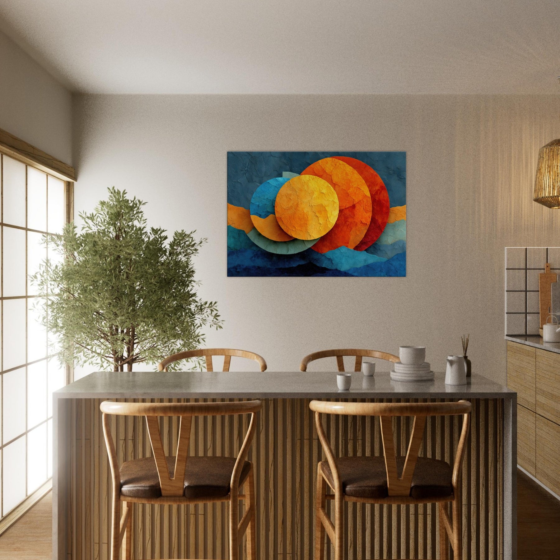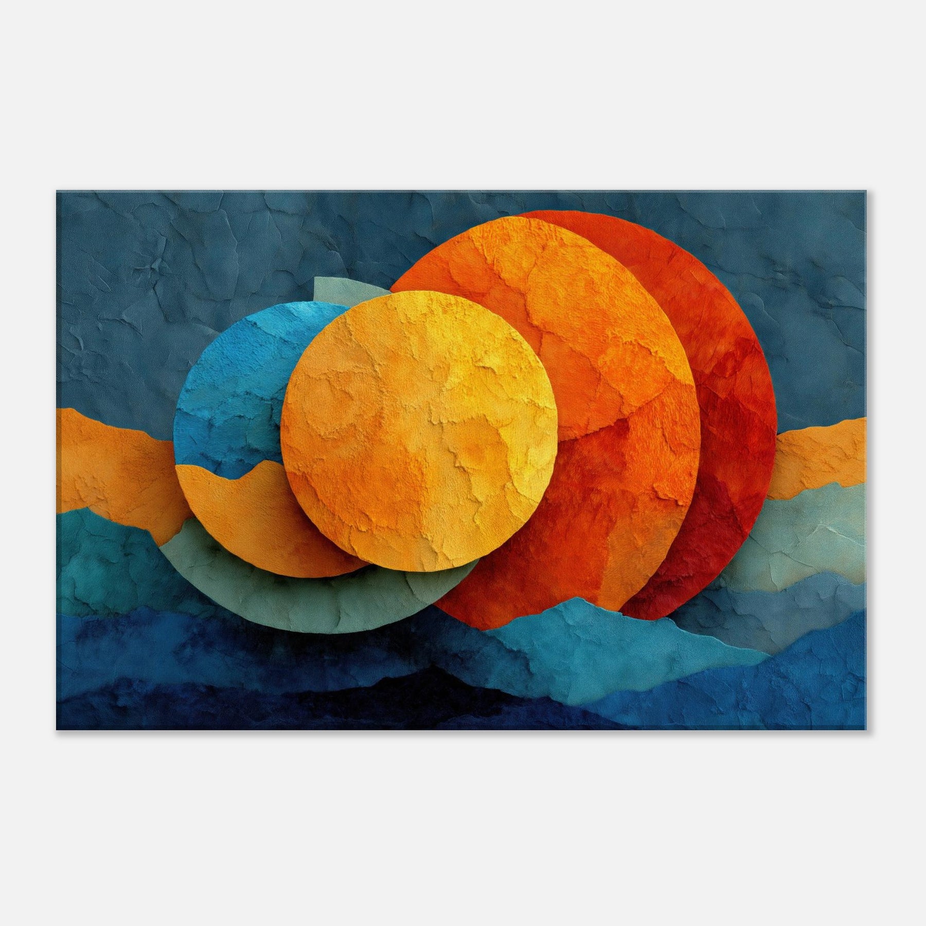 Let your space breathe with Triple Moon, where abstract circles drift like a soft constellation across a textured surface. The layered hues sunlit golds, ember oranges, and cool cerulean invite warmth and curiosity, turning any room into a nocturnal sanctuary. This piece marries reverie and calm, elevating living spaces with a sensory glow you can feel in the air, the light, and the rhythm of your daily moments.