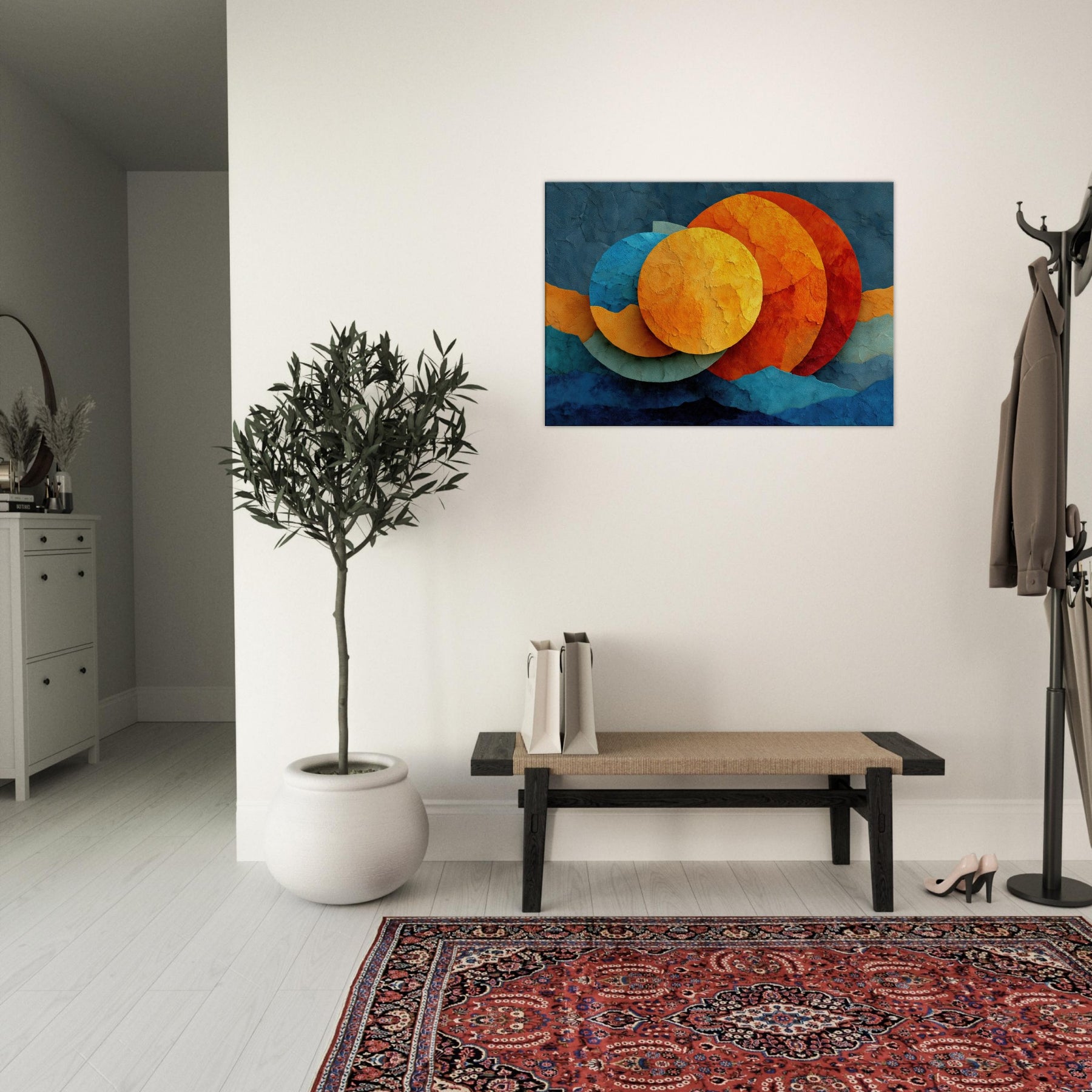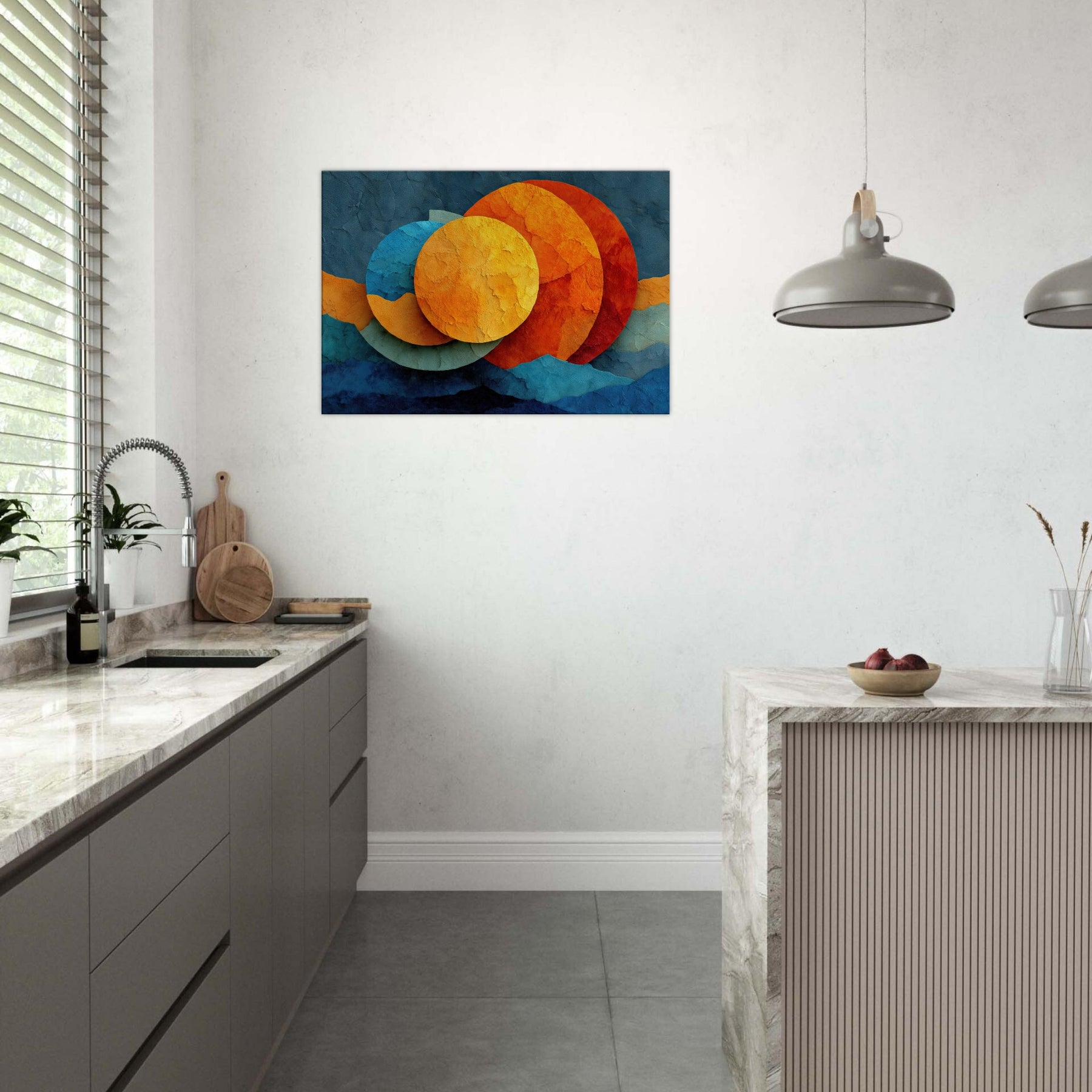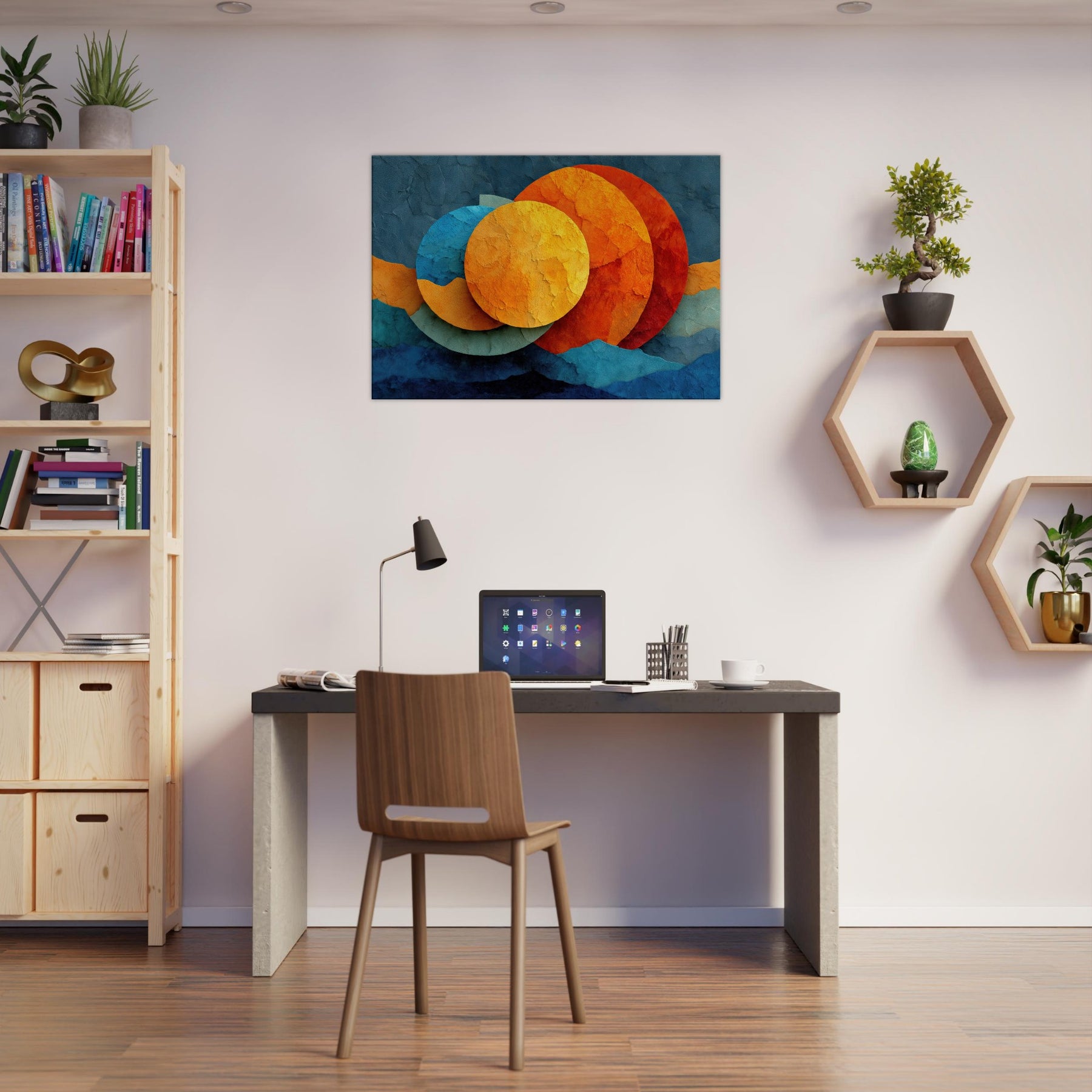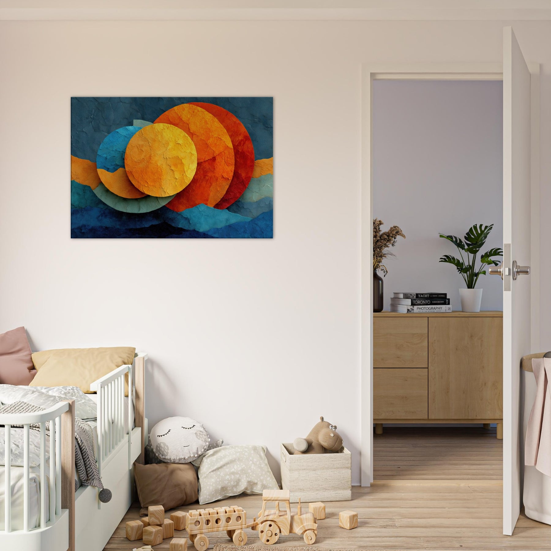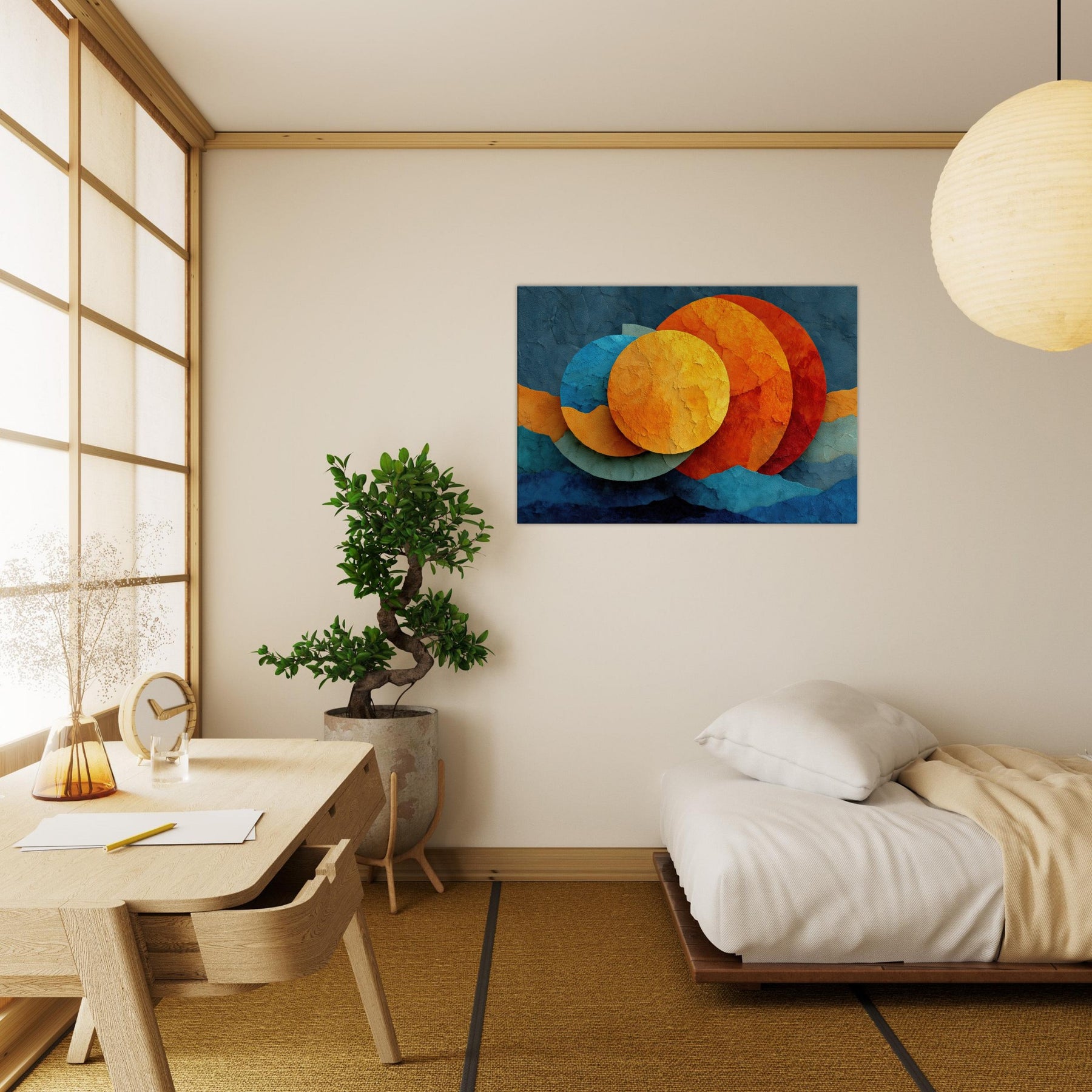 Let your space breathe with Triple Moon, where abstract circles drift like a soft constellation across a textured surface. The layered hues sunlit golds, ember oranges, and cool cerulean invite warmth and curiosity, turning any room into a nocturnal sanctuary. This piece marries reverie and calm, elevating living spaces with a sensory glow you can feel in the air, the light, and the rhythm of your daily moments.