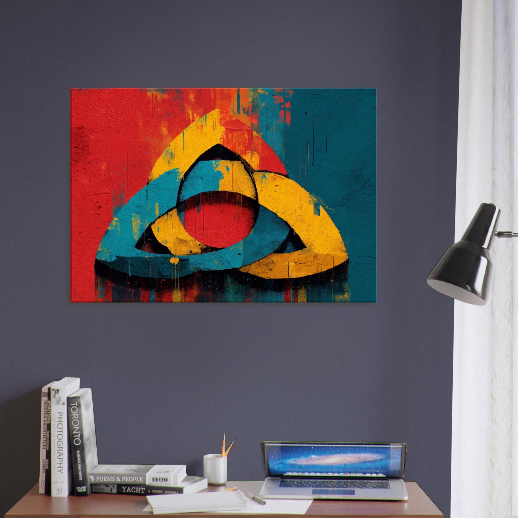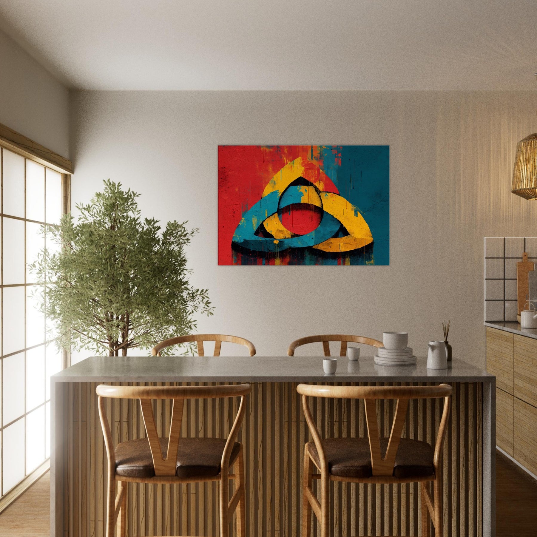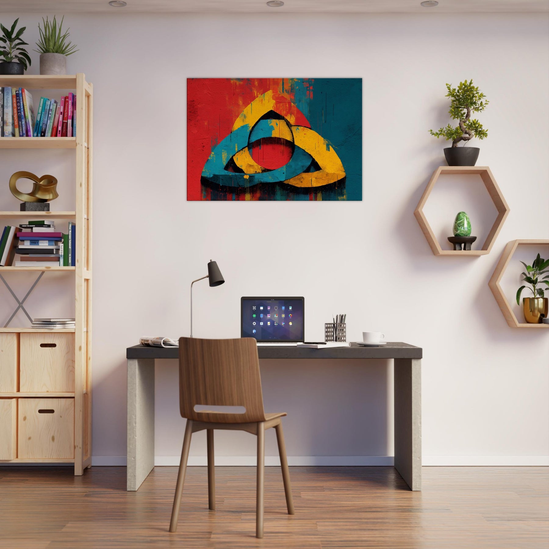 Step into a moment of quiet ceremony with the Celtic Triquetra rendered in vibrant, overlapping ribbons of blue, yellow, and red. The abstract loops orbit a red core, suggesting unity, protection, and the cyclical nature of time. A tactile, weathered finish lends depth and warmth, turning walls into a tranquil sanctuary. In a living room or study, this piece invites slow looking, soft light, and a sense of mystical calm that elevates everyday space.