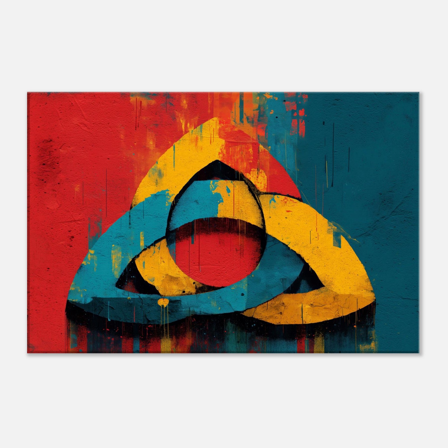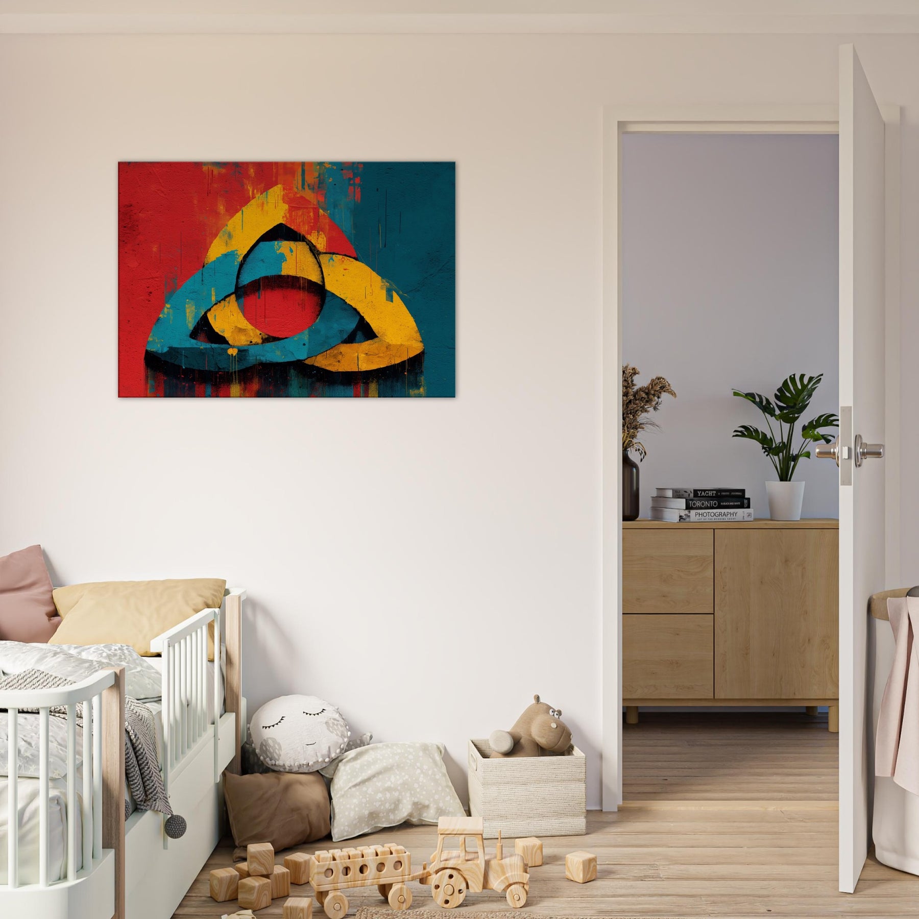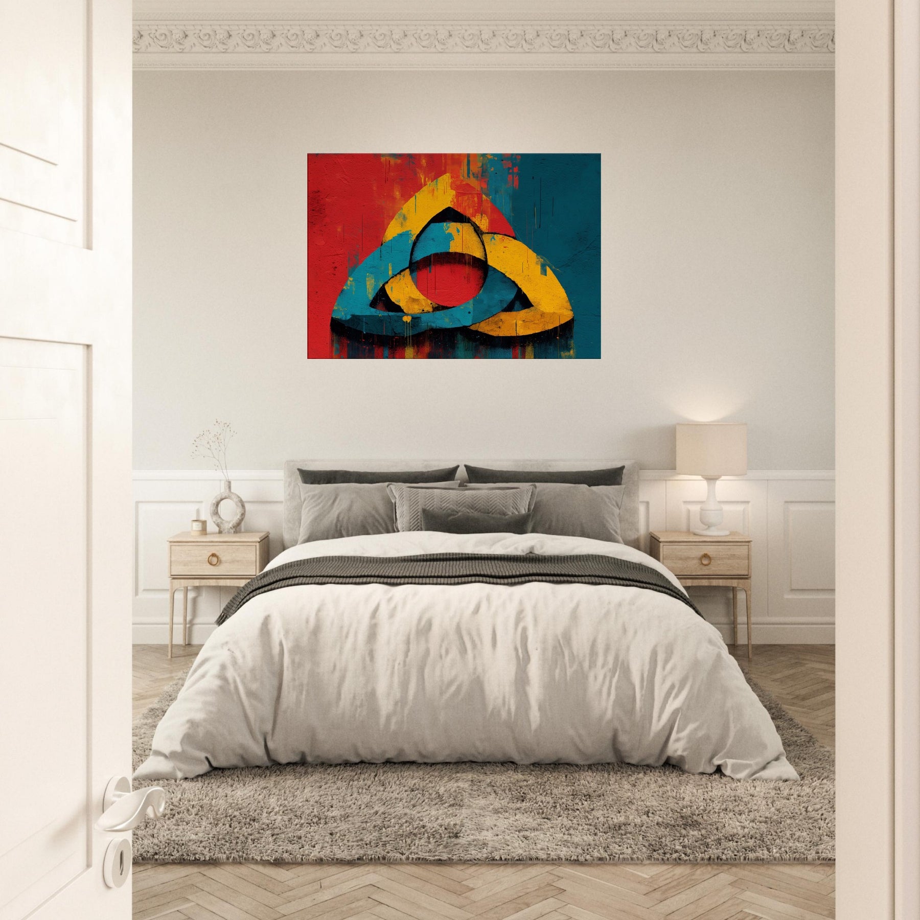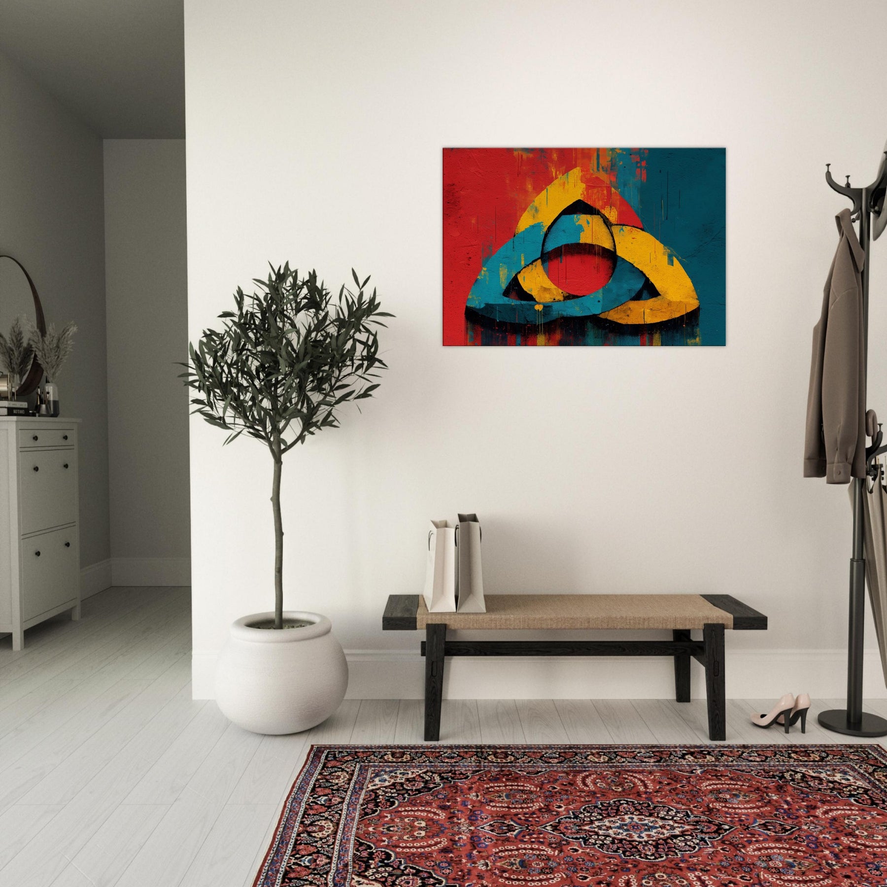 Step into a moment of quiet ceremony with the Celtic Triquetra rendered in vibrant, overlapping ribbons of blue, yellow, and red. The abstract loops orbit a red core, suggesting unity, protection, and the cyclical nature of time. A tactile, weathered finish lends depth and warmth, turning walls into a tranquil sanctuary. In a living room or study, this piece invites slow looking, soft light, and a sense of mystical calm that elevates everyday space.