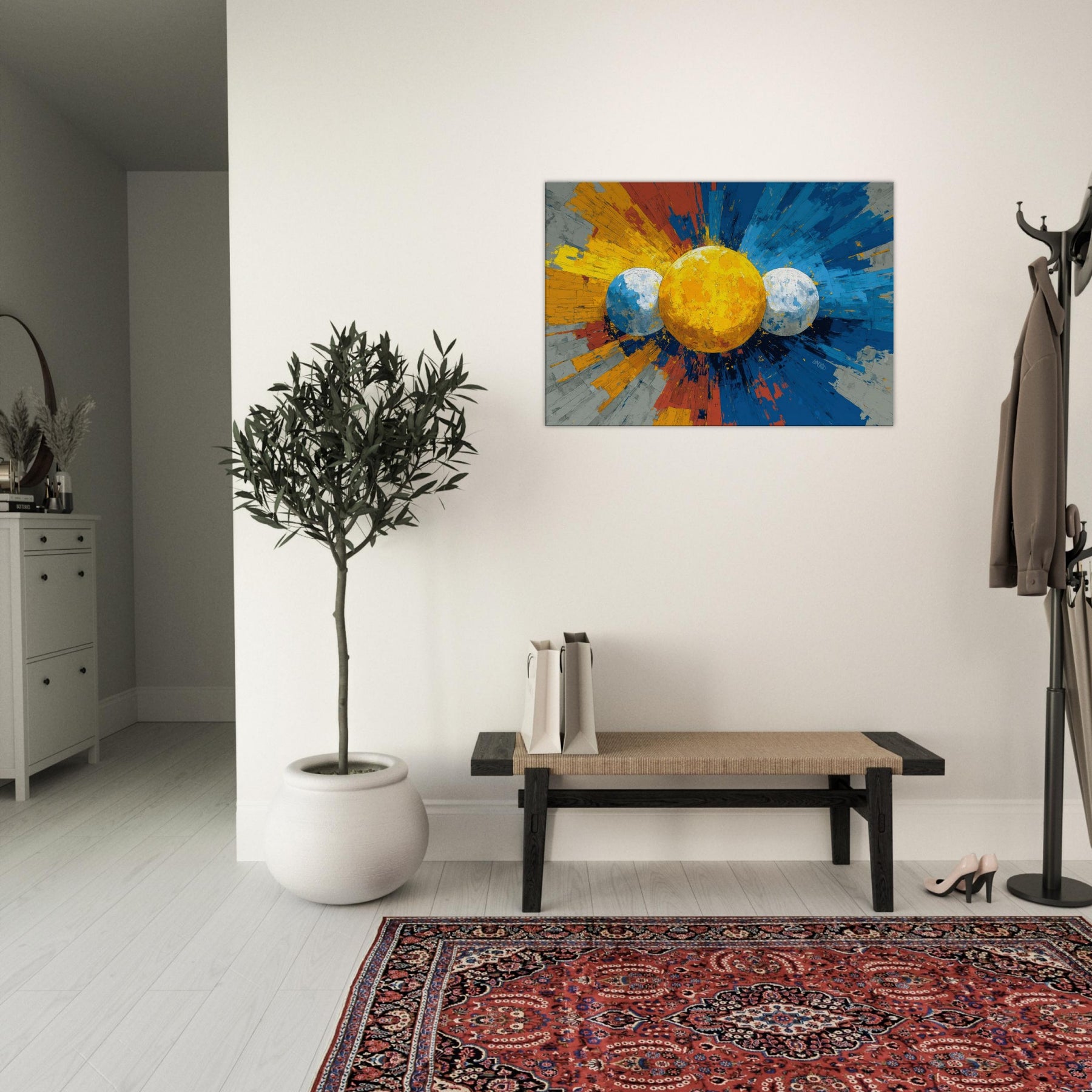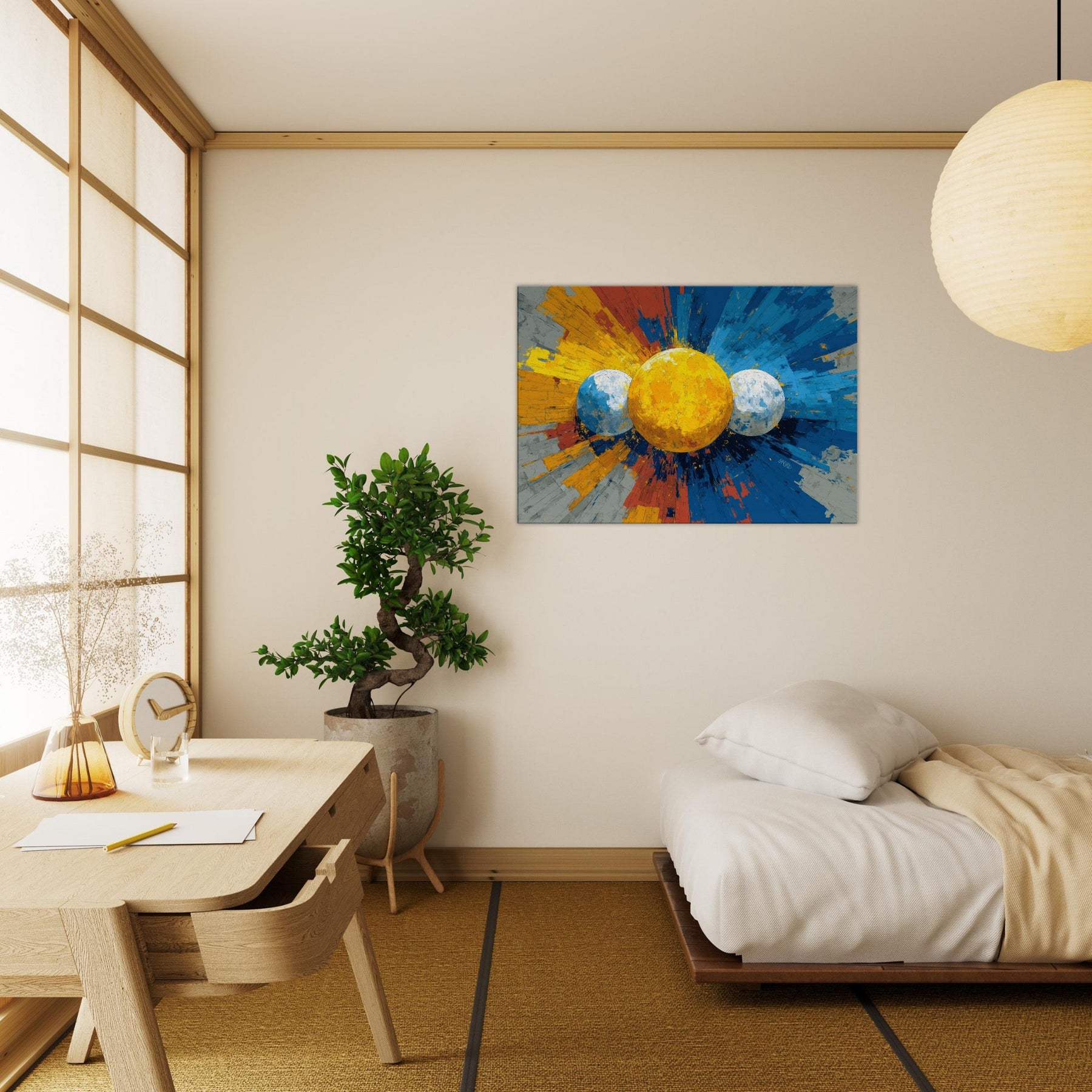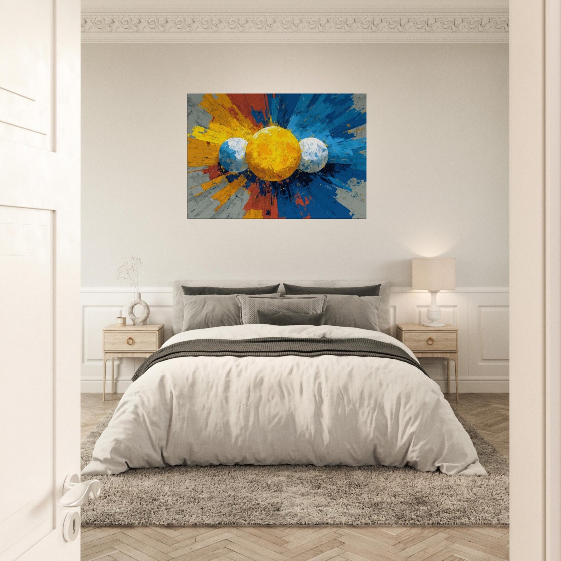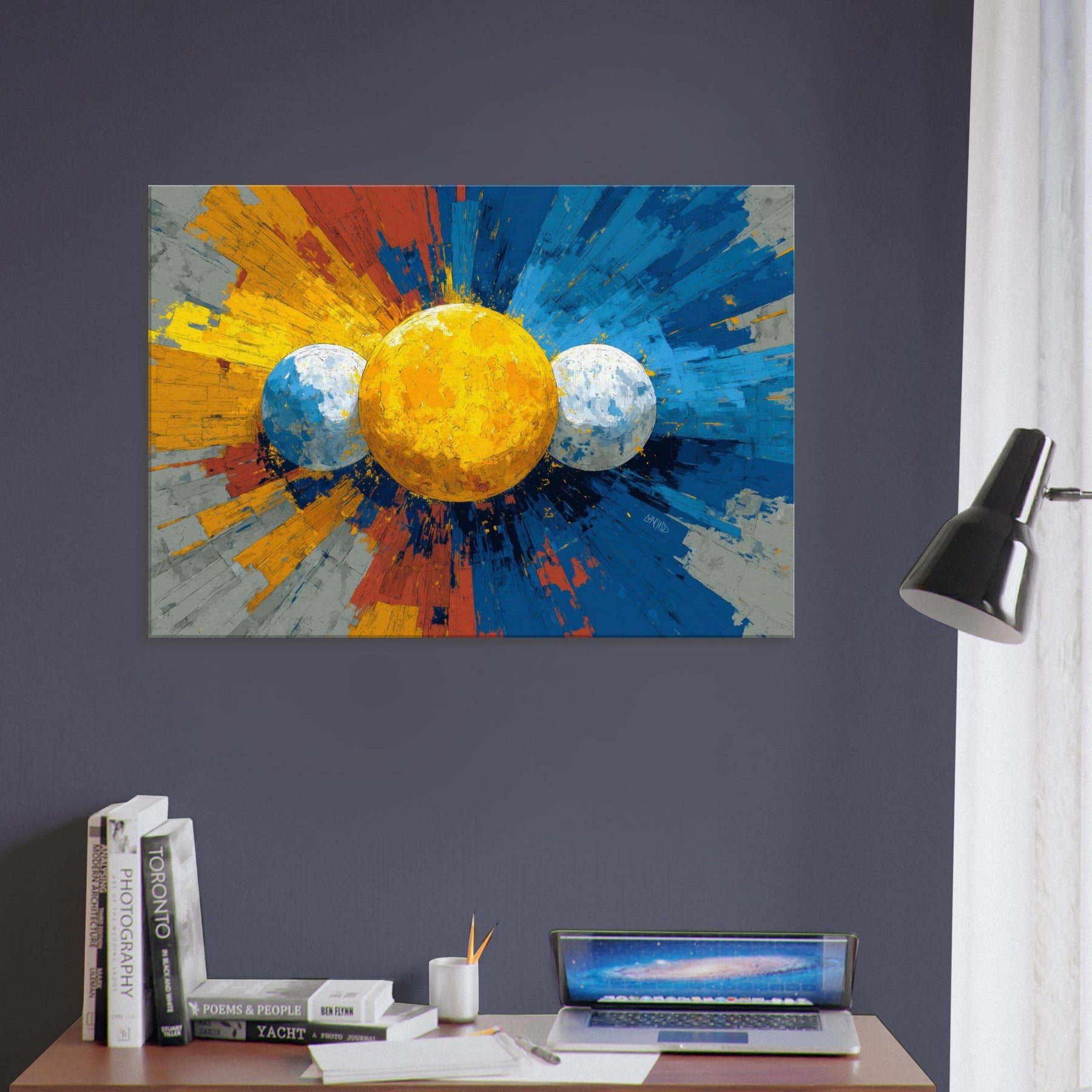 Triple Moon unfolds as a luminous meditation in color, where a radiant gold orb anchors the composition and two pale orbs orbit in quiet reverie. The abstract explosion of azure, gold, and graphite radiates a kinetic calm, as if the room itself breathes with lunar tides. This piece invites twilight soirées and morning reflections alike, softening corners with a warm glow and a cool hush. Hang it where you want a focal moment of mysticism a living room, entry, or study to evoke contemplation, wonder, and a serene, otherworldly atmosphere.
