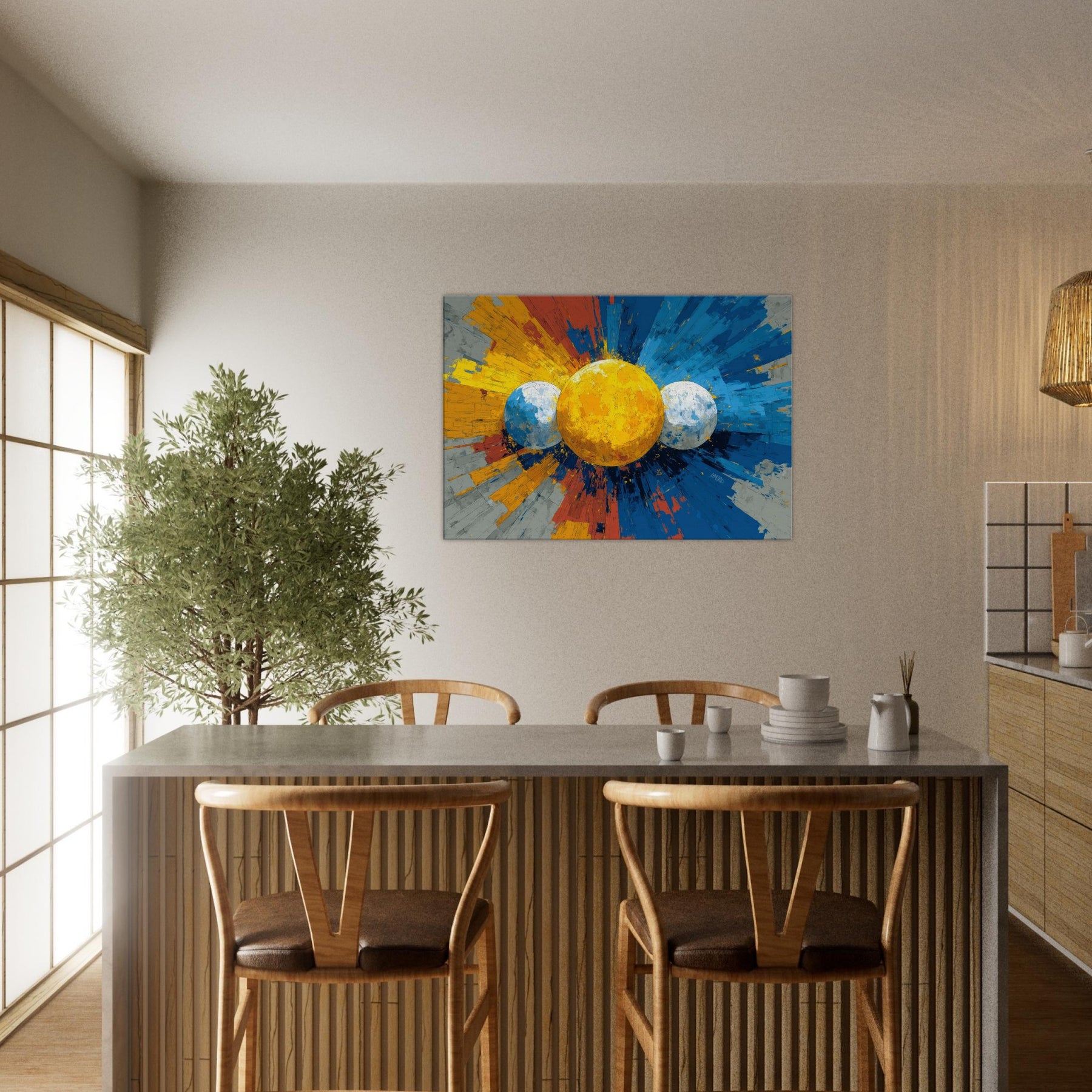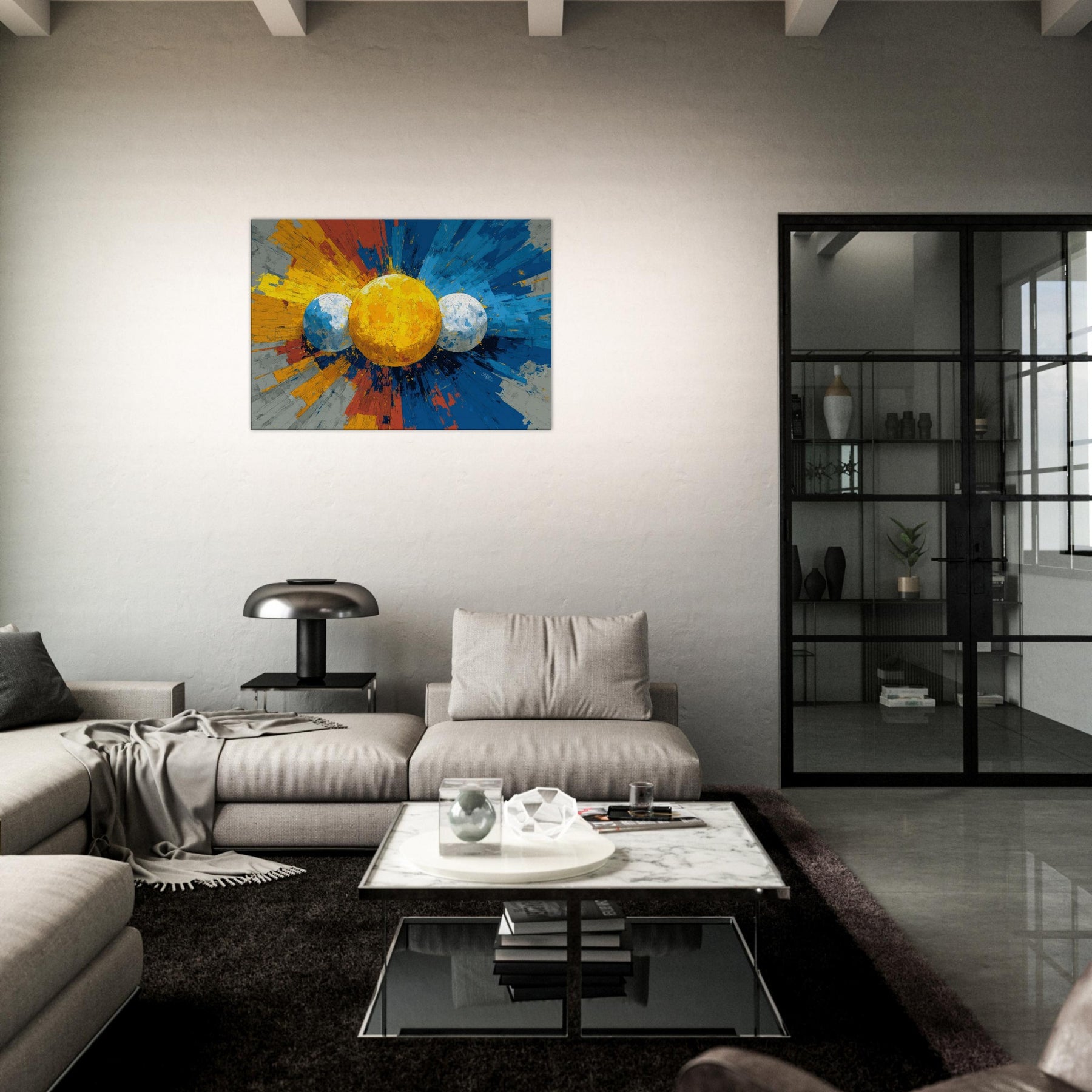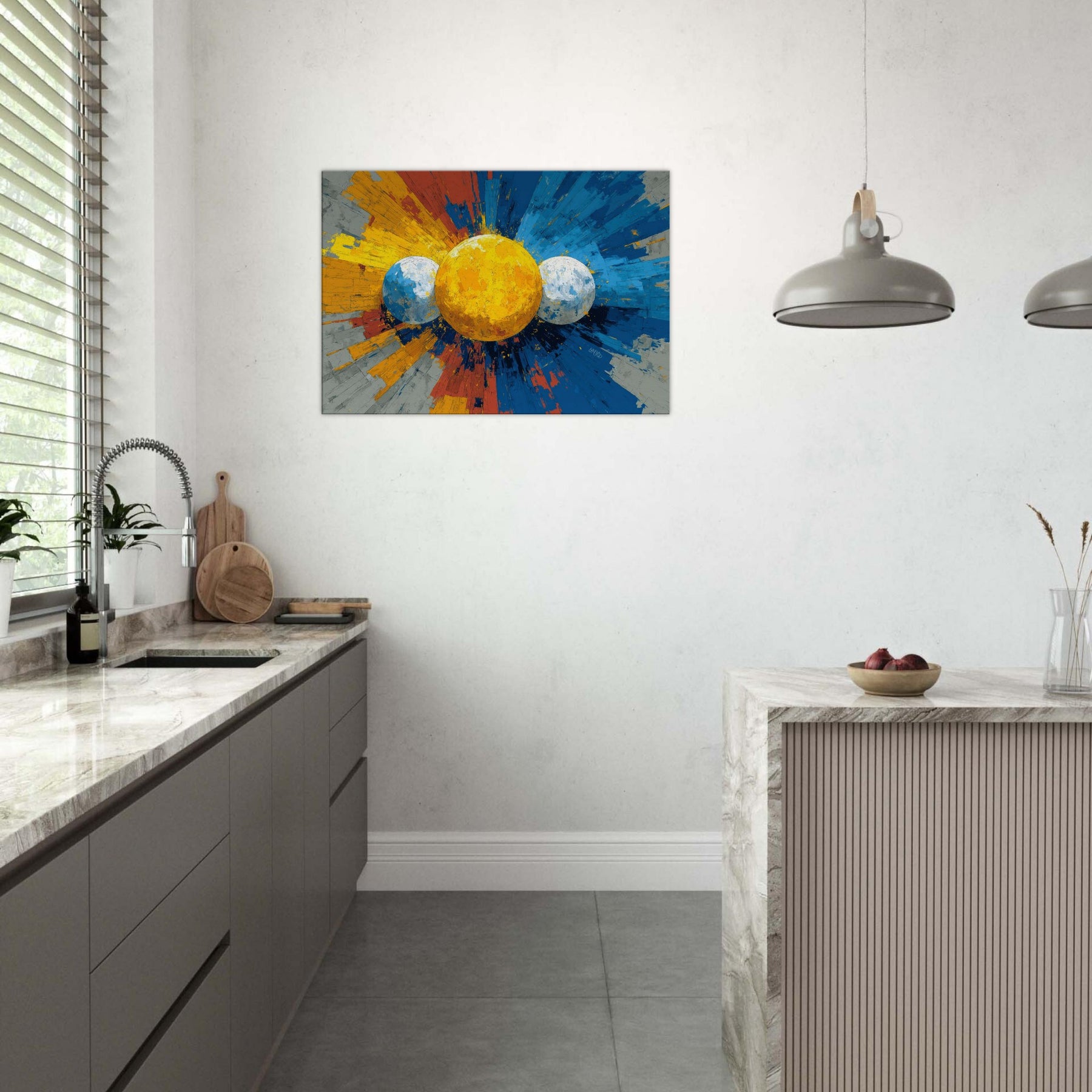 Triple Moon unfolds as a luminous meditation in color, where a radiant gold orb anchors the composition and two pale orbs orbit in quiet reverie. The abstract explosion of azure, gold, and graphite radiates a kinetic calm, as if the room itself breathes with lunar tides. This piece invites twilight soirées and morning reflections alike, softening corners with a warm glow and a cool hush. Hang it where you want a focal moment of mysticism a living room, entry, or study to evoke contemplation, wonder, and a serene, otherworldly atmosphere.