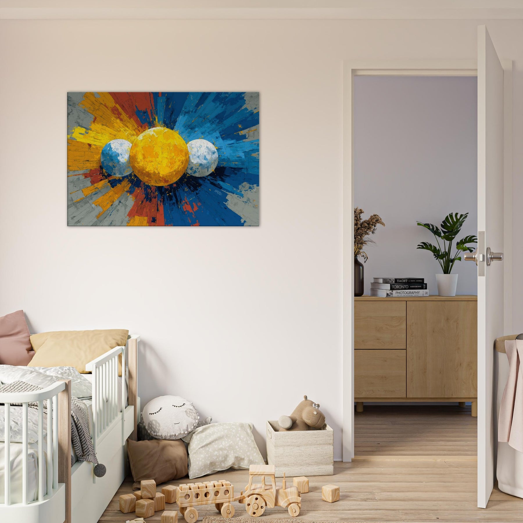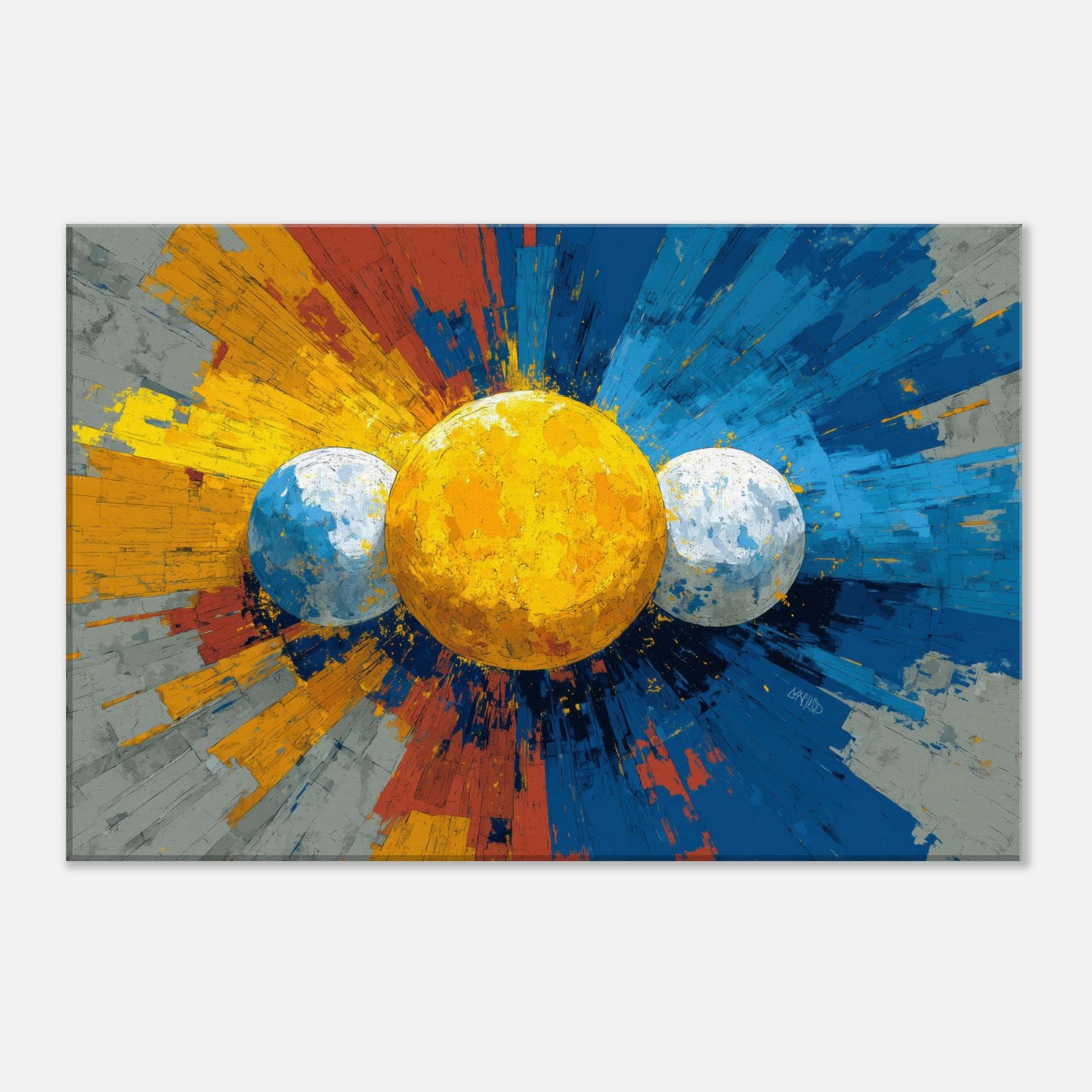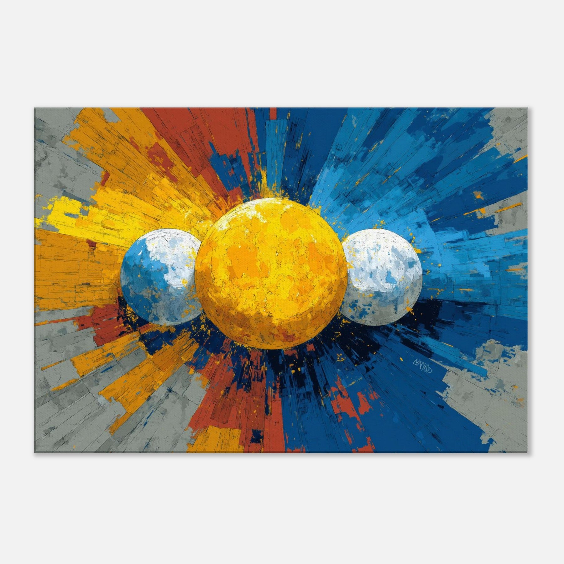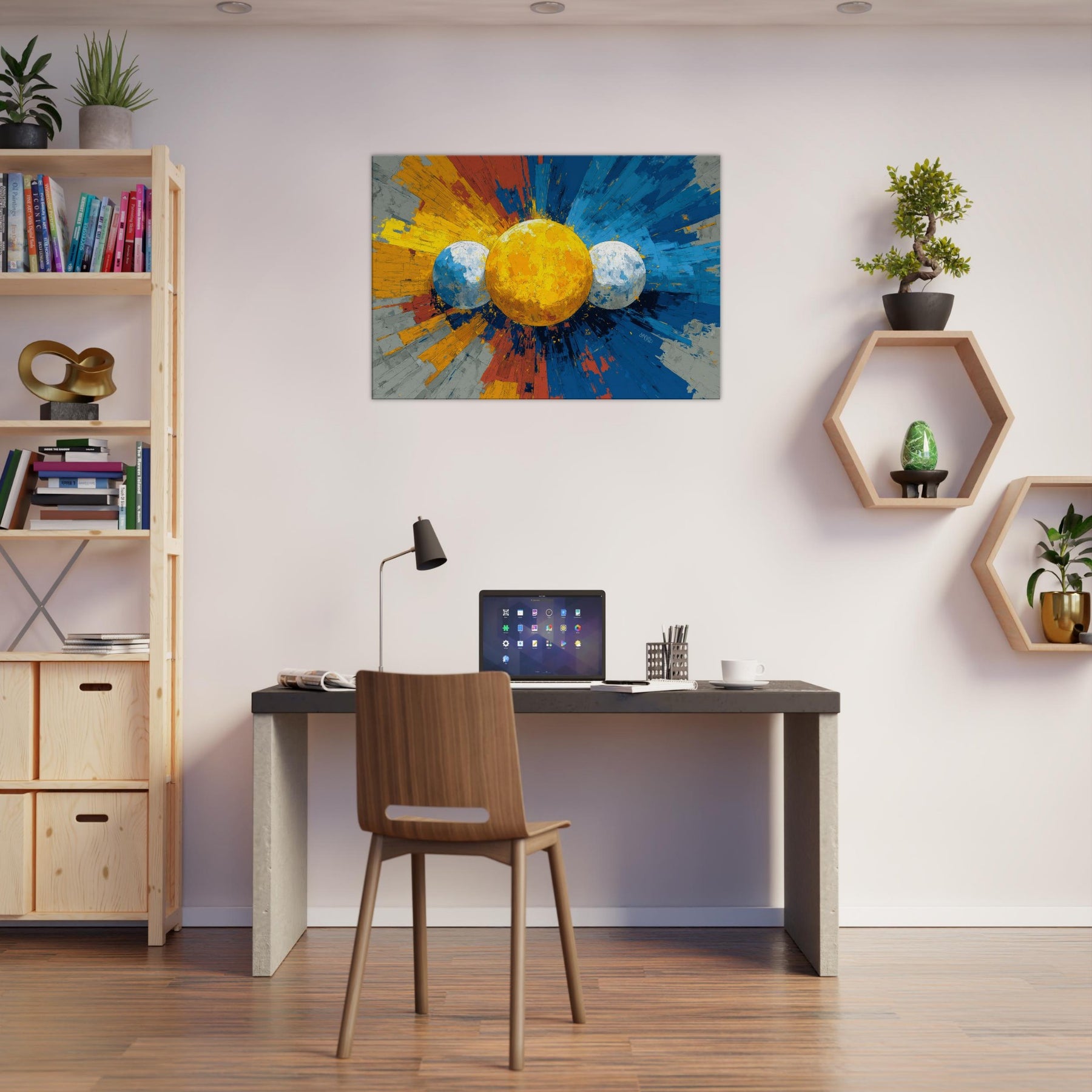 Triple Moon unfolds as a luminous meditation in color, where a radiant gold orb anchors the composition and two pale orbs orbit in quiet reverie. The abstract explosion of azure, gold, and graphite radiates a kinetic calm, as if the room itself breathes with lunar tides. This piece invites twilight soirées and morning reflections alike, softening corners with a warm glow and a cool hush. Hang it where you want a focal moment of mysticism a living room, entry, or study to evoke contemplation, wonder, and a serene, otherworldly atmosphere.