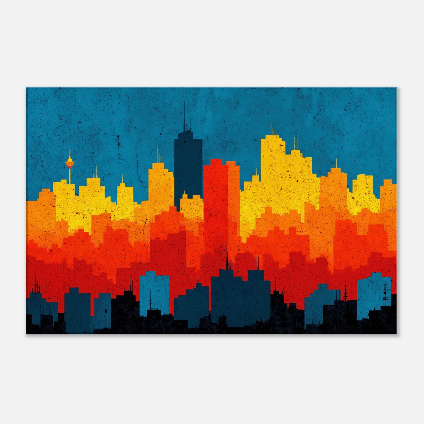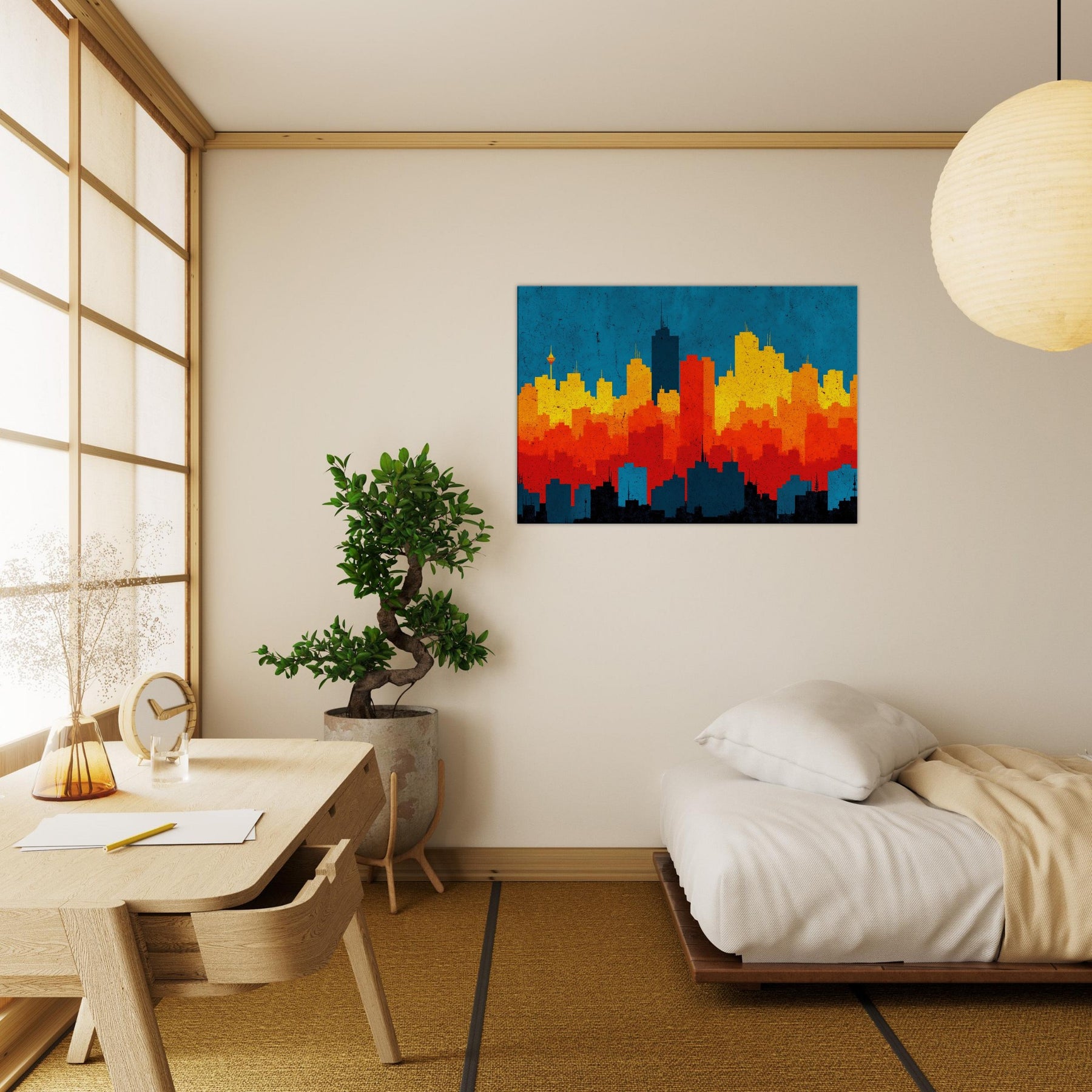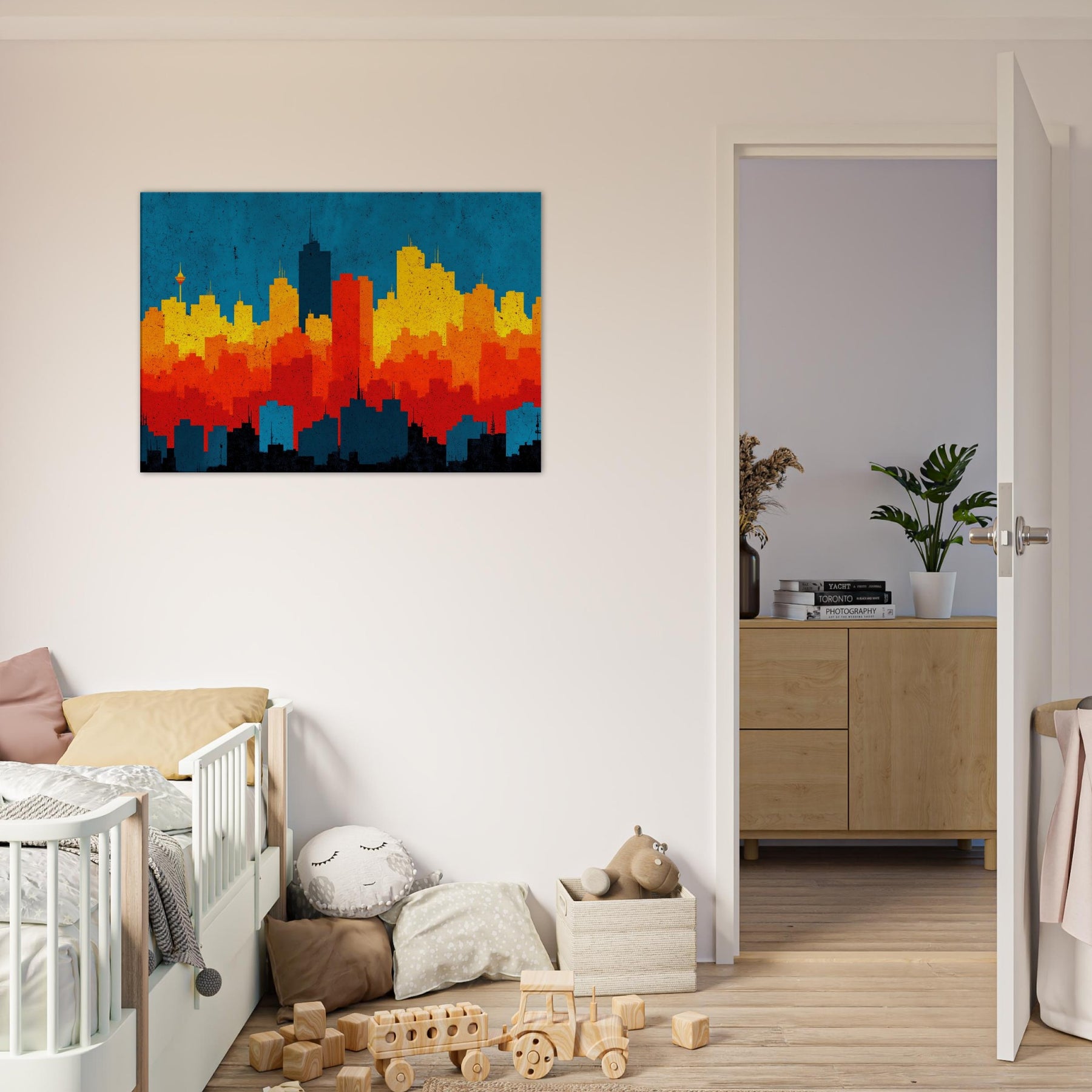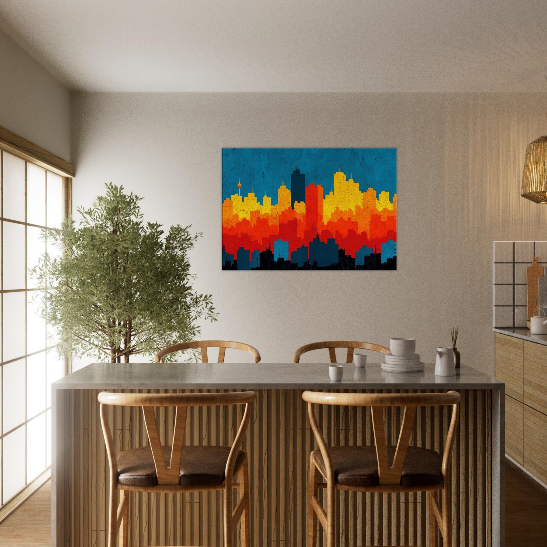 Sao Paulo leaps from the canvas in a fearless chorus of color and geometry. This abstract skyline pulses with energy: warm oranges and yellows rise in jagged blocks while a deep blue sky steadies the composition, like the city’s midnight hum. It invites the room to breathe to feel the heat of dusk, the clatter of distant streets, the pulse of a metropolis quieting into evening. Perfect for a modern living space, it adds warmth, movement, and a sophisticated urban glow.