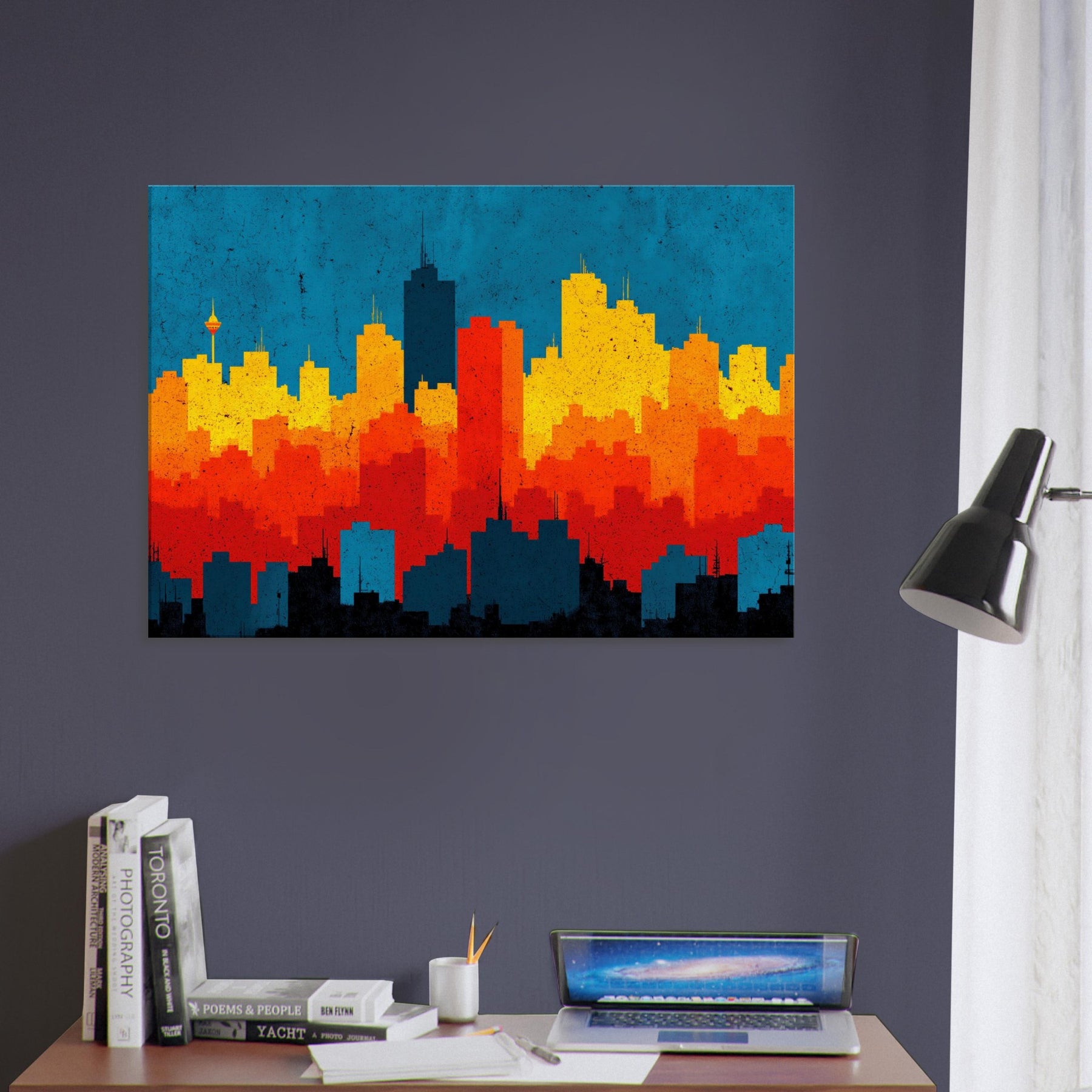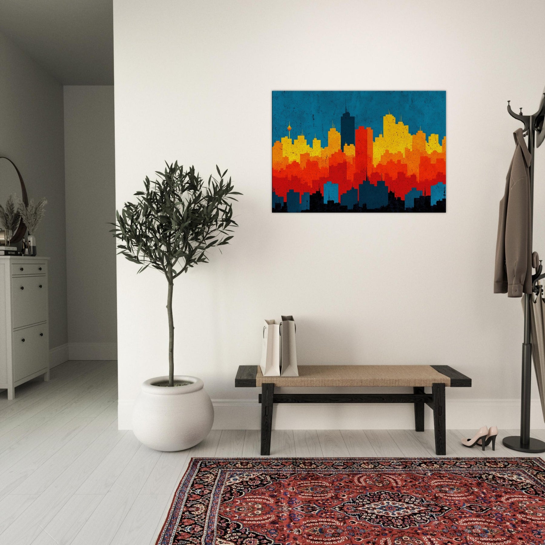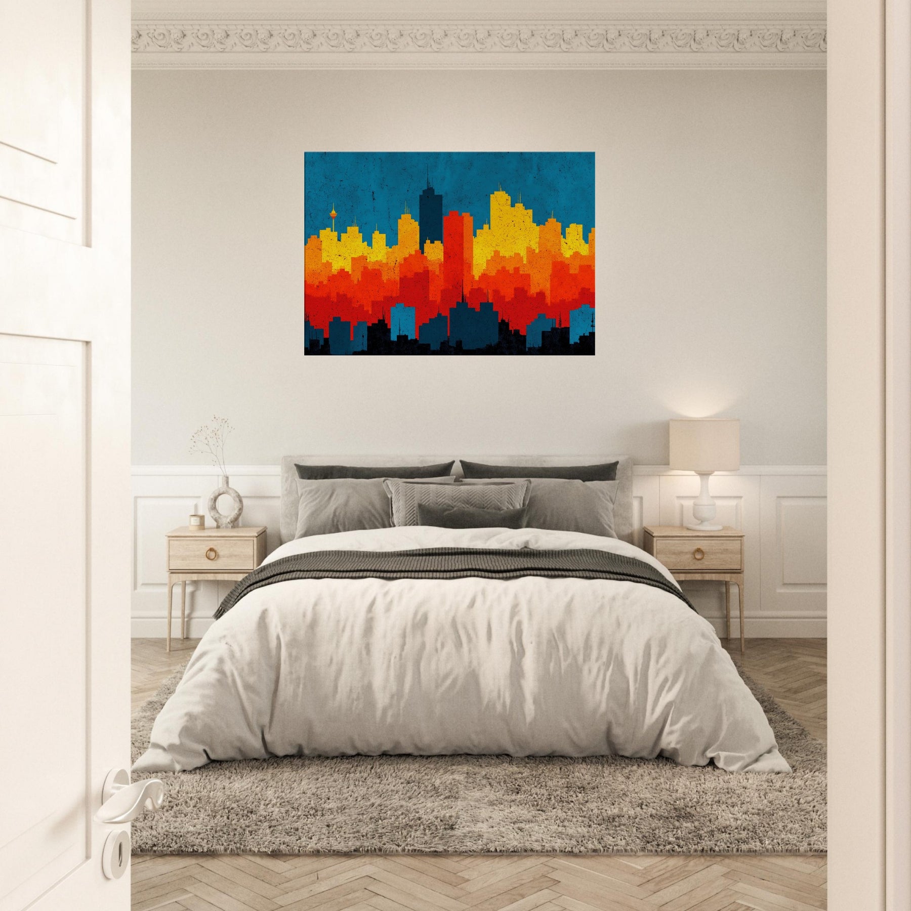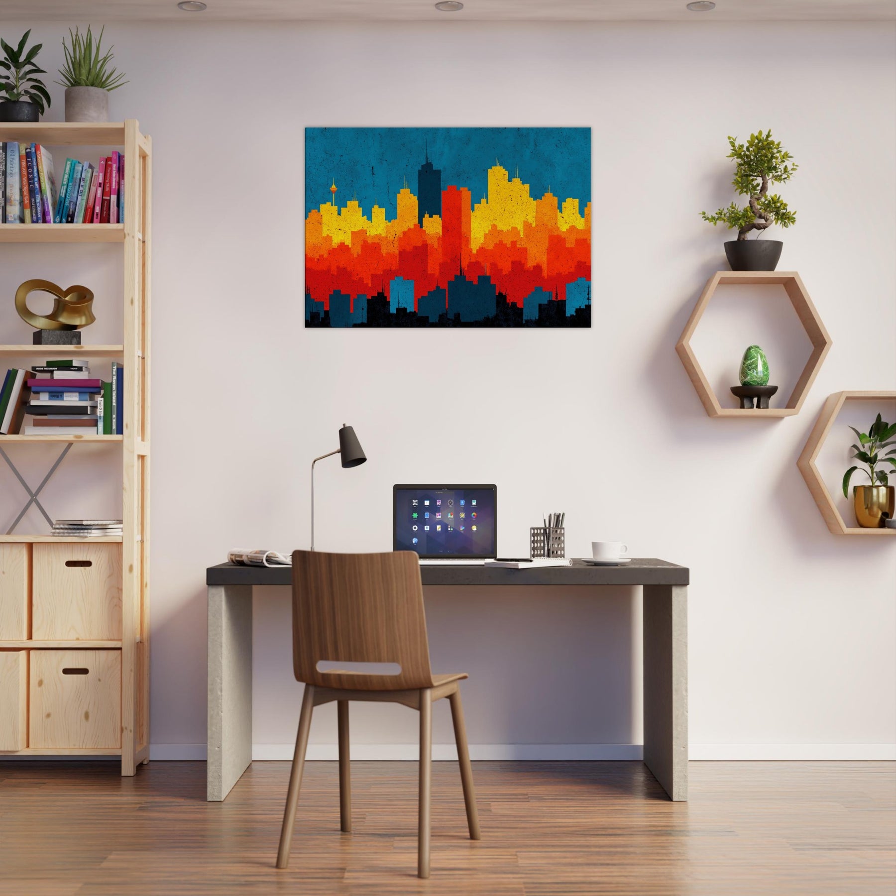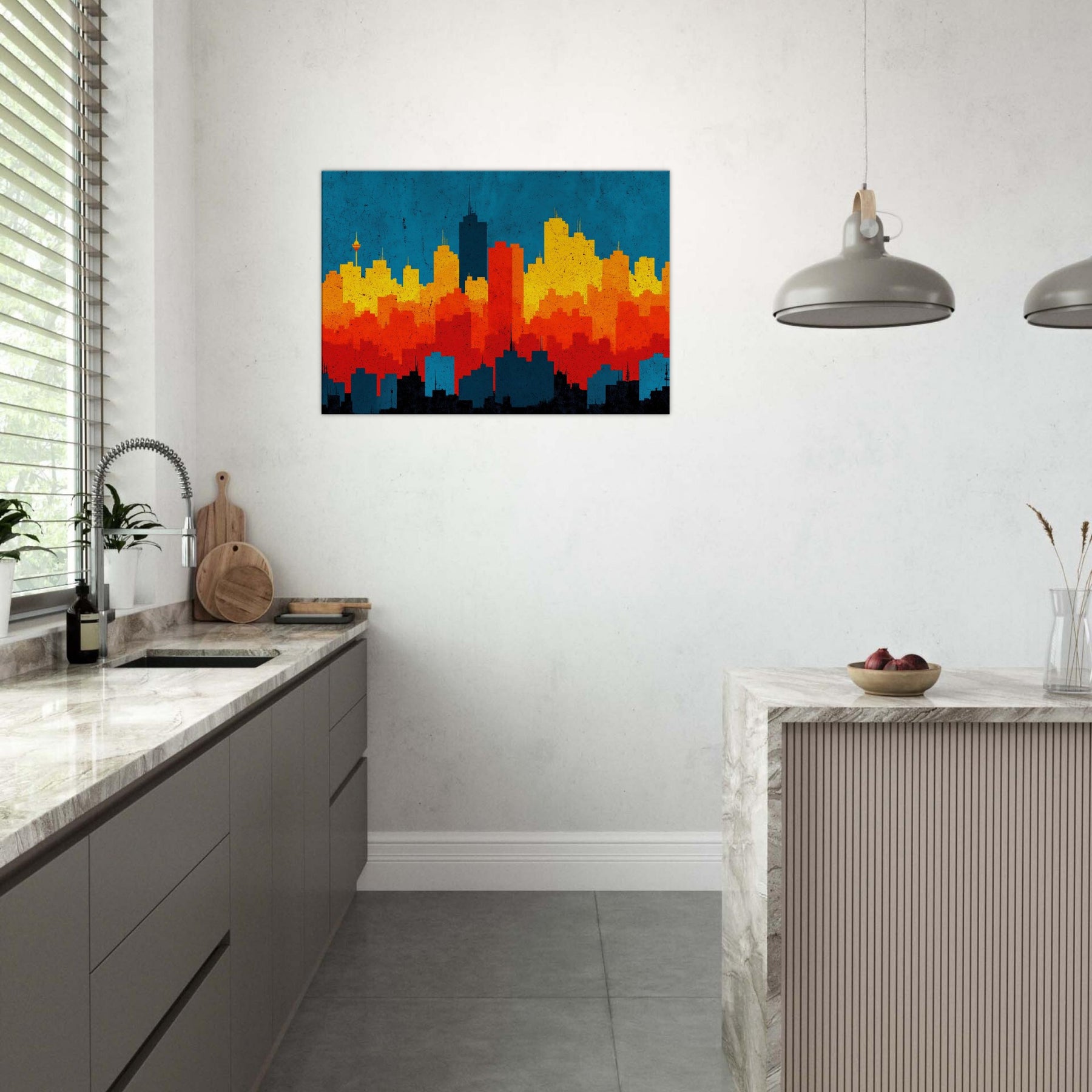 Sao Paulo leaps from the canvas in a fearless chorus of color and geometry. This abstract skyline pulses with energy: warm oranges and yellows rise in jagged blocks while a deep blue sky steadies the composition, like the city’s midnight hum. It invites the room to breathe to feel the heat of dusk, the clatter of distant streets, the pulse of a metropolis quieting into evening. Perfect for a modern living space, it adds warmth, movement, and a sophisticated urban glow.