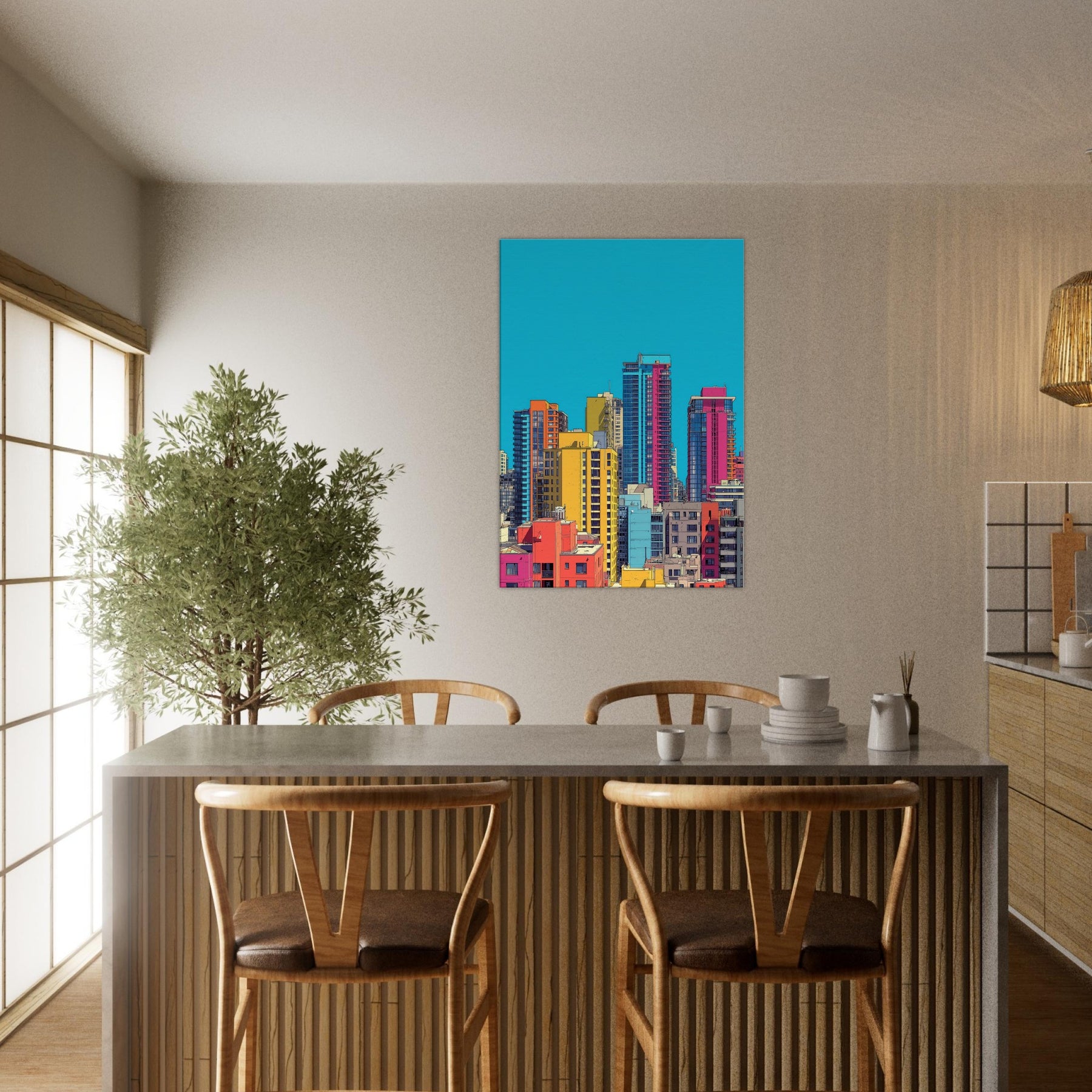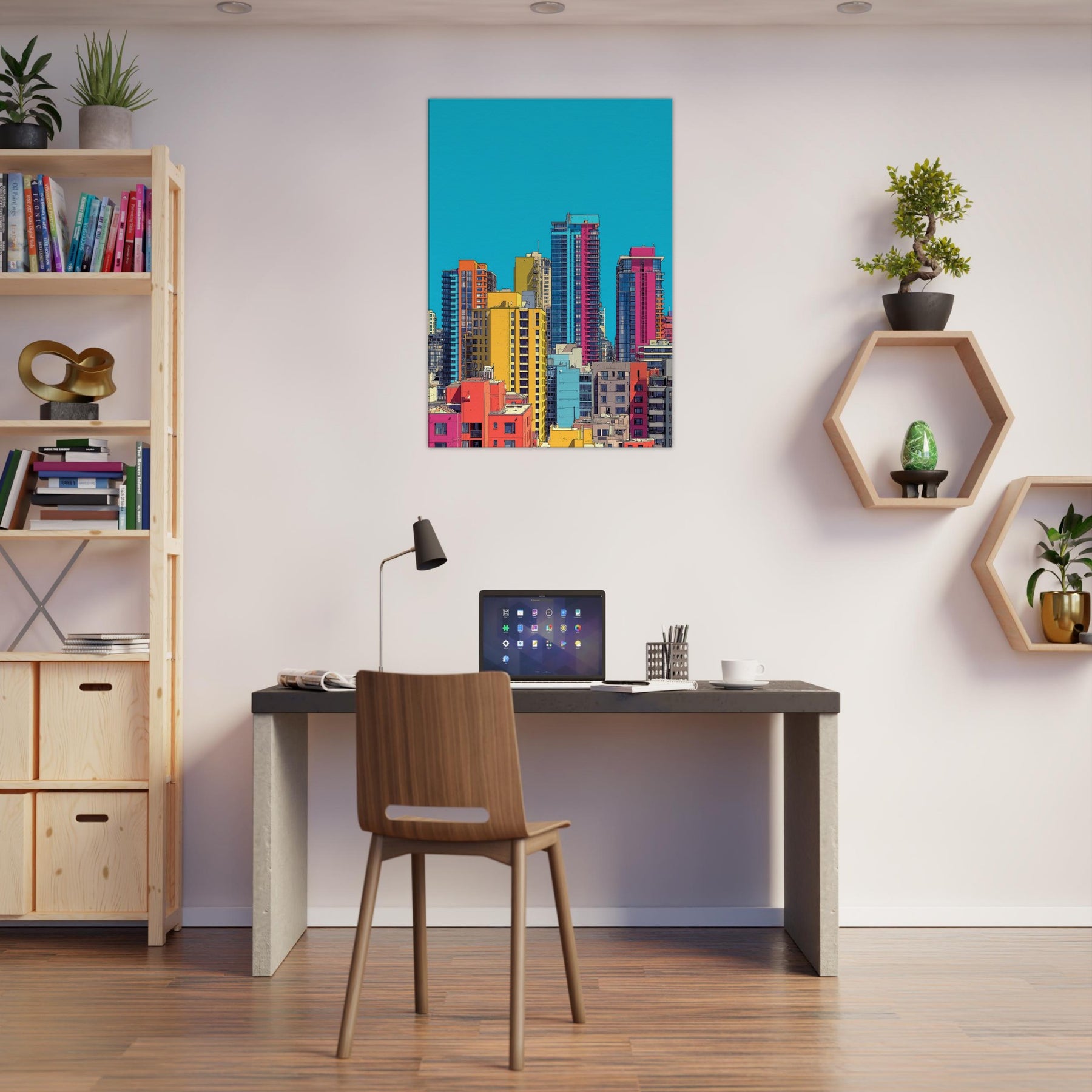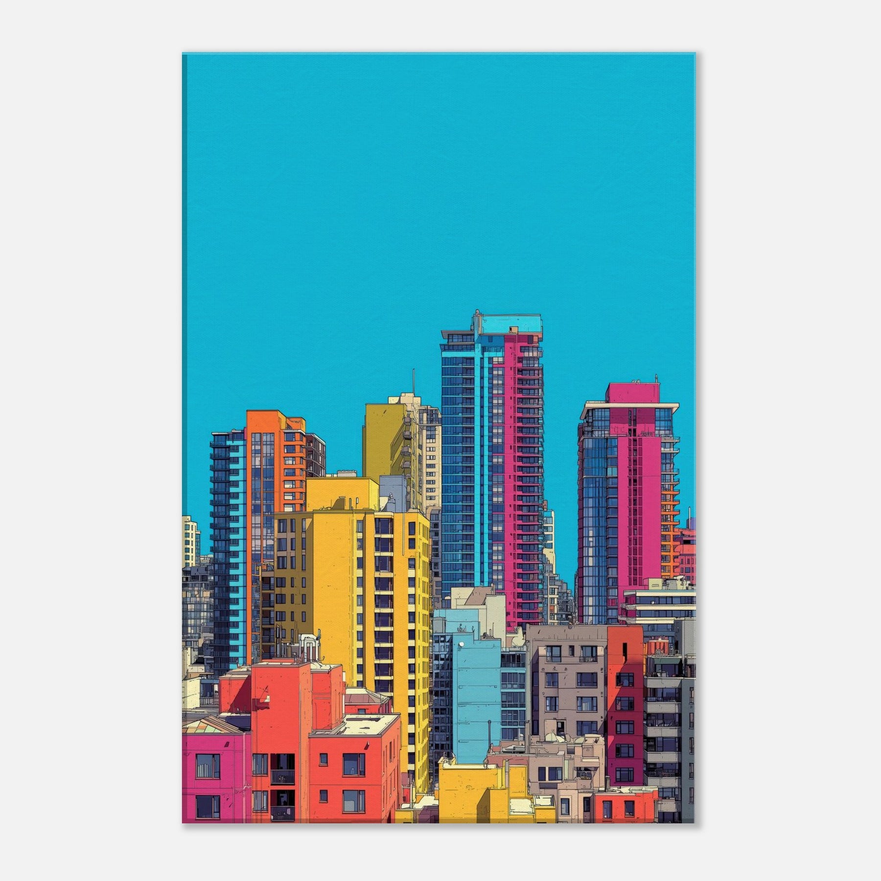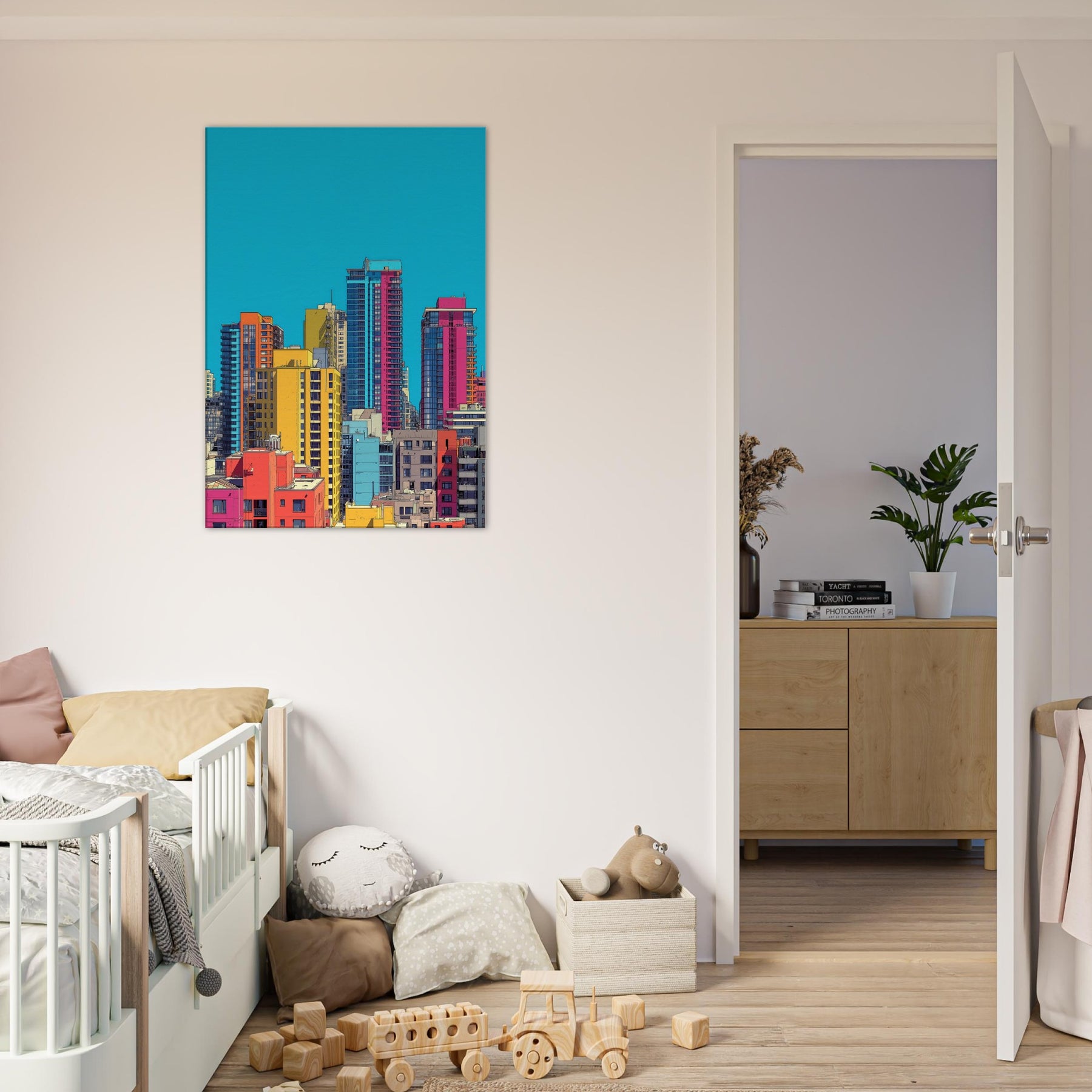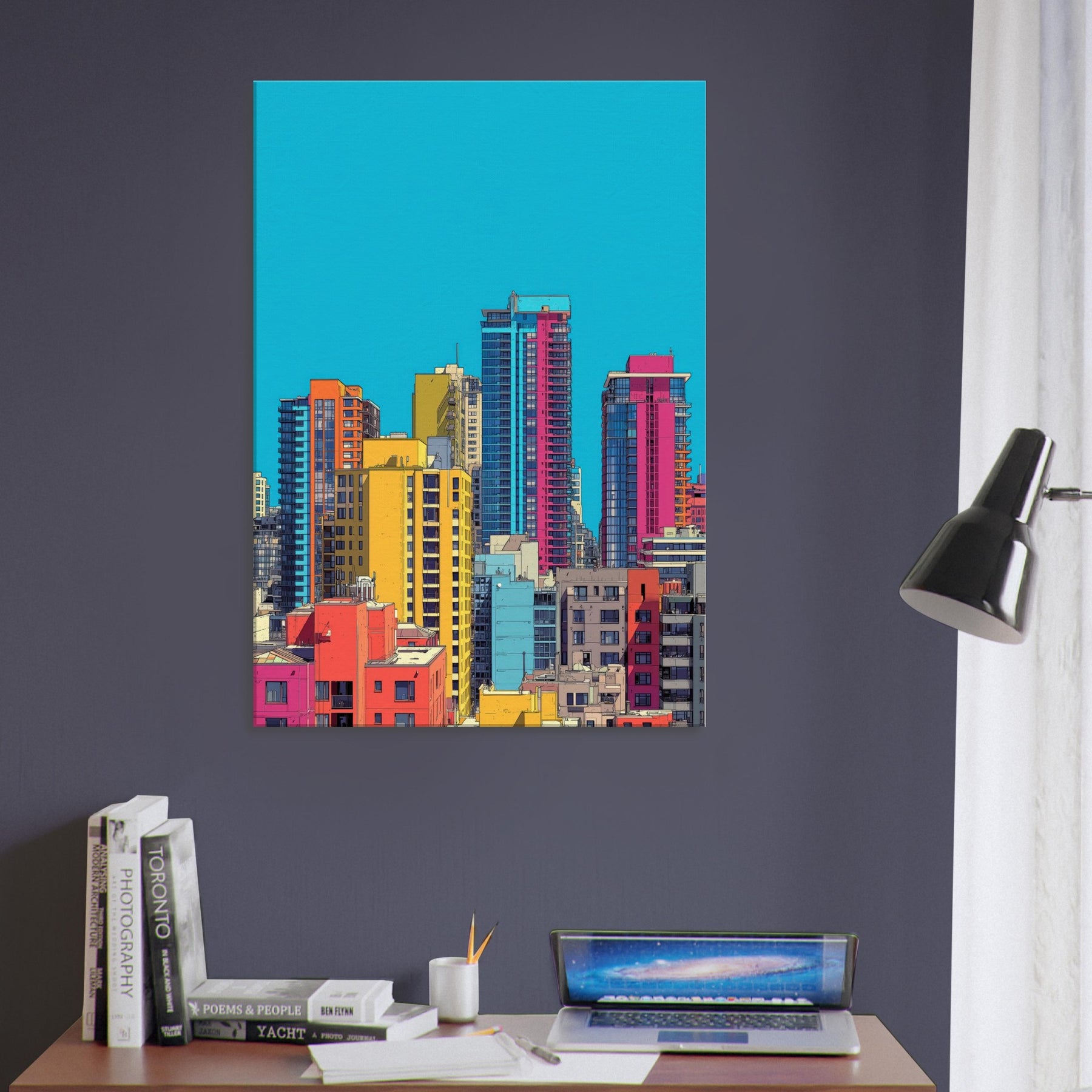 Vancouver pours across the canvas in a jubilant chorus of color, where blocks of coral, sea teal, and sunlit ochre stack against a clear cerulean sky. The scene hums with the pulse of a modern city the rhythm of streets, glass, and steel distilled into luminous planes. This artwork invites your living space to exhale and dream, offering a focal point that cushions conversation and sparks imagination. Hang it where daylight meets evening, and let Vancouver's energy breathe with you.