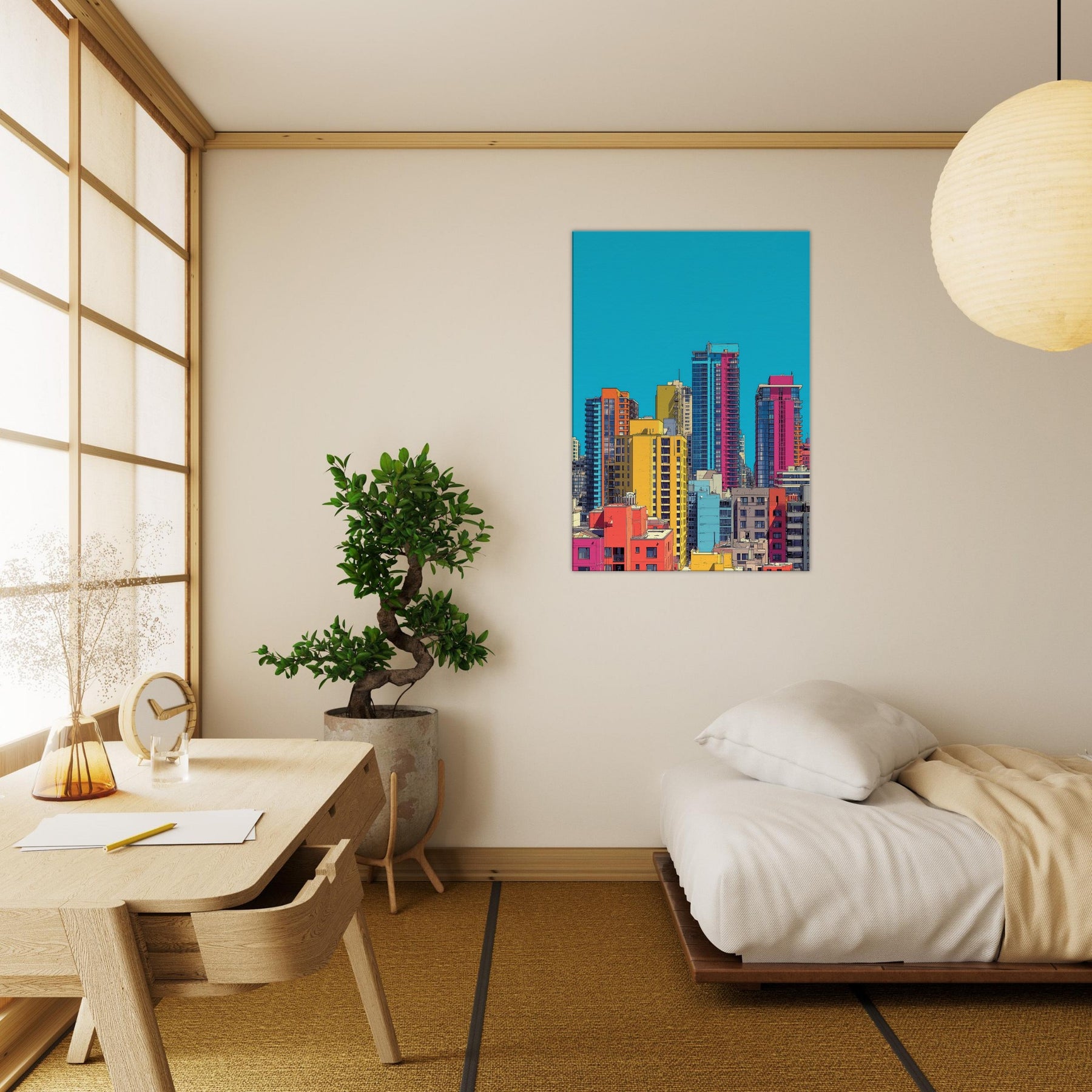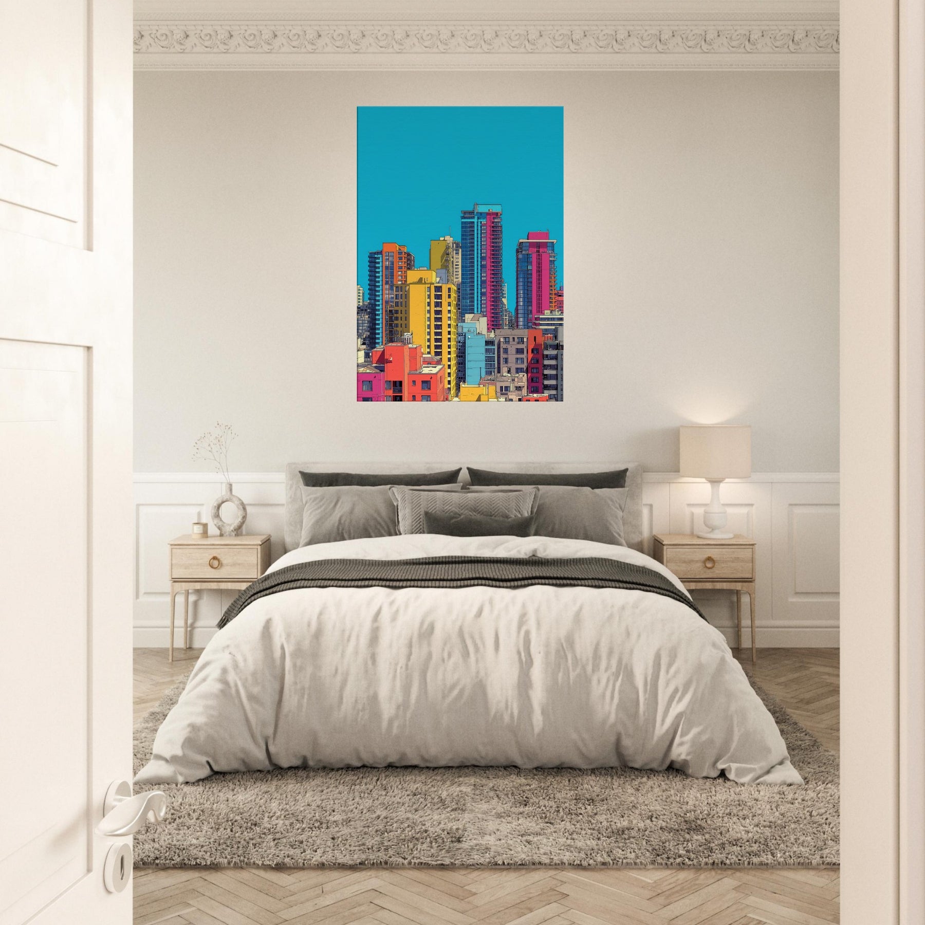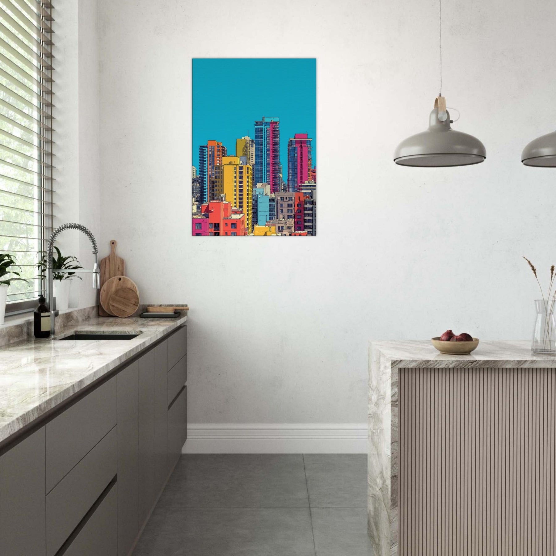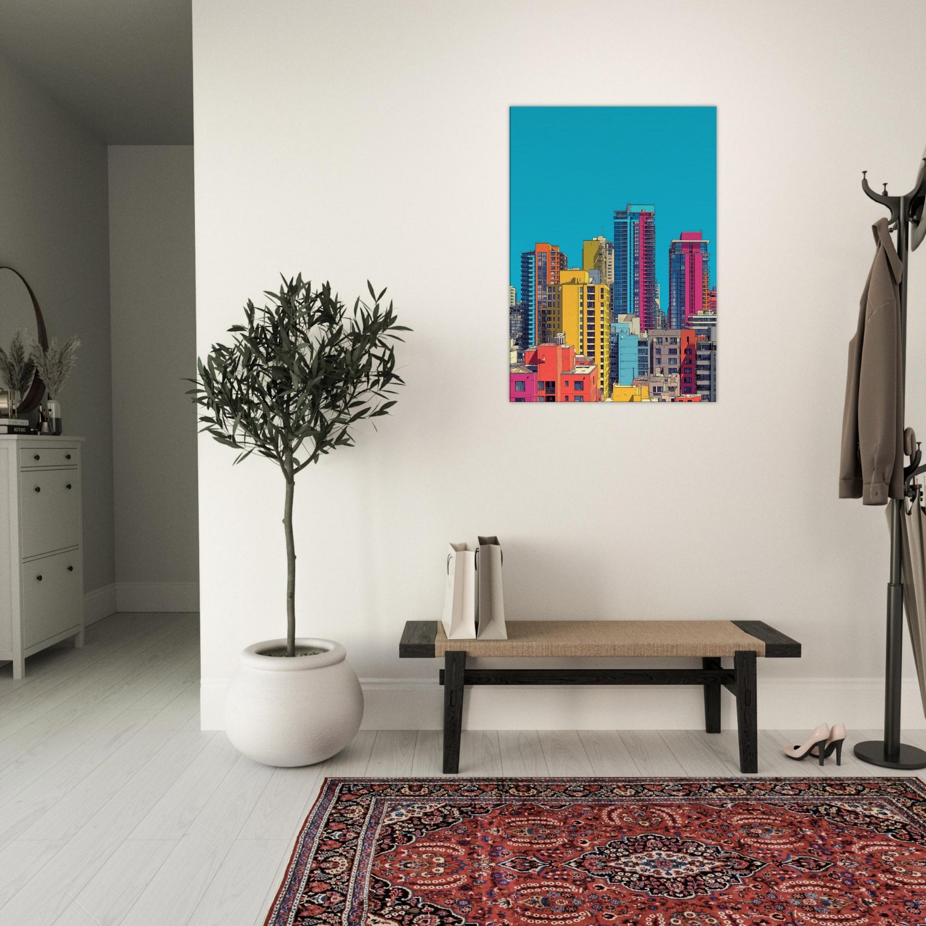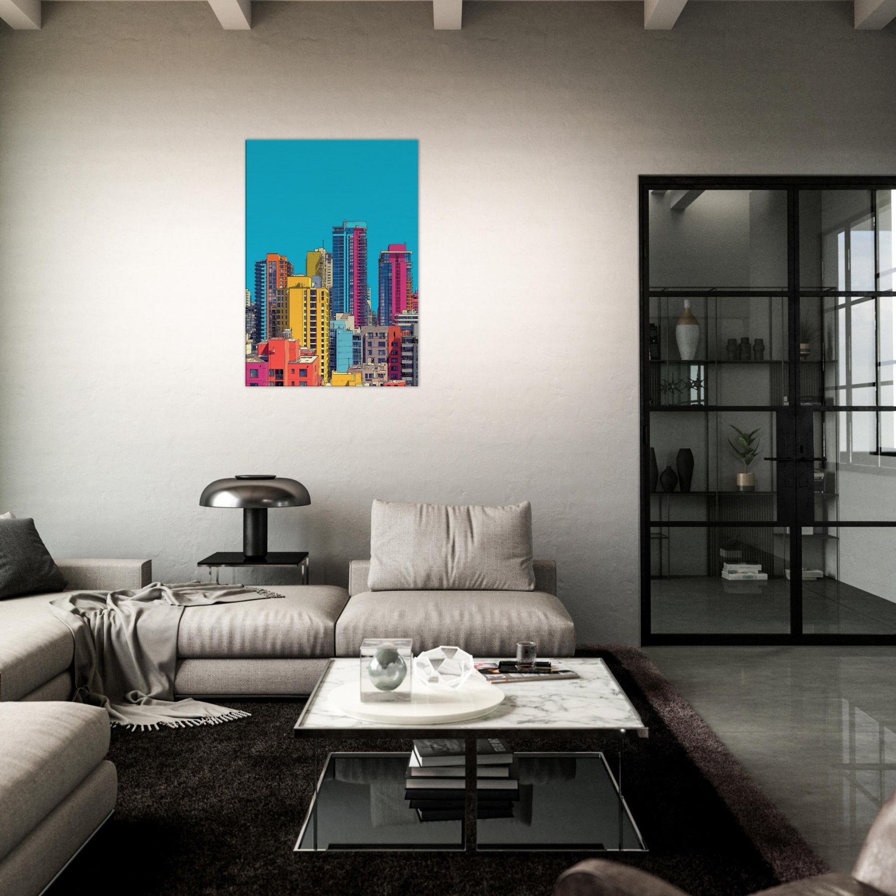 Vancouver pours across the canvas in a jubilant chorus of color, where blocks of coral, sea teal, and sunlit ochre stack against a clear cerulean sky. The scene hums with the pulse of a modern city the rhythm of streets, glass, and steel distilled into luminous planes. This artwork invites your living space to exhale and dream, offering a focal point that cushions conversation and sparks imagination. Hang it where daylight meets evening, and let Vancouver's energy breathe with you.