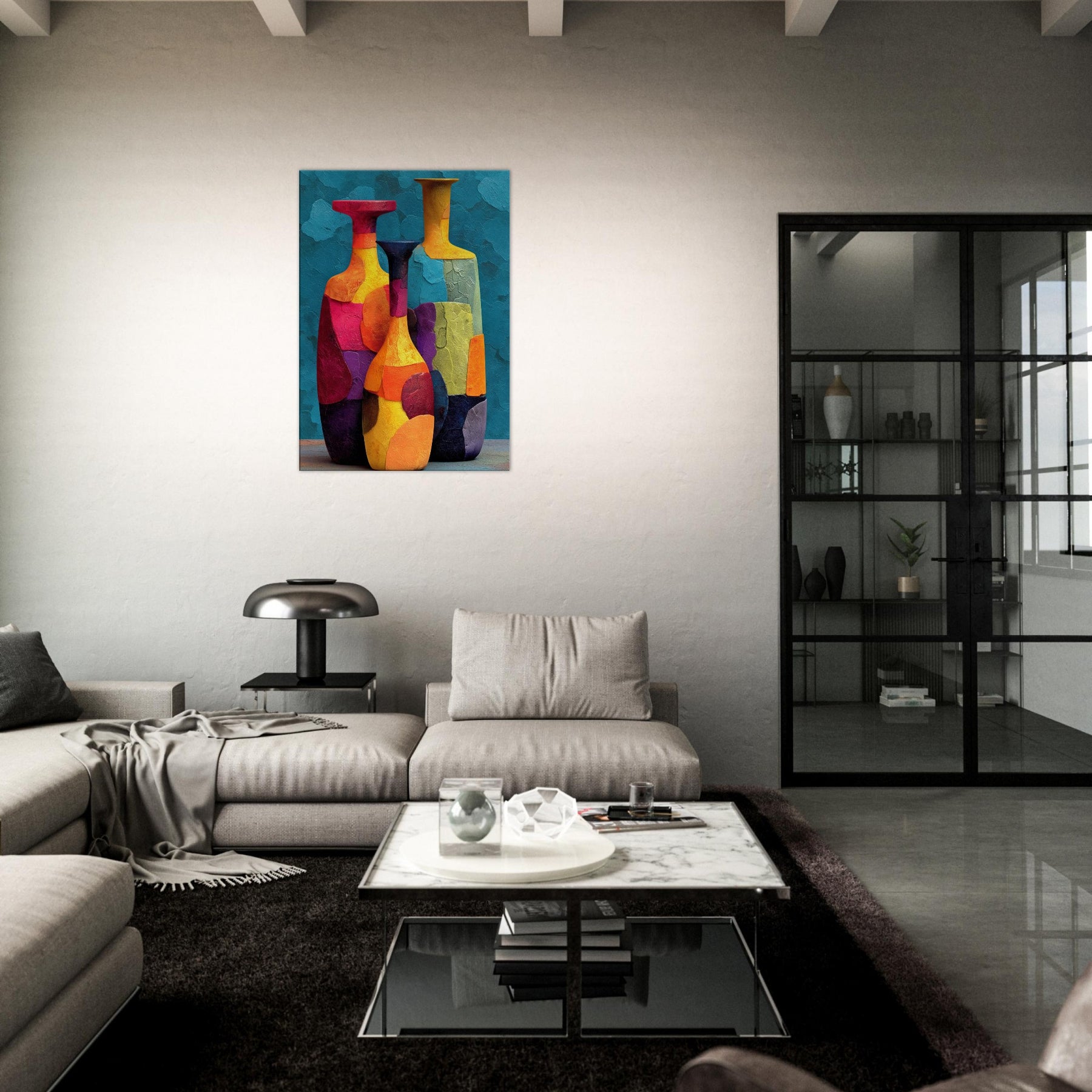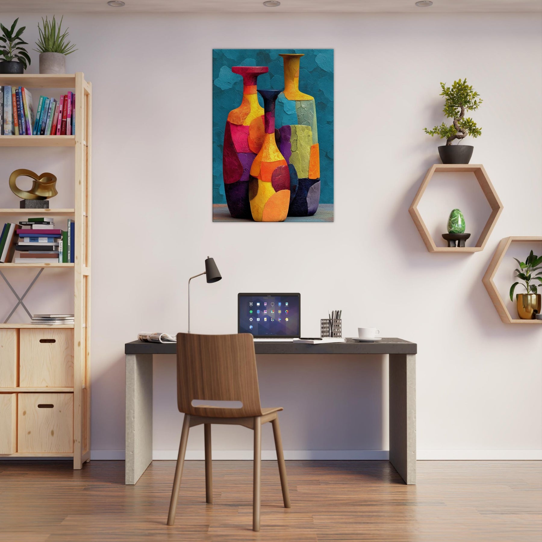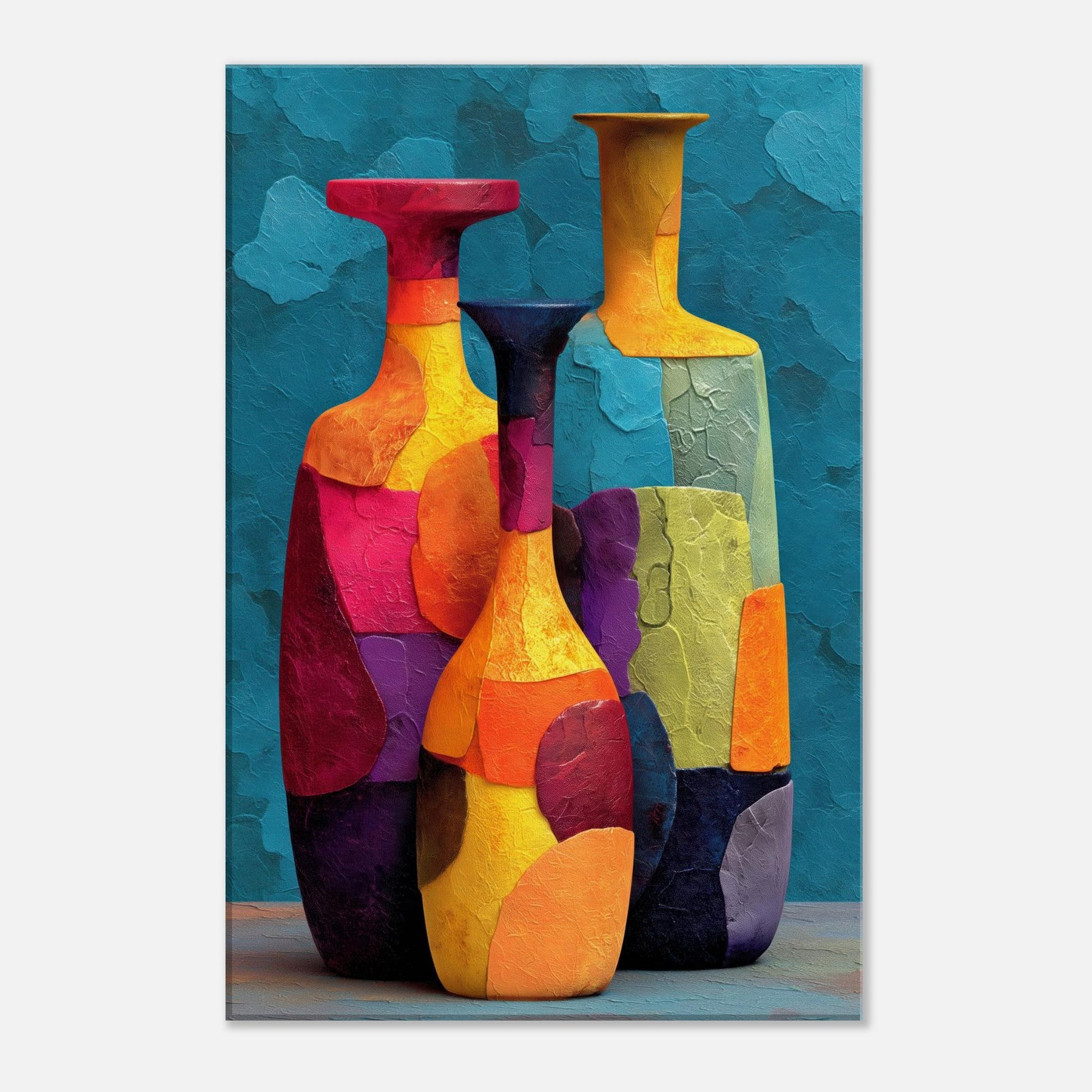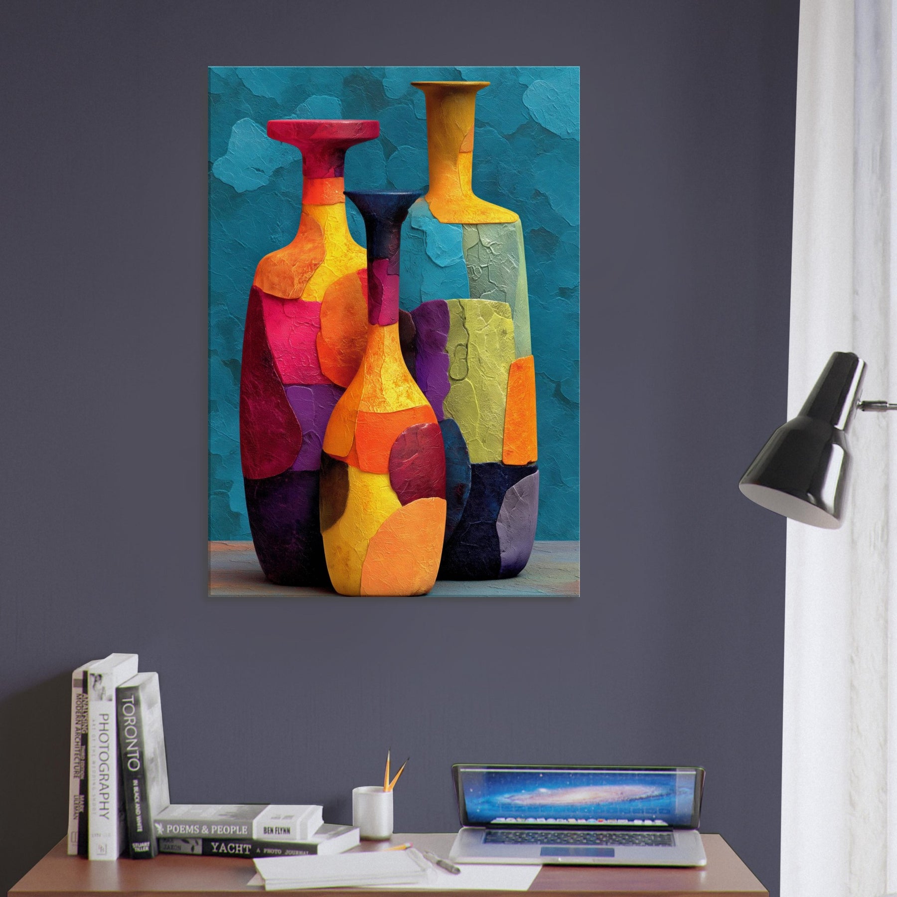 Vase Trio unfolds in a riot of color and form, a group of three vessels that seem to breathe with light. The textured ridges and layered slices catch the eye, inviting touch and imagination. In a living space, it refracts sunlit hours into warm murmurs of pink, gold, teal, and shadow, turning walls into a subtle gallery of joy. This composition brings craft and celebration together, pairing contemporary energy with quiet elegance. Vase Trio anchors the room with presence, warmth, and refined charm.