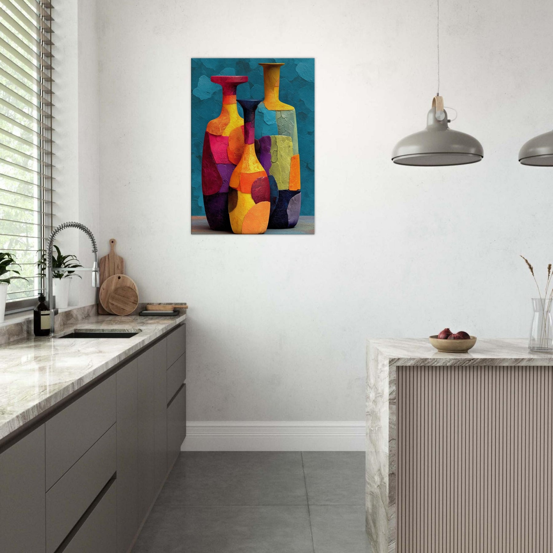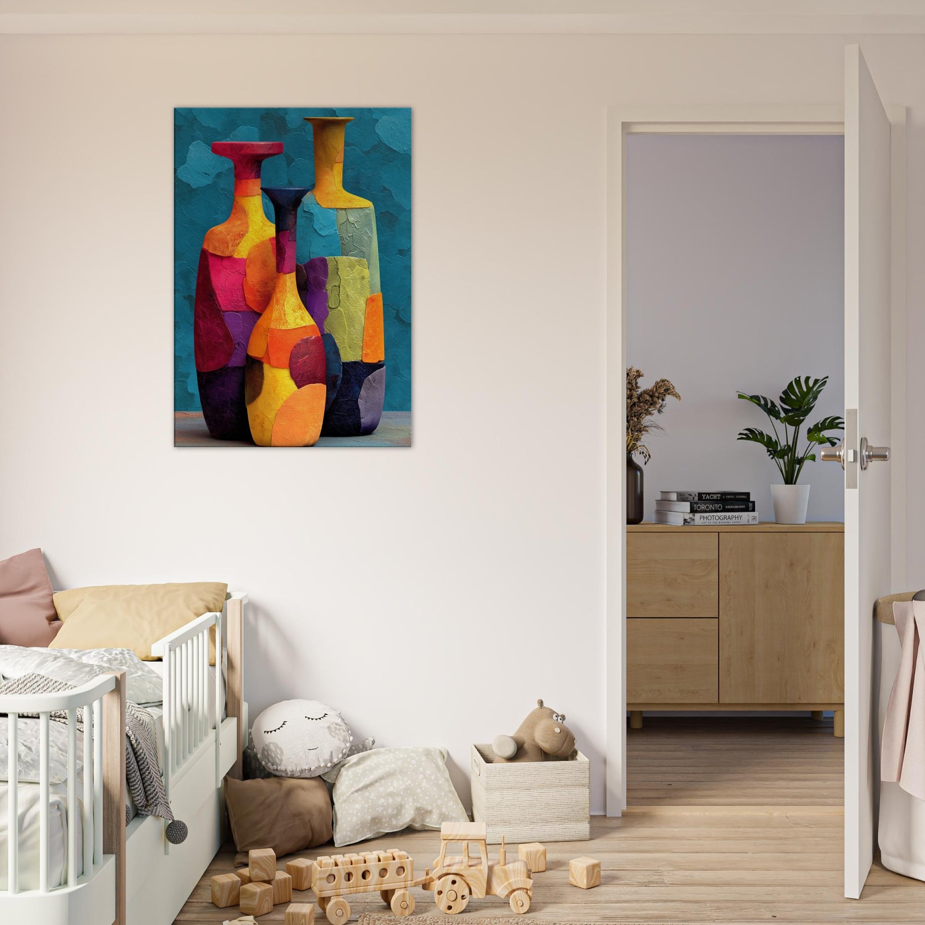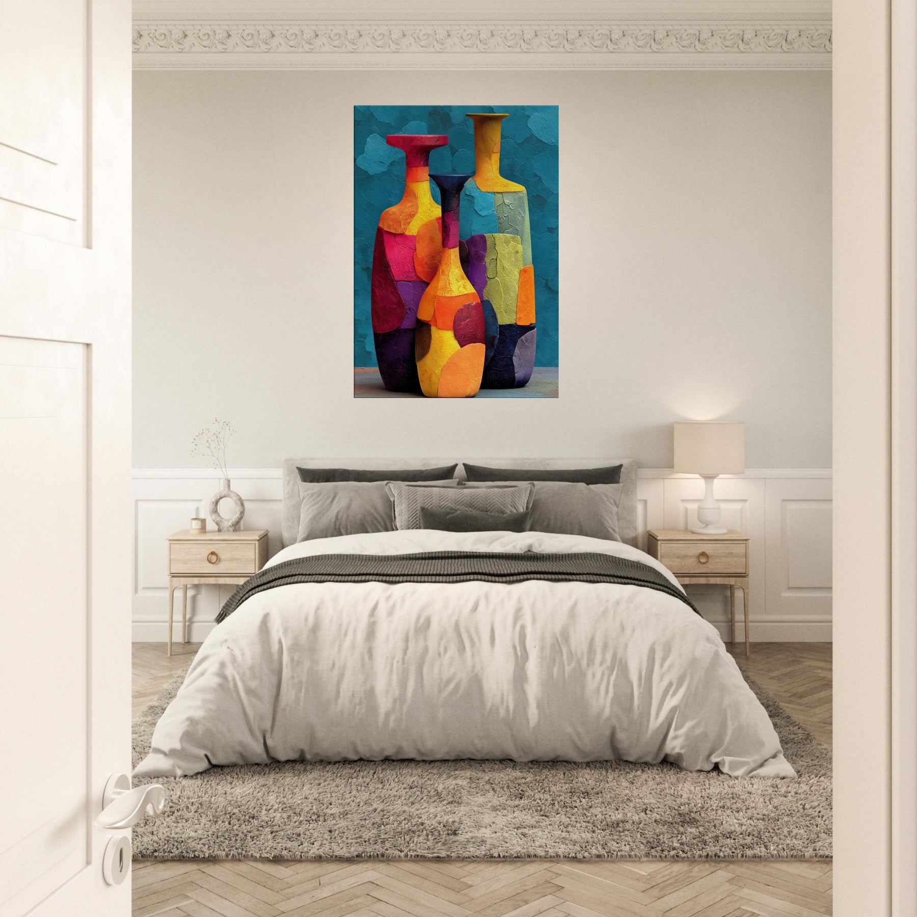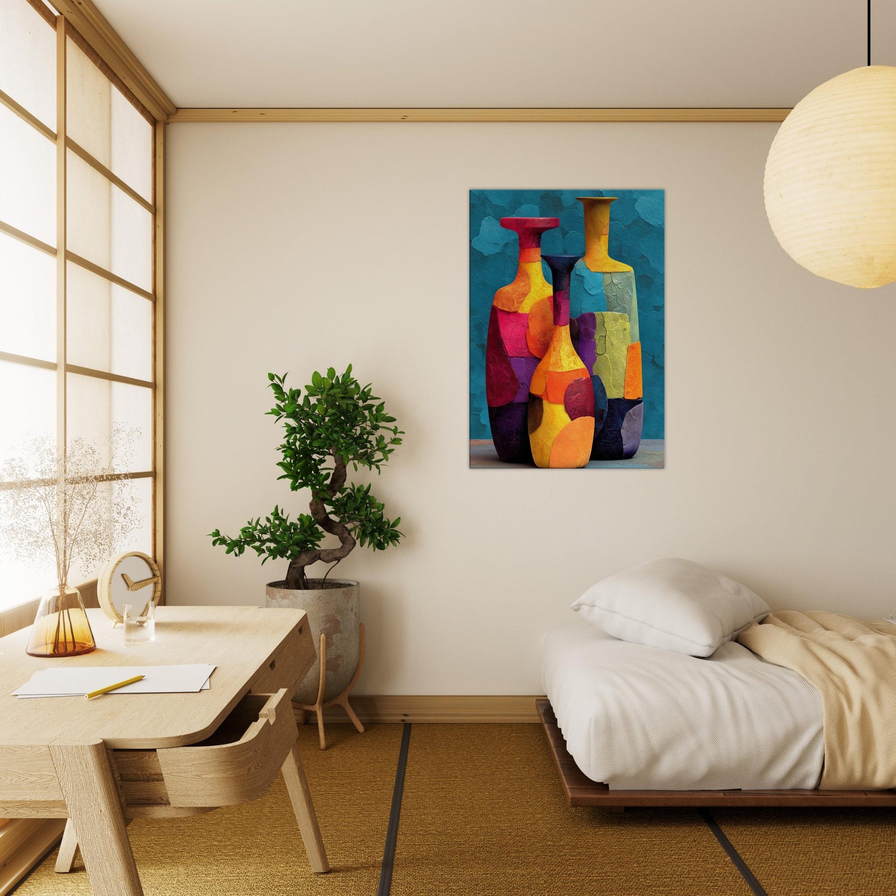 Vase Trio unfolds in a riot of color and form, a group of three vessels that seem to breathe with light. The textured ridges and layered slices catch the eye, inviting touch and imagination. In a living space, it refracts sunlit hours into warm murmurs of pink, gold, teal, and shadow, turning walls into a subtle gallery of joy. This composition brings craft and celebration together, pairing contemporary energy with quiet elegance. Vase Trio anchors the room with presence, warmth, and refined charm.