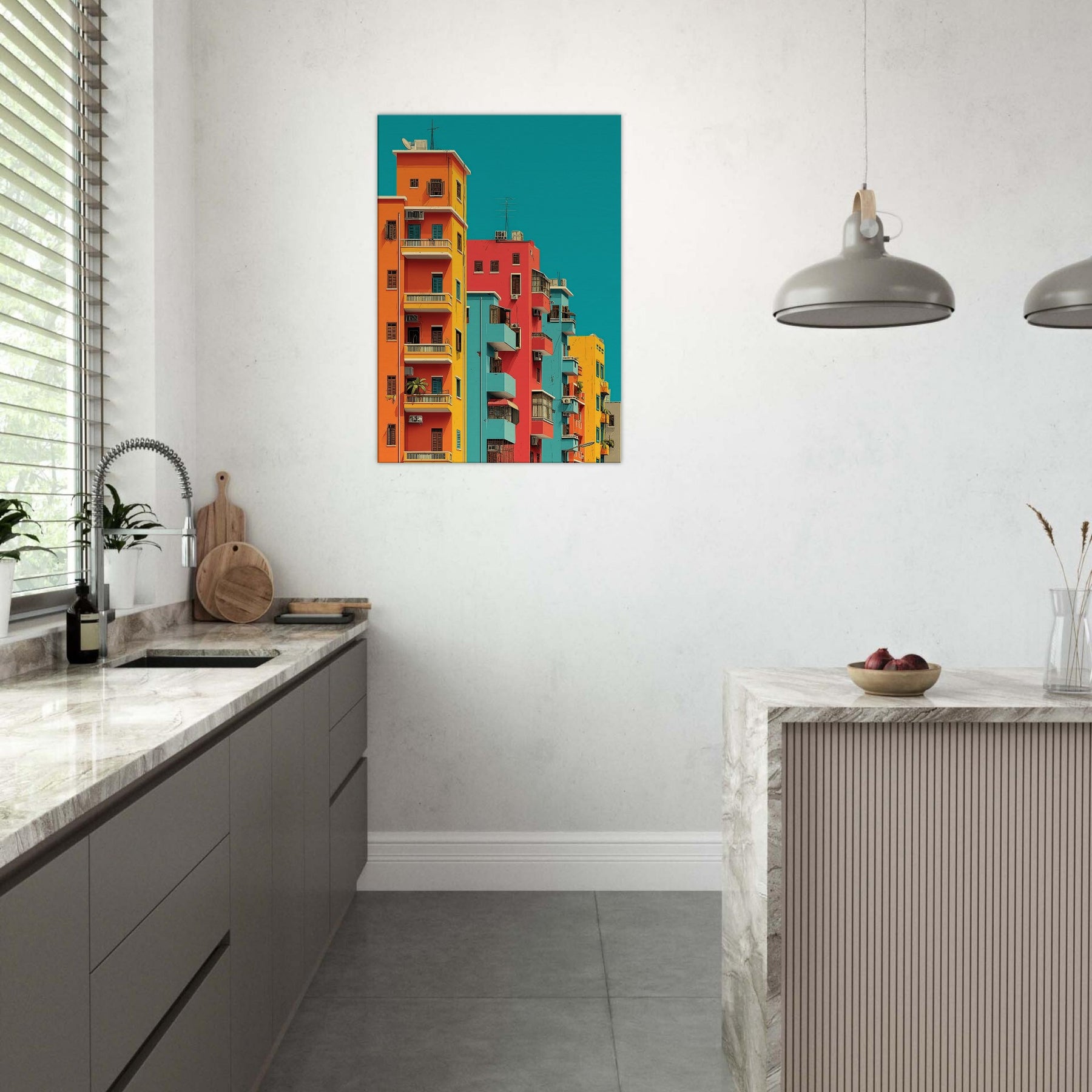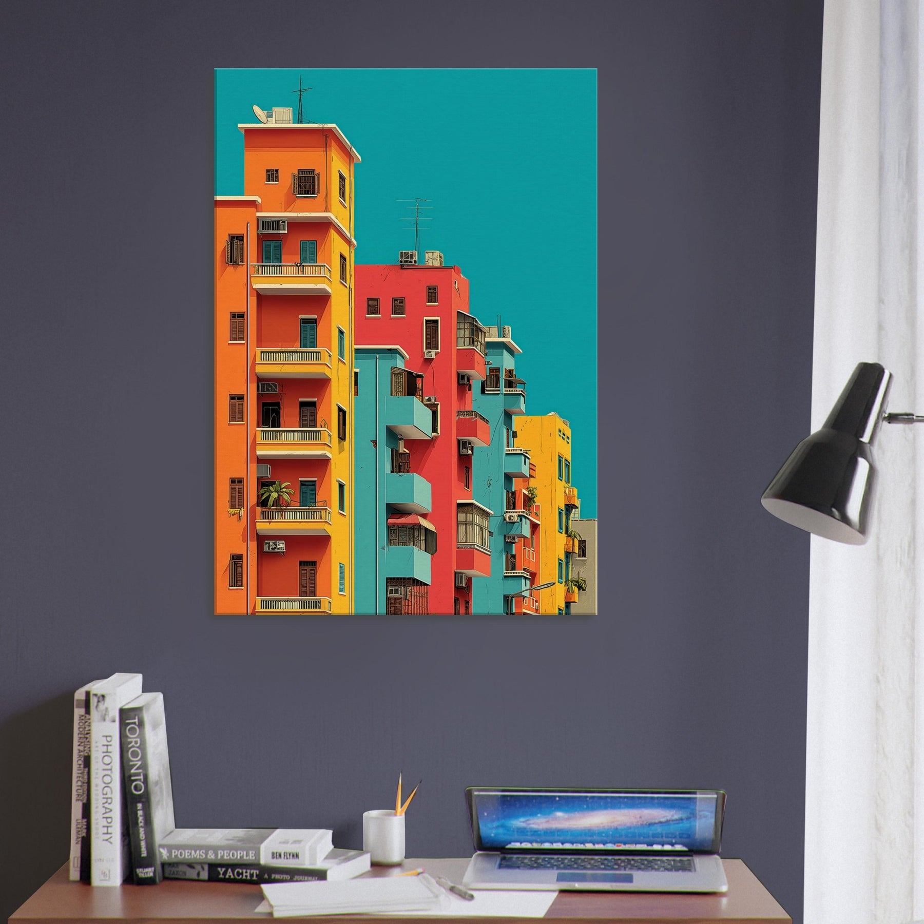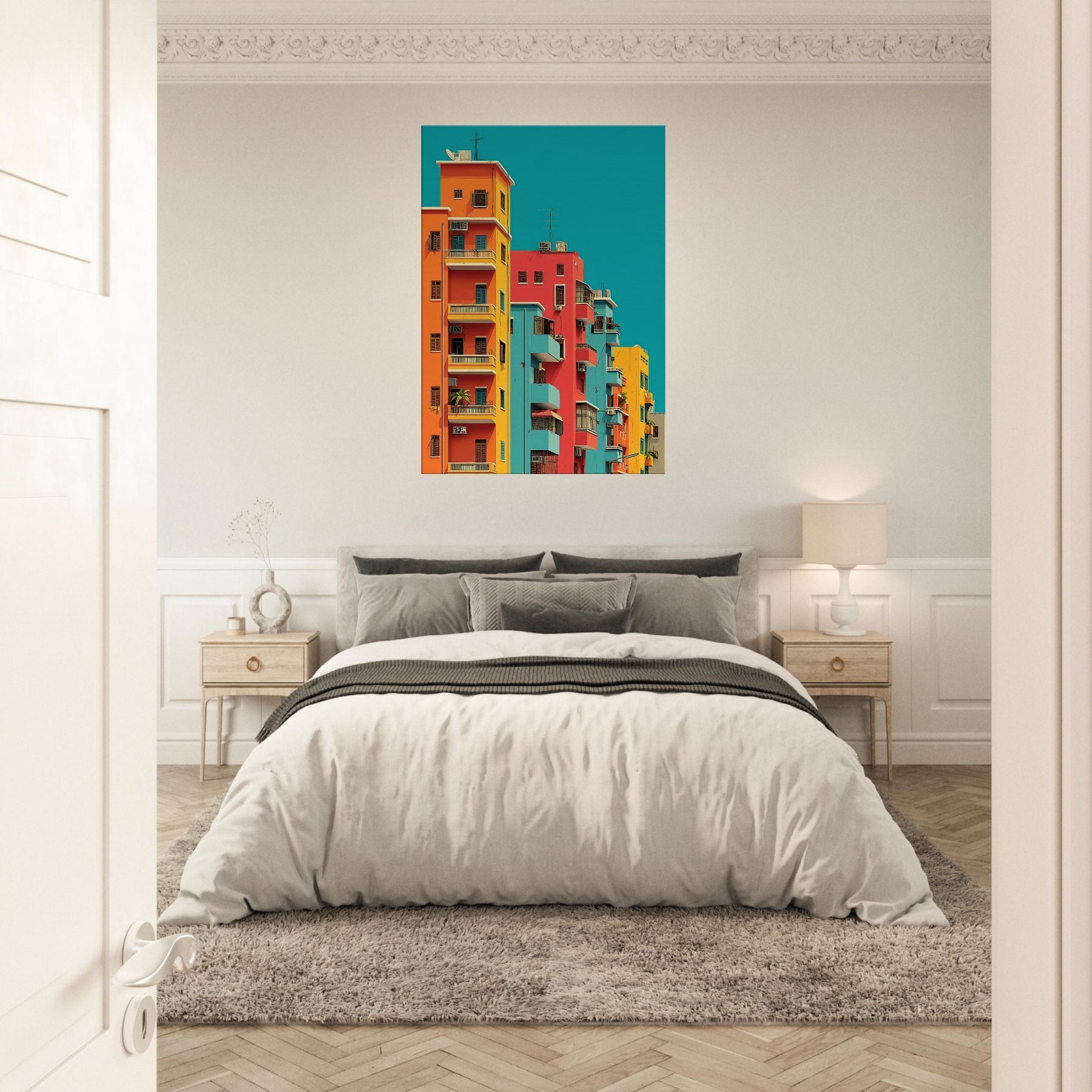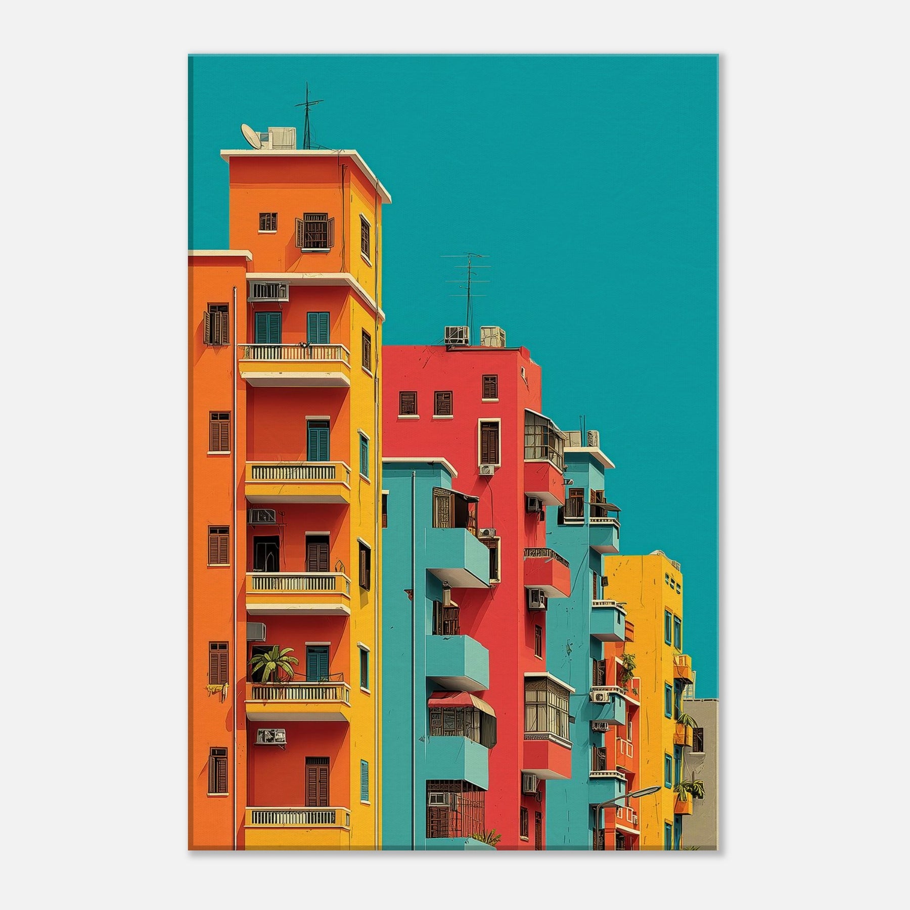 Cairo unfolds in a chorus of sunlit color, where orange, teal and coral faces meet the sky in electric balance. This abstract cityscape invites the eye to wander along layered balconies and shadowed courtyards, evoking the warmth of a breezy afternoon and the pulse of a vibrant street. Hang it in a living space to breathe dramatic texture into neutral tones, turning walls into a window for travel, memory, and a quietly cinematic urban mood.