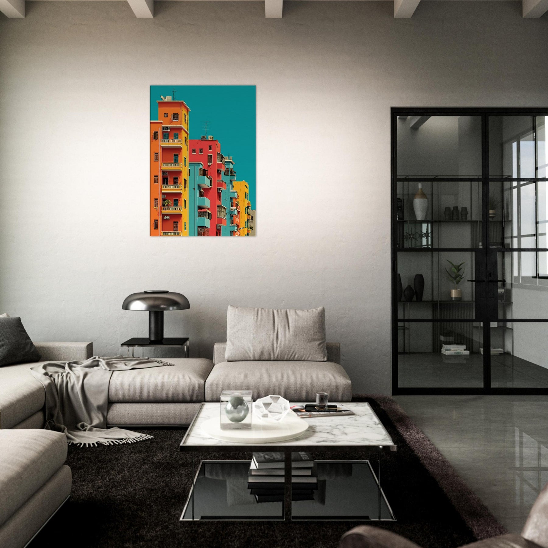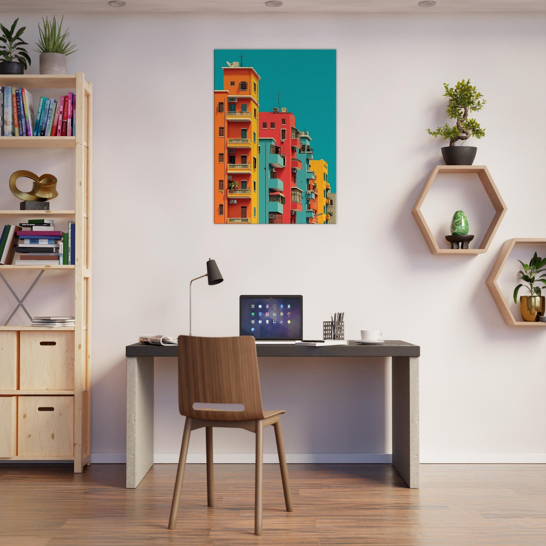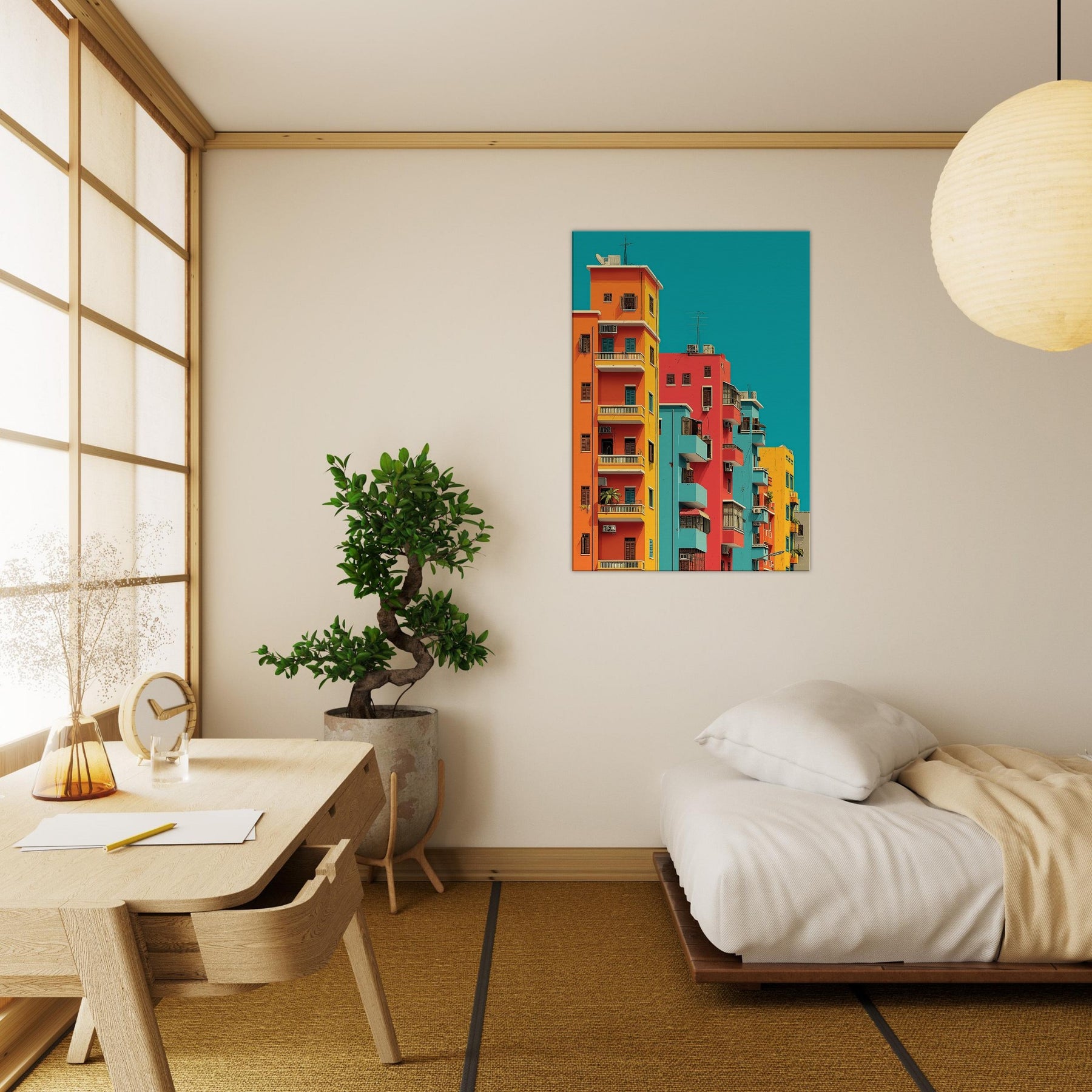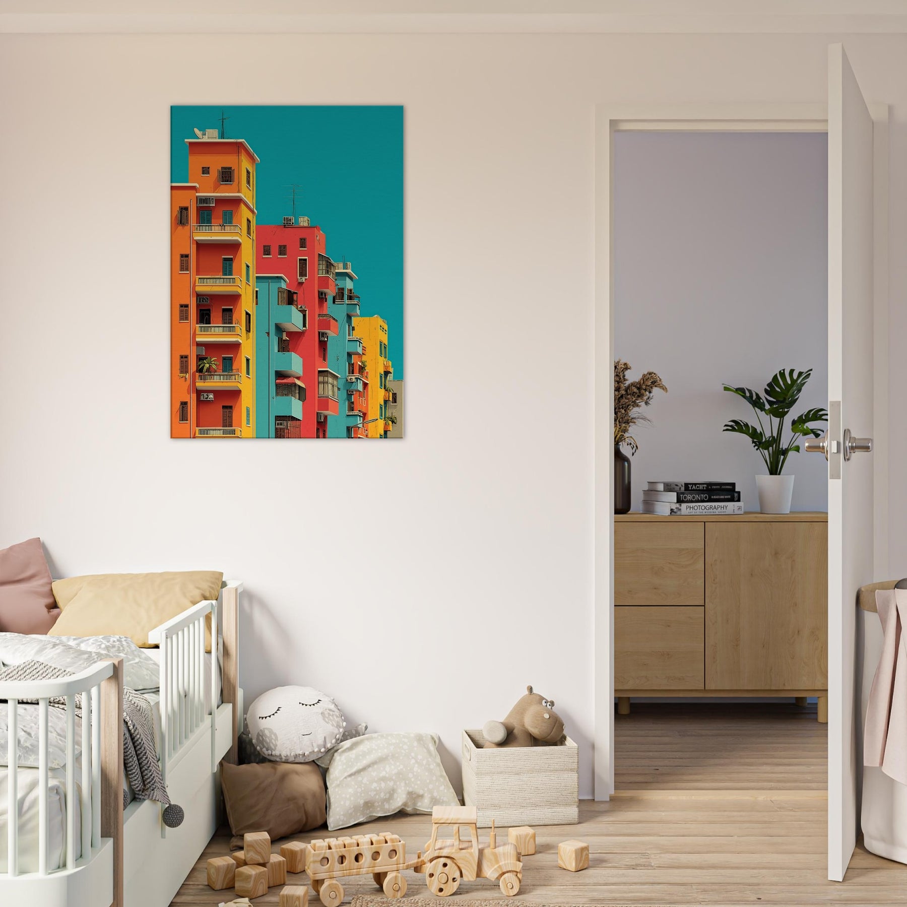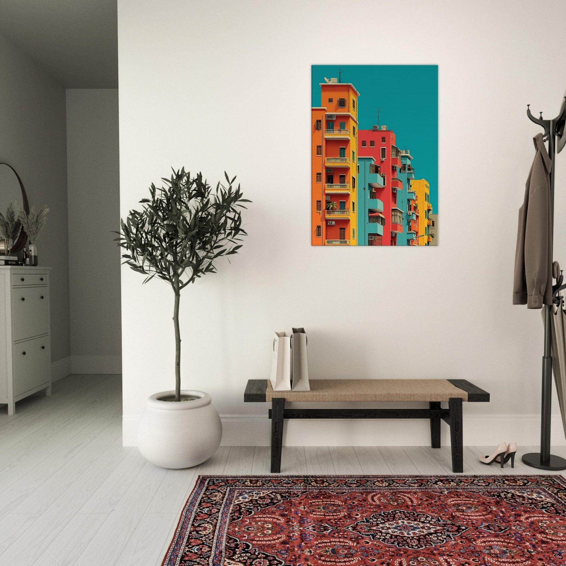 Cairo unfolds in a chorus of sunlit color, where orange, teal and coral faces meet the sky in electric balance. This abstract cityscape invites the eye to wander along layered balconies and shadowed courtyards, evoking the warmth of a breezy afternoon and the pulse of a vibrant street. Hang it in a living space to breathe dramatic texture into neutral tones, turning walls into a window for travel, memory, and a quietly cinematic urban mood.