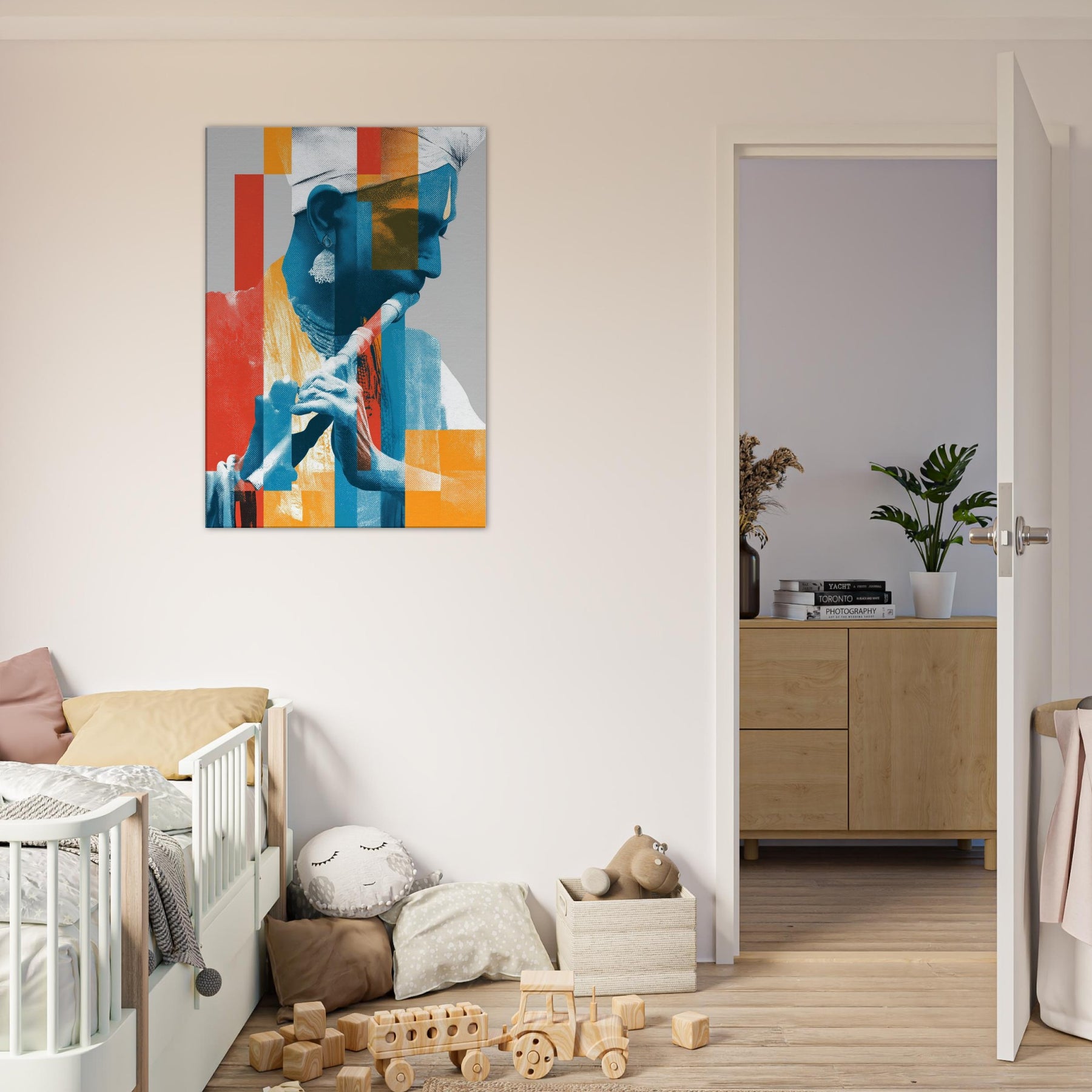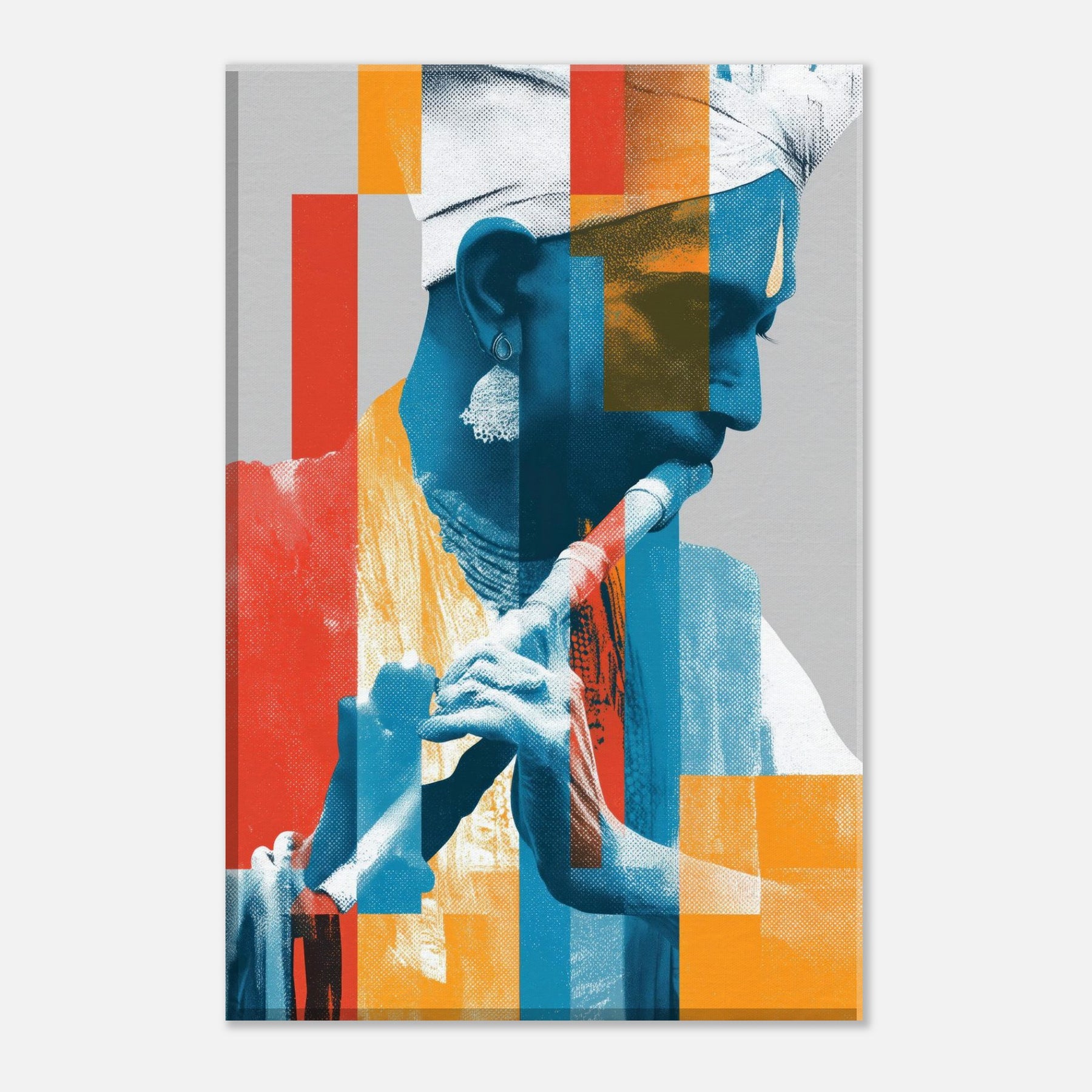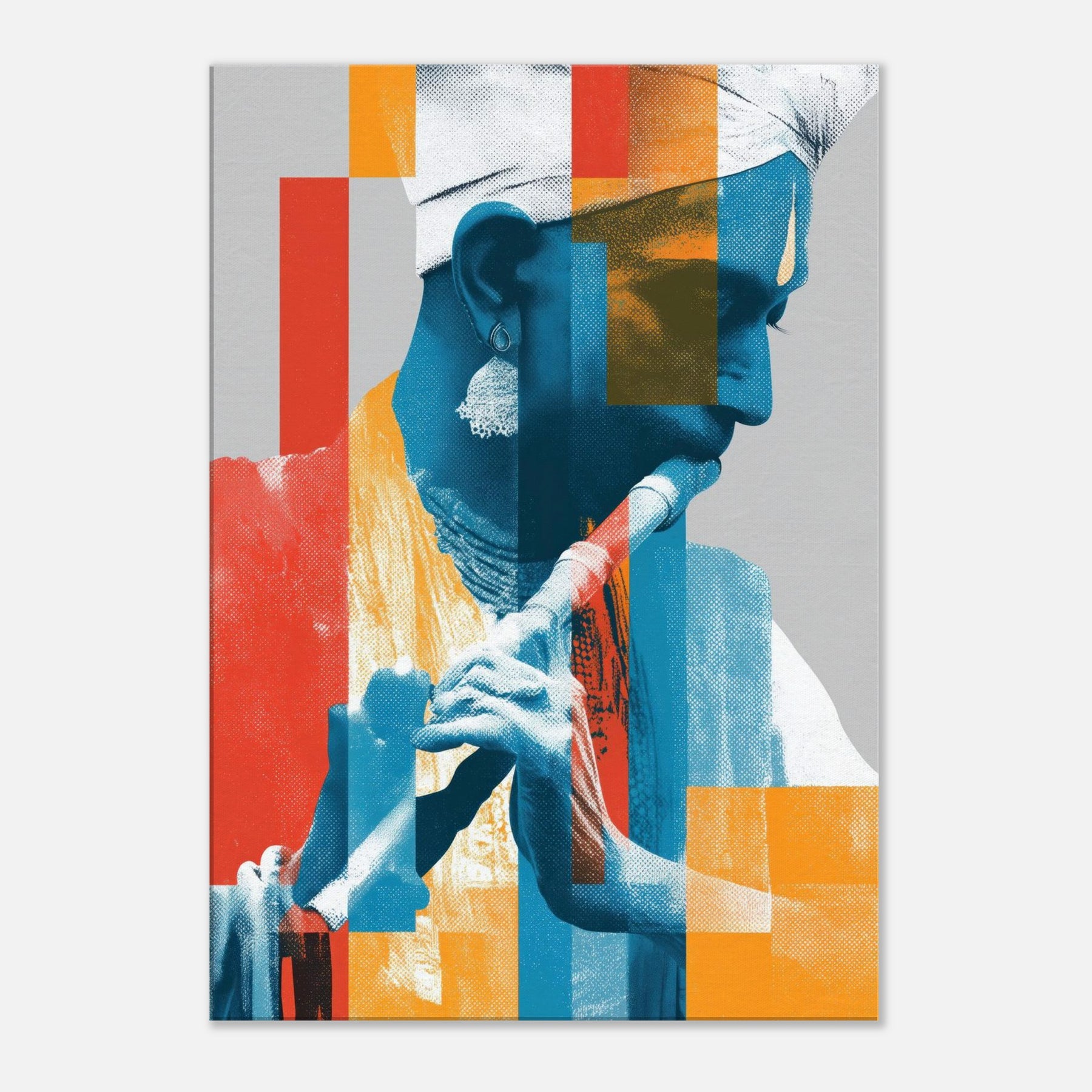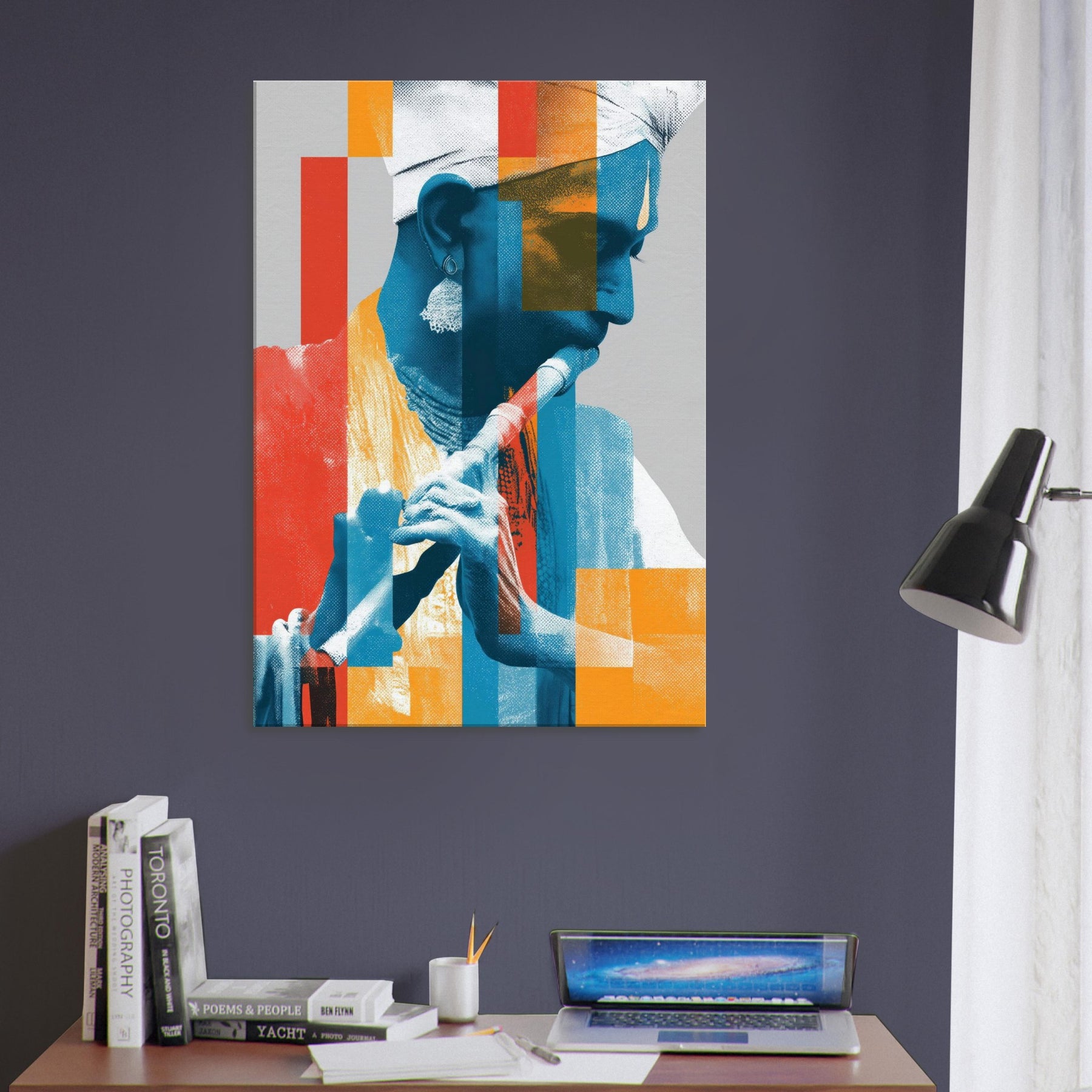 Immerse your living space in a mystical radiance with this piece, featuring Krishna with Flute rendered in a luminous abstract mosaic of color and light. Bold blocks of cobalt, saffron, and coral weave around a tranquil silhouette, guiding the eye toward a serene, meditative focus. The figure’s calm, listening pose invites quiet evenings and reflective mornings alike, making it ideal for a mantle, study, or entryway. Framed or gallery wrapped, it adds depth, warmth, and a whisper of divine calm.