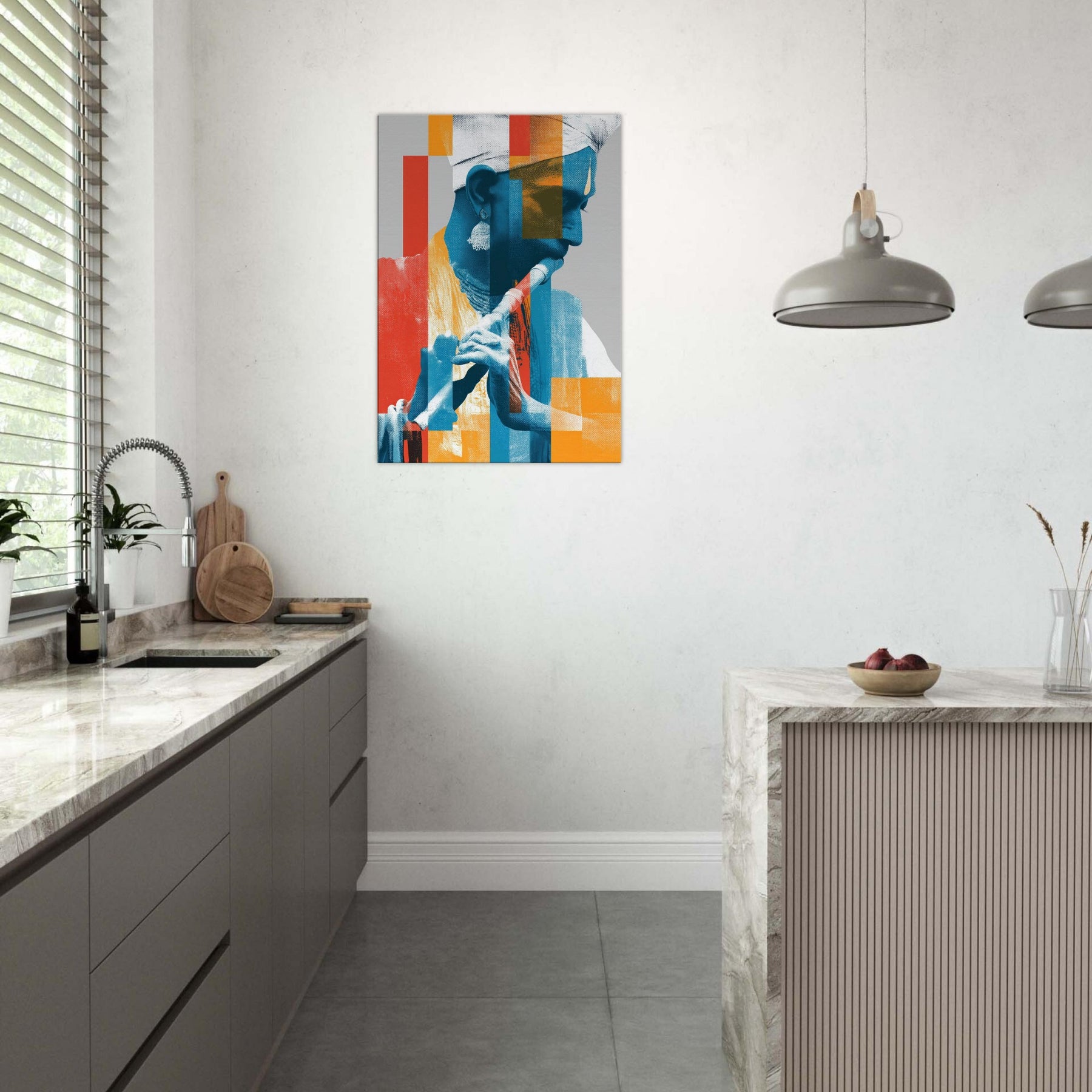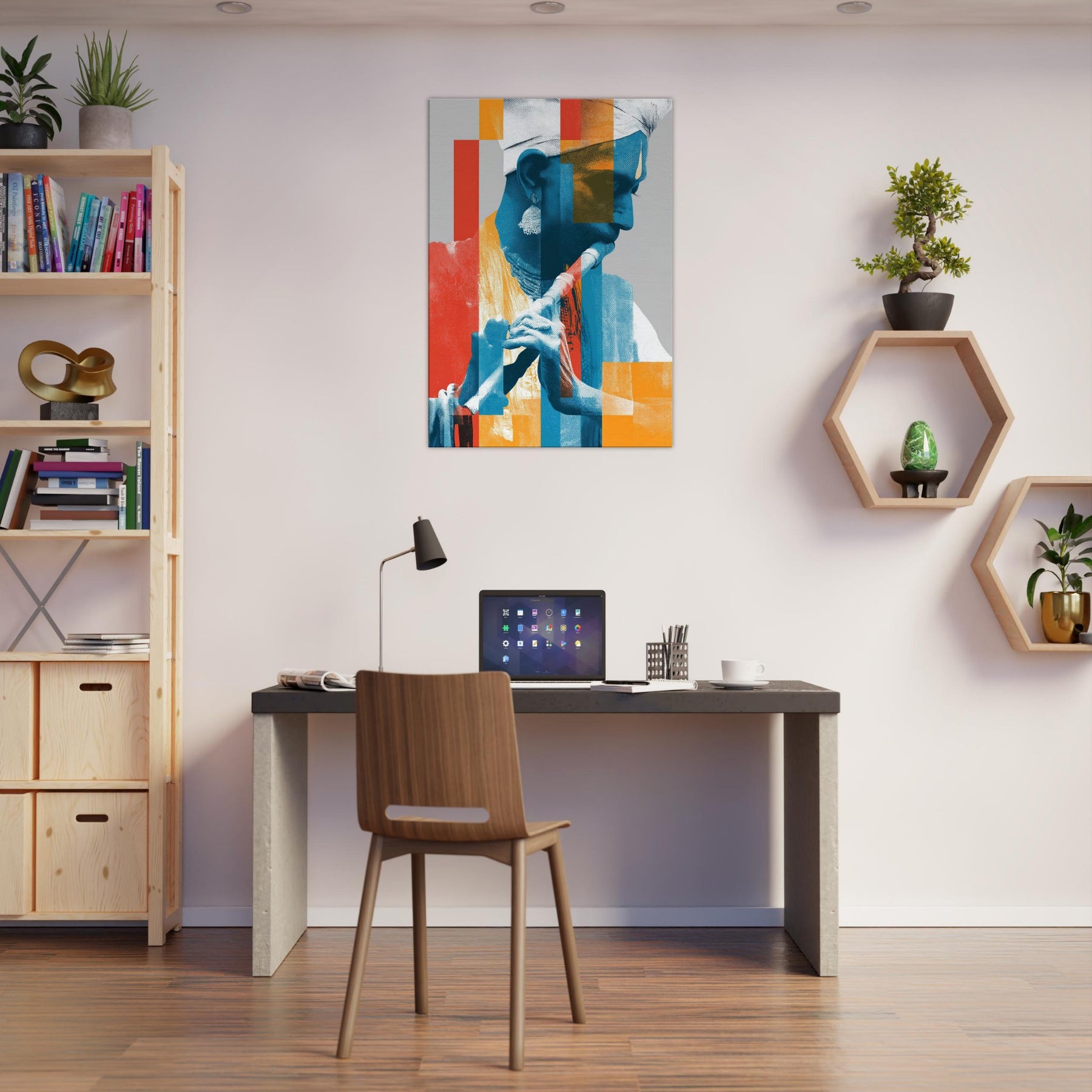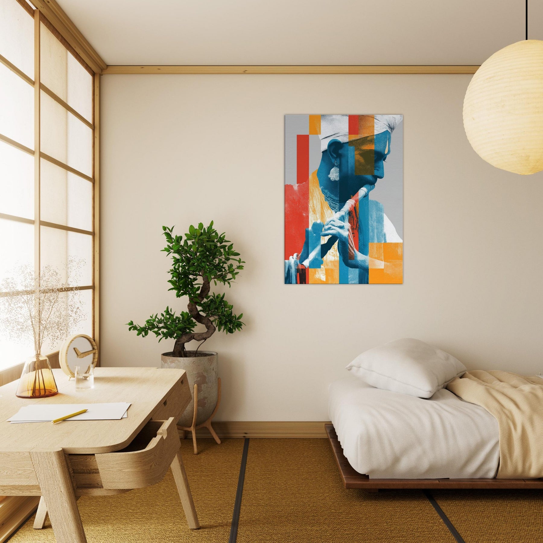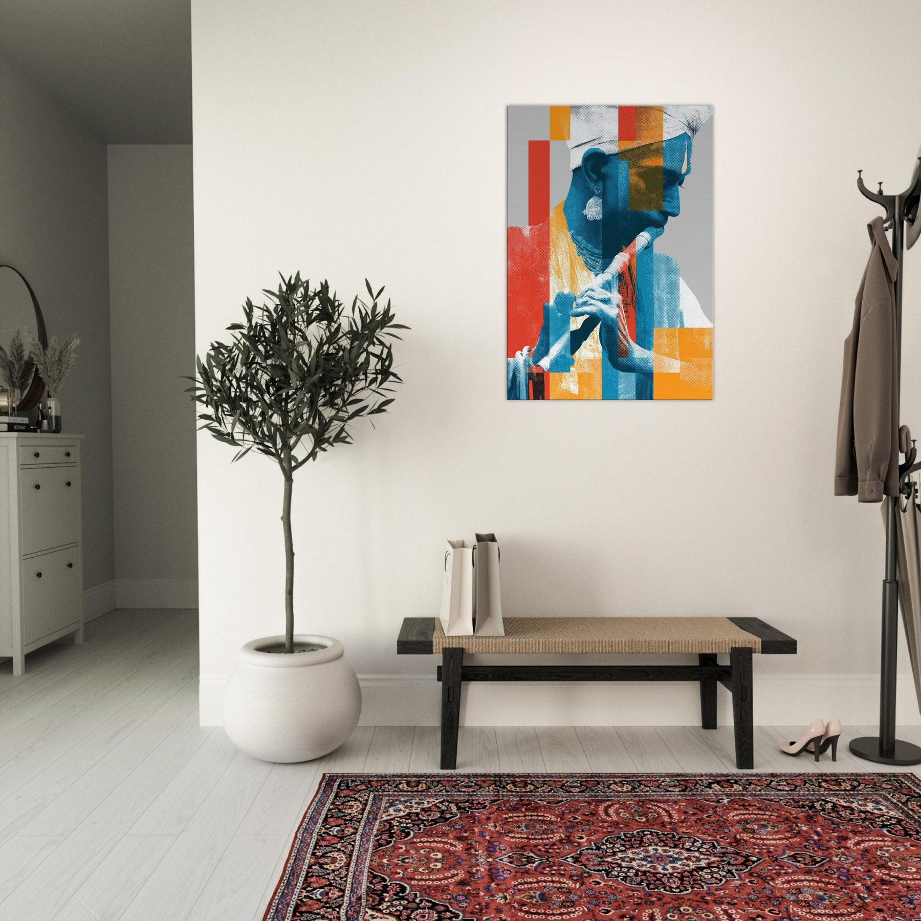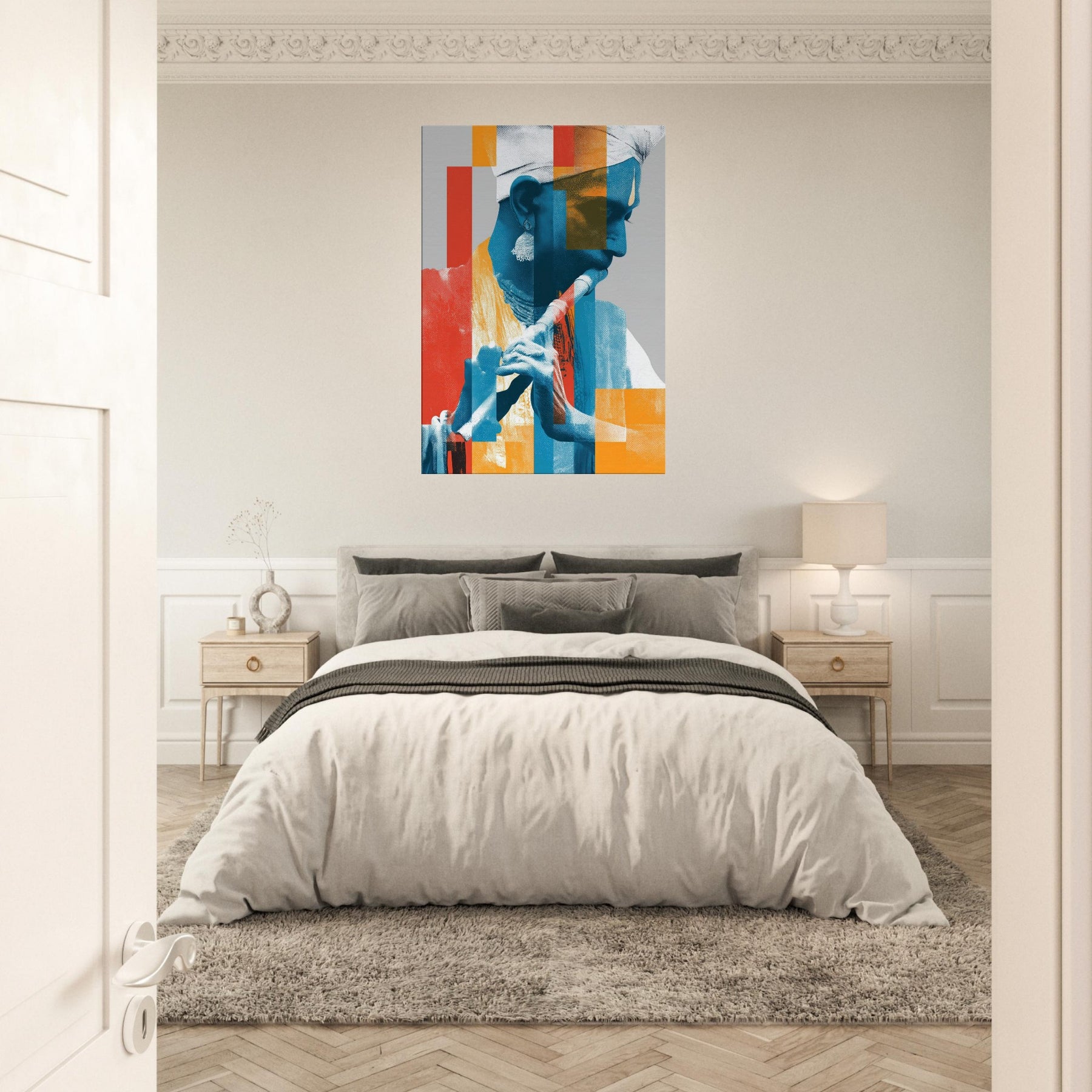 Immerse your living space in a mystical radiance with this piece, featuring Krishna with Flute rendered in a luminous abstract mosaic of color and light. Bold blocks of cobalt, saffron, and coral weave around a tranquil silhouette, guiding the eye toward a serene, meditative focus. The figure’s calm, listening pose invites quiet evenings and reflective mornings alike, making it ideal for a mantle, study, or entryway. Framed or gallery wrapped, it adds depth, warmth, and a whisper of divine calm.