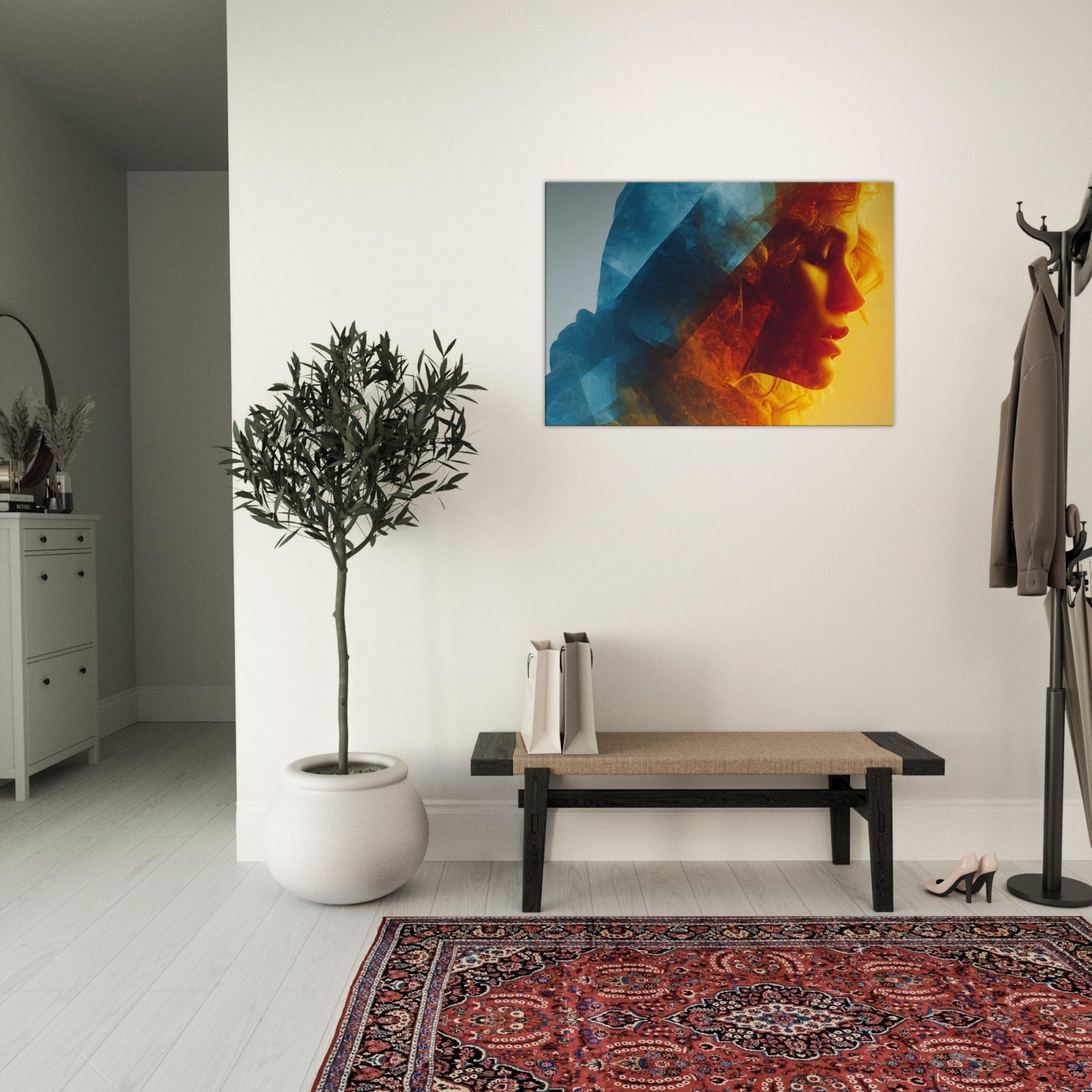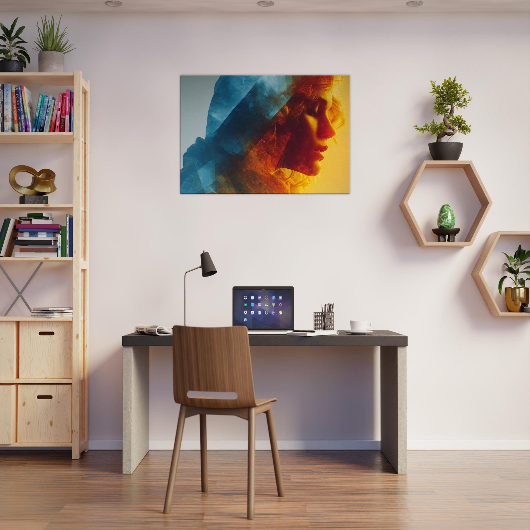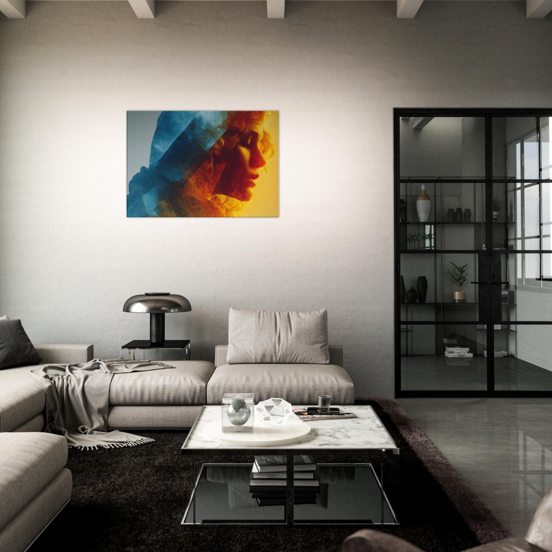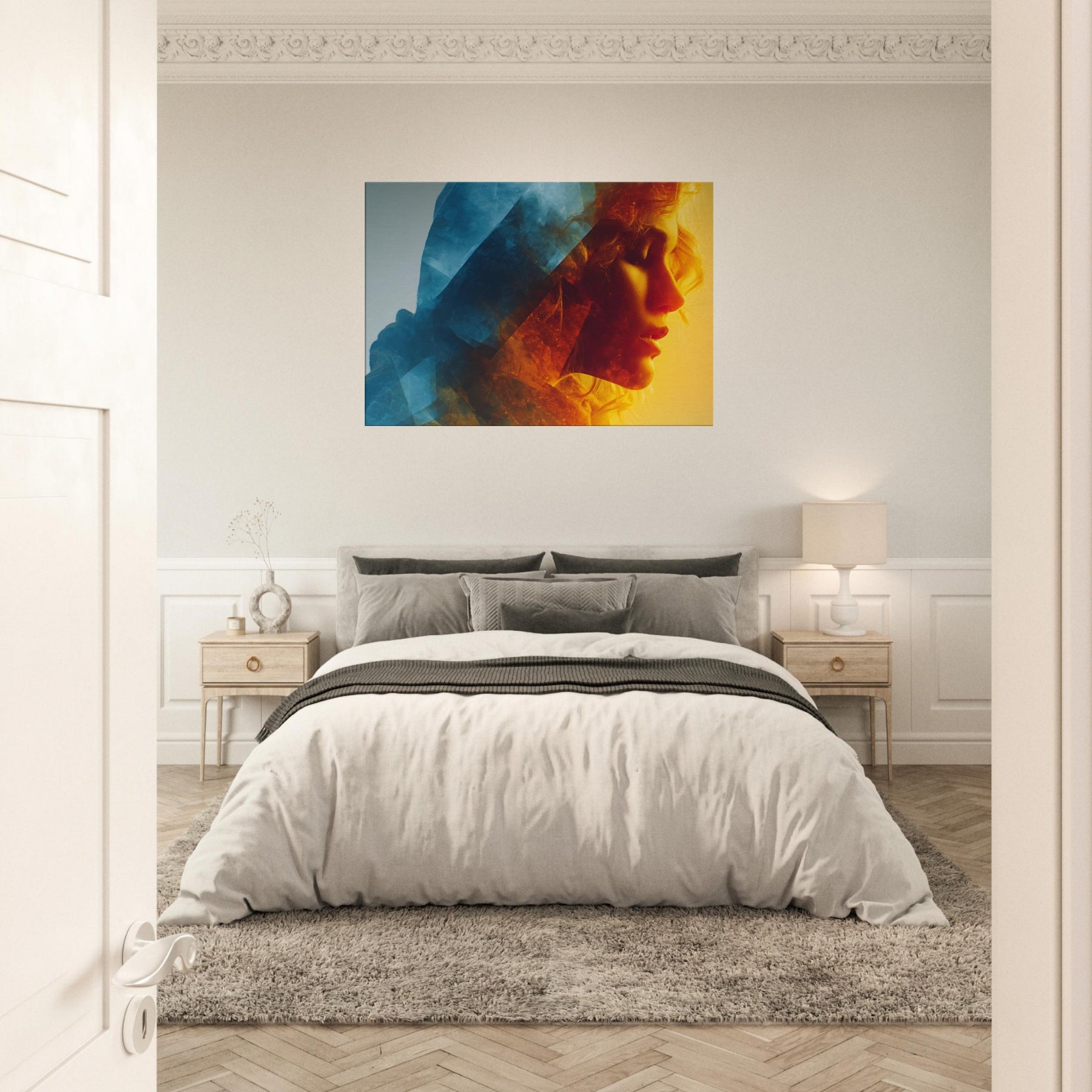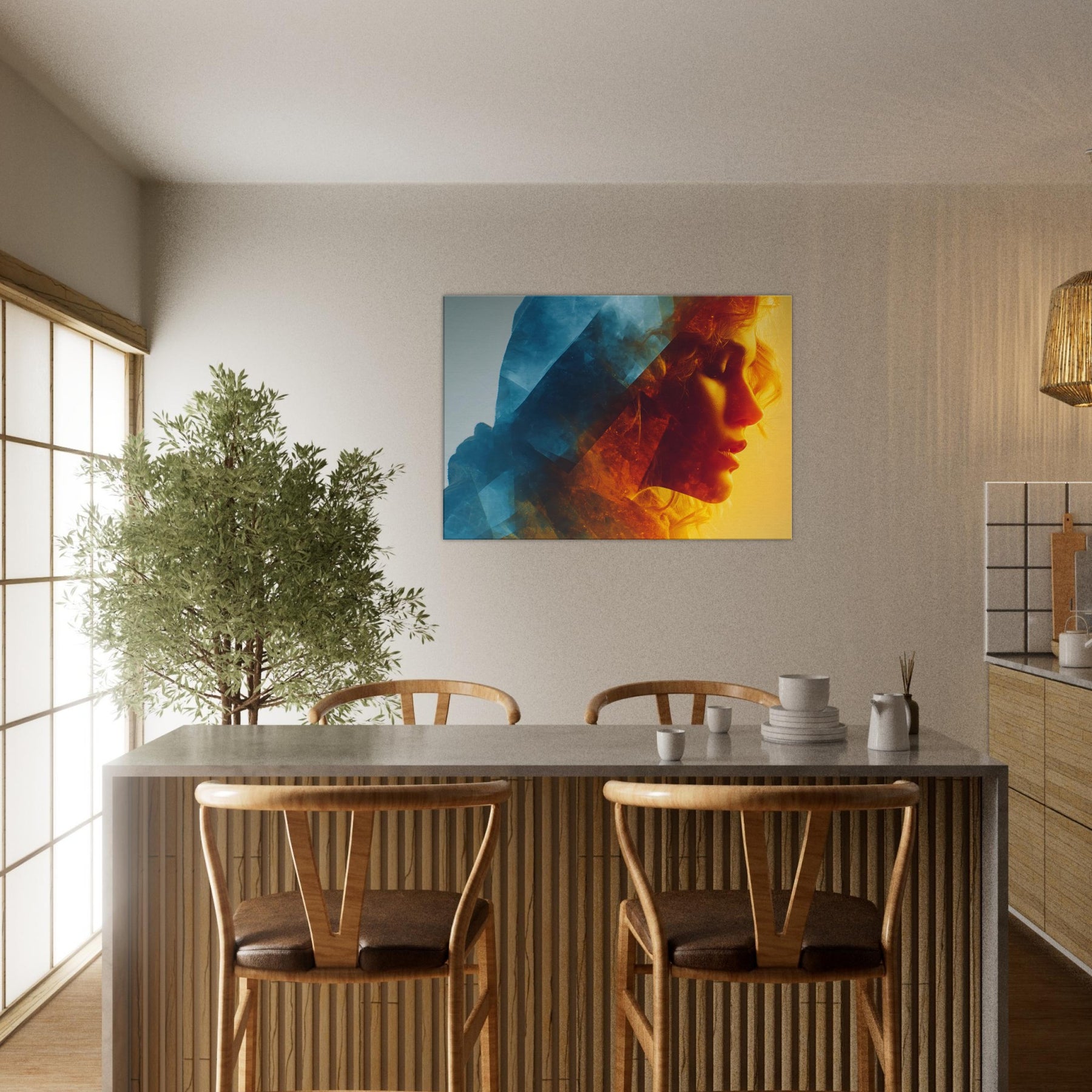 This piece centers on the Female Back, a sculpted silhouette that becomes a prism of color and memory. As blue and amber shards sweep across the image, a quiet air of introspection unfolds, inviting the room to breathe with soft light and shadow. The abstract forms cradle the skin and breath, transforming a private moment into a luminous centerpiece that elevates living spaces with mood, texture, and a whisper of motion.