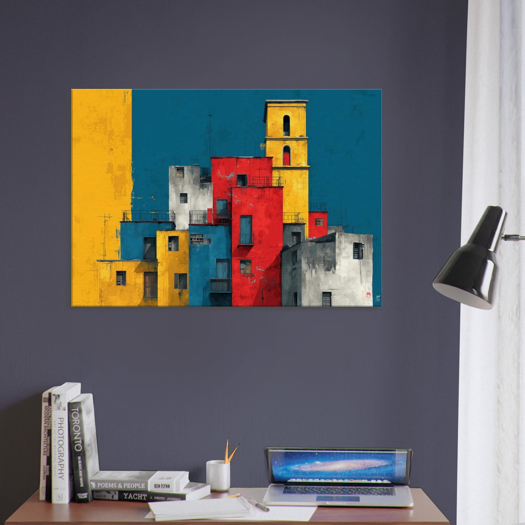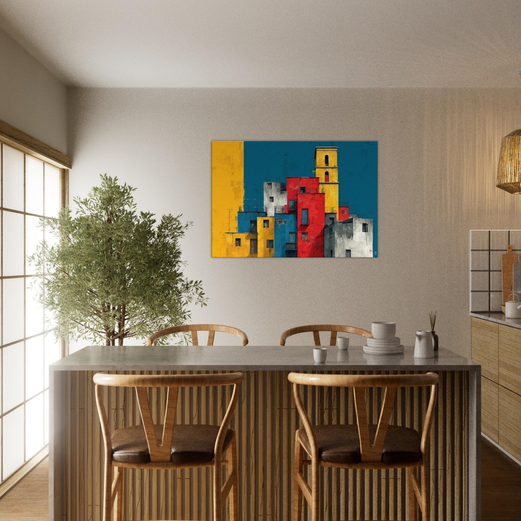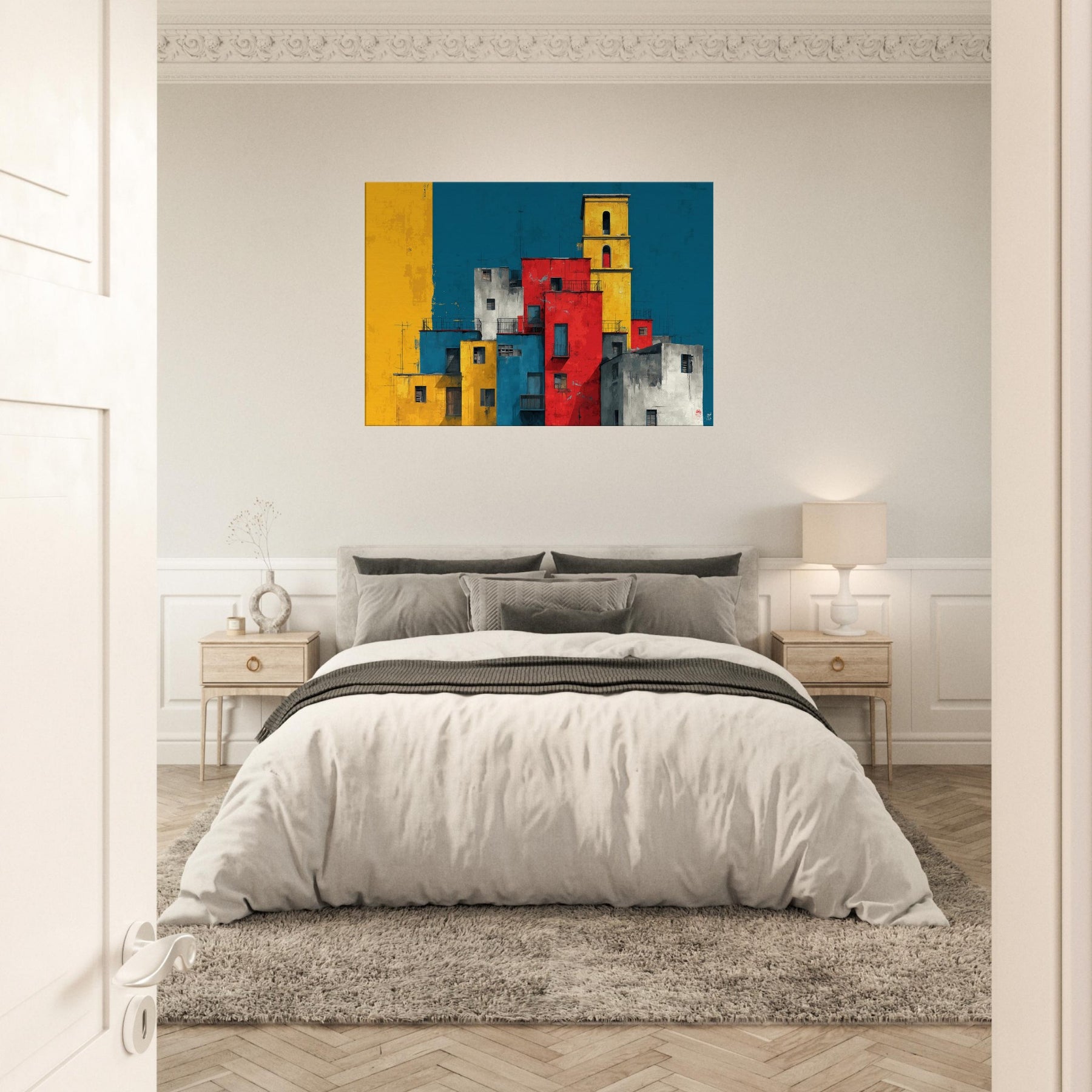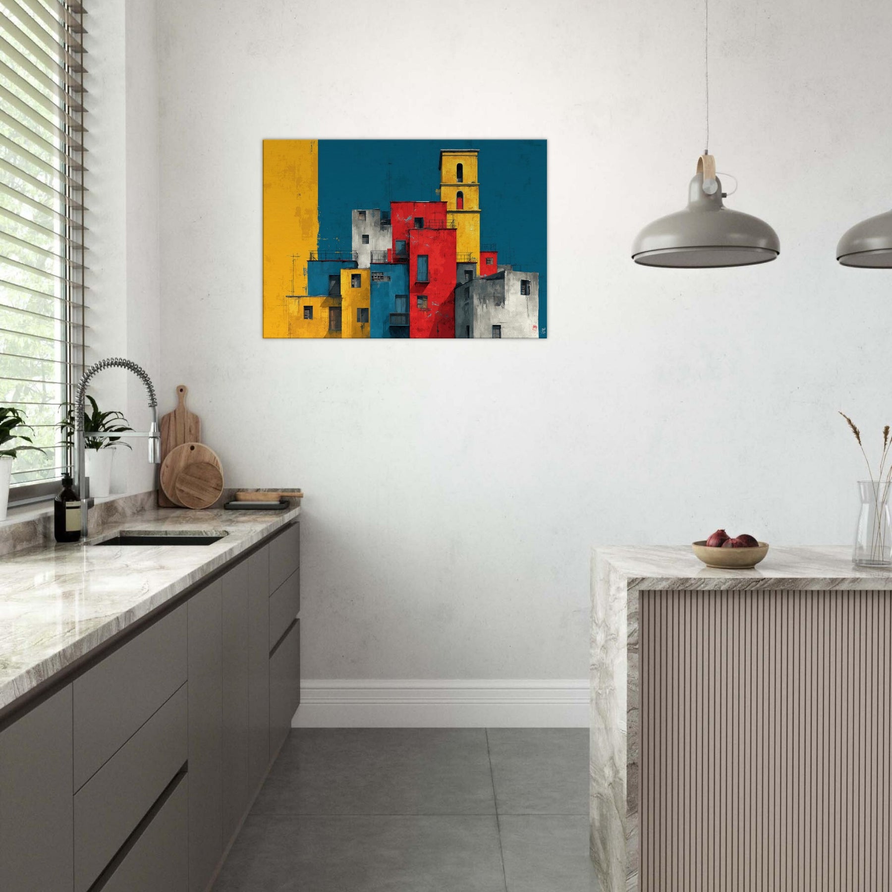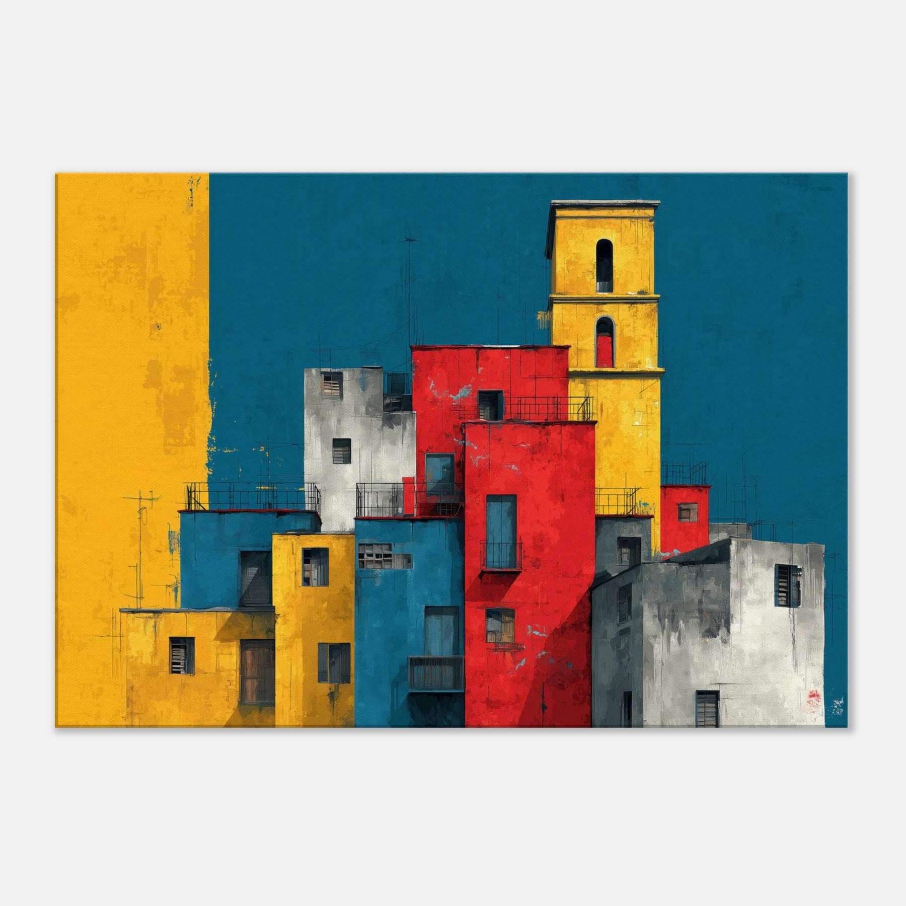 Immerse your space in the lively geometry of Venice through this abstract study of color and form. Stacks of sunlit blocks rise against a deep, waiting blue sky, each hue gold, red, cobalt, gray carving a rhythm that feels like a distant bell and a street market at dusk. The artwork invites quiet contemplation while adding warmth, contrast, and a modern heartbeat to a living room, study, or entryway.