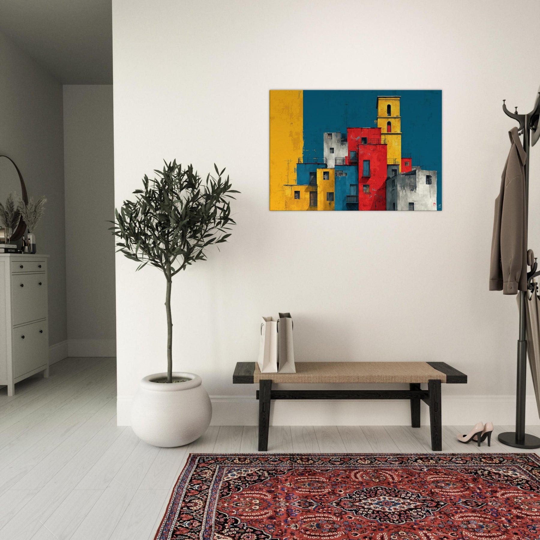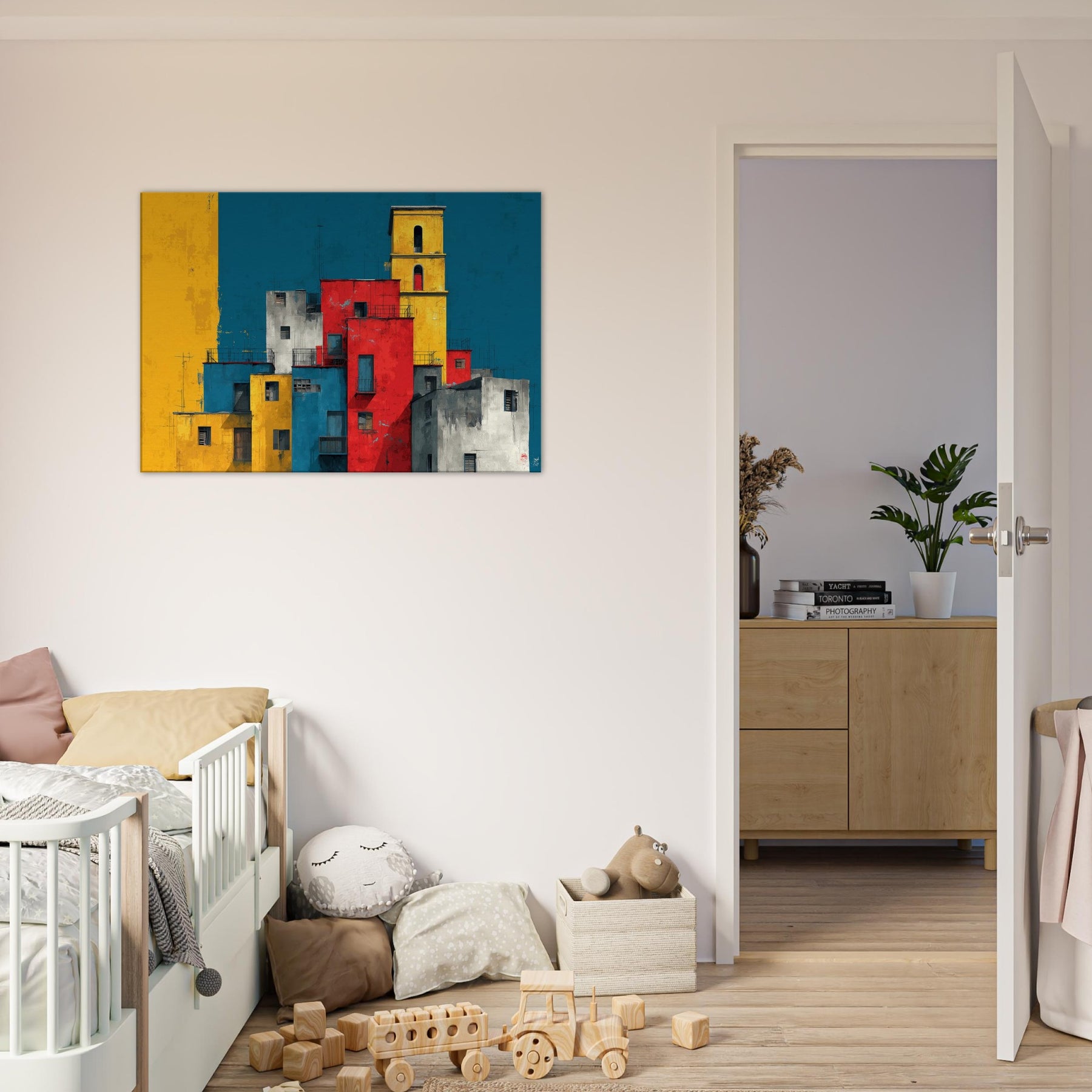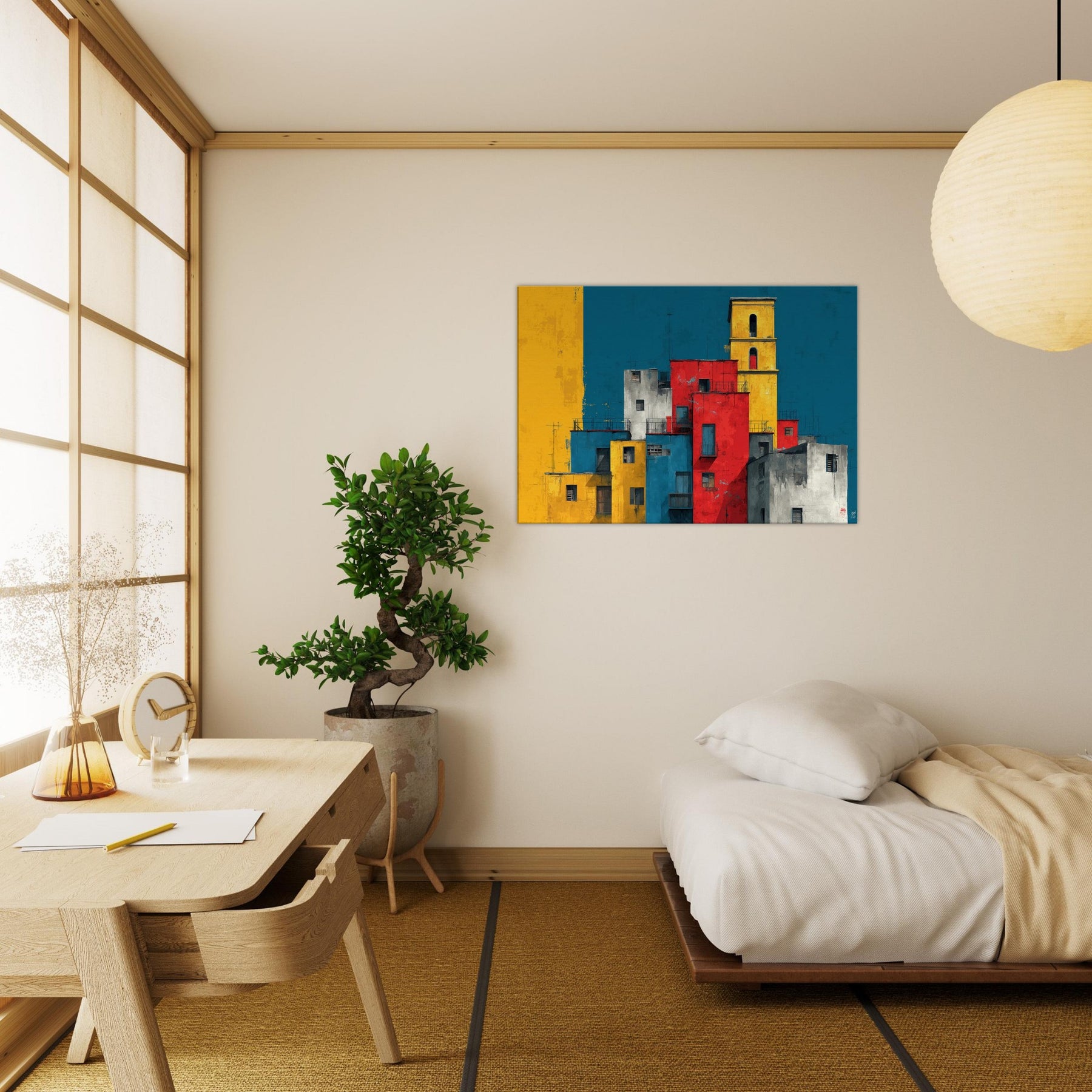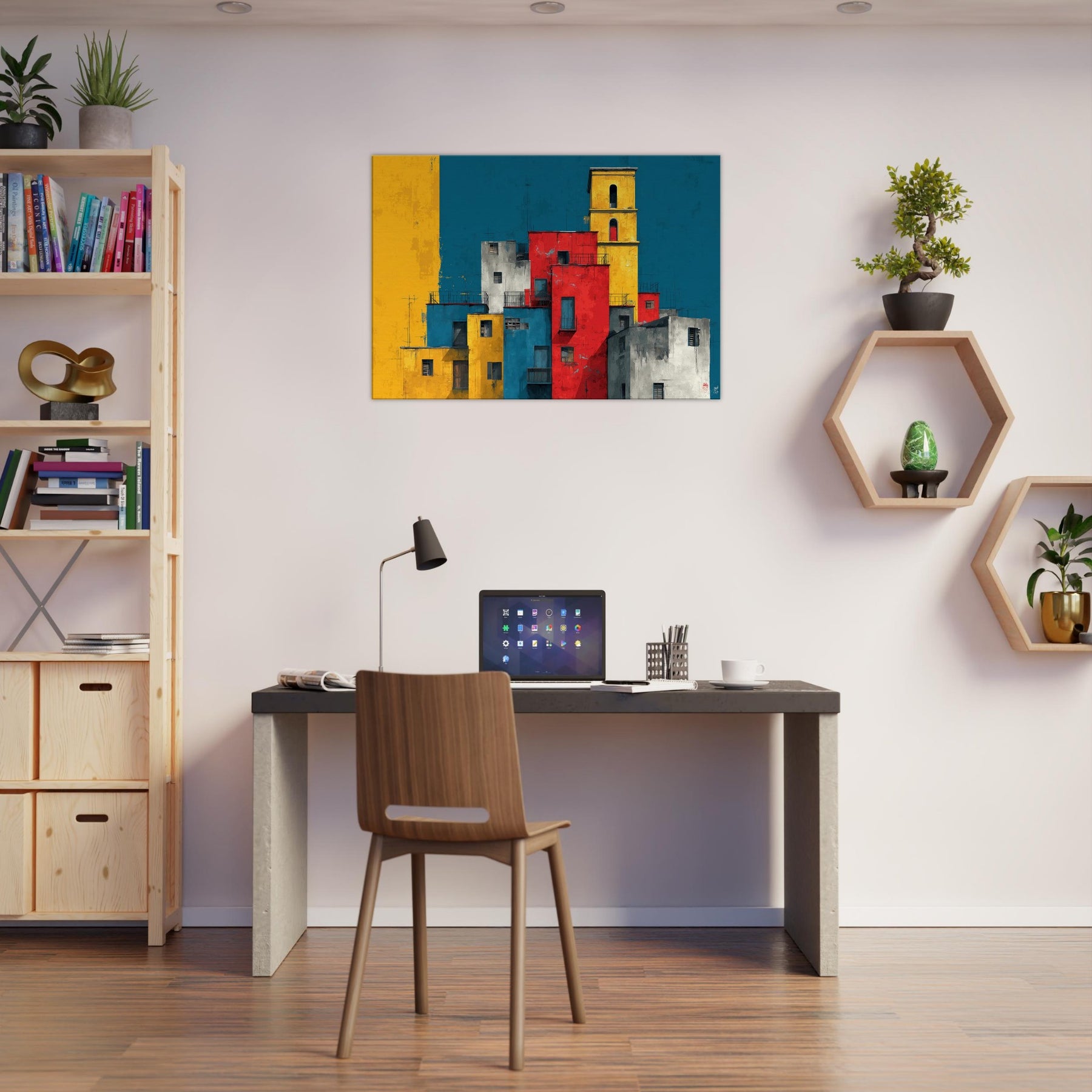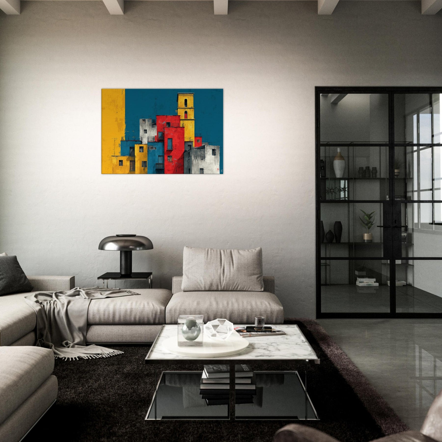 Immerse your space in the lively geometry of Venice through this abstract study of color and form. Stacks of sunlit blocks rise against a deep, waiting blue sky, each hue gold, red, cobalt, gray carving a rhythm that feels like a distant bell and a street market at dusk. The artwork invites quiet contemplation while adding warmth, contrast, and a modern heartbeat to a living room, study, or entryway.