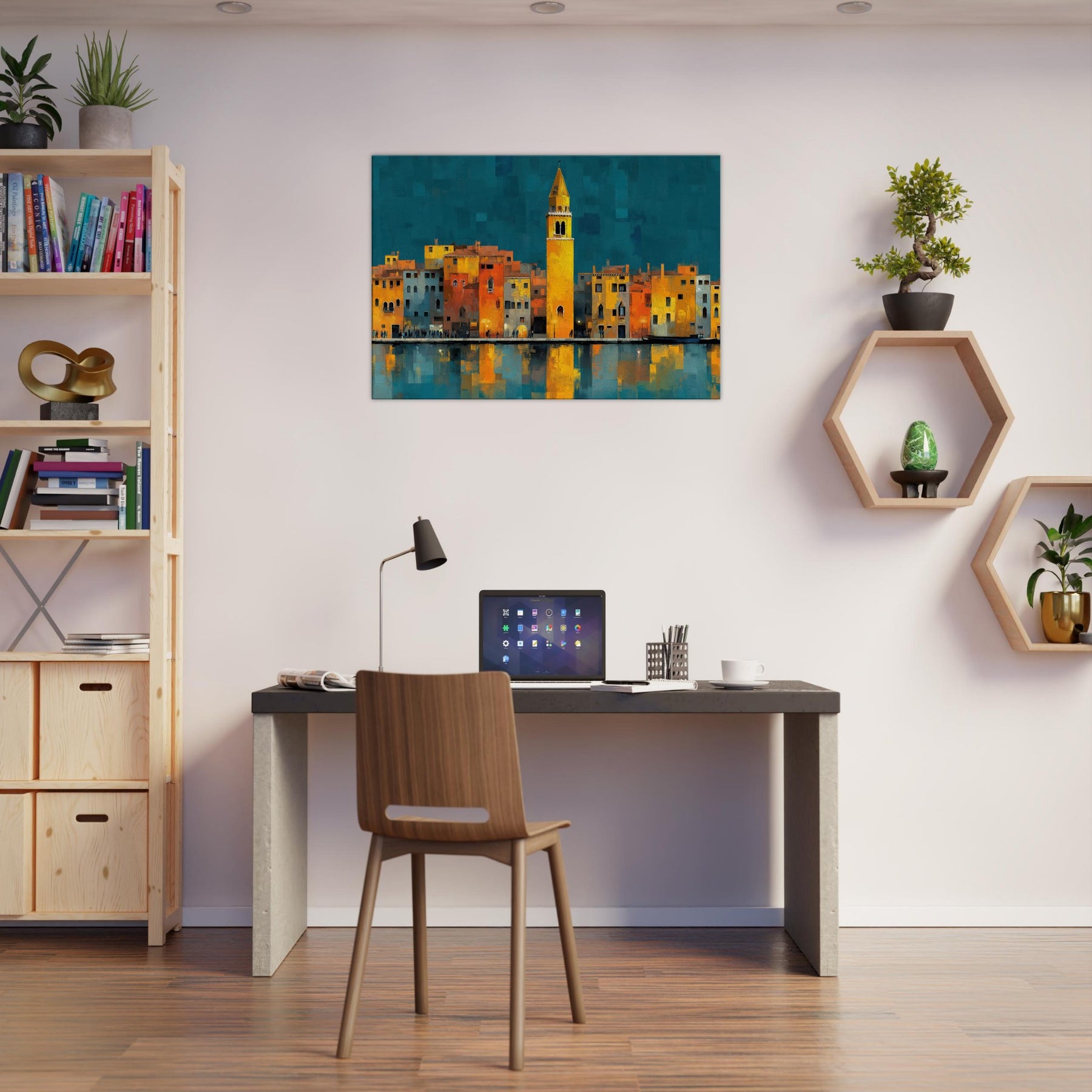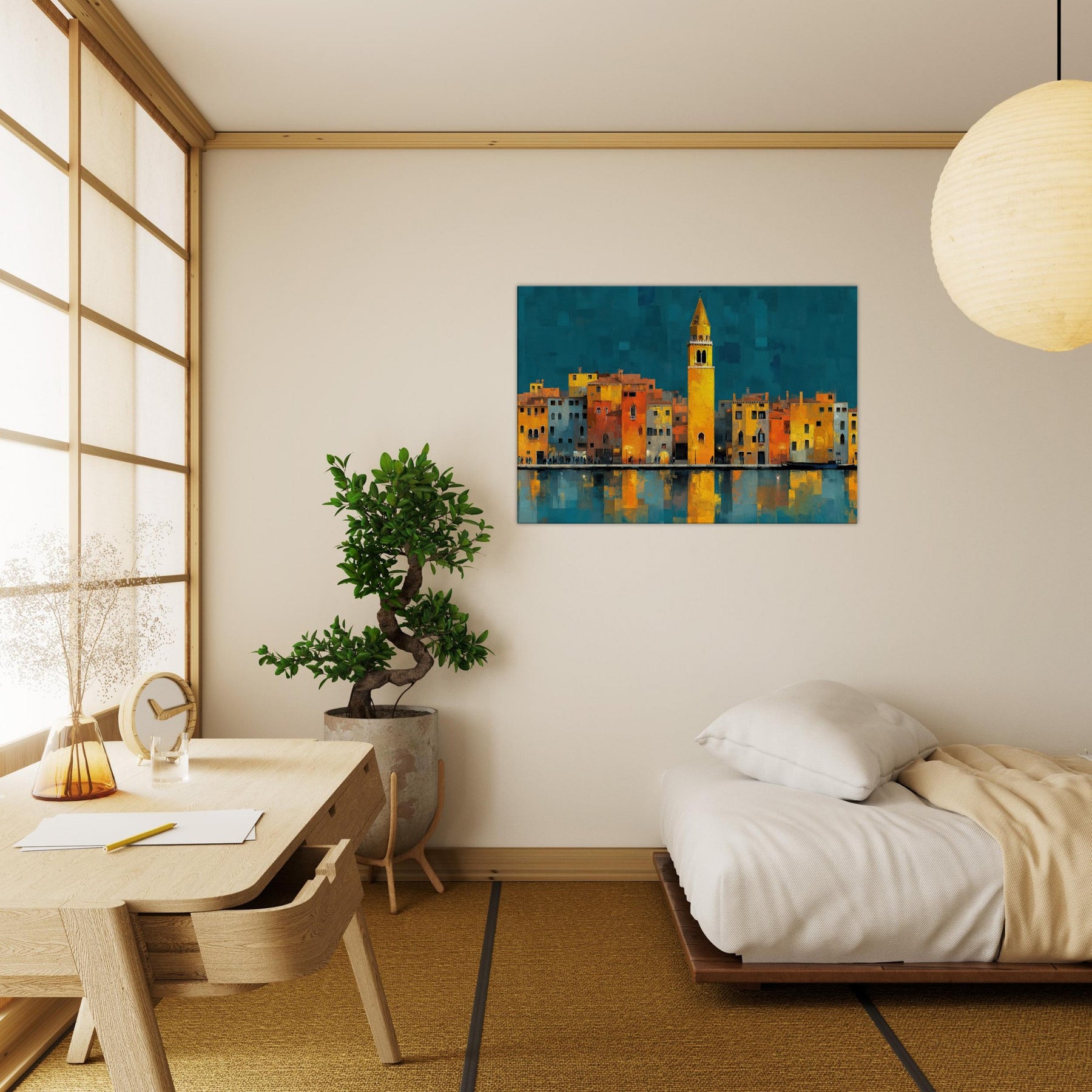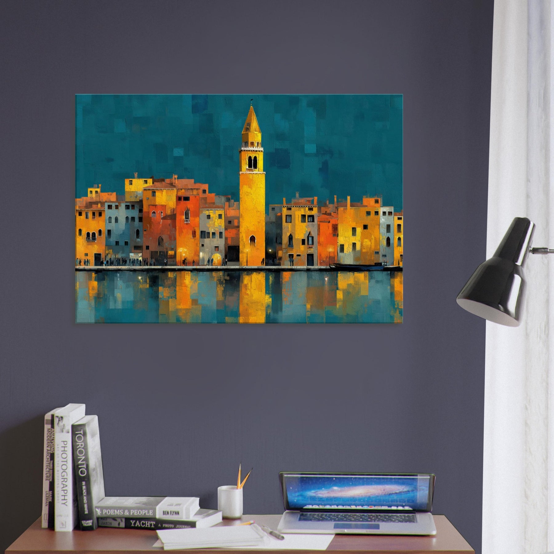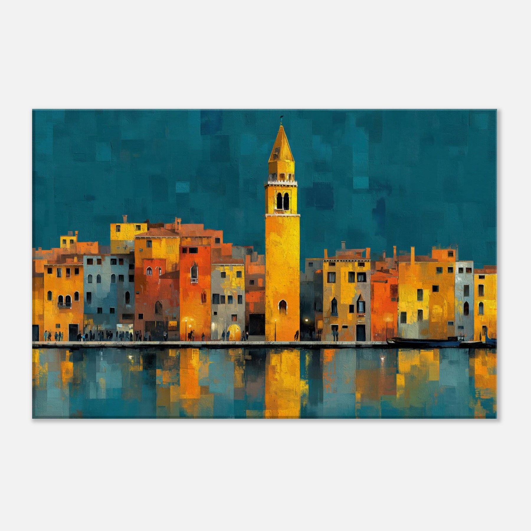 Venice unfolds in a radiant tapestry of light and color, where towers rise like sunlit signatures along a shimmering canal. This abstract cityscape invites the eye to wander through warm oranges, sunlit yellows, and deep teals that echo the city's timeless pulse. Hang it to breathe a cafe terrace into your living room, summoning afternoon breezes and soft conversations by water. A confident, luminous centerpiece that makes walls feel expansive, inviting reflection and travel without leaving home.
