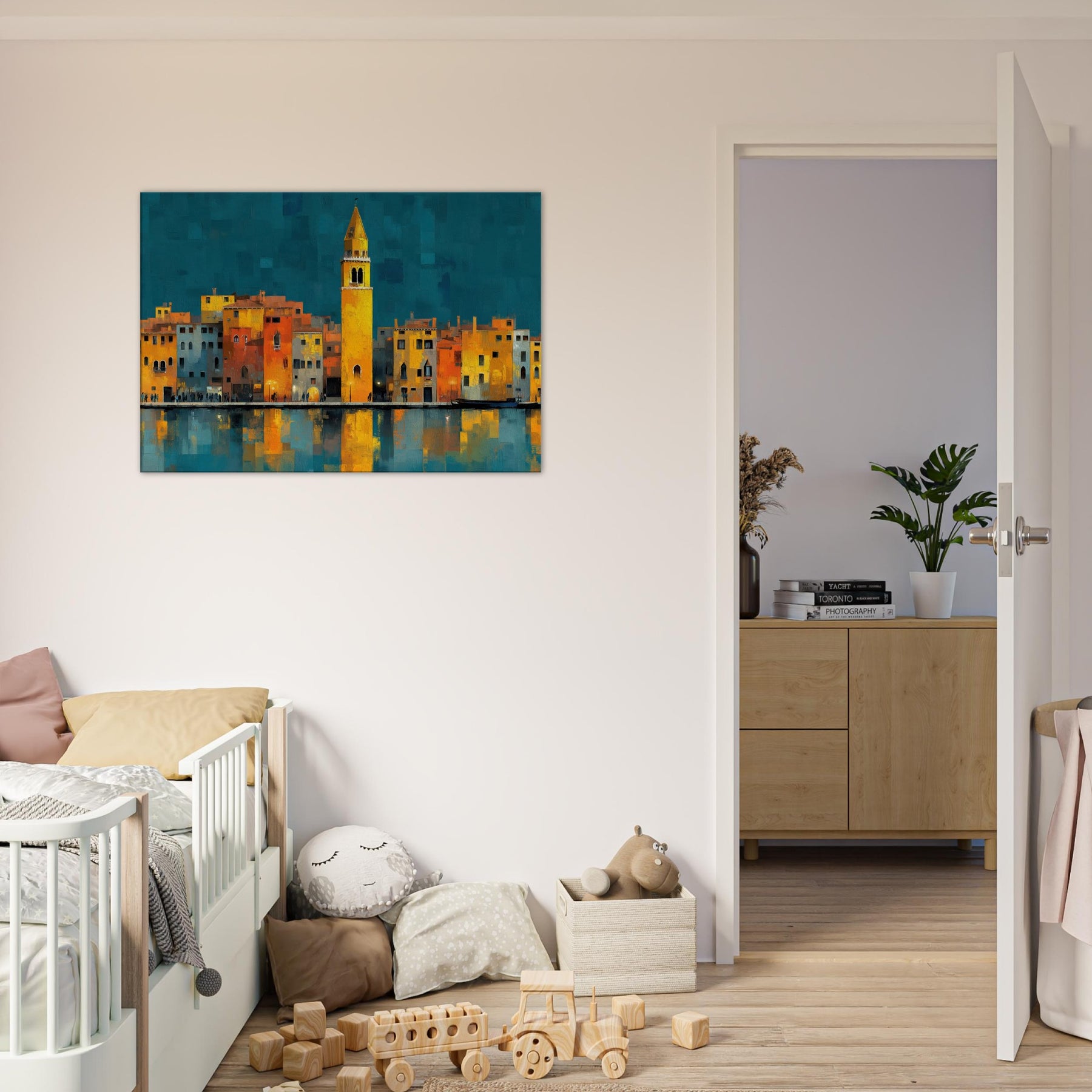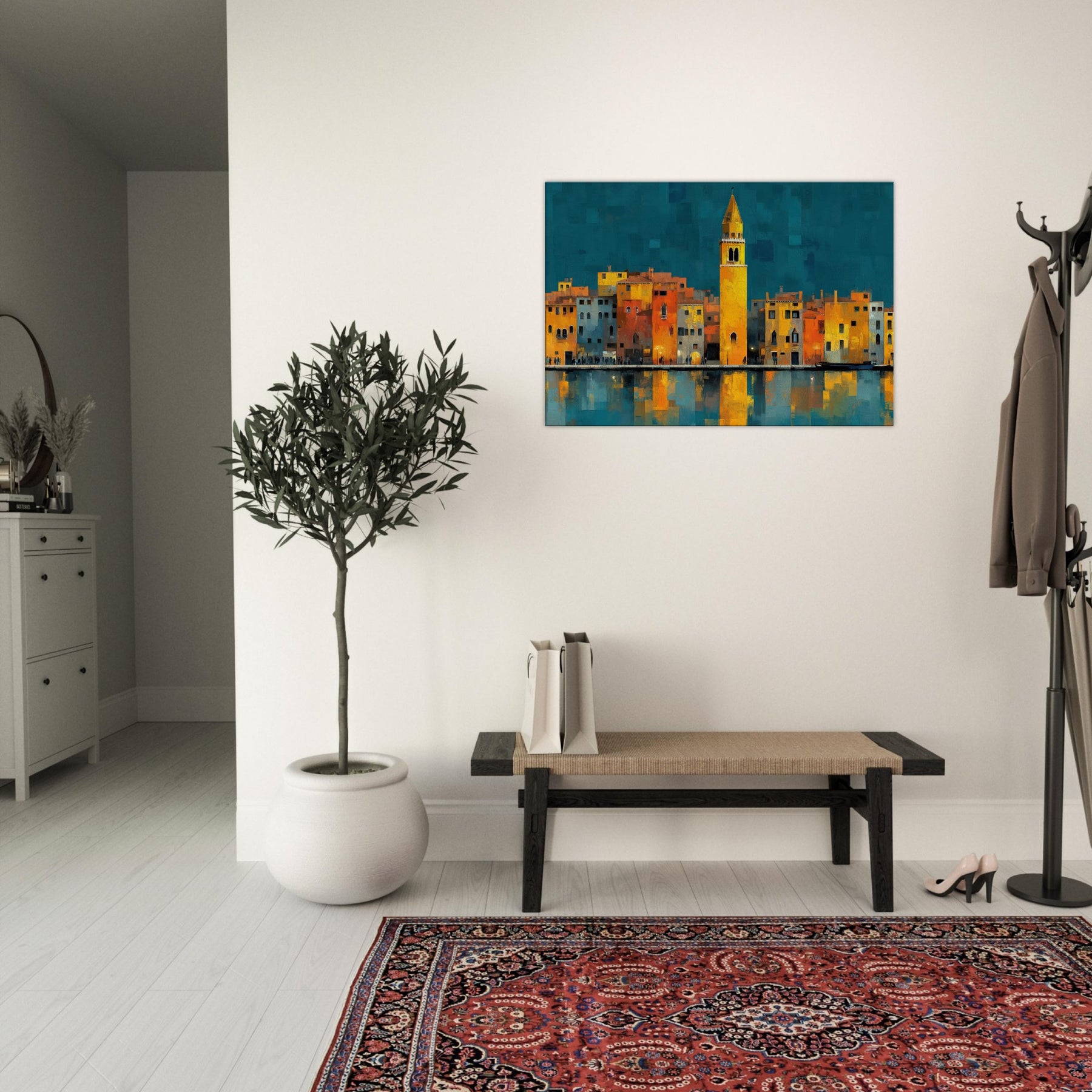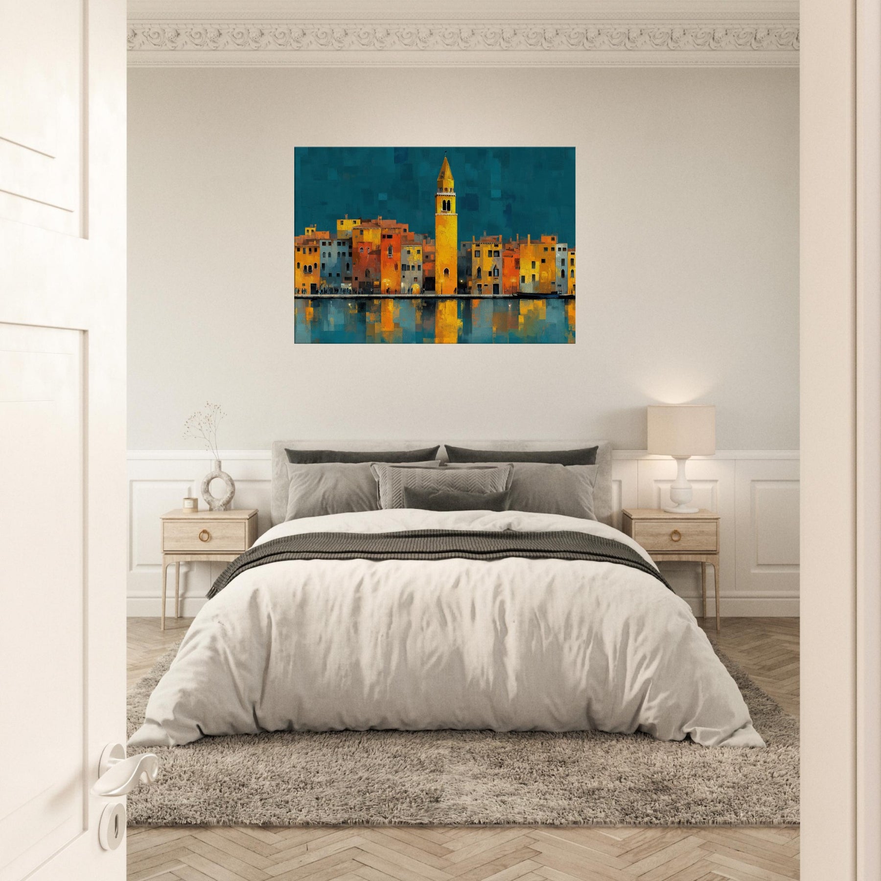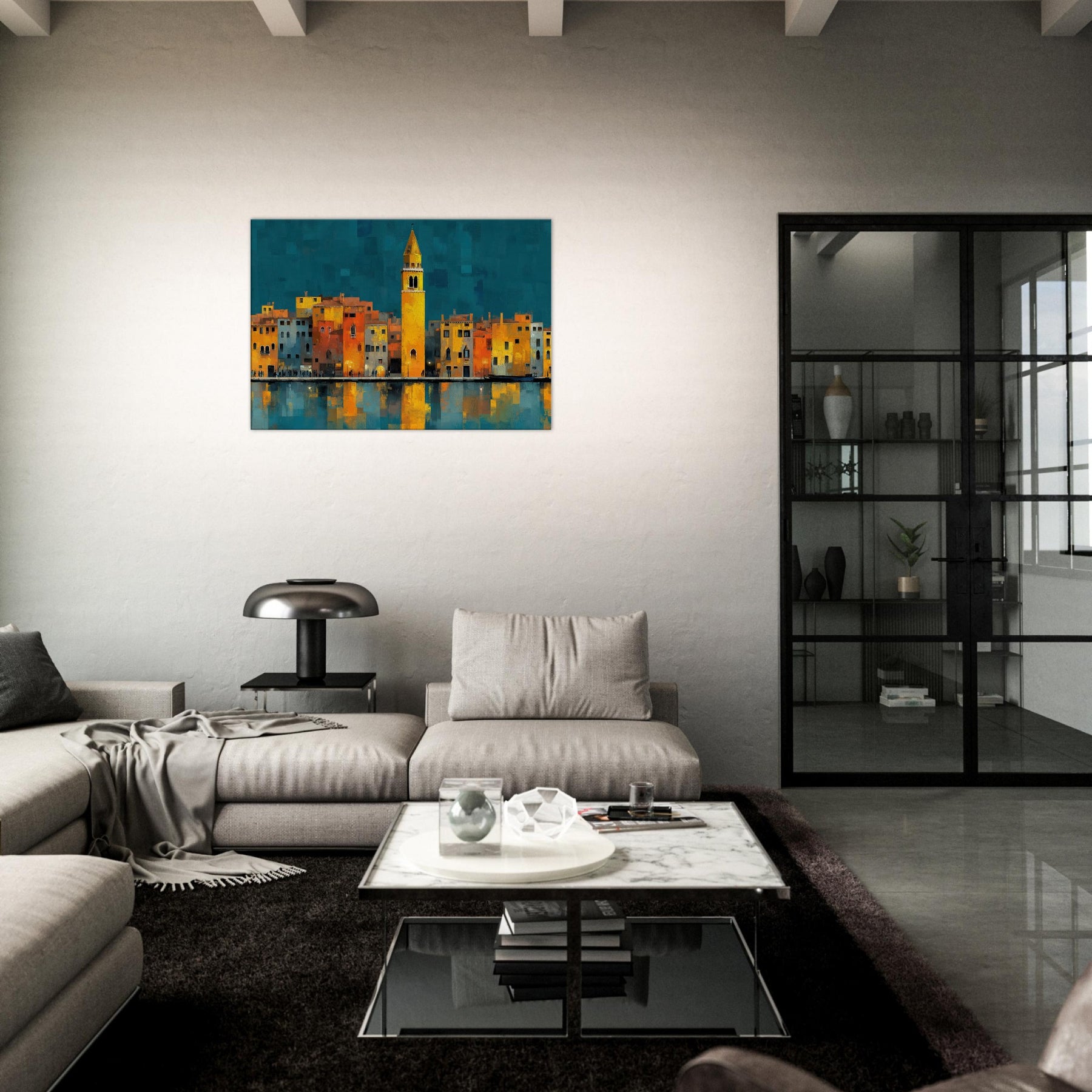Venice unfolds in a radiant tapestry of light and color, where towers rise like sunlit signatures along a shimmering canal. This abstract cityscape invites the eye to wander through warm oranges, sunlit yellows, and deep teals that echo the city's timeless pulse. Hang it to breathe a cafe terrace into your living room, summoning afternoon breezes and soft conversations by water. A confident, luminous centerpiece that makes walls feel expansive, inviting reflection and travel without leaving home.