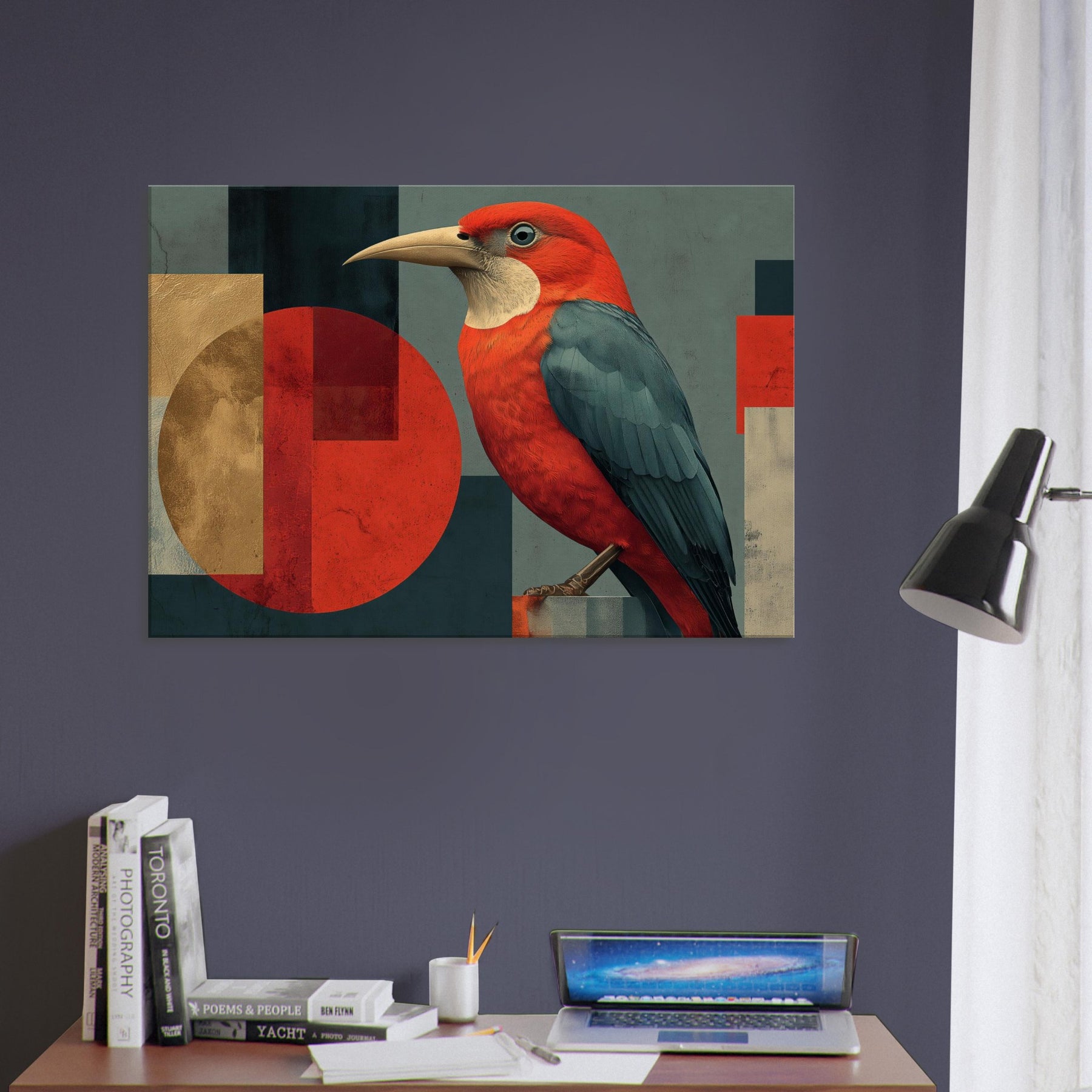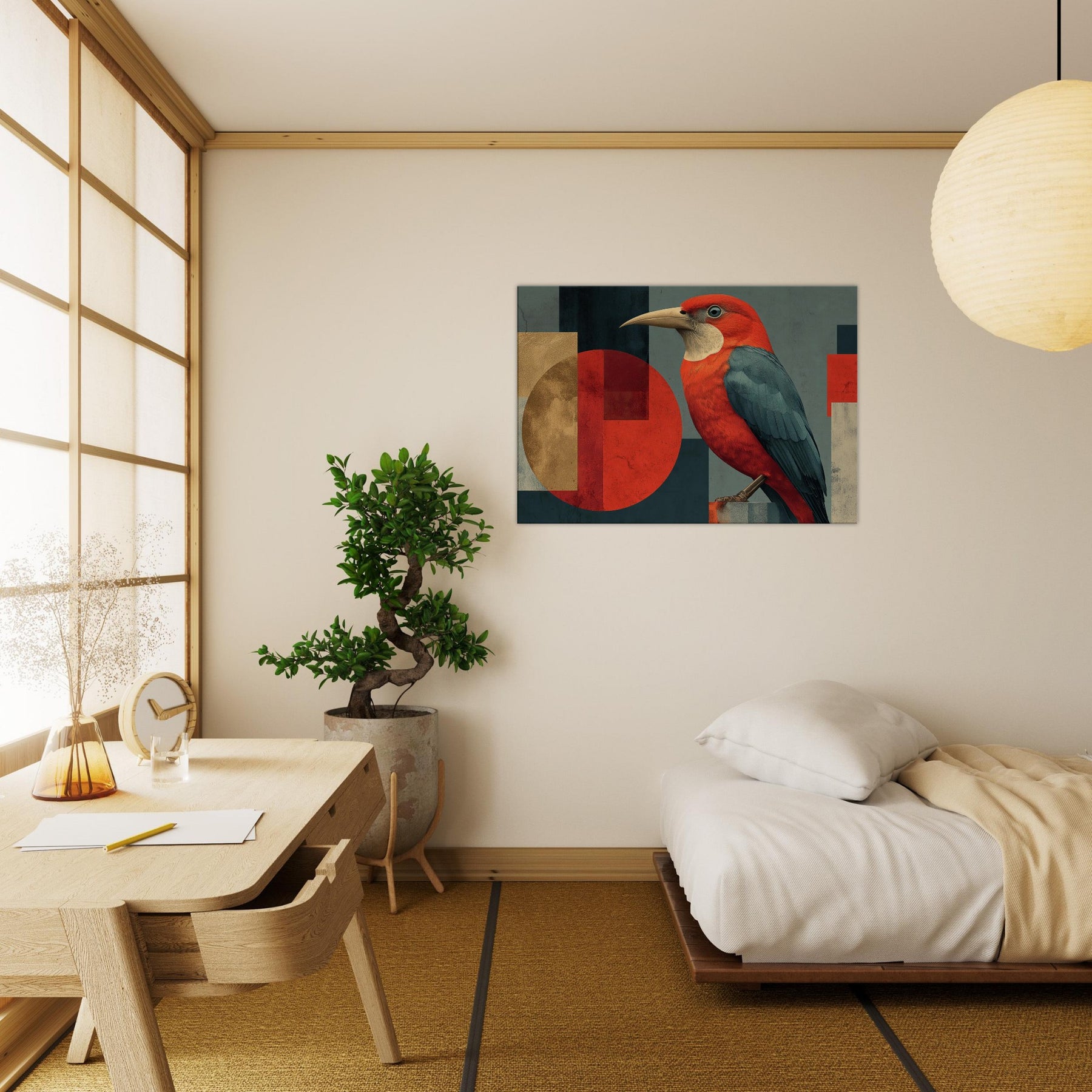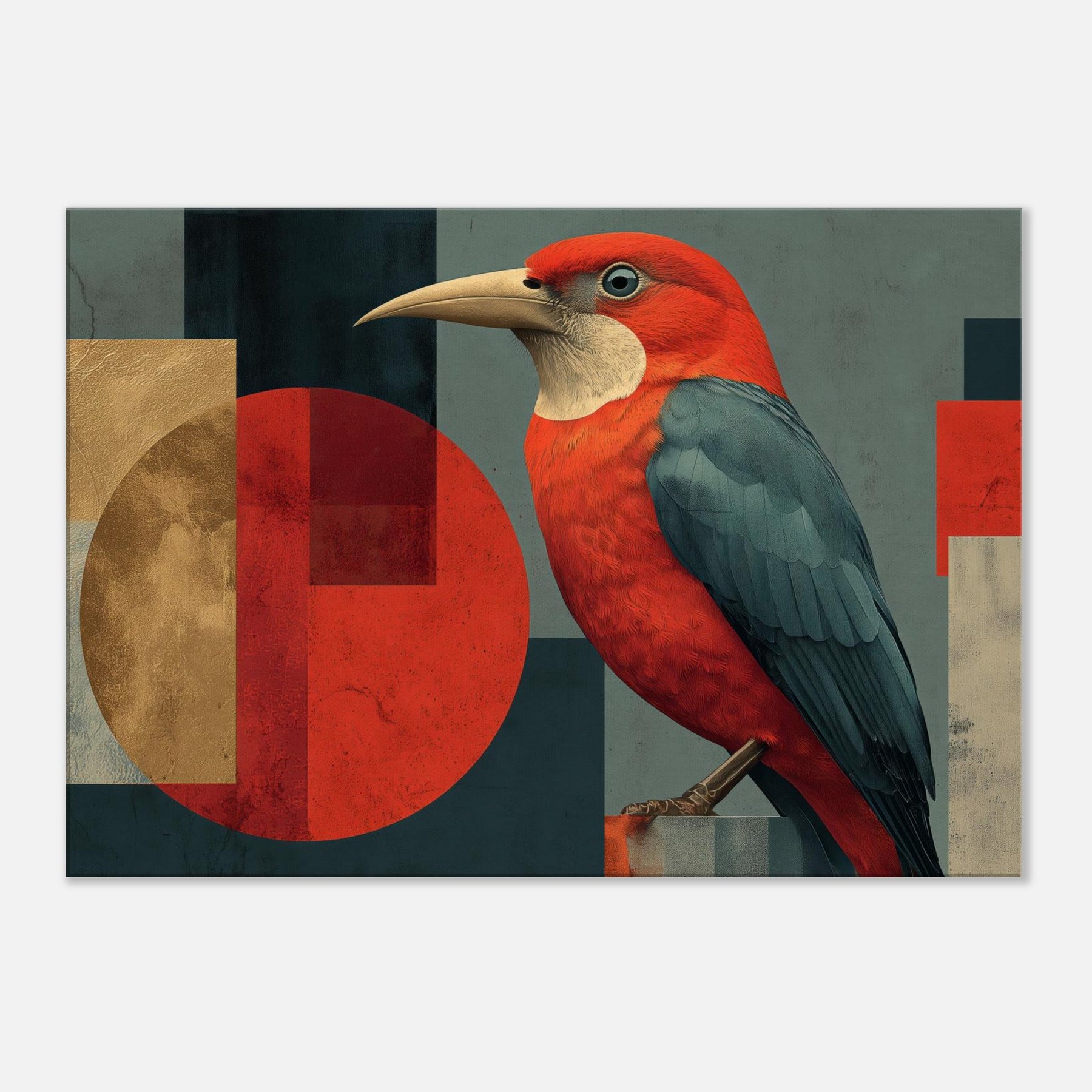 Vermilion Bird of the South Reborn from Sacred Fire soars across an engineered horizon, a radiant emblem of renewal. The abstract composition blends sun warmed reds with midnight teal and softened gold, wrapping your space in a primal, mythic glow. The bird's lush plumage appears to ripple with heat, inviting quiet focus in a living room or study. Hang it where daylight can kiss the surface, and let the room breathe with legend, courage, and a warm, transformative energy.