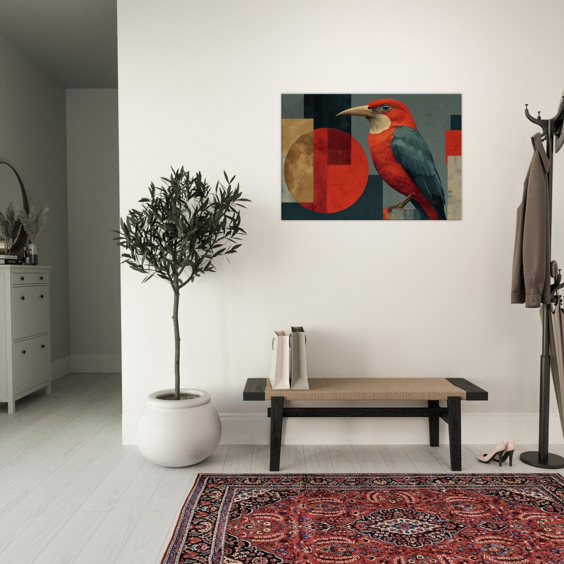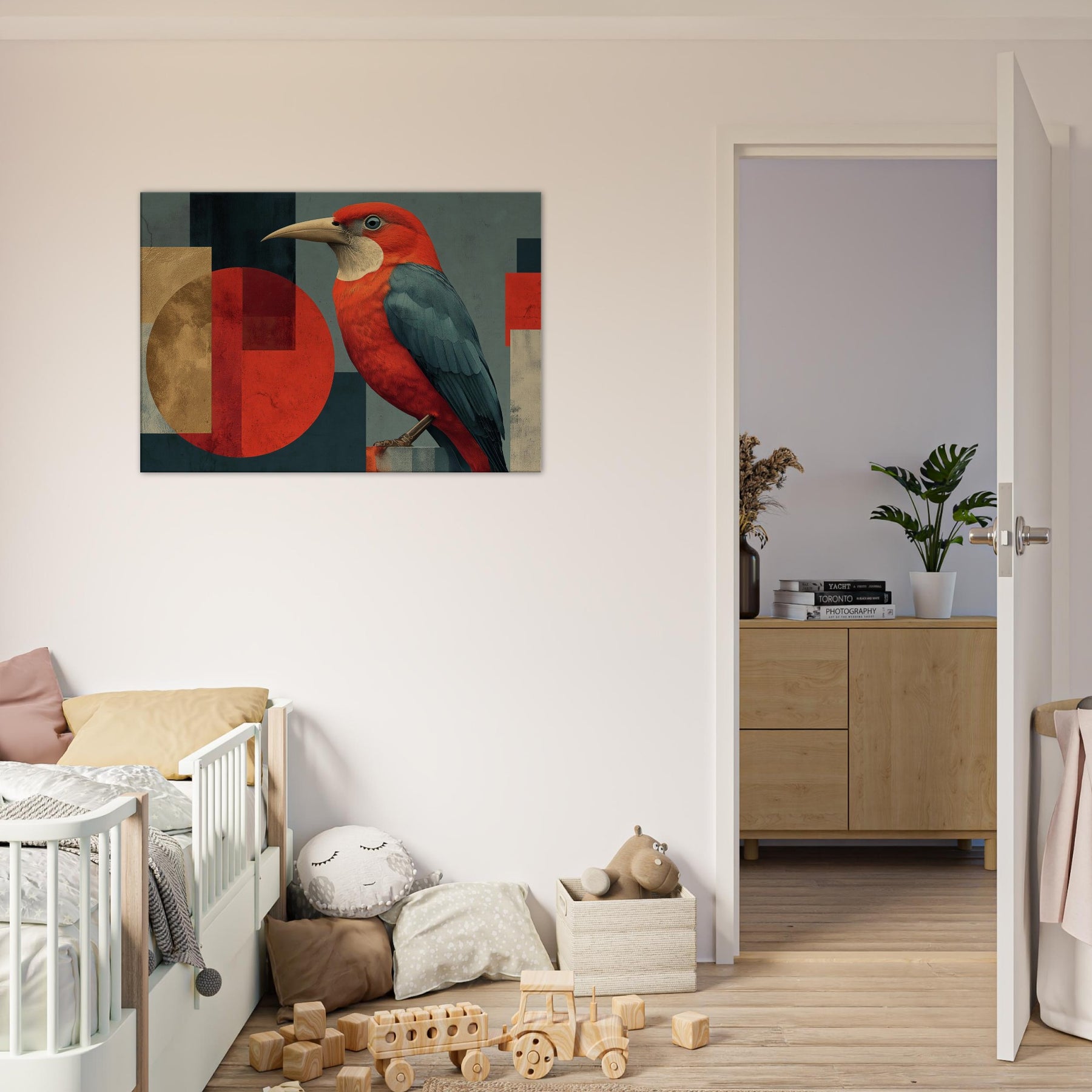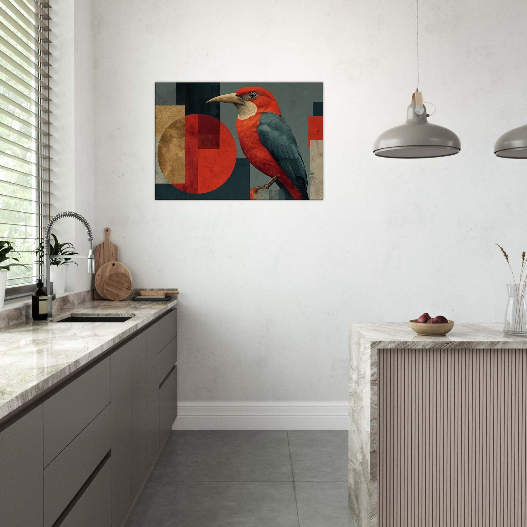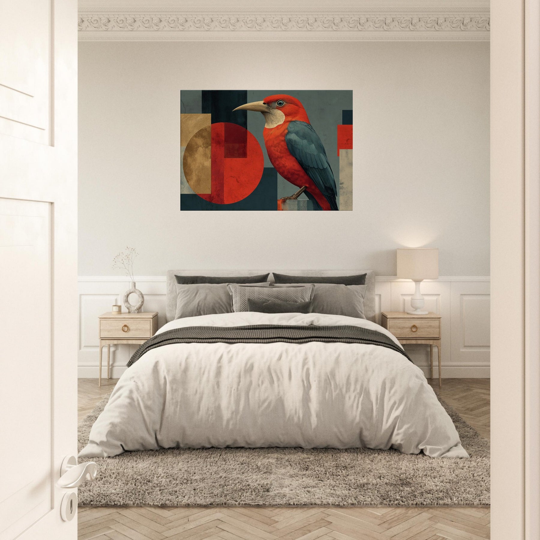 Vermilion Bird of the South Reborn from Sacred Fire soars across an engineered horizon, a radiant emblem of renewal. The abstract composition blends sun warmed reds with midnight teal and softened gold, wrapping your space in a primal, mythic glow. The bird's lush plumage appears to ripple with heat, inviting quiet focus in a living room or study. Hang it where daylight can kiss the surface, and let the room breathe with legend, courage, and a warm, transformative energy.