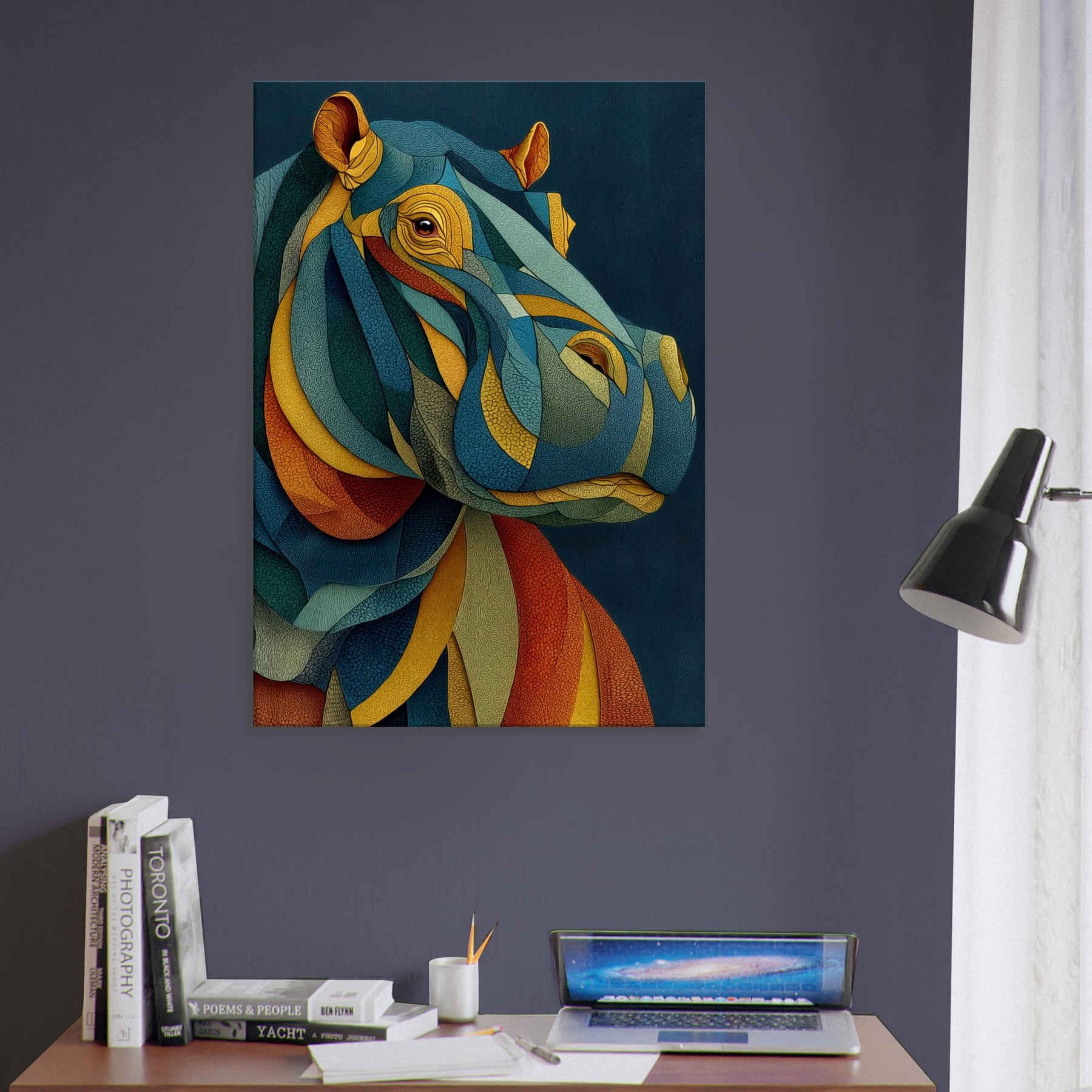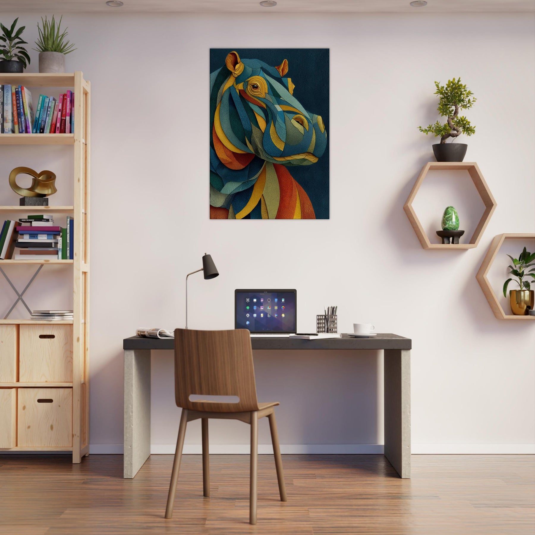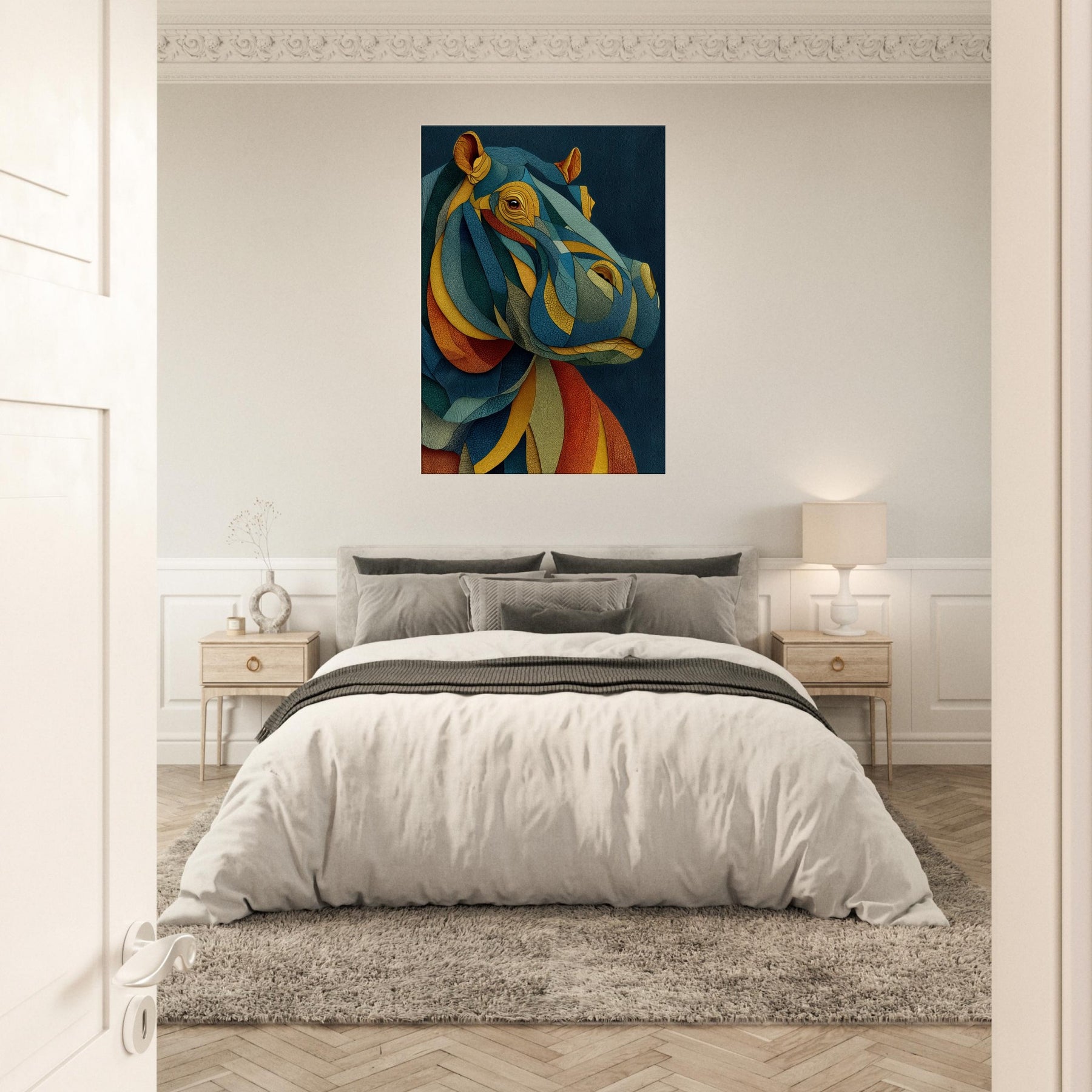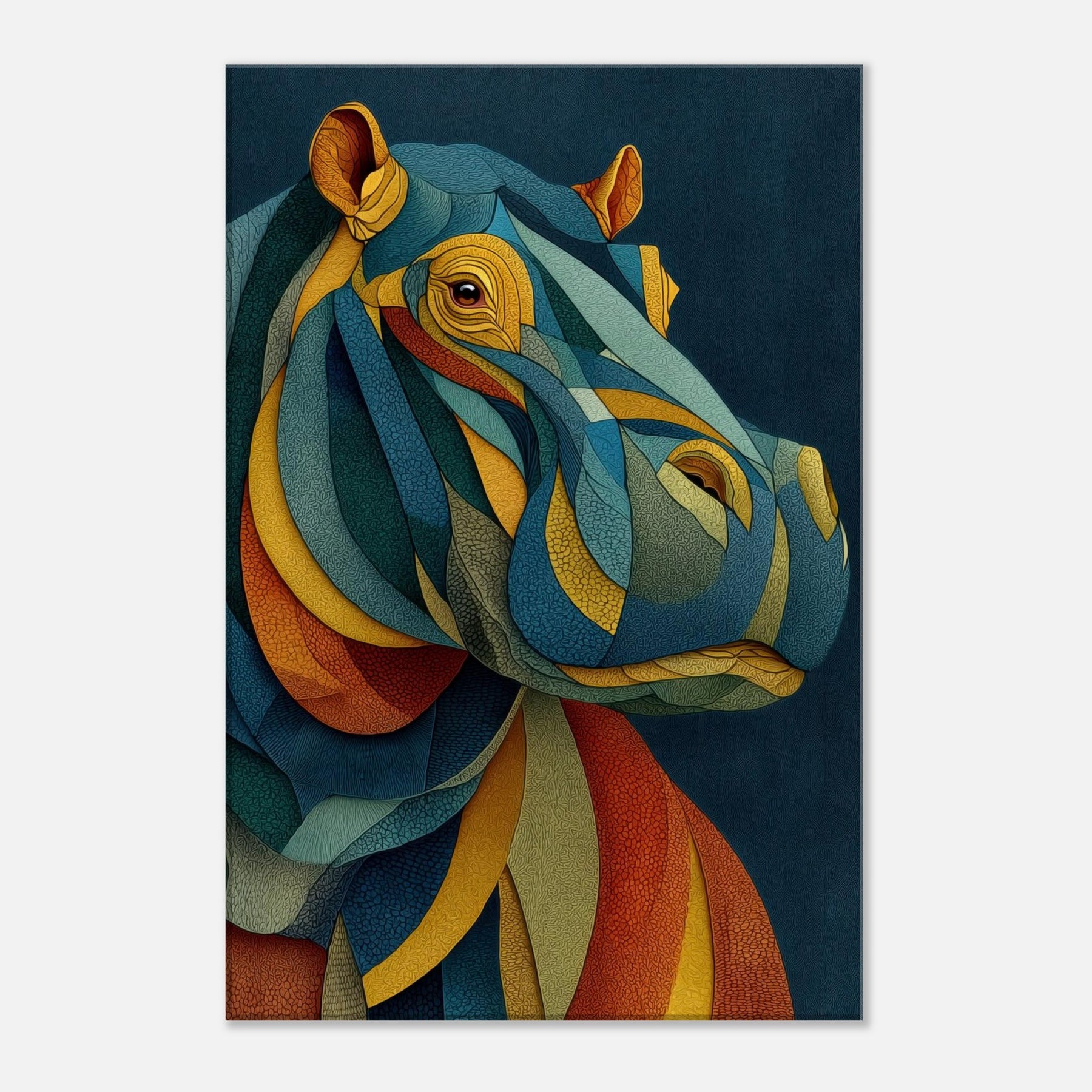 Like a dream where color chooses its own rhythm, this abstract study of a hippopotamus wraps your space in tactile calm and electric wonder. The layered, mosaic like forms ripple with warm ochre, oceanic teal, and sunset coral, inviting the eye to travel and linger. In a living room or bedroom, the piece becomes a silent chorus of texture and mood, grounding modern furnishings while sparking conversation. The hippopotamus emerges not as a literal image, but as a heartbeat of color and quiet strength.