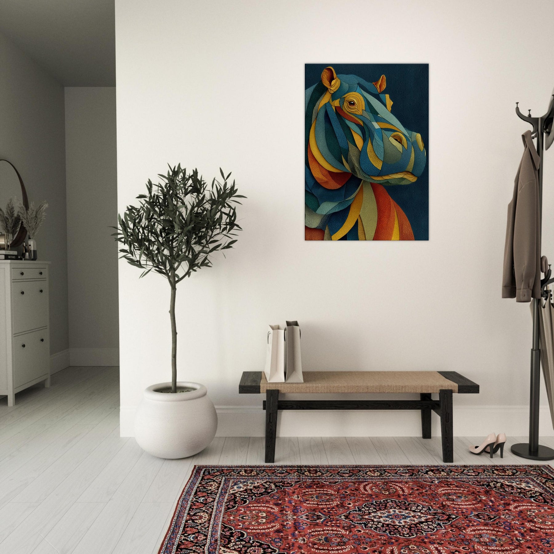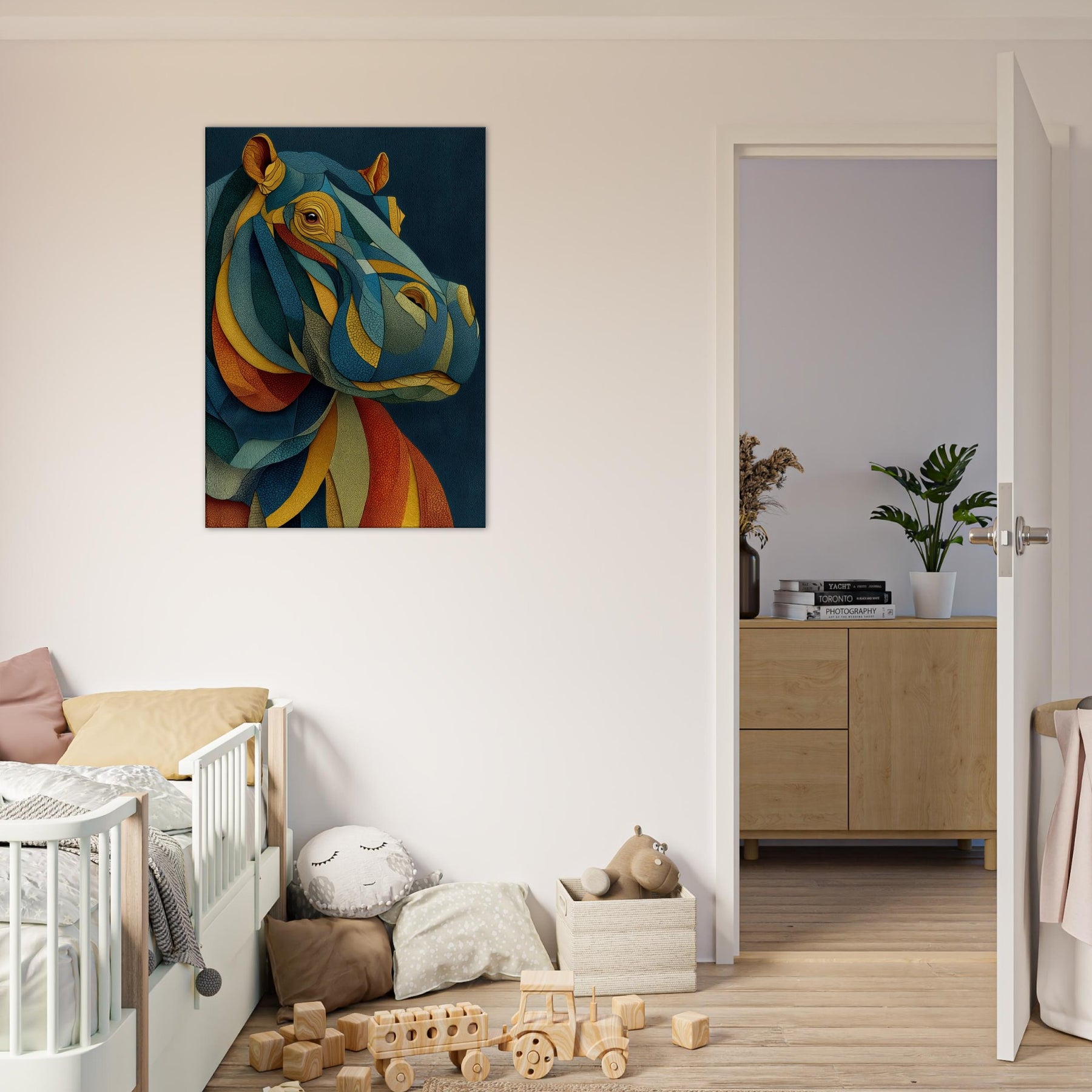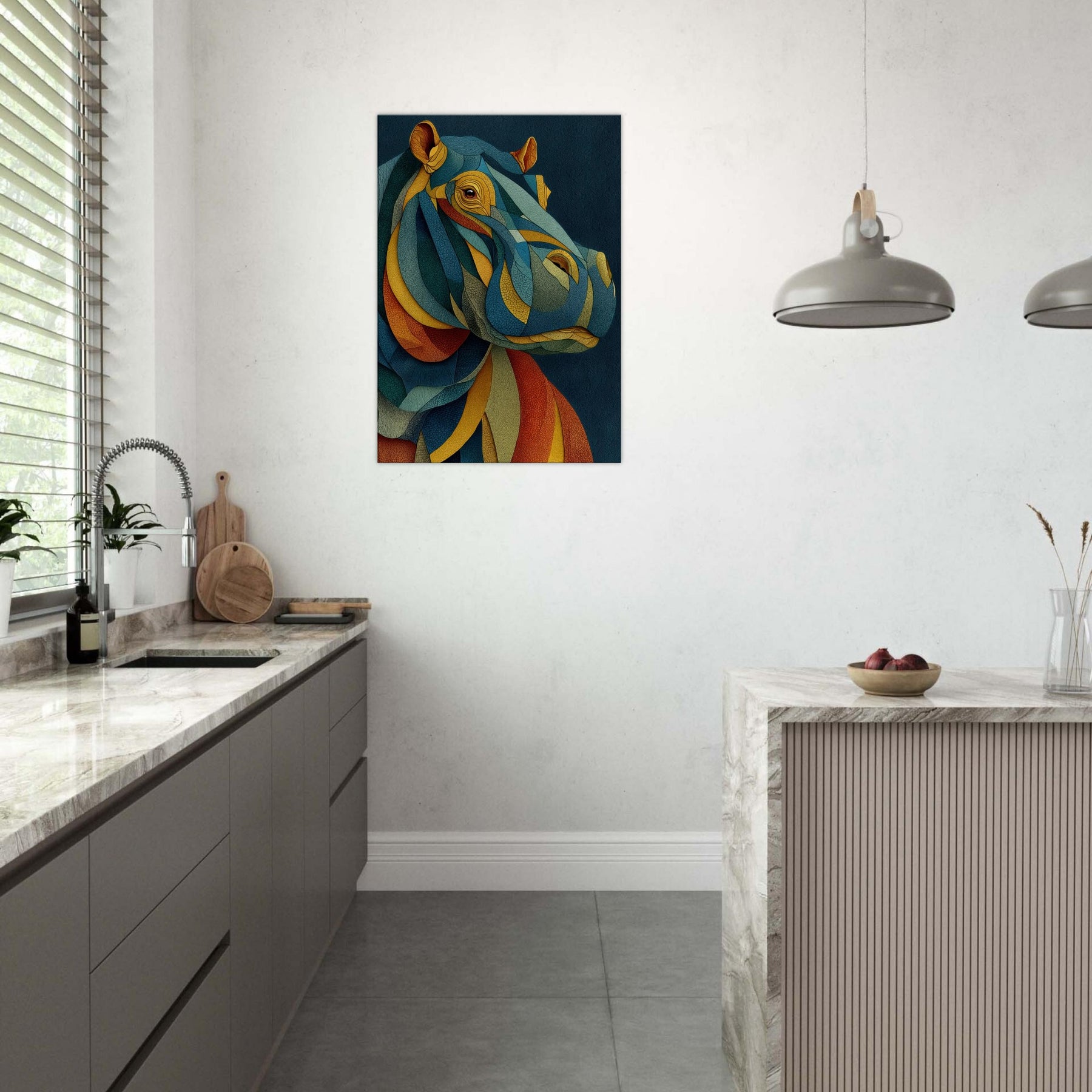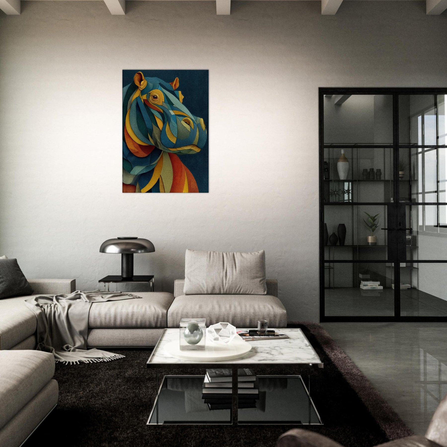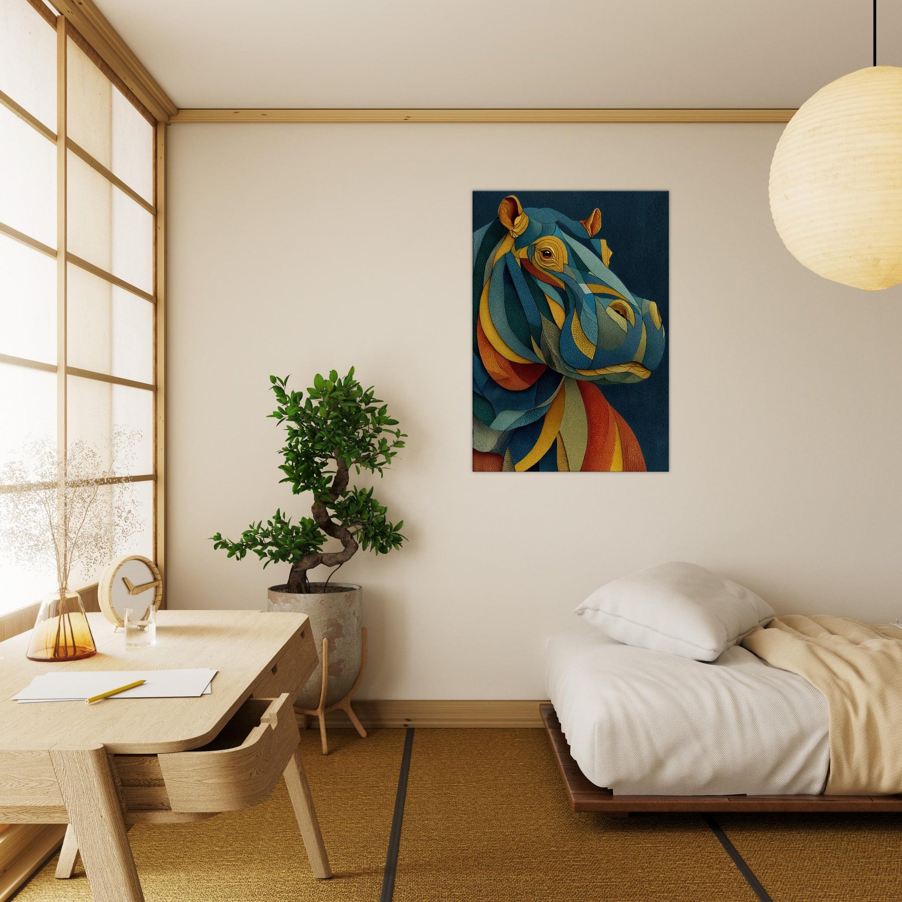 Like a dream where color chooses its own rhythm, this abstract study of a hippopotamus wraps your space in tactile calm and electric wonder. The layered, mosaic like forms ripple with warm ochre, oceanic teal, and sunset coral, inviting the eye to travel and linger. In a living room or bedroom, the piece becomes a silent chorus of texture and mood, grounding modern furnishings while sparking conversation. The hippopotamus emerges not as a literal image, but as a heartbeat of color and quiet strength.