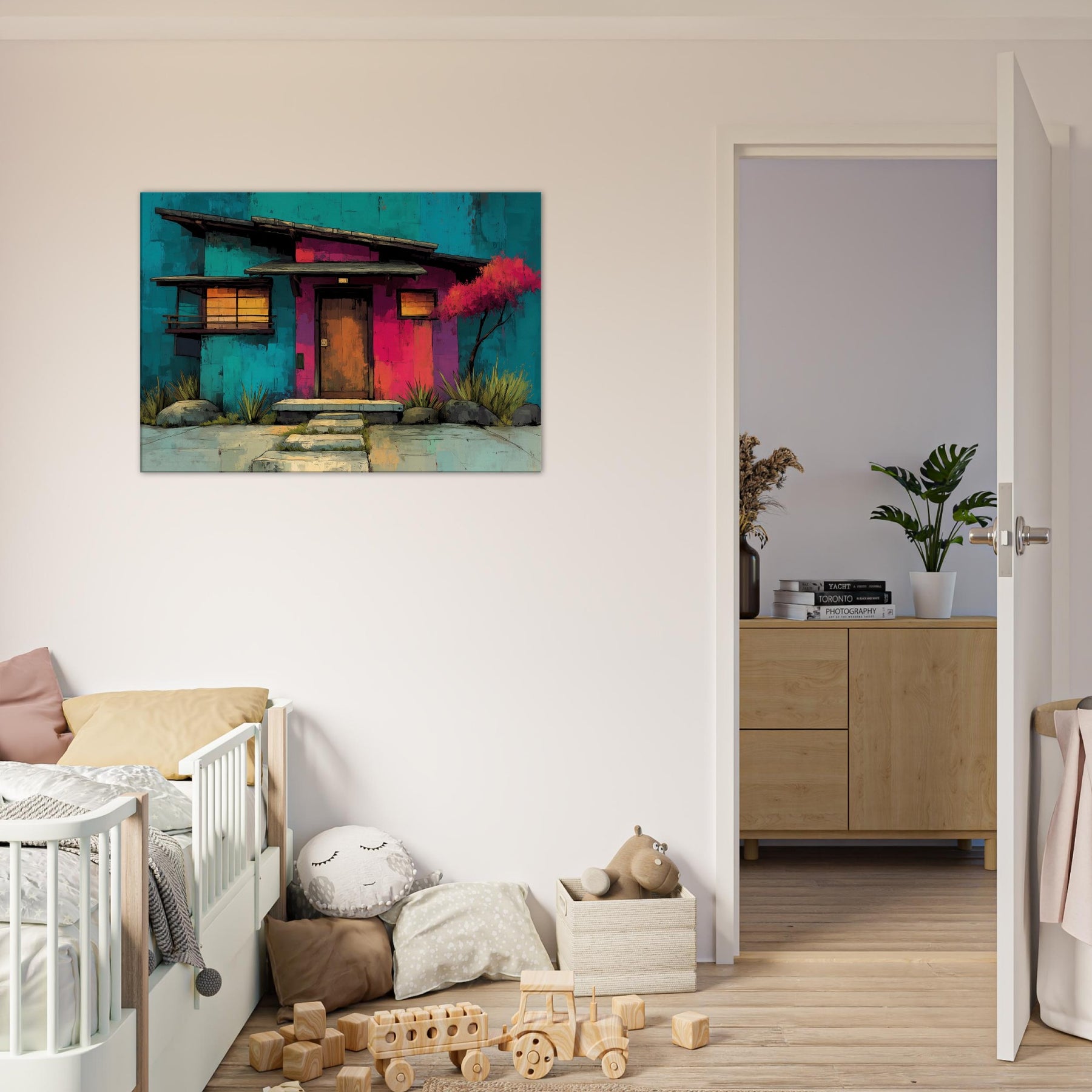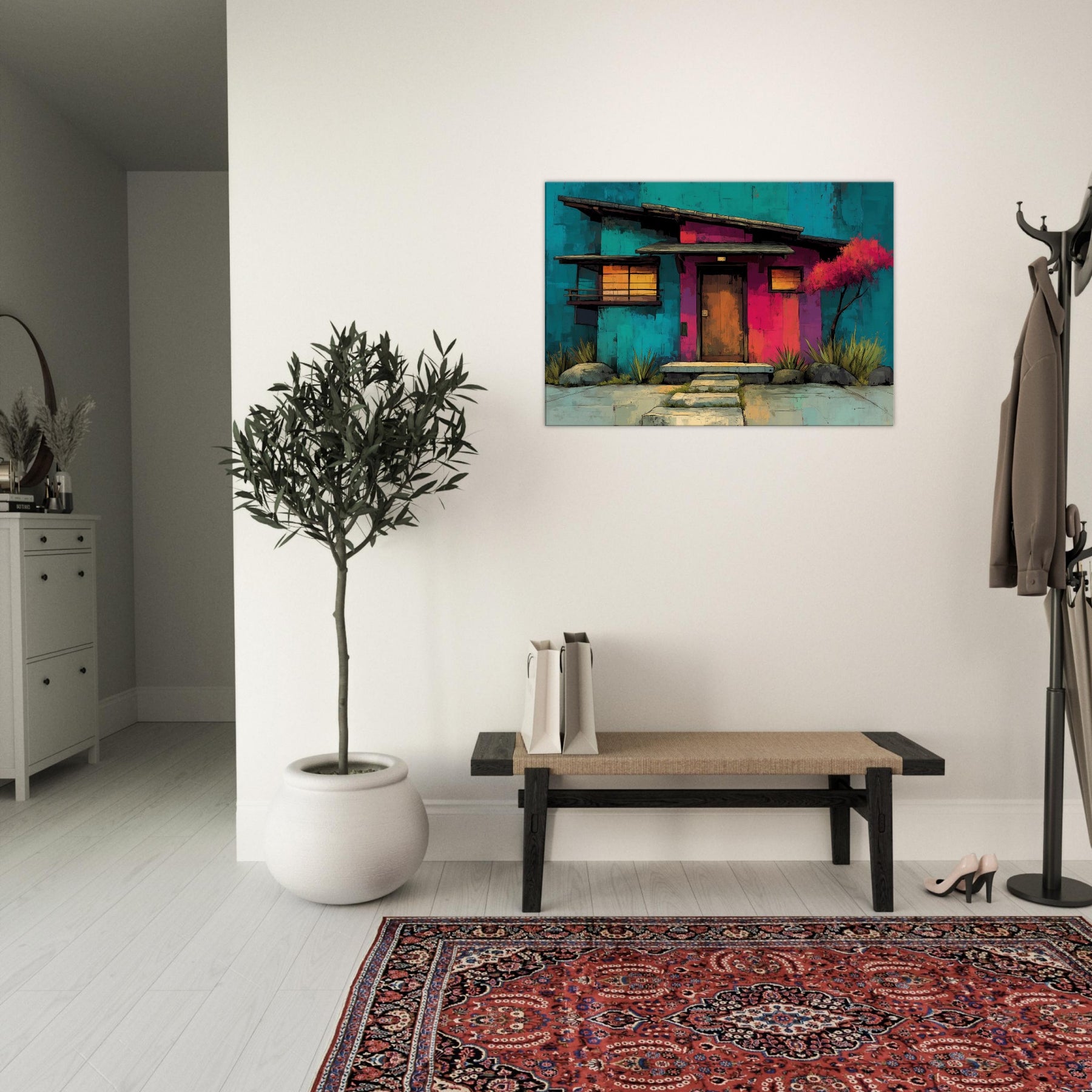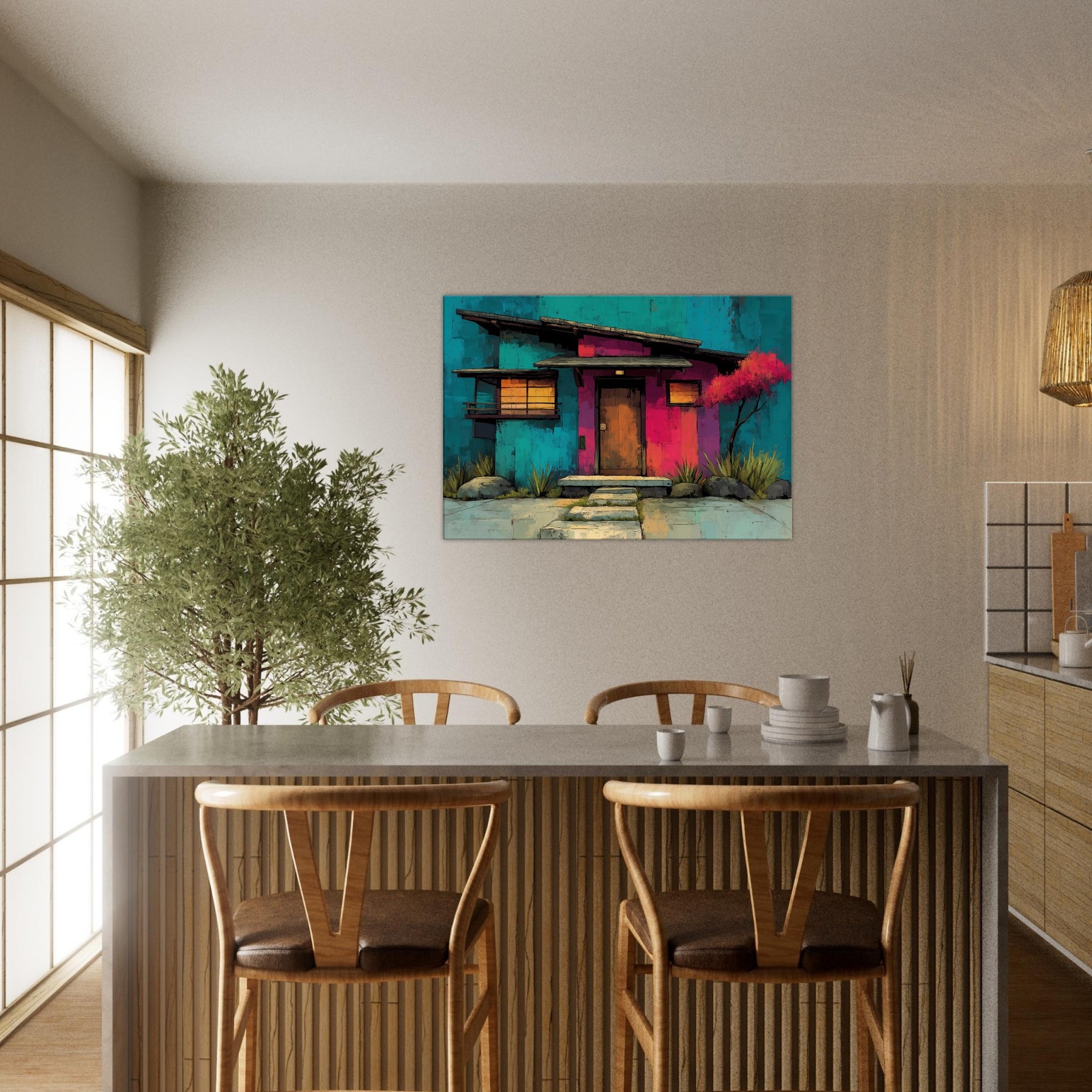 Step into a kinetic lullaby of color where Japanese Houses dissolve into luminous planes. This abstract depiction blends bold blocks with soft shadows, inviting warm light to spill across doors and windows. The teal façade, magenta entry, and amber glow fuse with desert grasses and stones, grounding the scene. Hung in a living room or entryway, it awakens the space with mood, texture, and a whisper of distant city streets.