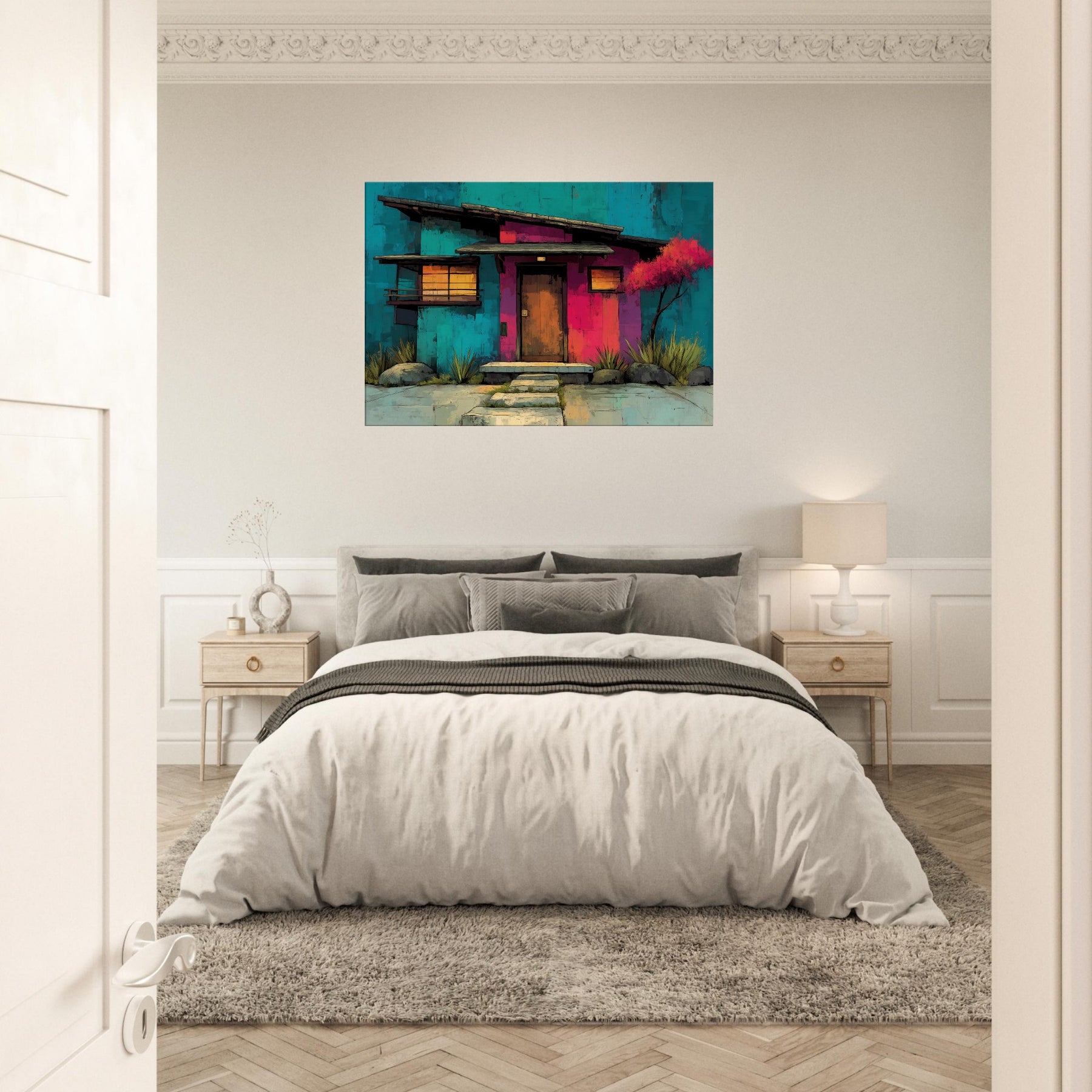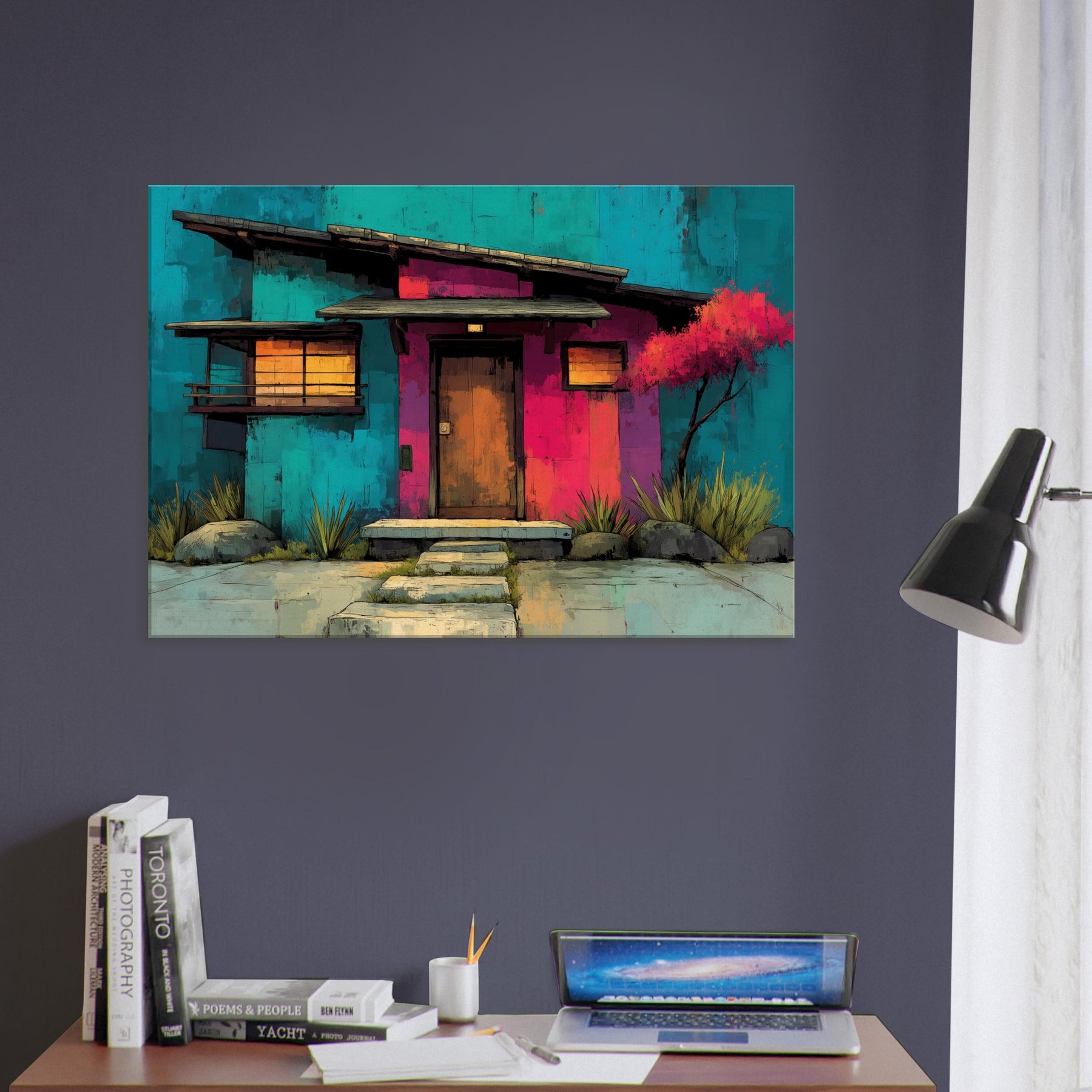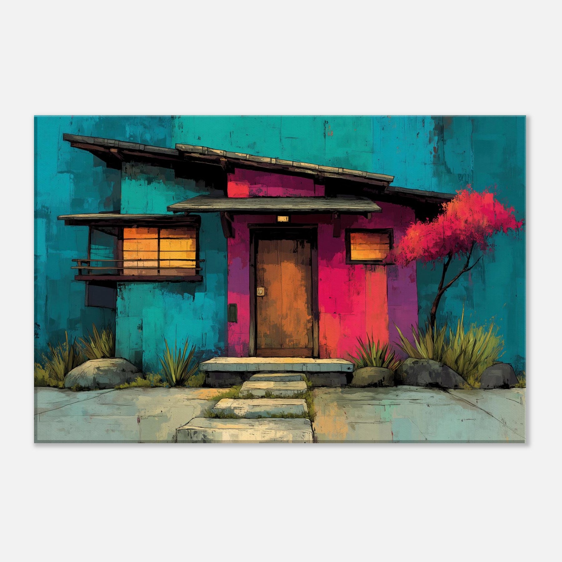 Step into a kinetic lullaby of color where Japanese Houses dissolve into luminous planes. This abstract depiction blends bold blocks with soft shadows, inviting warm light to spill across doors and windows. The teal façade, magenta entry, and amber glow fuse with desert grasses and stones, grounding the scene. Hung in a living room or entryway, it awakens the space with mood, texture, and a whisper of distant city streets.