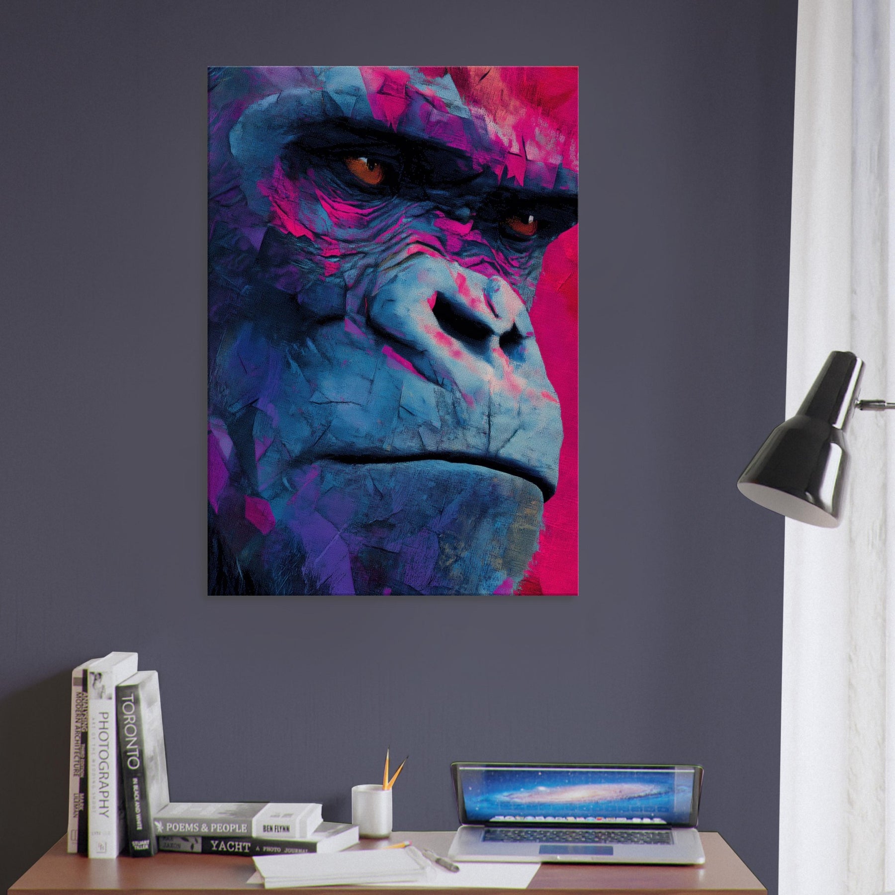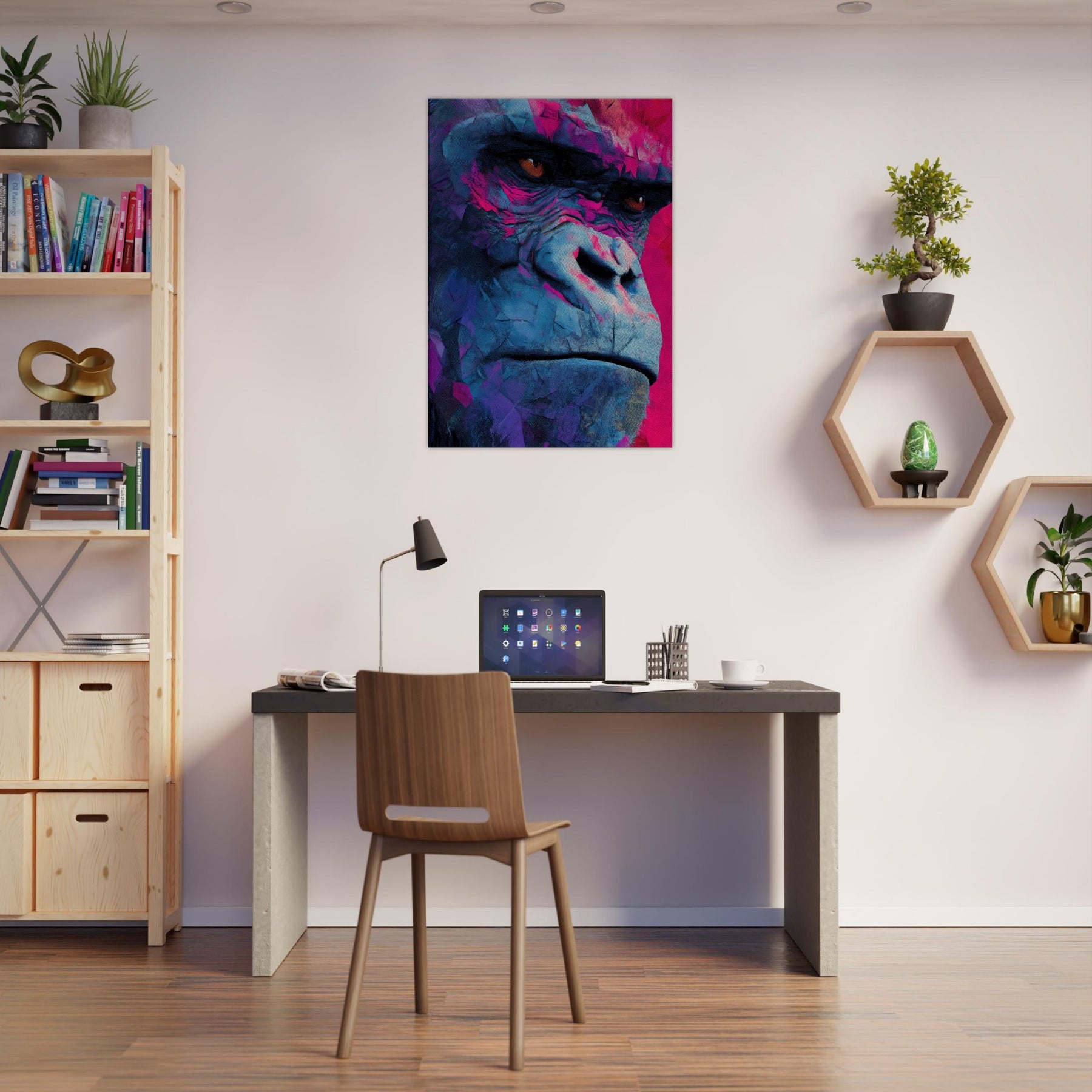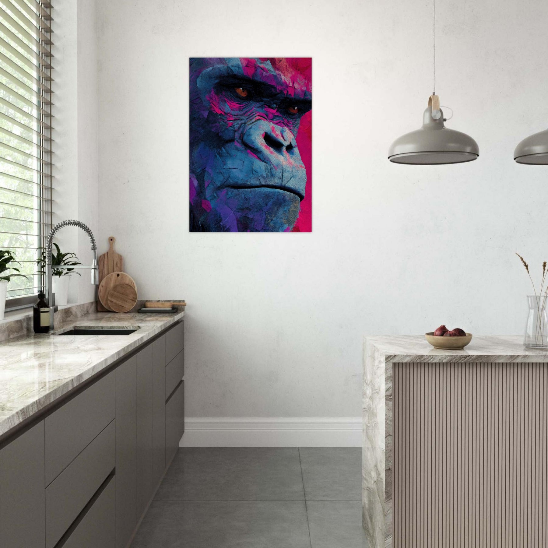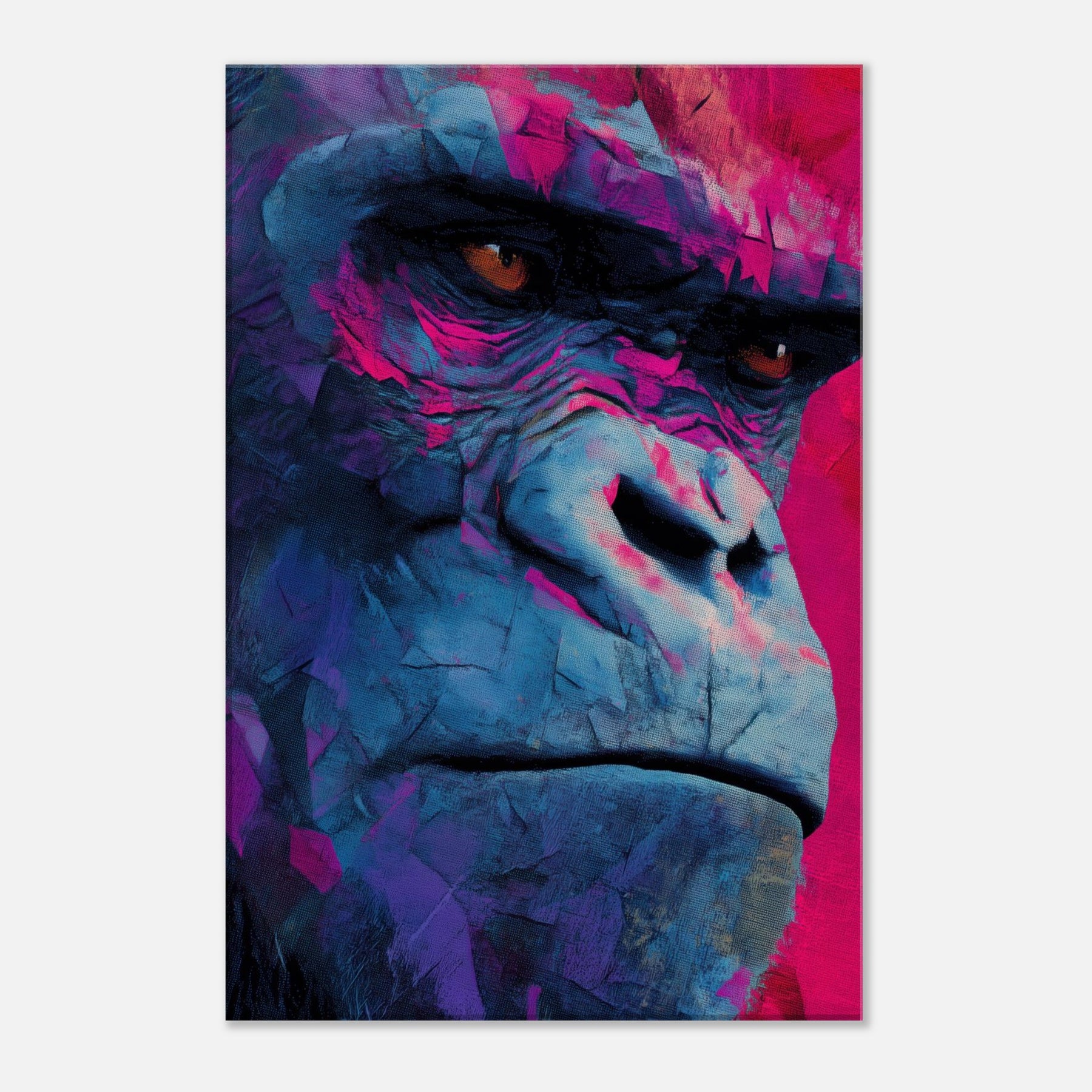 Rich with electric blues and magenta shadows, this abstract Monkey pulses with modern energy. The layered textures mimic weathered stone and wind swept surfaces, giving the subject a contemplative, almost meditative presence. Hanging in a living room or study, it invites the eye to linger, catching light and revealing new hues as you move. The piece balances playfulness with sophistication, turning everyday walls into a vibrant, intimate window into wild grace.