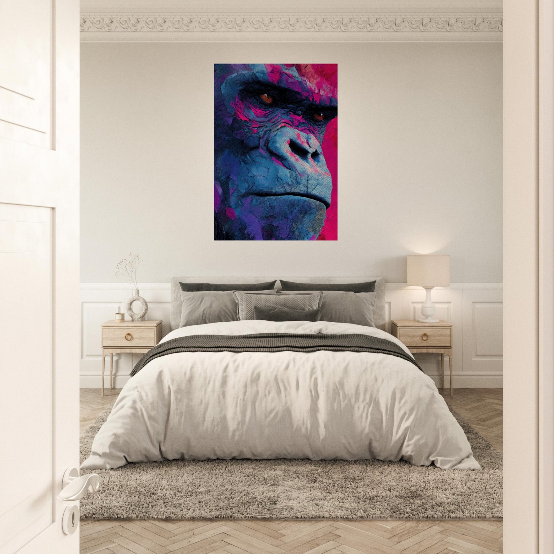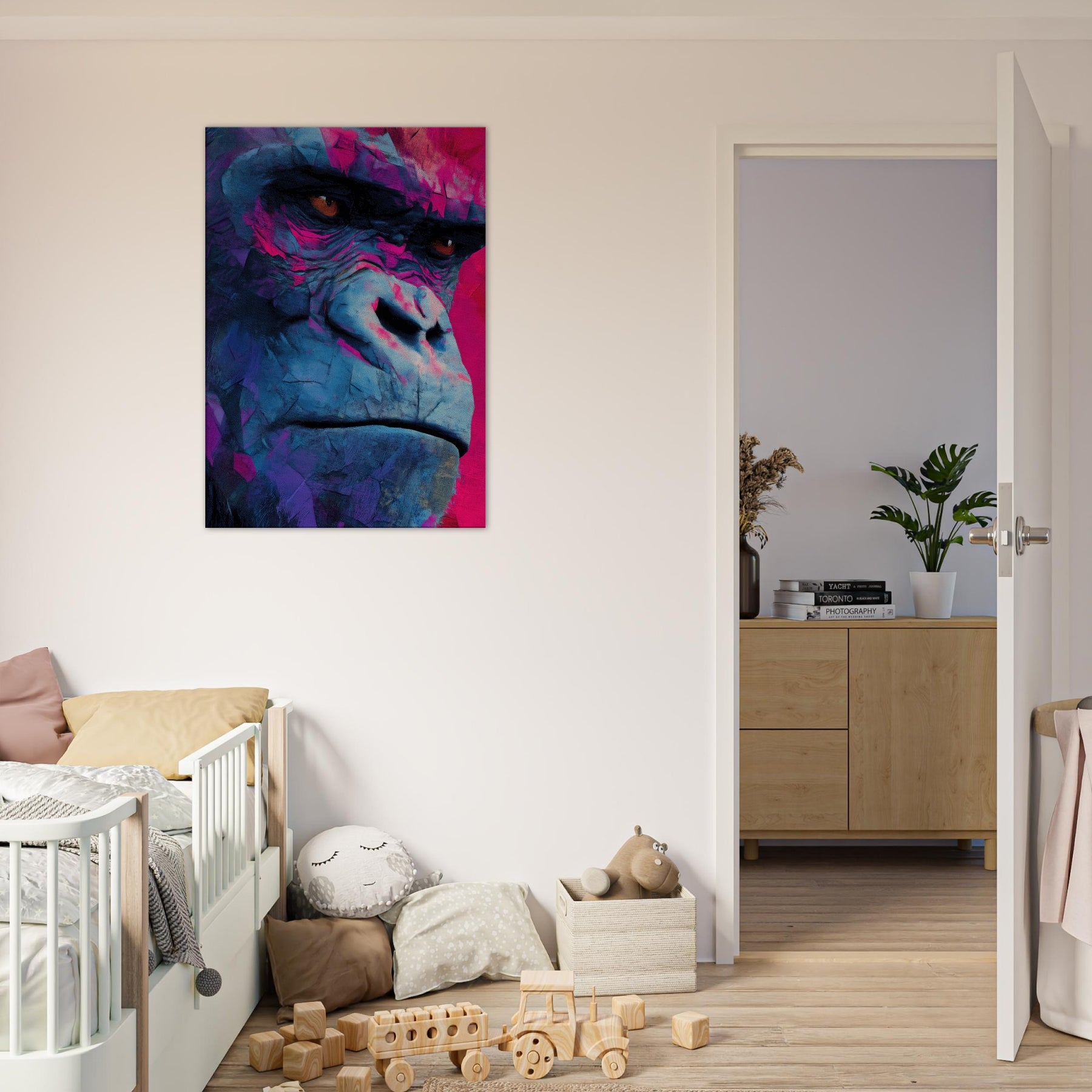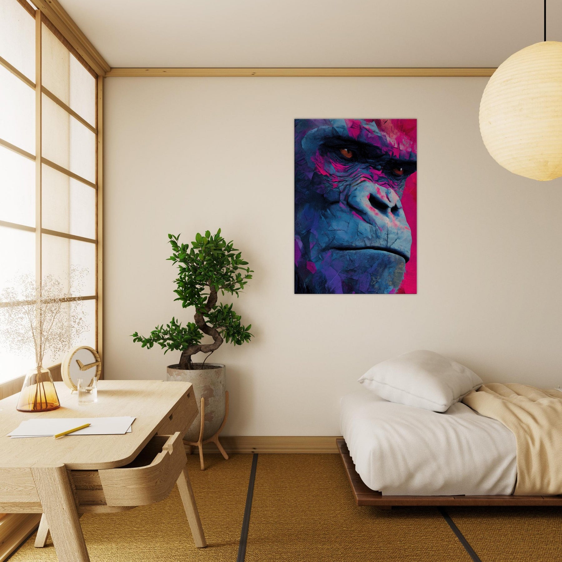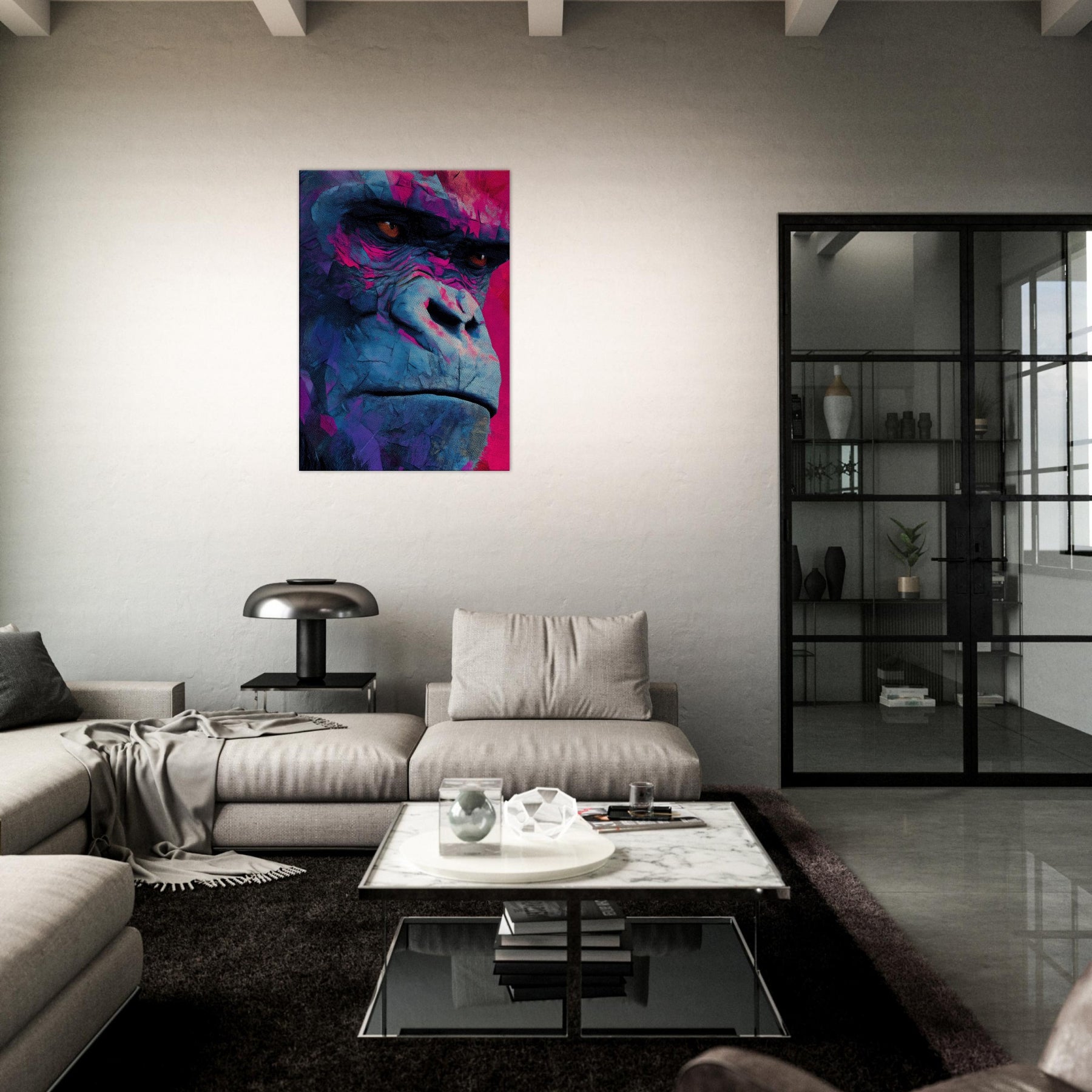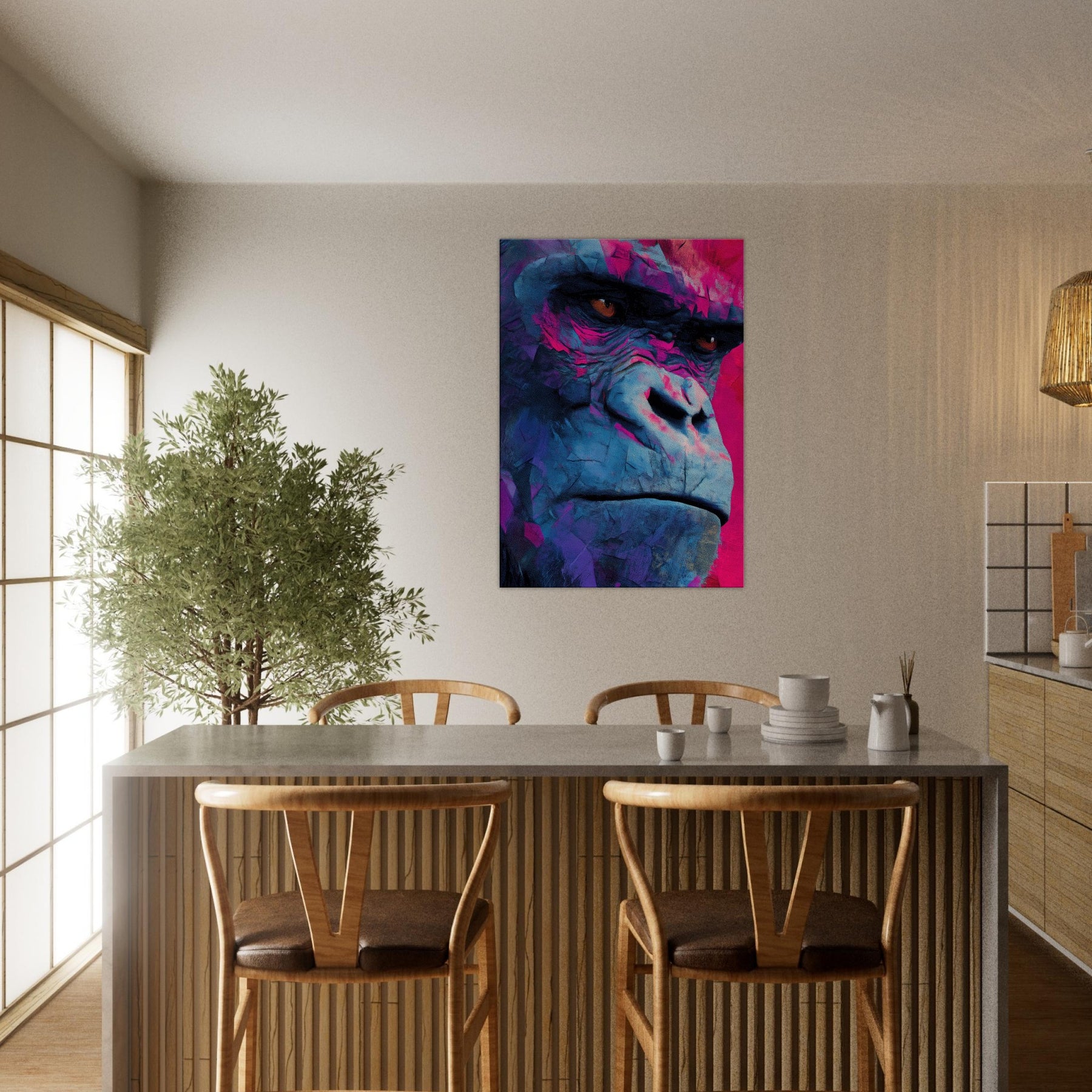 Rich with electric blues and magenta shadows, this abstract Monkey pulses with modern energy. The layered textures mimic weathered stone and wind swept surfaces, giving the subject a contemplative, almost meditative presence. Hanging in a living room or study, it invites the eye to linger, catching light and revealing new hues as you move. The piece balances playfulness with sophistication, turning everyday walls into a vibrant, intimate window into wild grace.