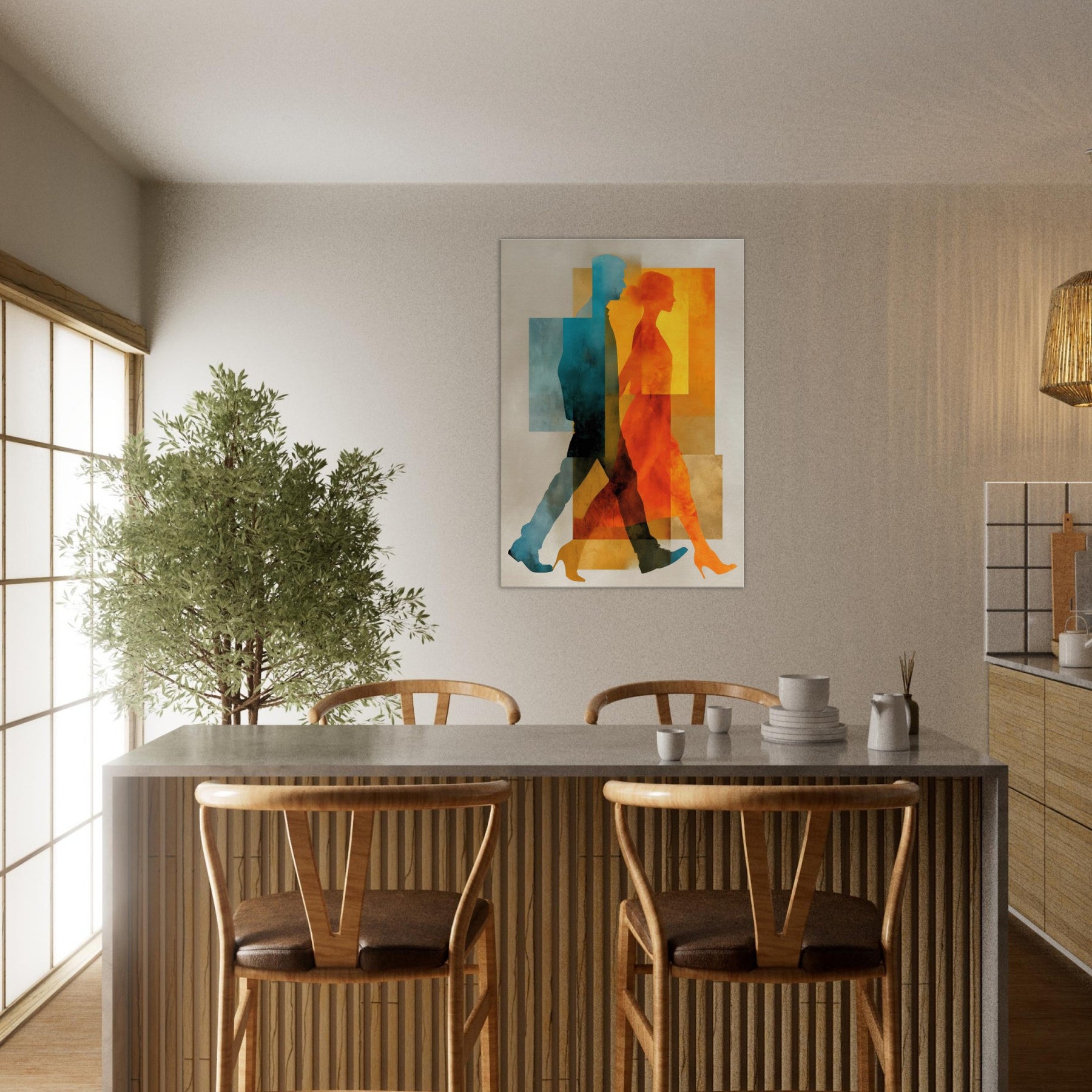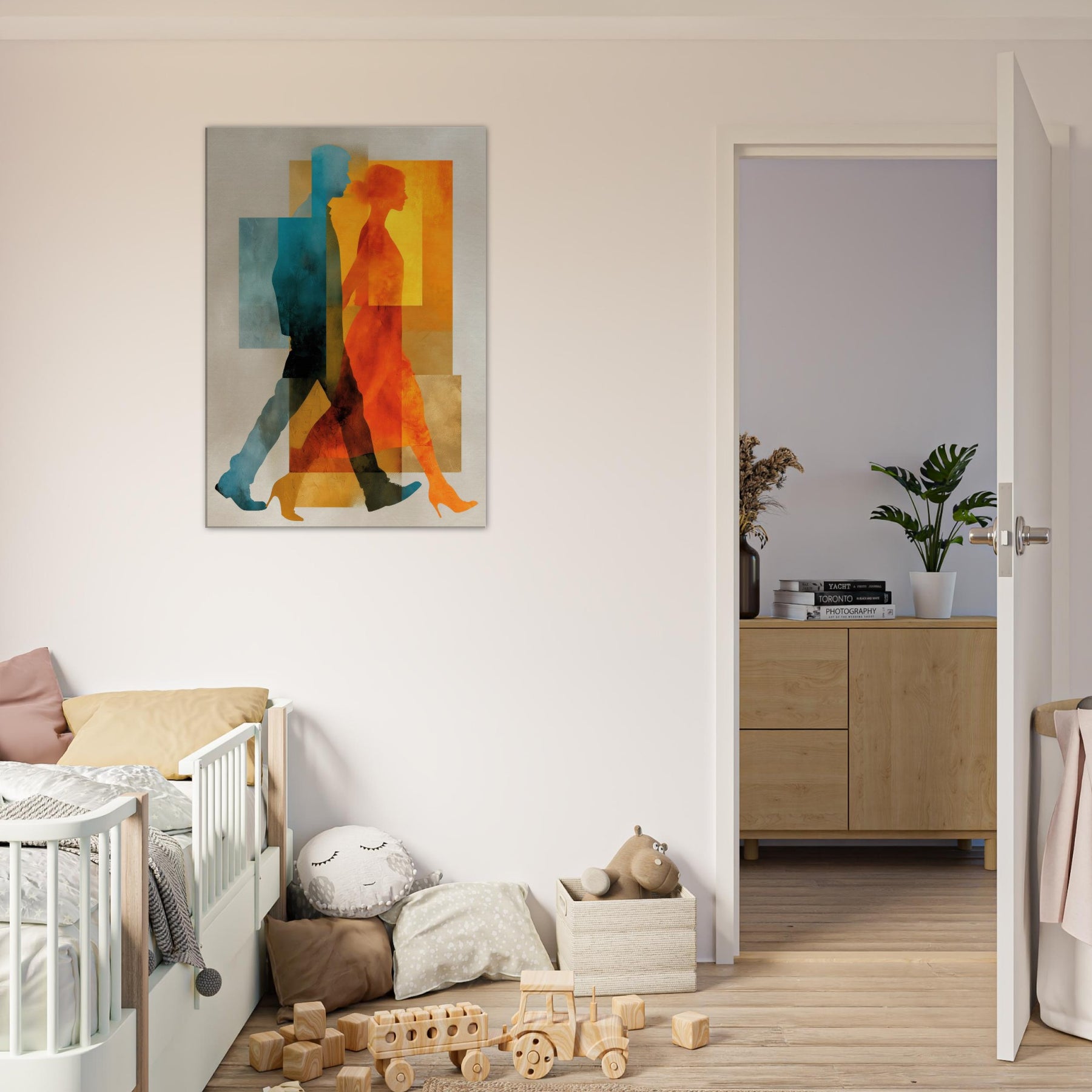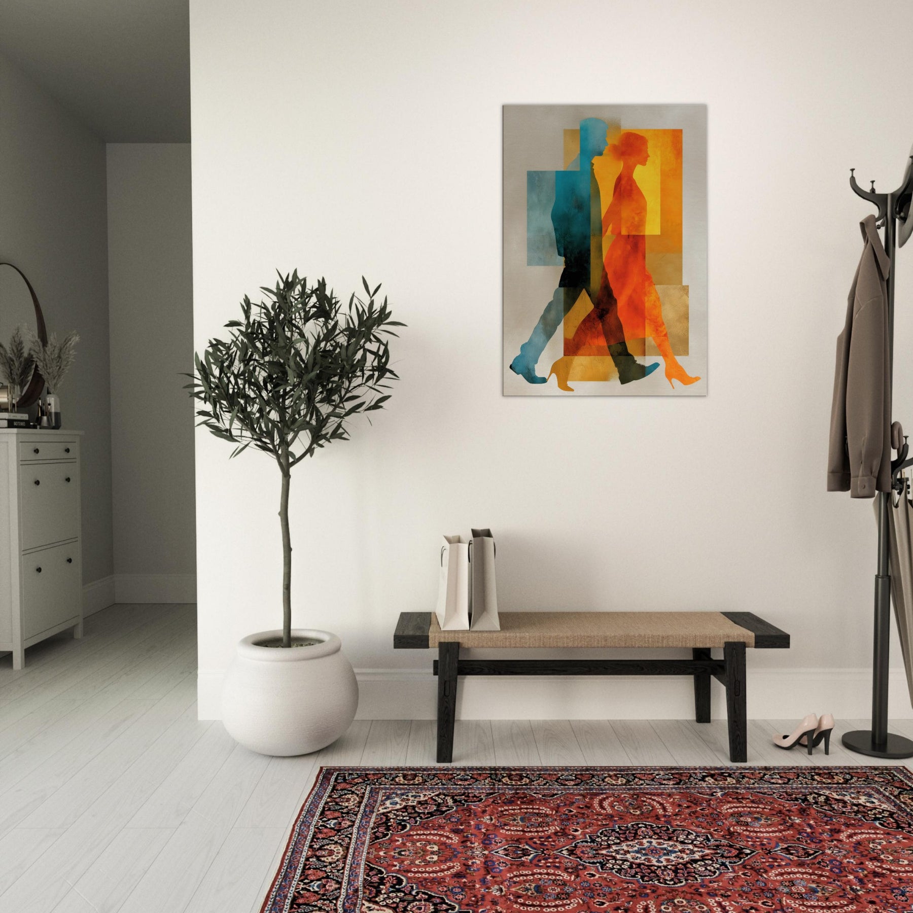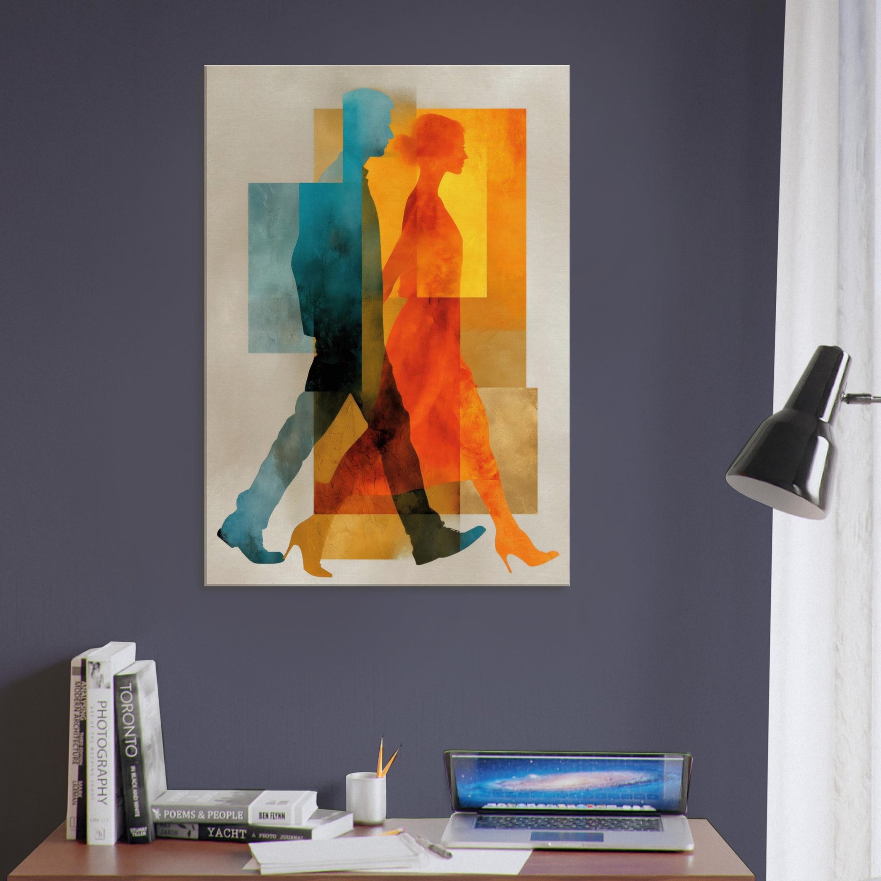 Couple Walking unfolds as a luminous study in motion and memory. Abstract planes of teal, ochre, and coral layer over the silhouettes of two figures, so their faces and bodies become a dance of light and shadow. The Primary Subject, the Couple Walking, strides through color that shifts with the room's mood: calm mornings or electric evenings. This evocative composition invites quiet reflection and intimate conversation, turning any wall into a warm, kinetic focal point for daily life.