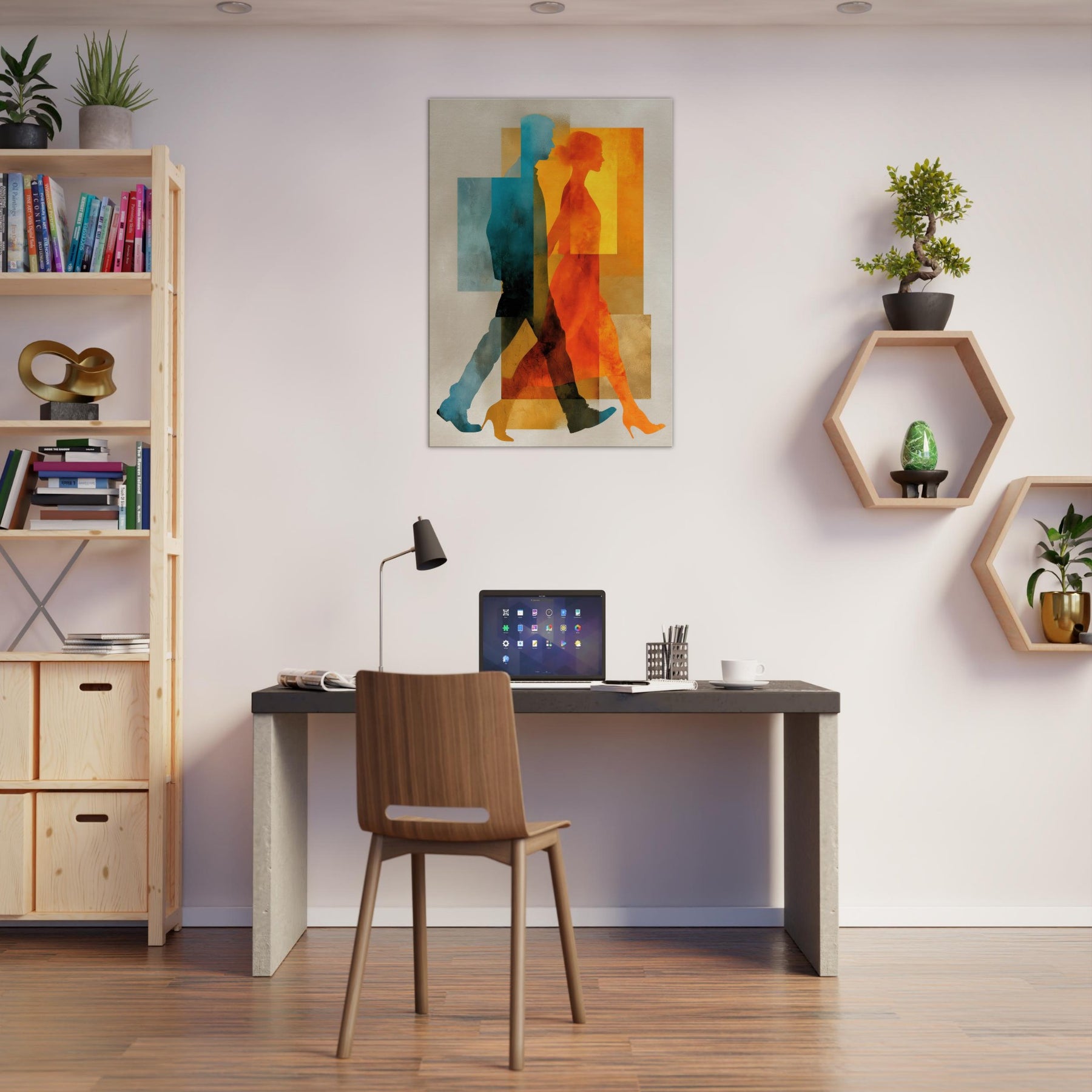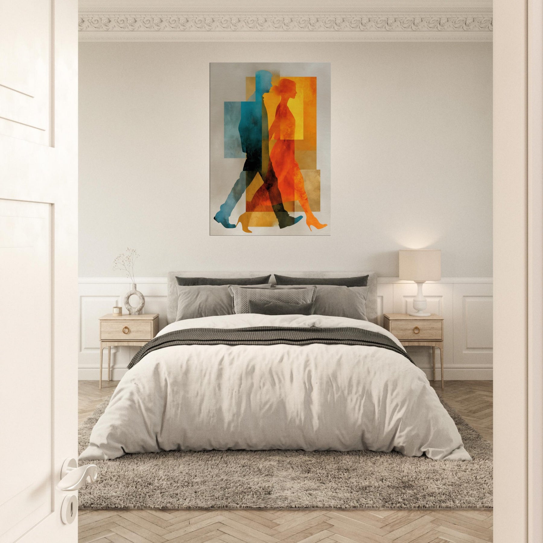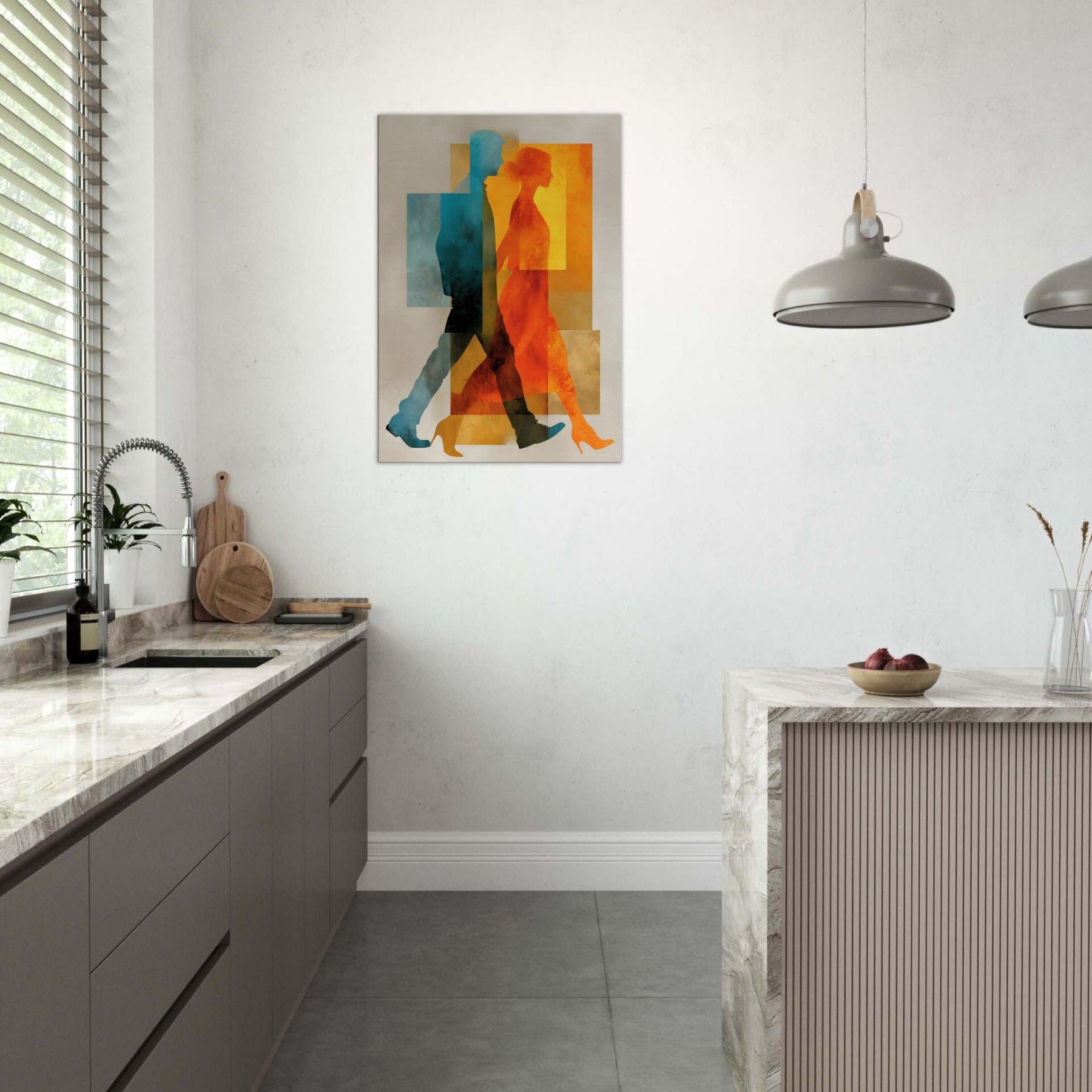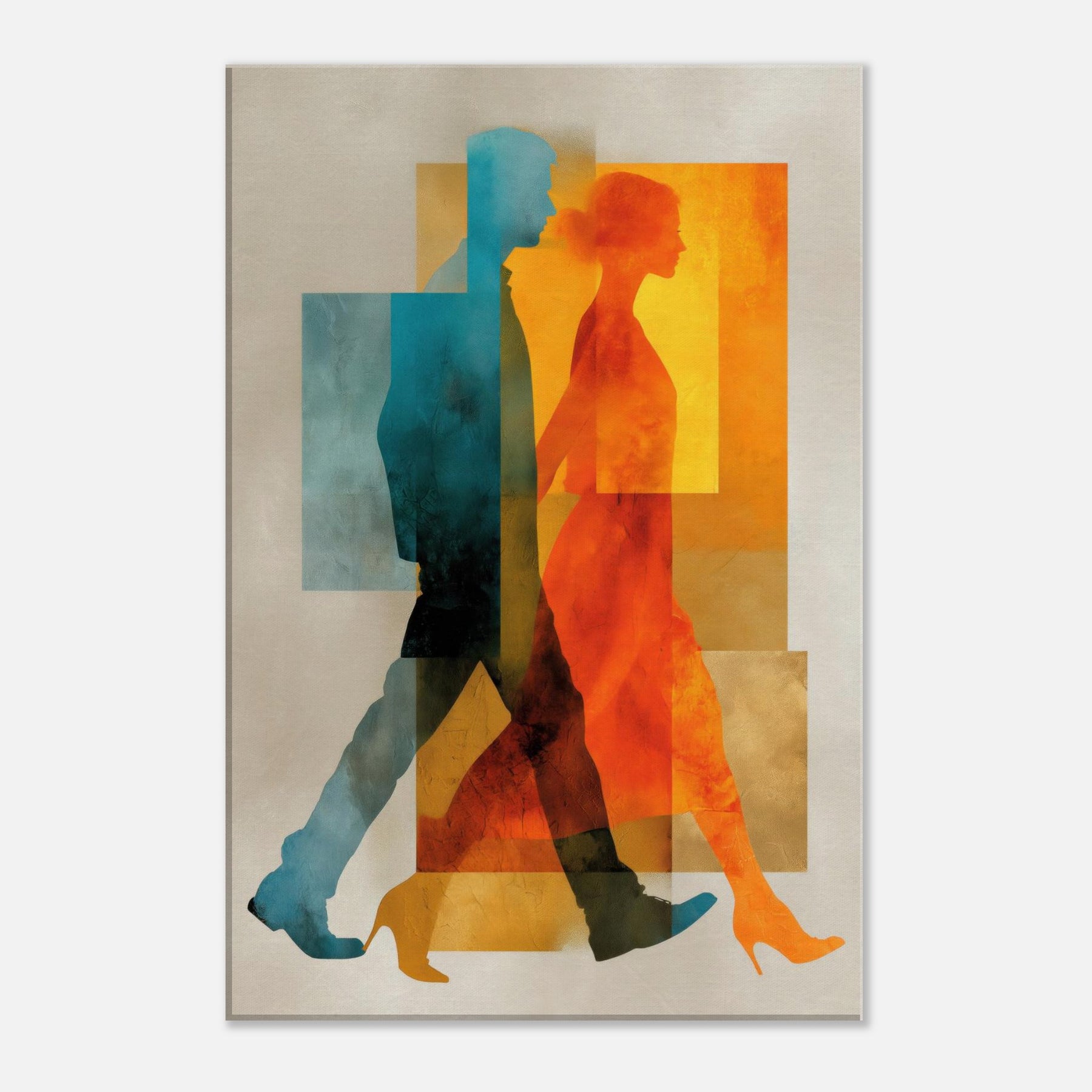Couple Walking unfolds as a luminous study in motion and memory. Abstract planes of teal, ochre, and coral layer over the silhouettes of two figures, so their faces and bodies become a dance of light and shadow. The Primary Subject, the Couple Walking, strides through color that shifts with the room's mood: calm mornings or electric evenings. This evocative composition invites quiet reflection and intimate conversation, turning any wall into a warm, kinetic focal point for daily life.