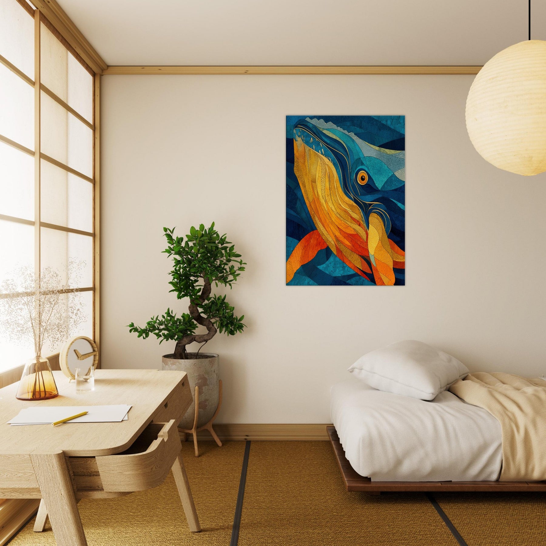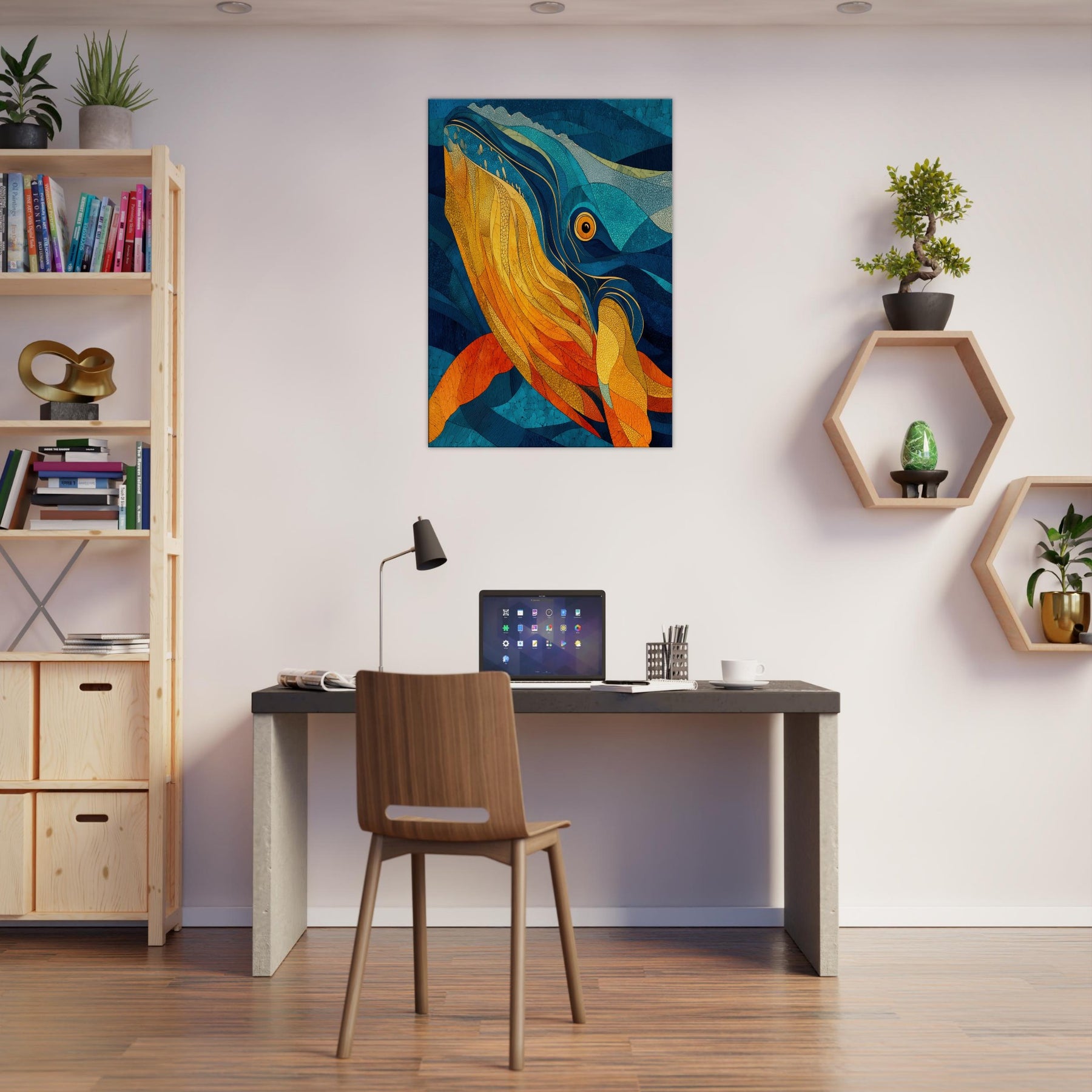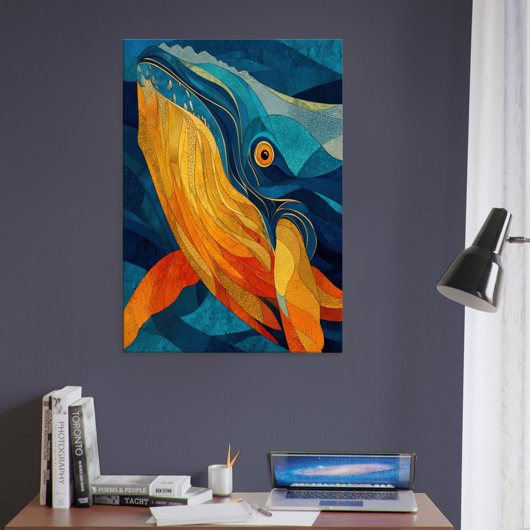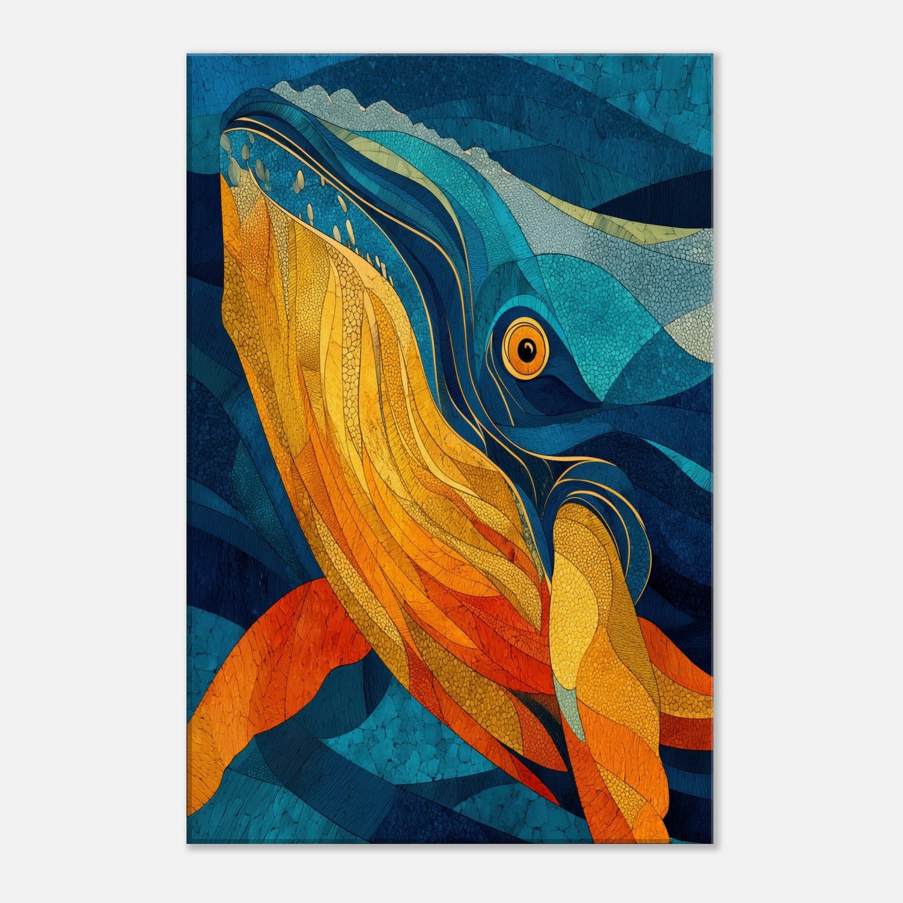 Immerse your space in tidal color with this Whale inspired abstract study. It unfurls like a sea breeze vibrant golds and molten ambers ripple against deep ocean blues, evoking the whale's graceful ascent and the ocean's quiet pulse. This piece folds sunlight into water, creating a warm, cinematic glow that elevates a living room or bedroom. The layered textures invite slow gaze, turning walls into a sanctuary where calm, wonder, and conductor like rhythm mingle.