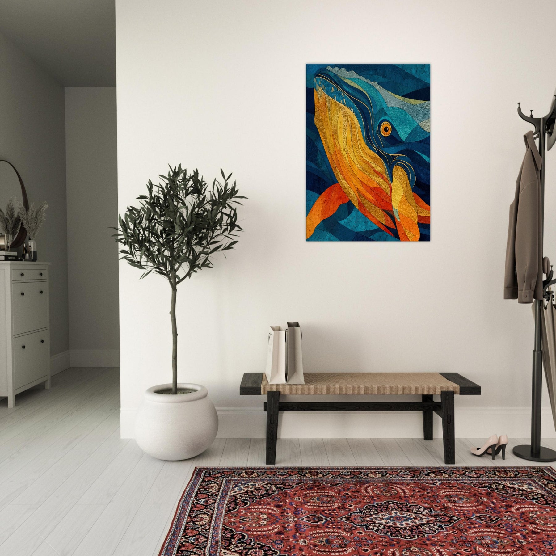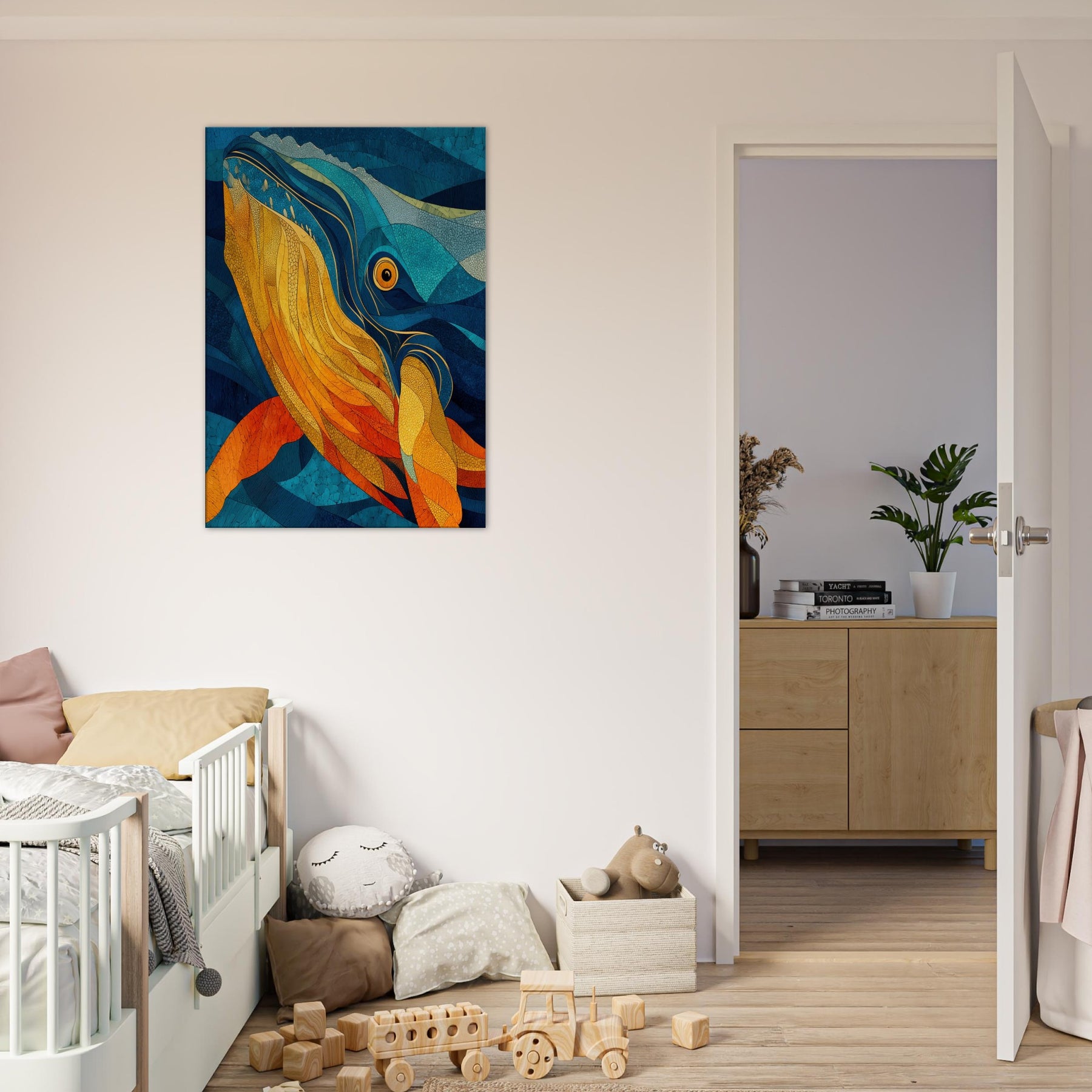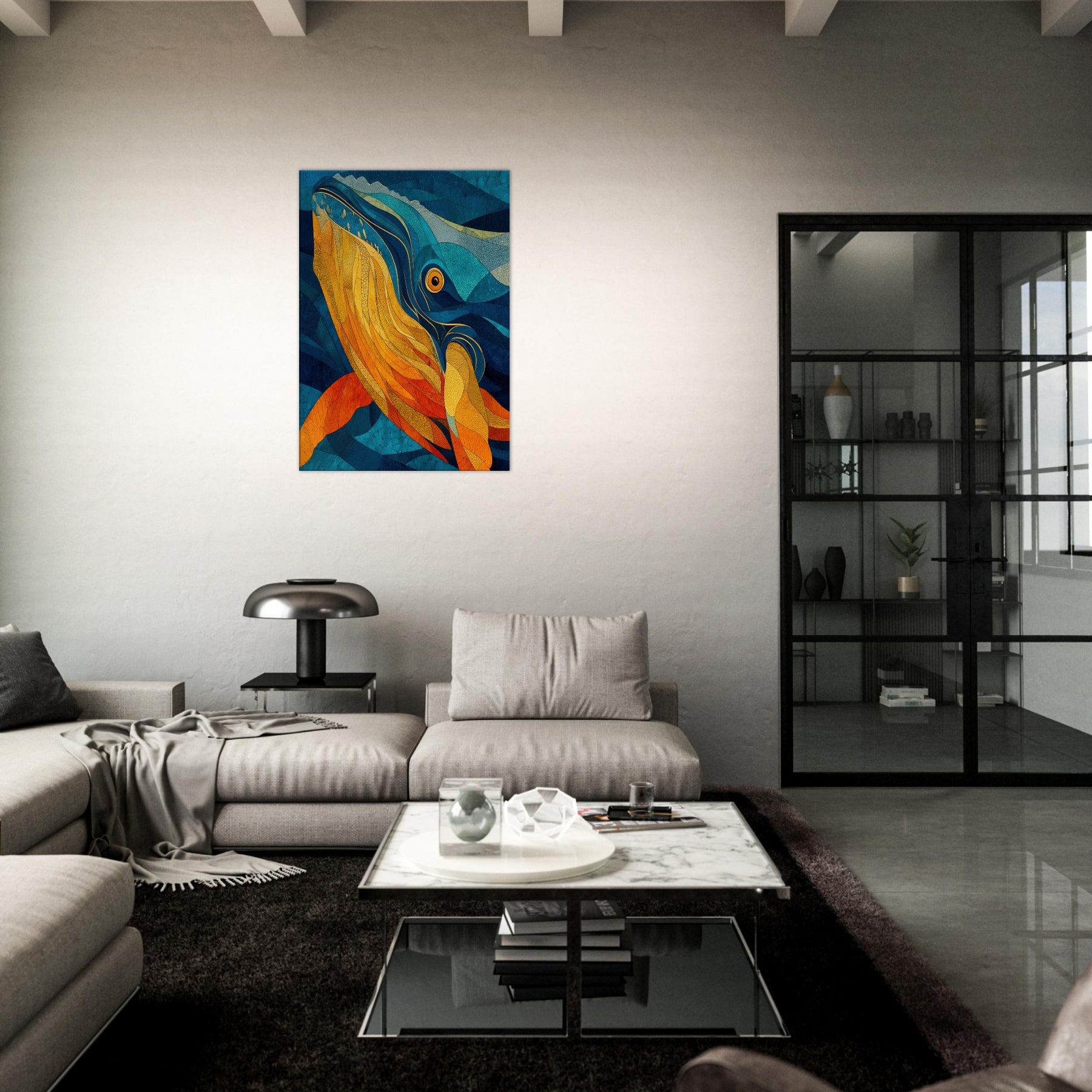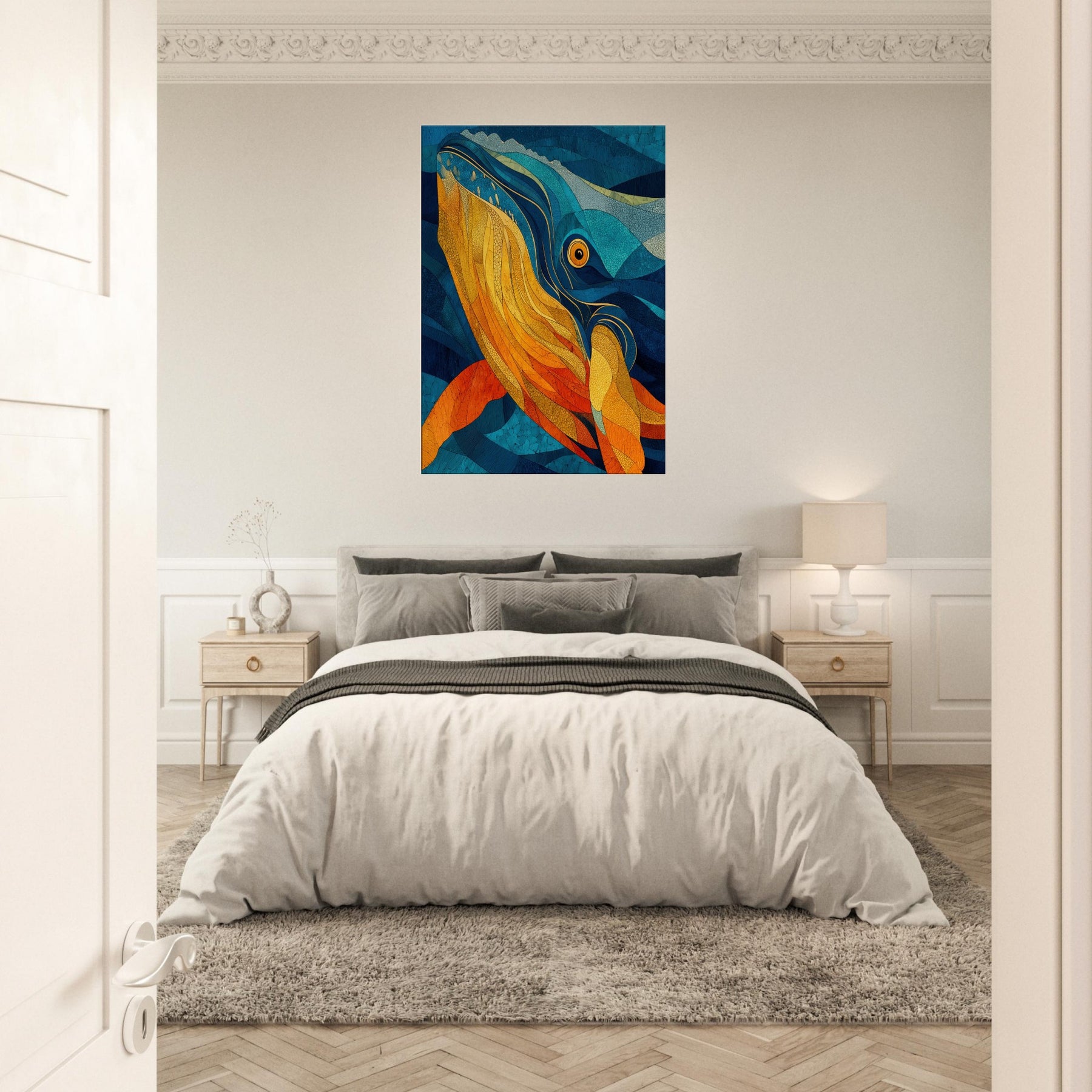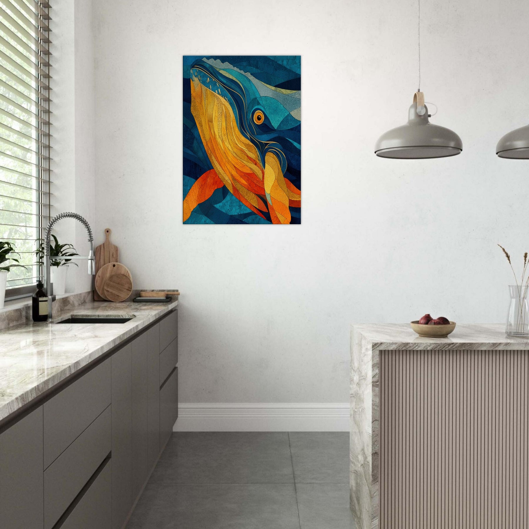 Immerse your space in tidal color with this Whale inspired abstract study. It unfurls like a sea breeze vibrant golds and molten ambers ripple against deep ocean blues, evoking the whale's graceful ascent and the ocean's quiet pulse. This piece folds sunlight into water, creating a warm, cinematic glow that elevates a living room or bedroom. The layered textures invite slow gaze, turning walls into a sanctuary where calm, wonder, and conductor like rhythm mingle.