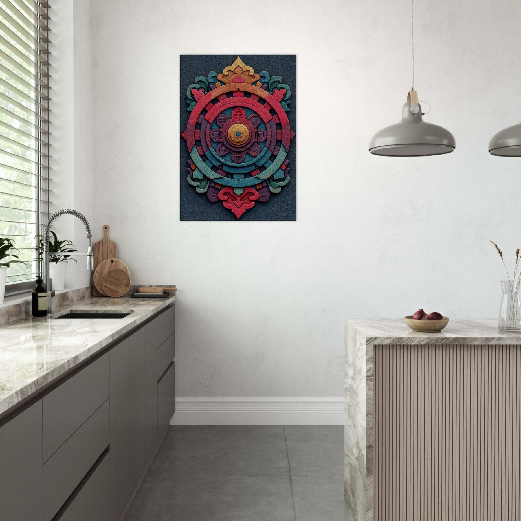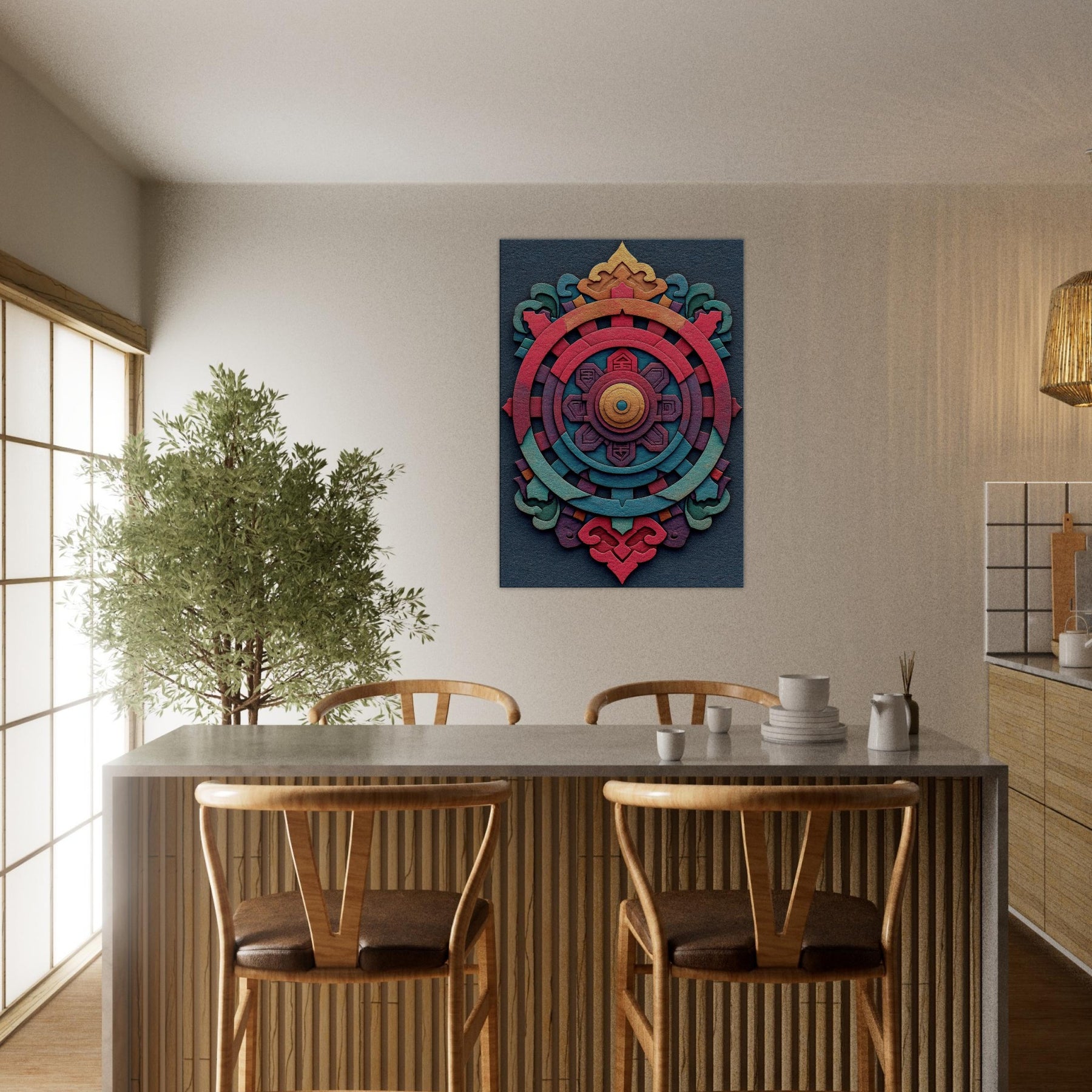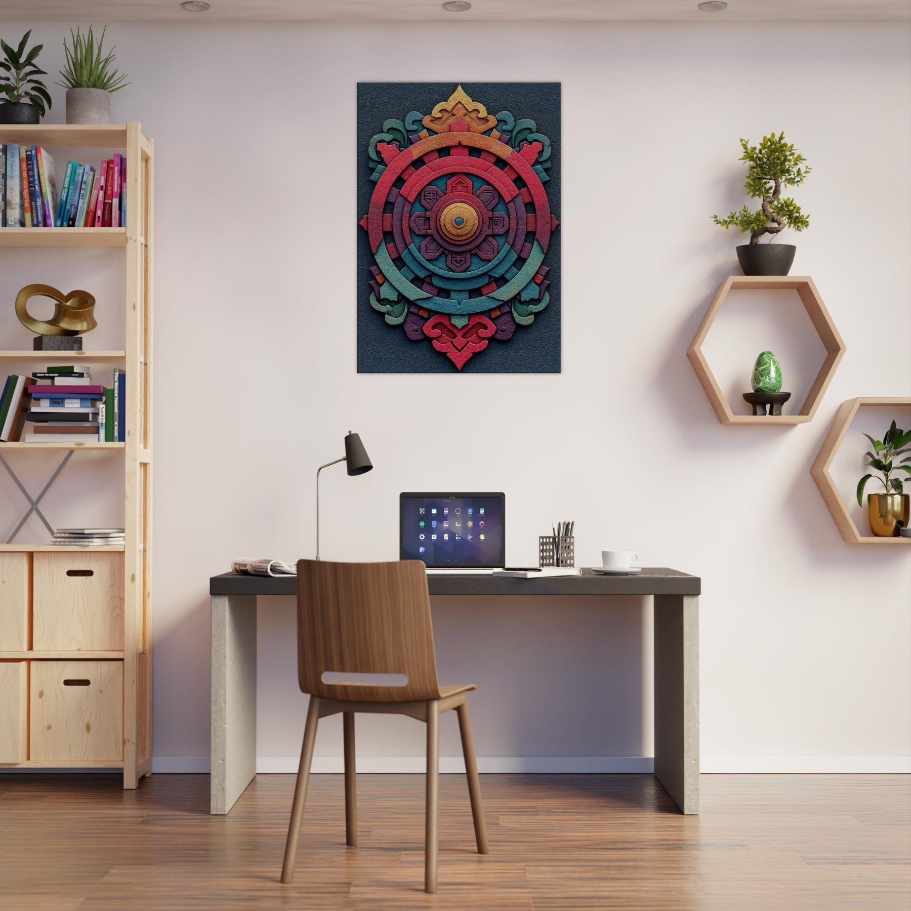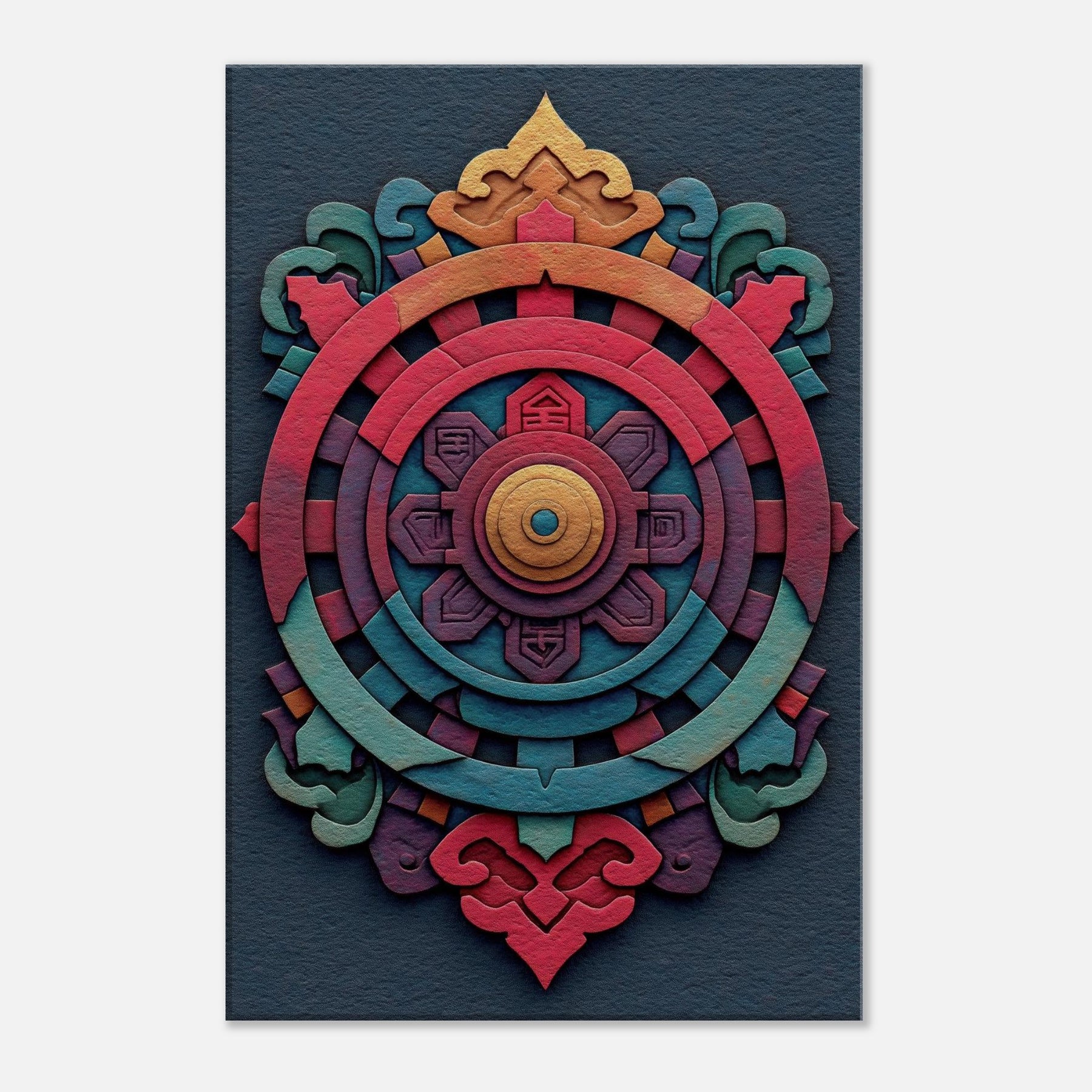 An evocative meditation in color, this Dharma Wheel (Dharmachakra) unfolds as concentric rings of ember, coral, teal, and gold. The abstract design breathes a mysterious, mystical energy, inviting quiet contemplation as light shifts across its layered textures. Hang it to anchor a living room or study with a sense of balance and warmth the wheel turning gently between memory and possibility, a palpable invitation to pause, breathe, and awaken the space.