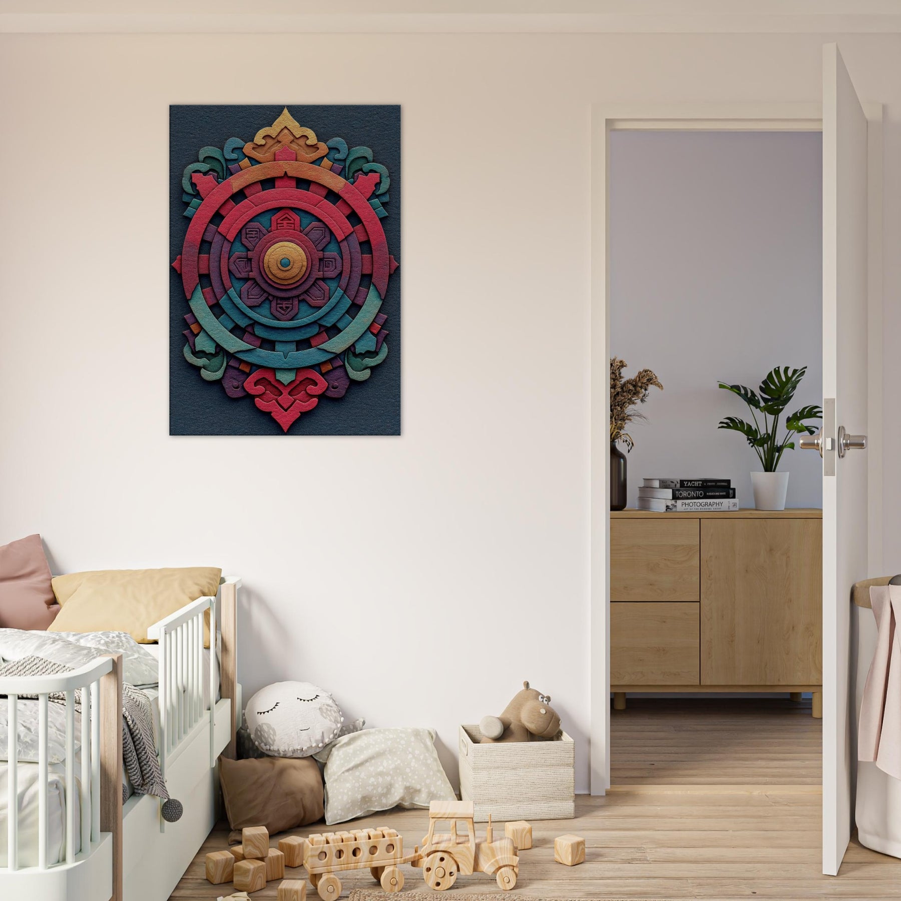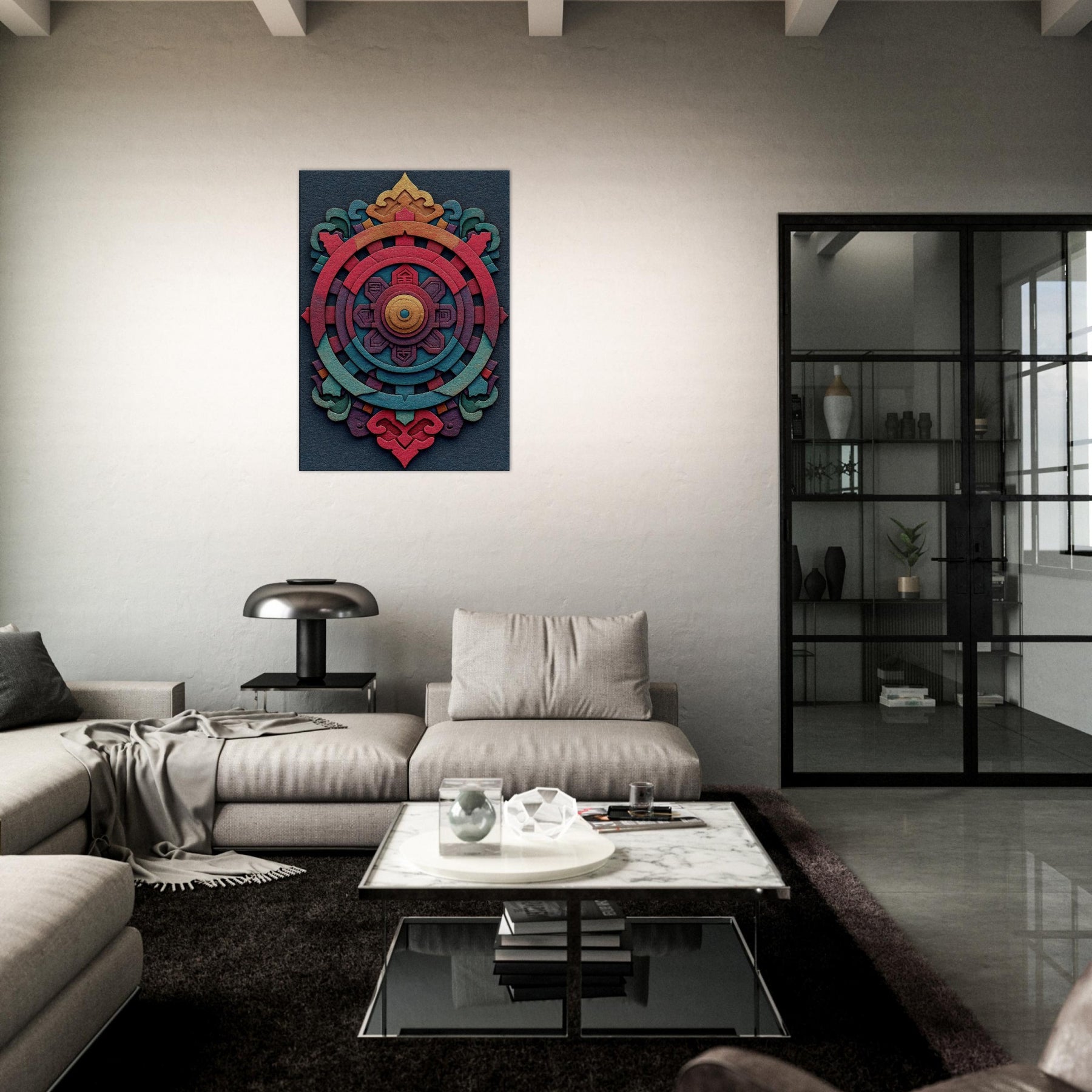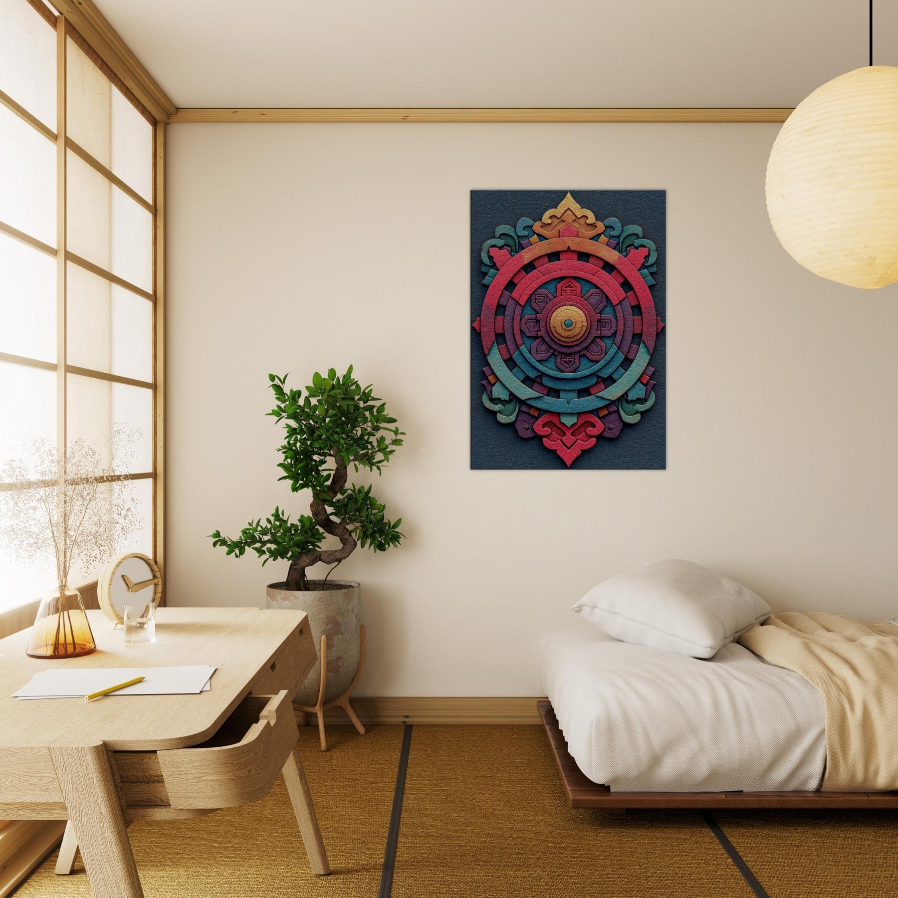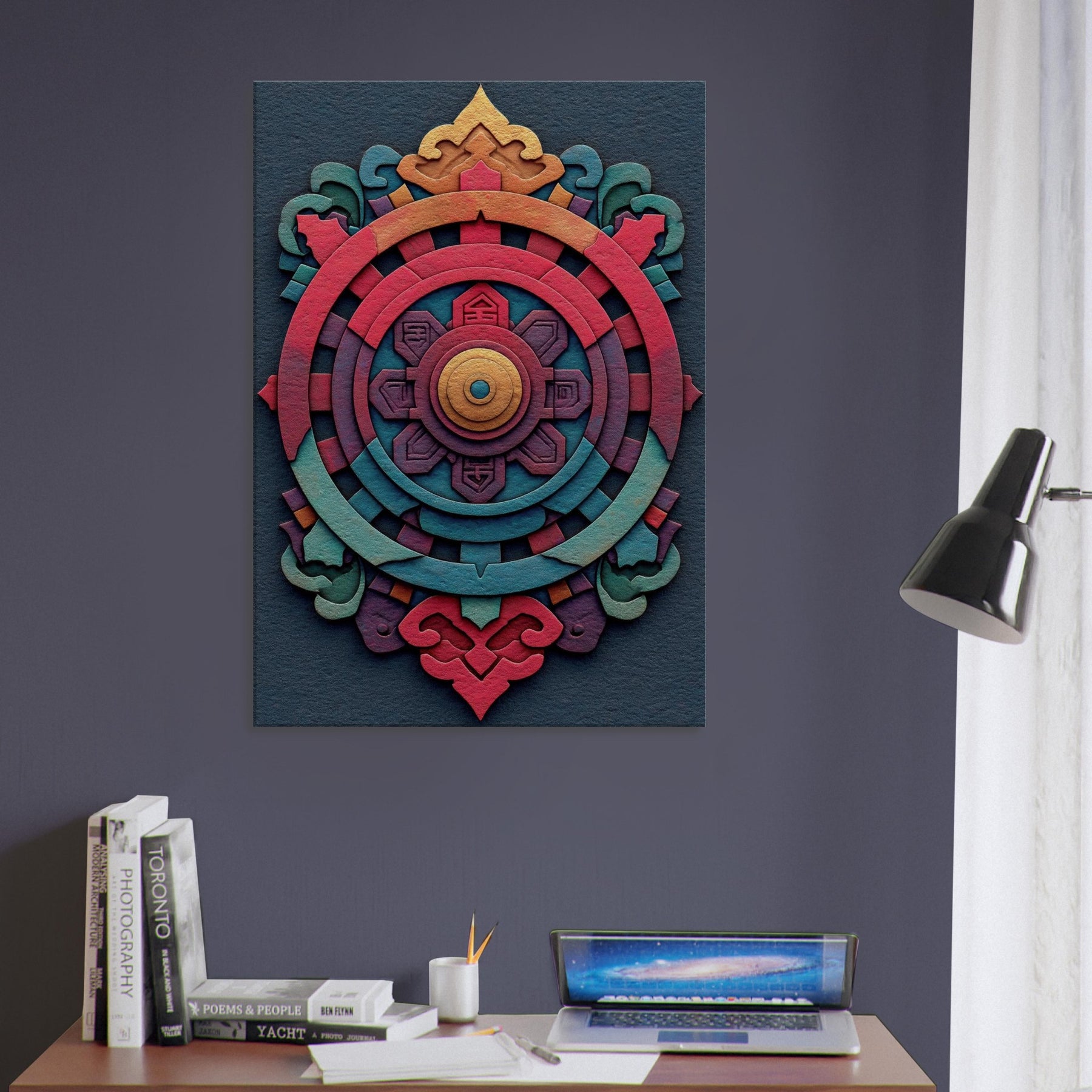 An evocative meditation in color, this Dharma Wheel (Dharmachakra) unfolds as concentric rings of ember, coral, teal, and gold. The abstract design breathes a mysterious, mystical energy, inviting quiet contemplation as light shifts across its layered textures. Hang it to anchor a living room or study with a sense of balance and warmth the wheel turning gently between memory and possibility, a palpable invitation to pause, breathe, and awaken the space.