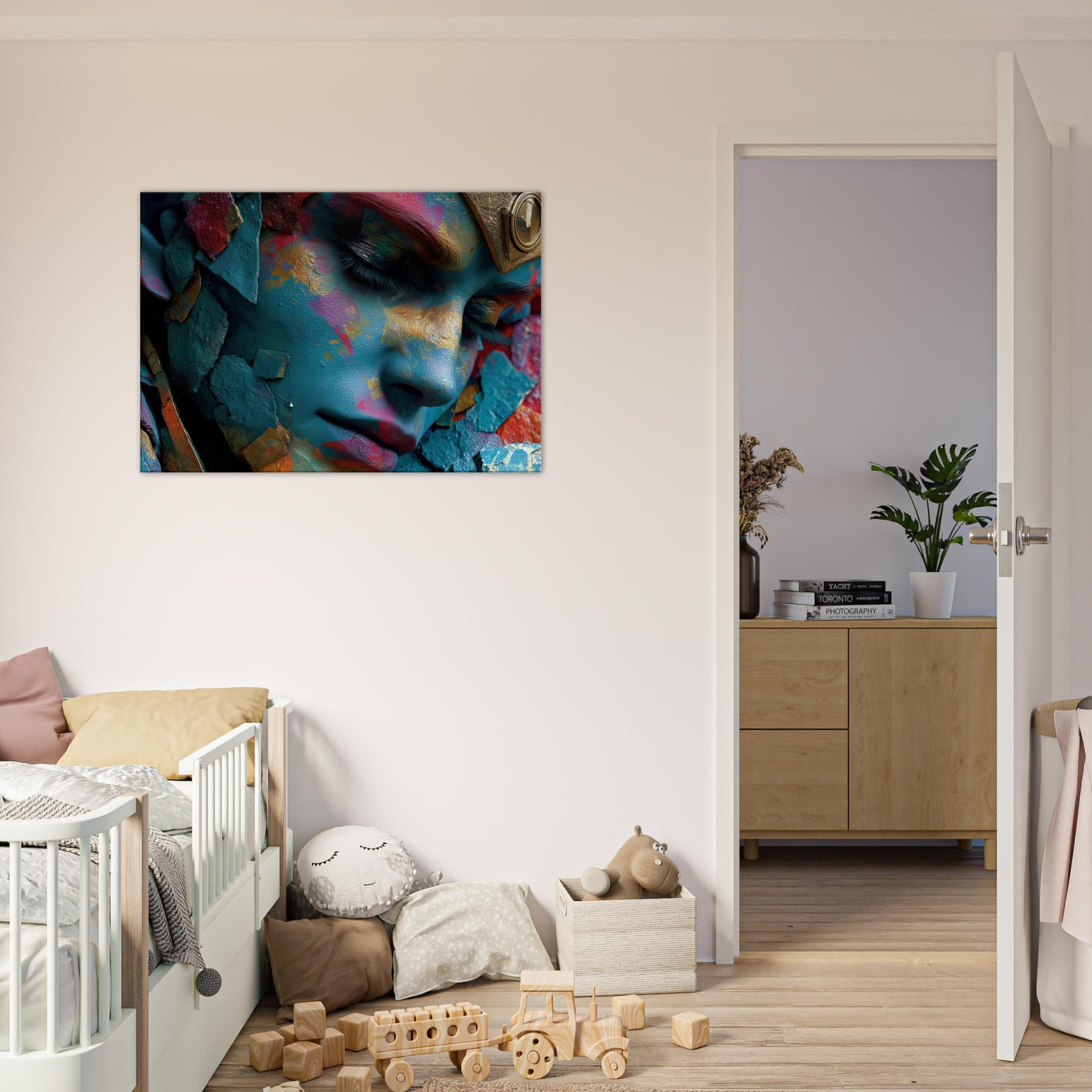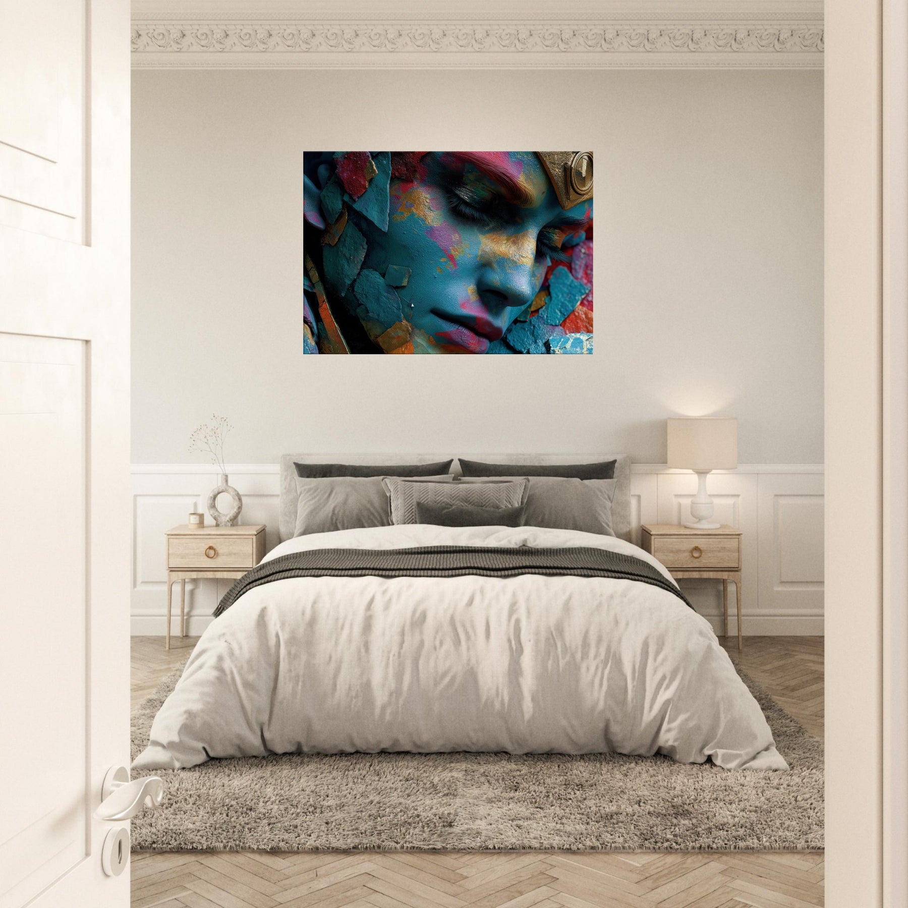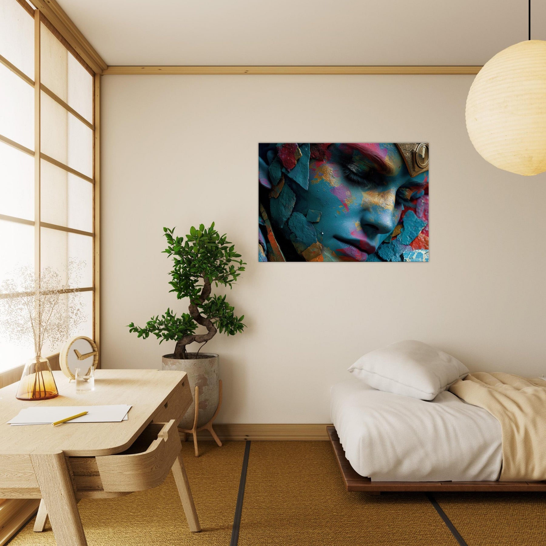 Mystical Elf drifts between dream and daylight in a cascade of color and light. This abstract dissolves into turquoise shards, gold specks, and pink hints that catch the room's glow and refract a quiet, otherworldly energy. The ethereal profile invites introspection, while the luminous skin and delicate lashes evoke grace and wonder. Place it over a sofa or mantel to awaken imagination, soften edges, and transform everyday spaces into a mythical sanctuary of calm, creativity, and refined sophistication.