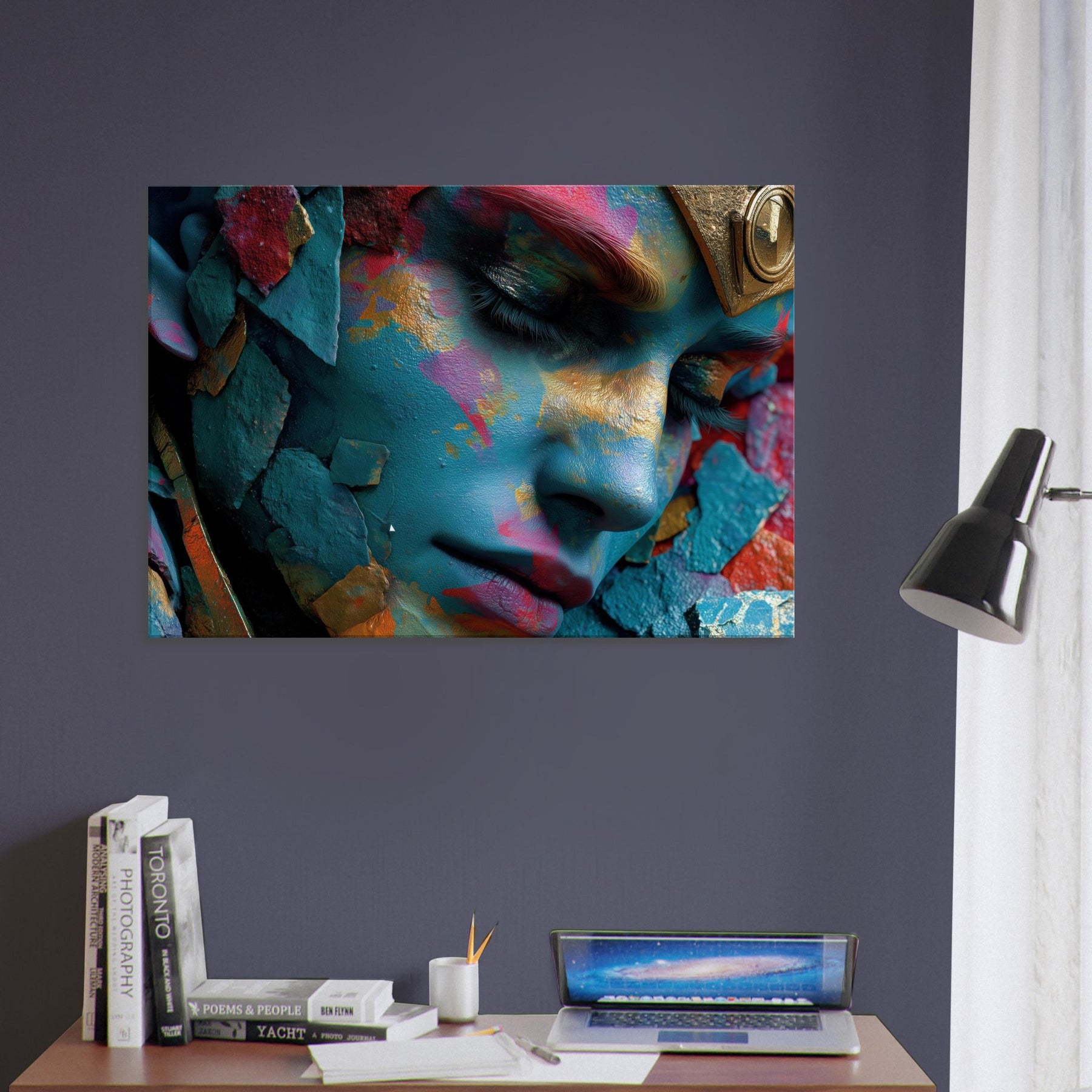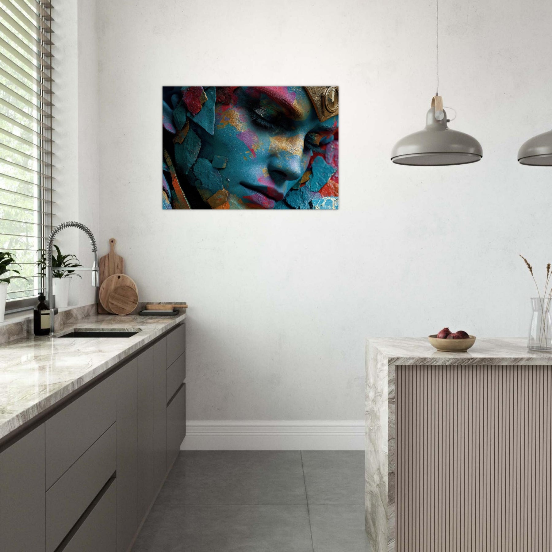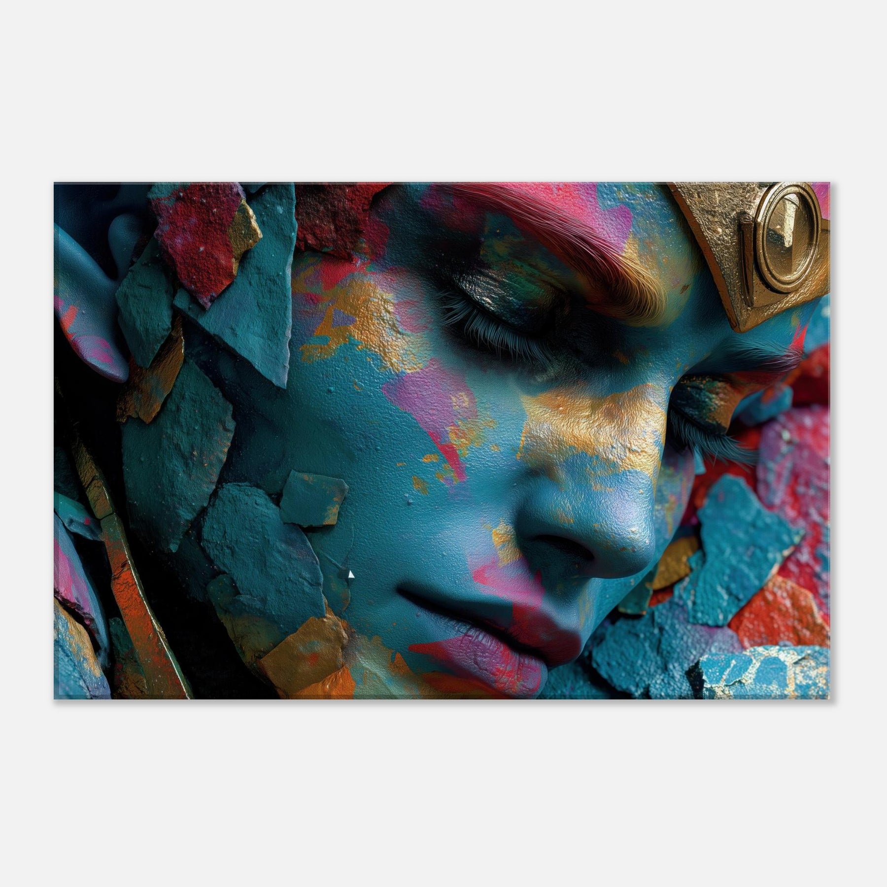 Mystical Elf drifts between dream and daylight in a cascade of color and light. This abstract dissolves into turquoise shards, gold specks, and pink hints that catch the room's glow and refract a quiet, otherworldly energy. The ethereal profile invites introspection, while the luminous skin and delicate lashes evoke grace and wonder. Place it over a sofa or mantel to awaken imagination, soften edges, and transform everyday spaces into a mythical sanctuary of calm, creativity, and refined sophistication.
