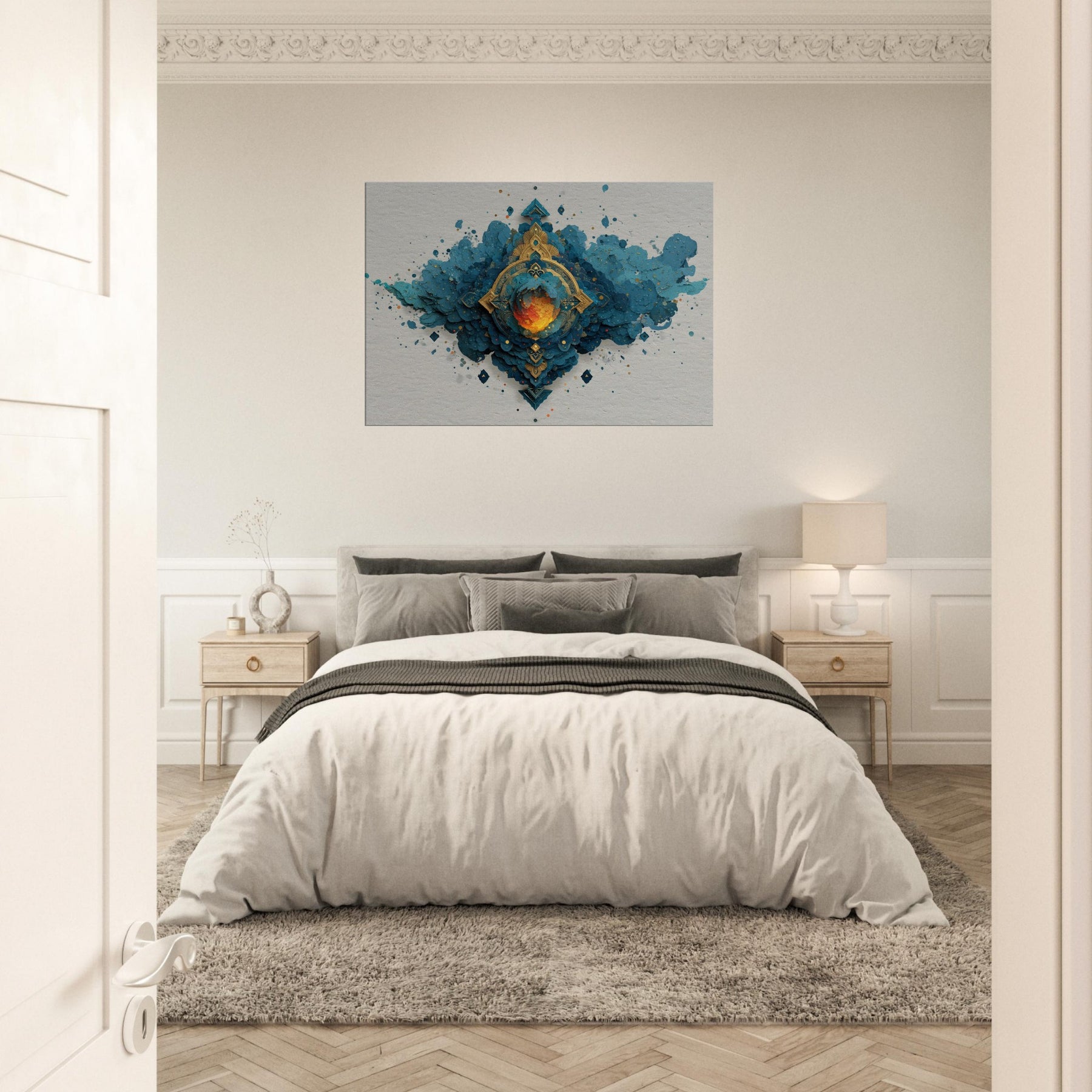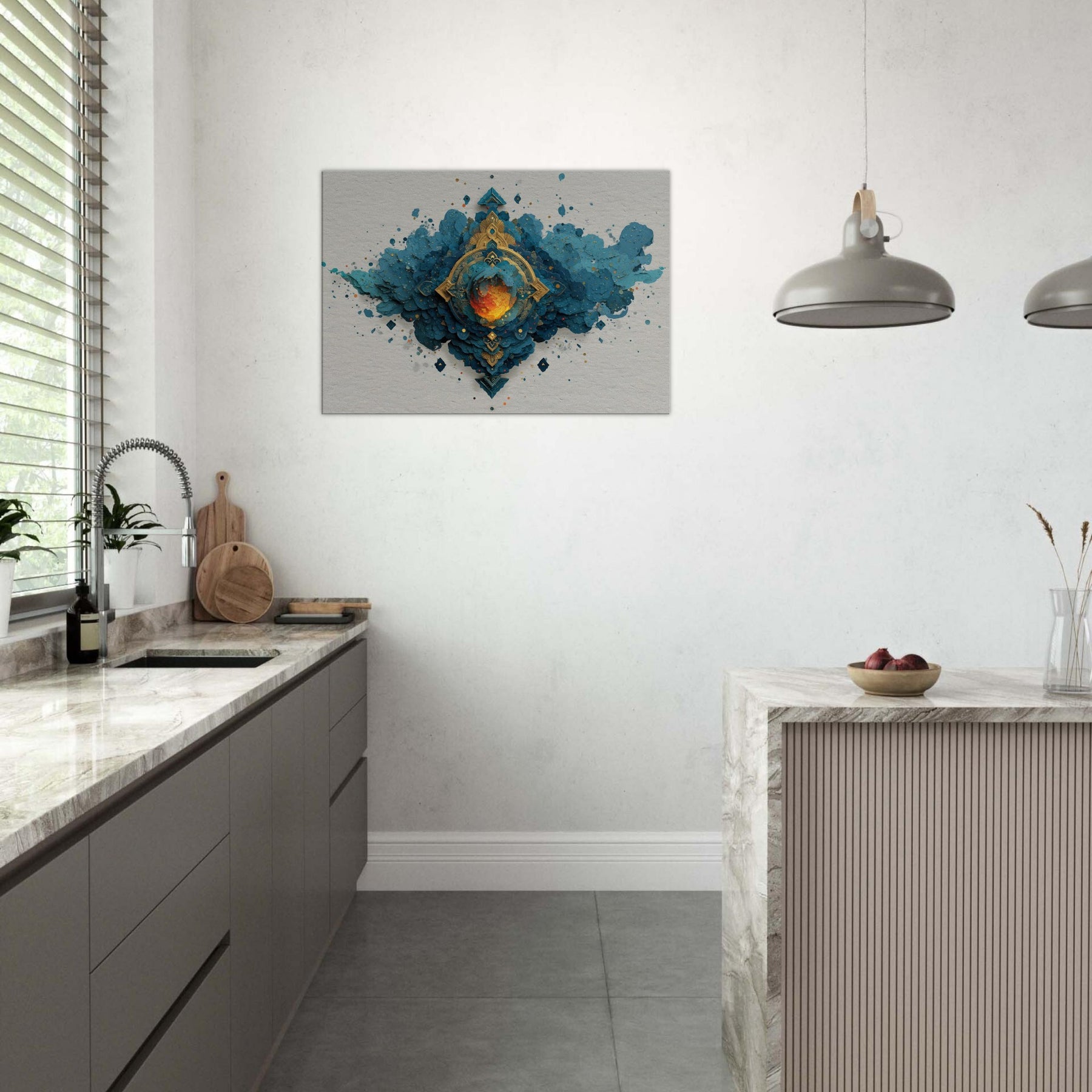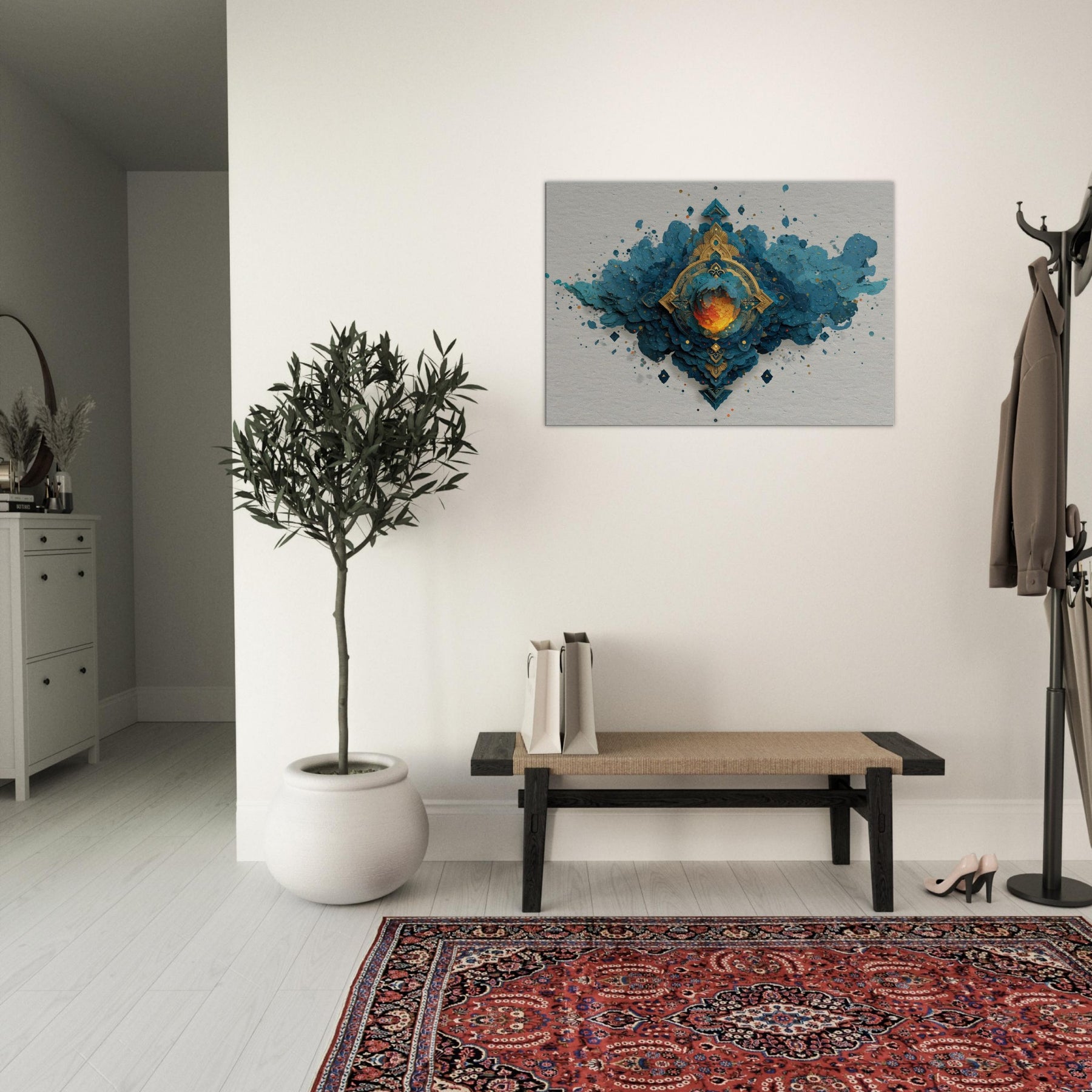 As the primary subject, Smudge Smoke Swirl unfurls in tones of deep teal and molten gold, carrying your space into a whispered horizon of possibility. This abstract, mystical composition breathes like a breath of wind blue veils curling around a radiant core of molten orange and gold. The delicately wrought geometric frame anchors the swirl, lending a temple like calm to any wall. In a living room or study, it becomes a meditative focal point inviting quiet reflection, soft light, and an atmosphere of refined mystery that sensorially elevates the daily experience.