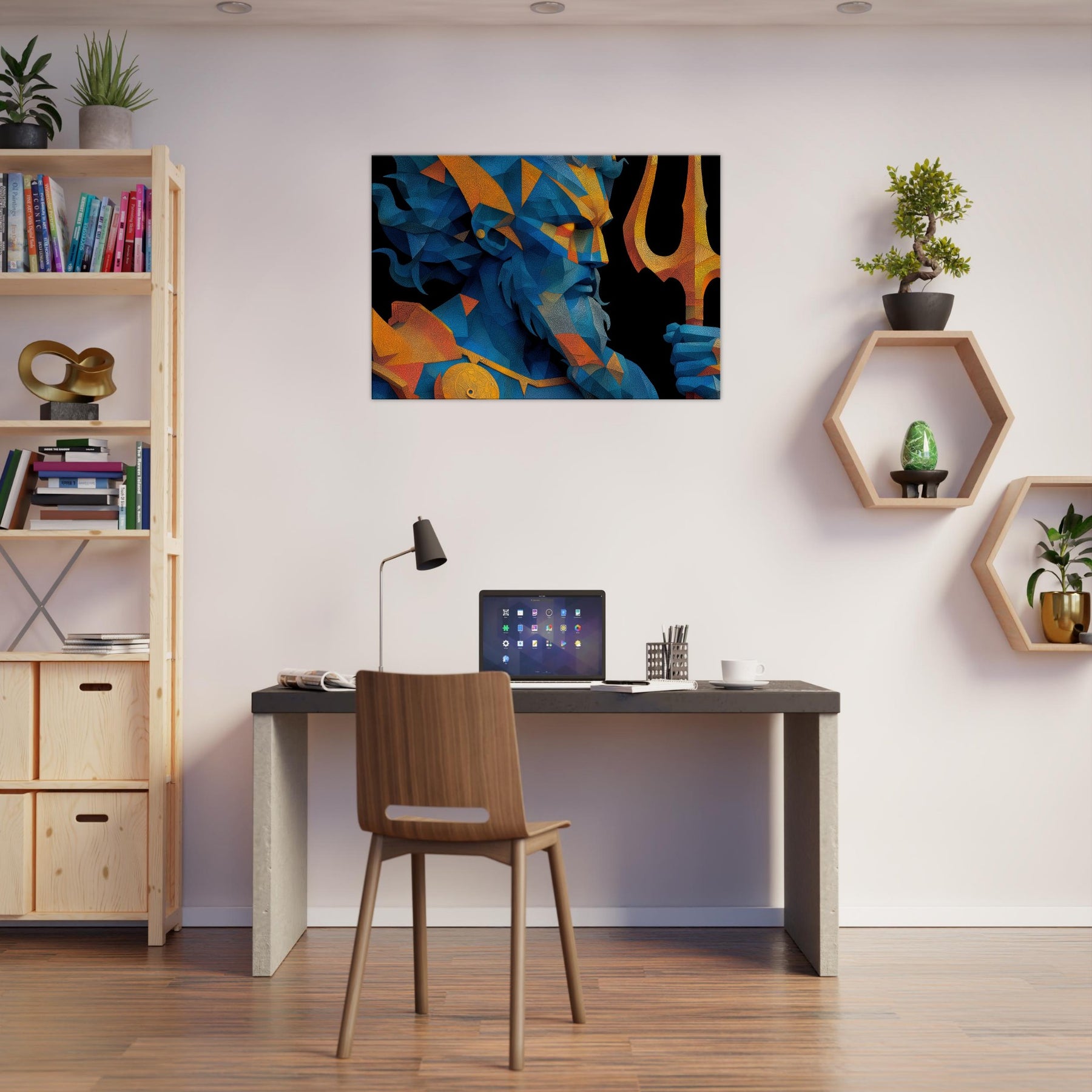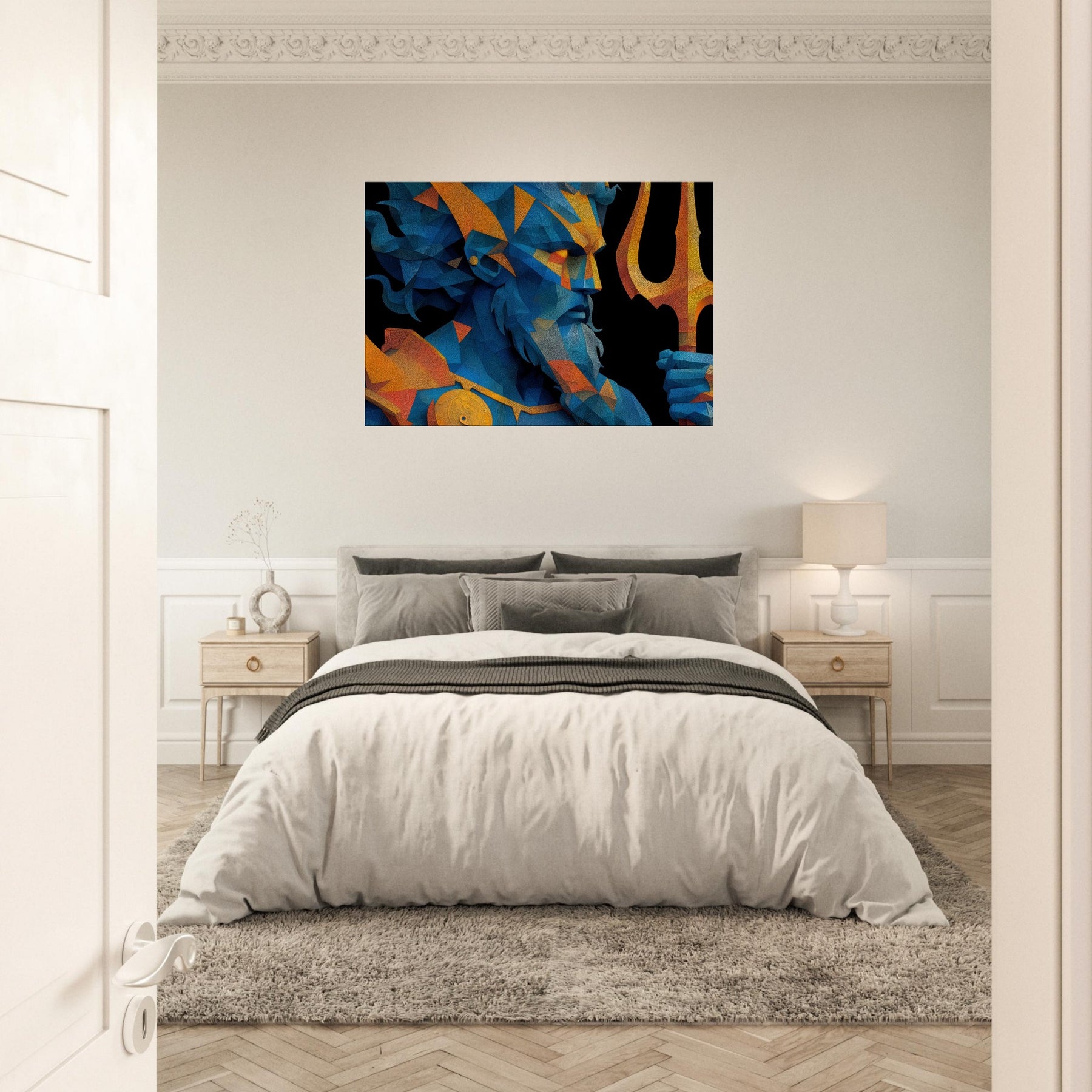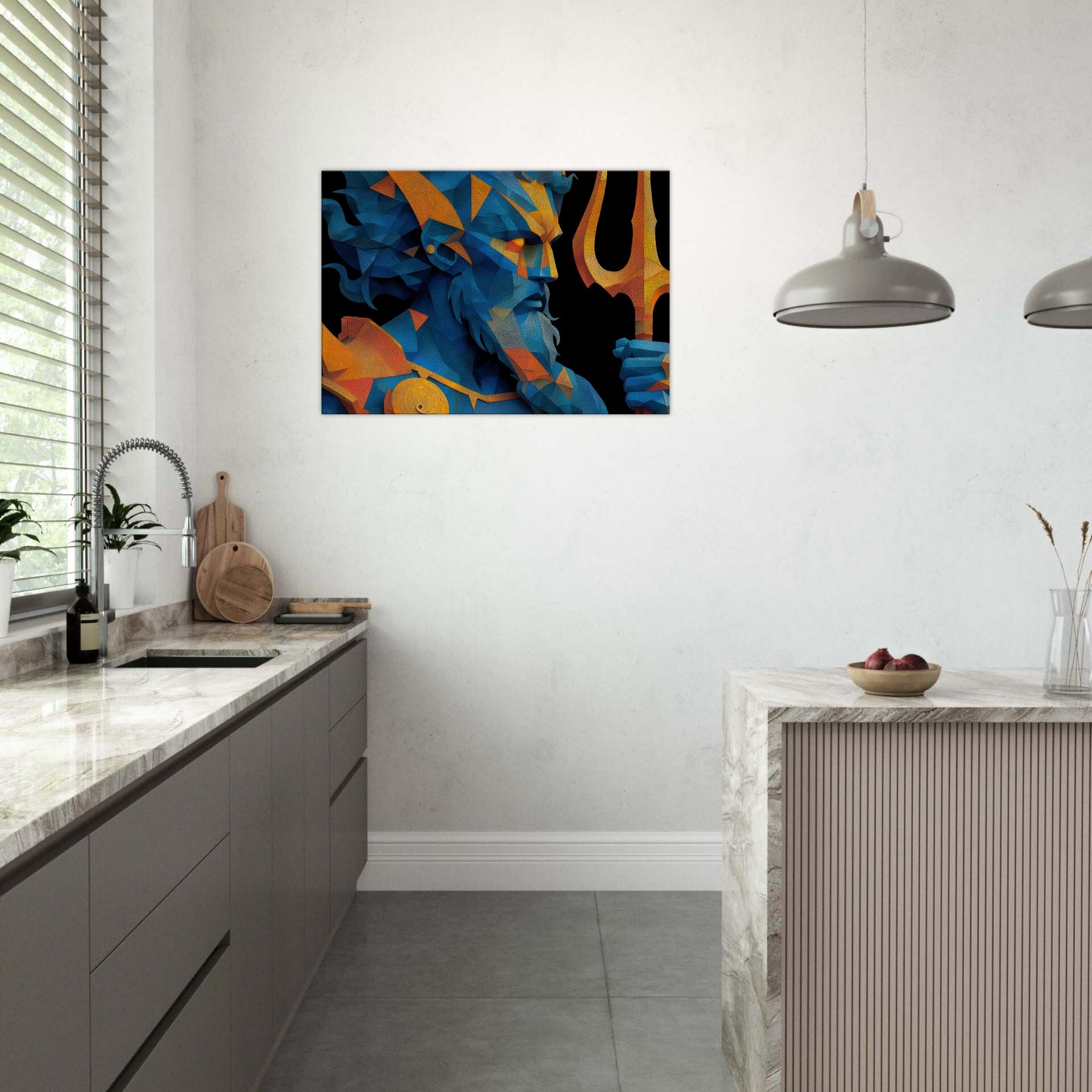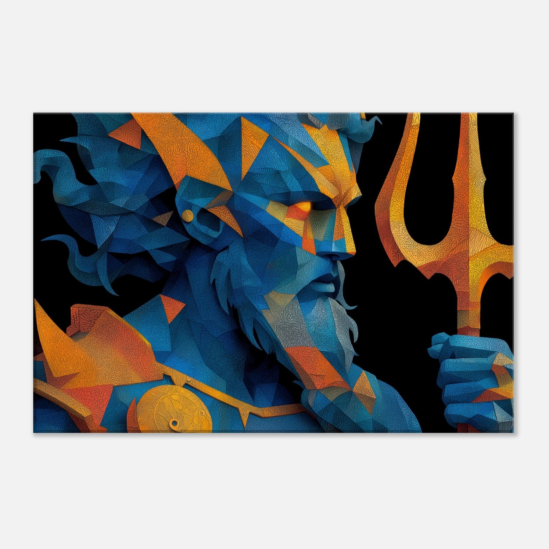 Immerse your space in the breath of the sea with Poseidon reimagined as a shimmering, prismed presence. This abstract gathers wind, foam, and thunder into fractured facets of blue and gold, a myth made modern on your wall. The mood is deep and electric salty air, rain washed color, the distant toll of a giant trident. Hung over a sofa or in a hallway, it reframes the room as a quiet harbor where imagination can rise with the tide. The central subject is Poseidon, God of the Sea and Storms.