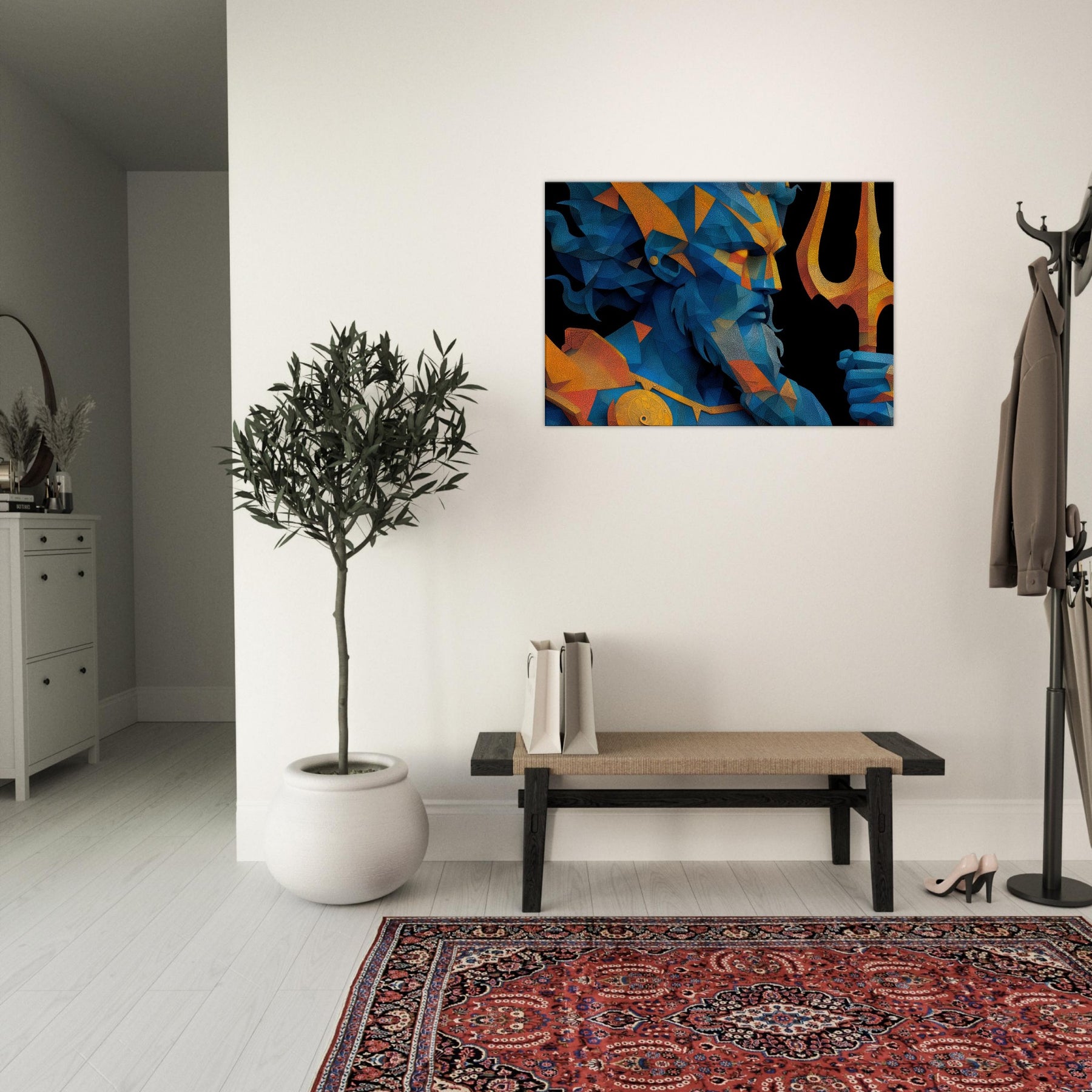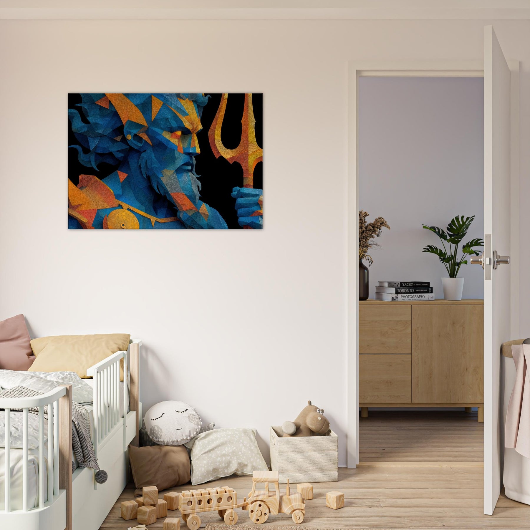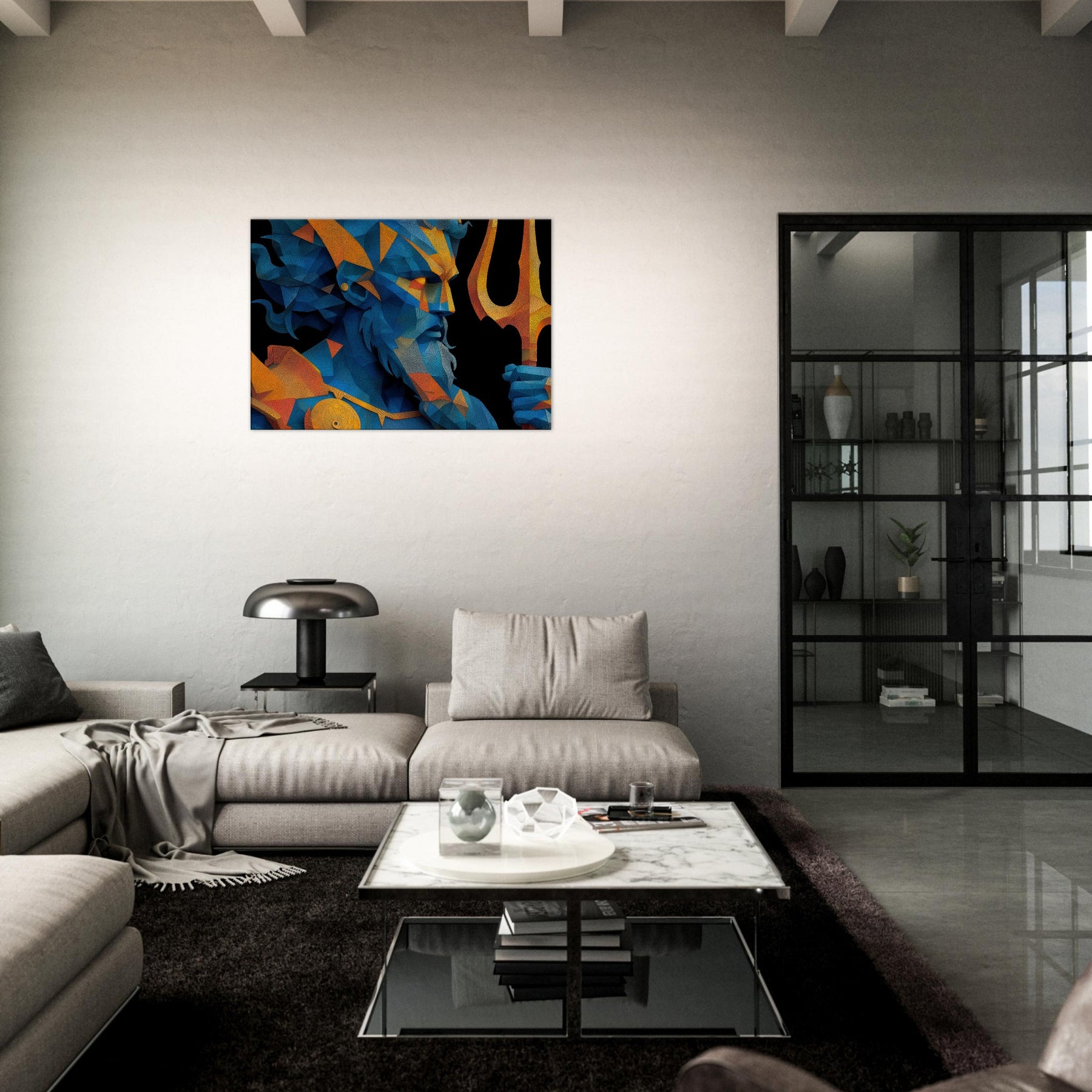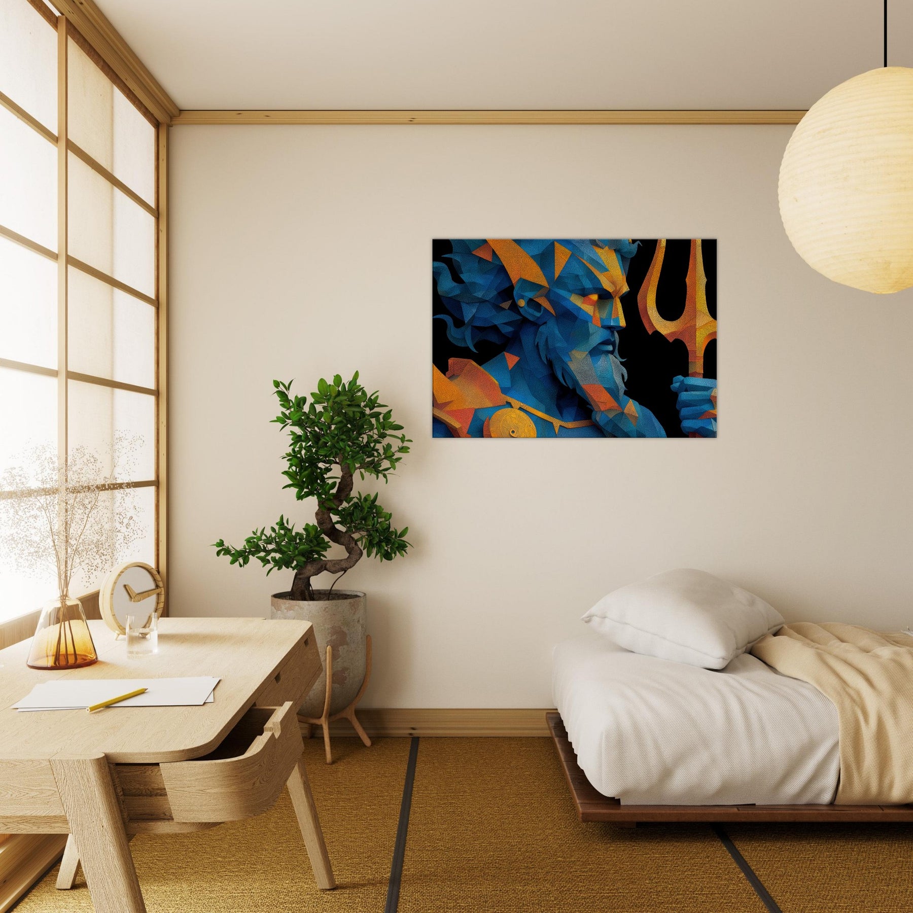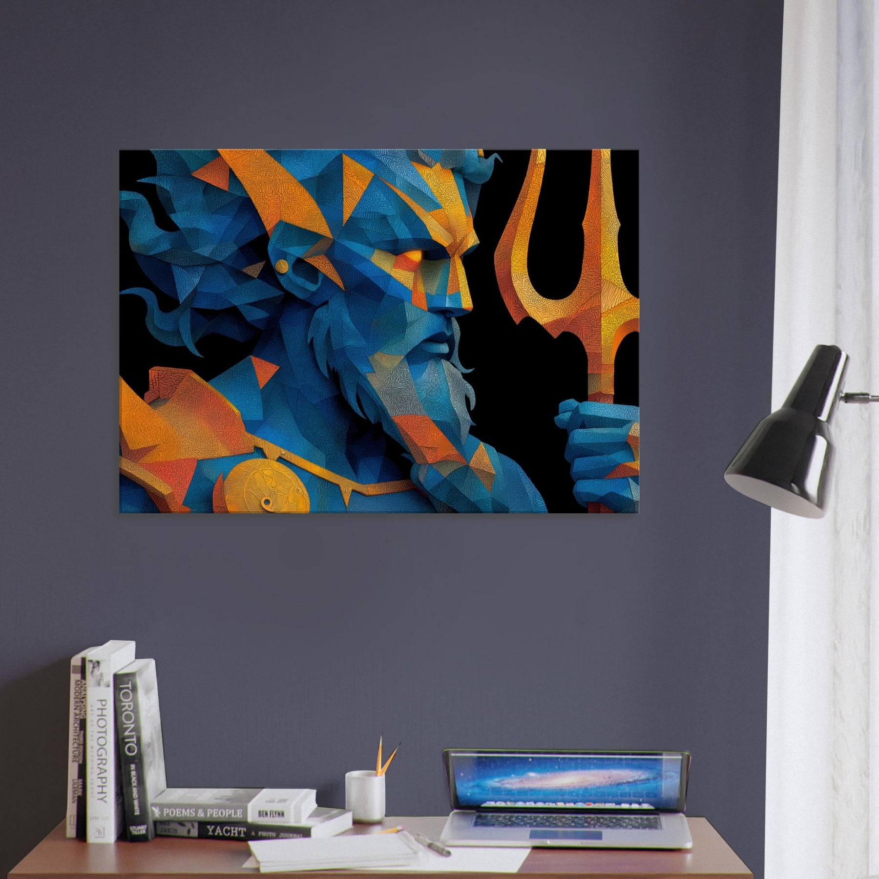 Immerse your space in the breath of the sea with Poseidon reimagined as a shimmering, prismed presence. This abstract gathers wind, foam, and thunder into fractured facets of blue and gold, a myth made modern on your wall. The mood is deep and electric salty air, rain washed color, the distant toll of a giant trident. Hung over a sofa or in a hallway, it reframes the room as a quiet harbor where imagination can rise with the tide. The central subject is Poseidon, God of the Sea and Storms.