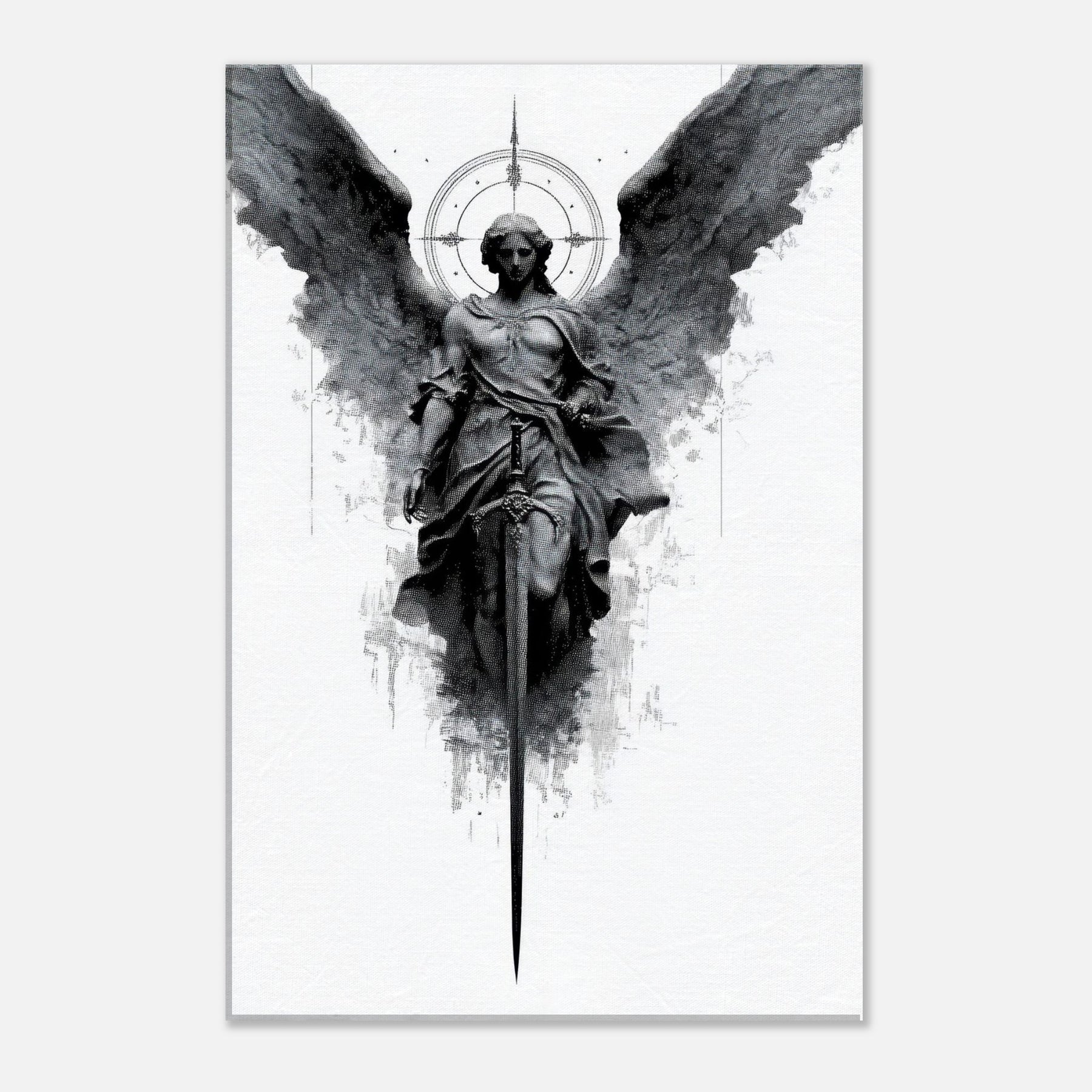 An arresting study in restraint and power, this black and white depiction centers Archangel Michael with sword poised and scales balanced, wings unfurled in deliberate ascent. The stark contrast and subtle feathering create a living shadow play that heightens a room’s mood calm, focused, protective.